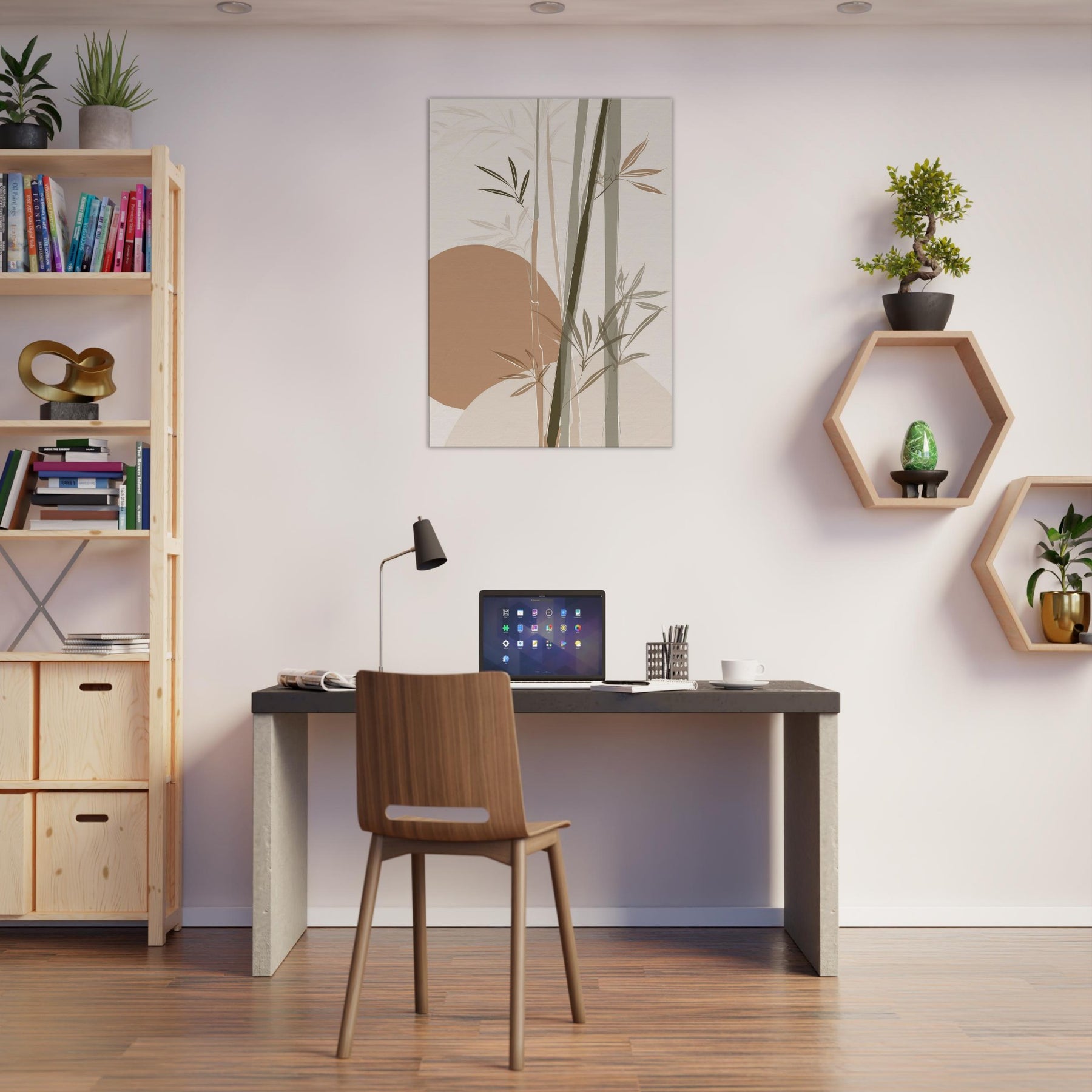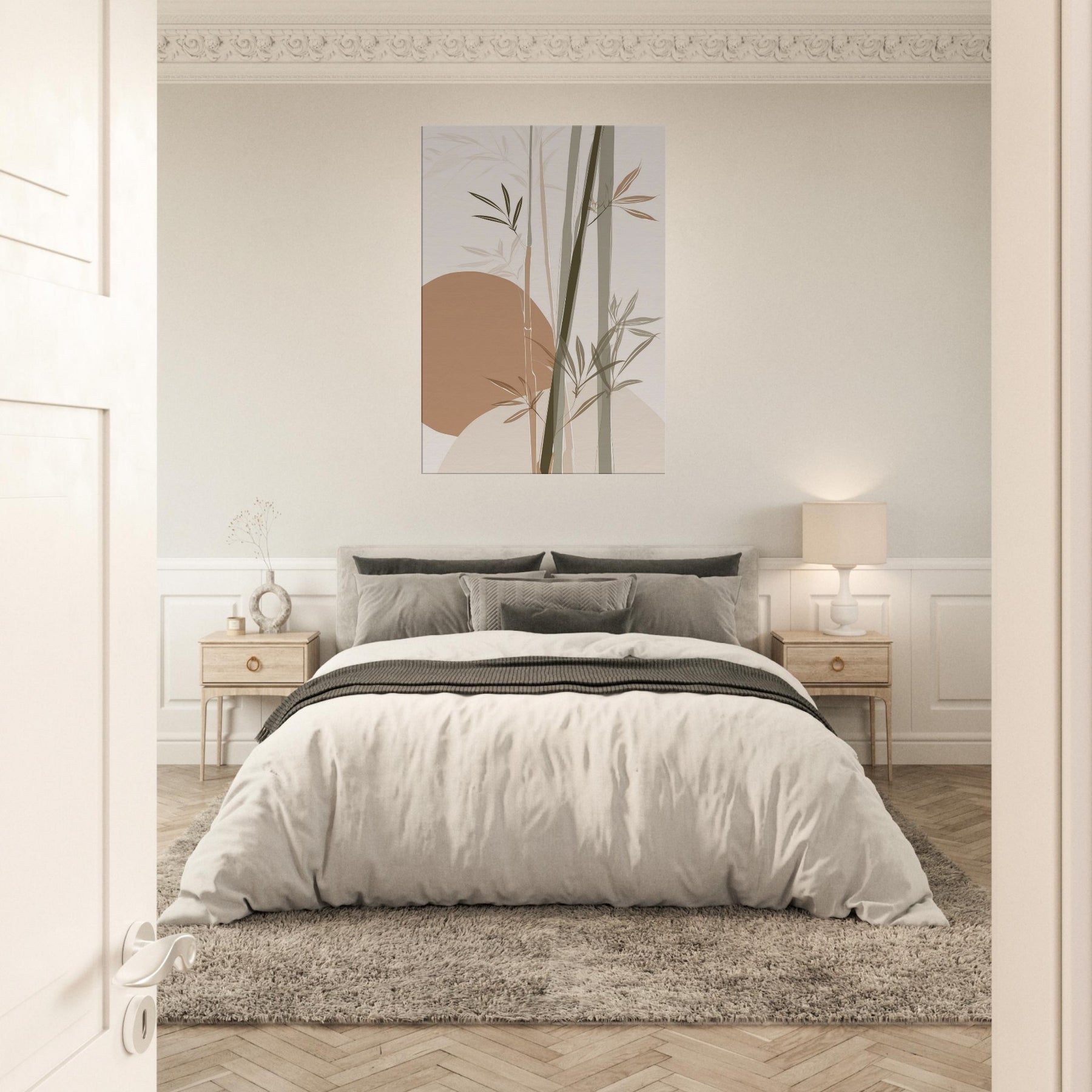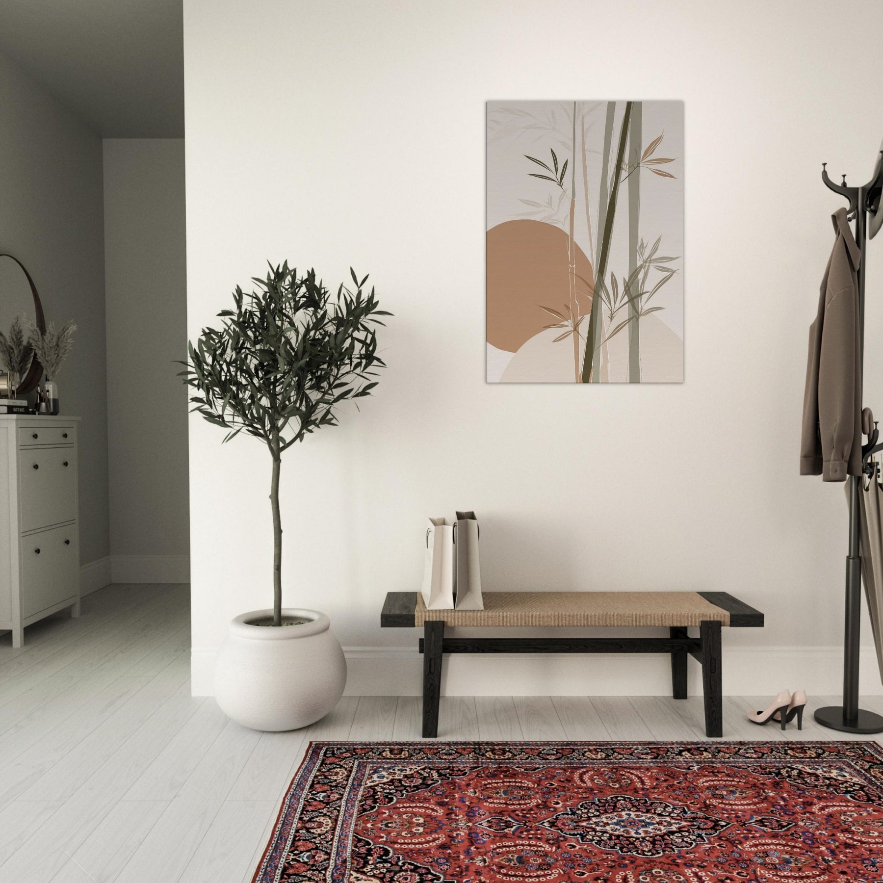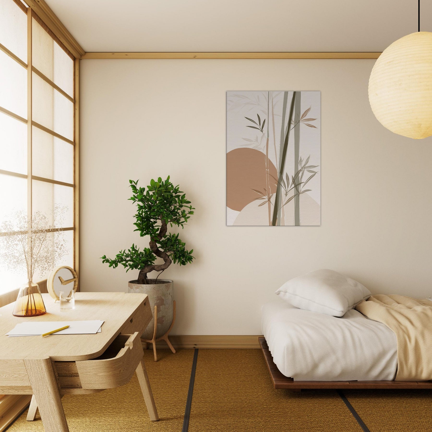 Immerse your space in the quiet resilience of Bamboo Stalks rendered in a spare, meditative palette. This minimalist composition invites the eye to travel along slender trunks and delicate leaves, like a breath you can hang on the wall. The warm taupe circle and soft beige field suggest dawn light filtering through a quiet grove, heightening calm in a living room or study. A refined focal point that pairs nature's persistence with modern simplicity.
