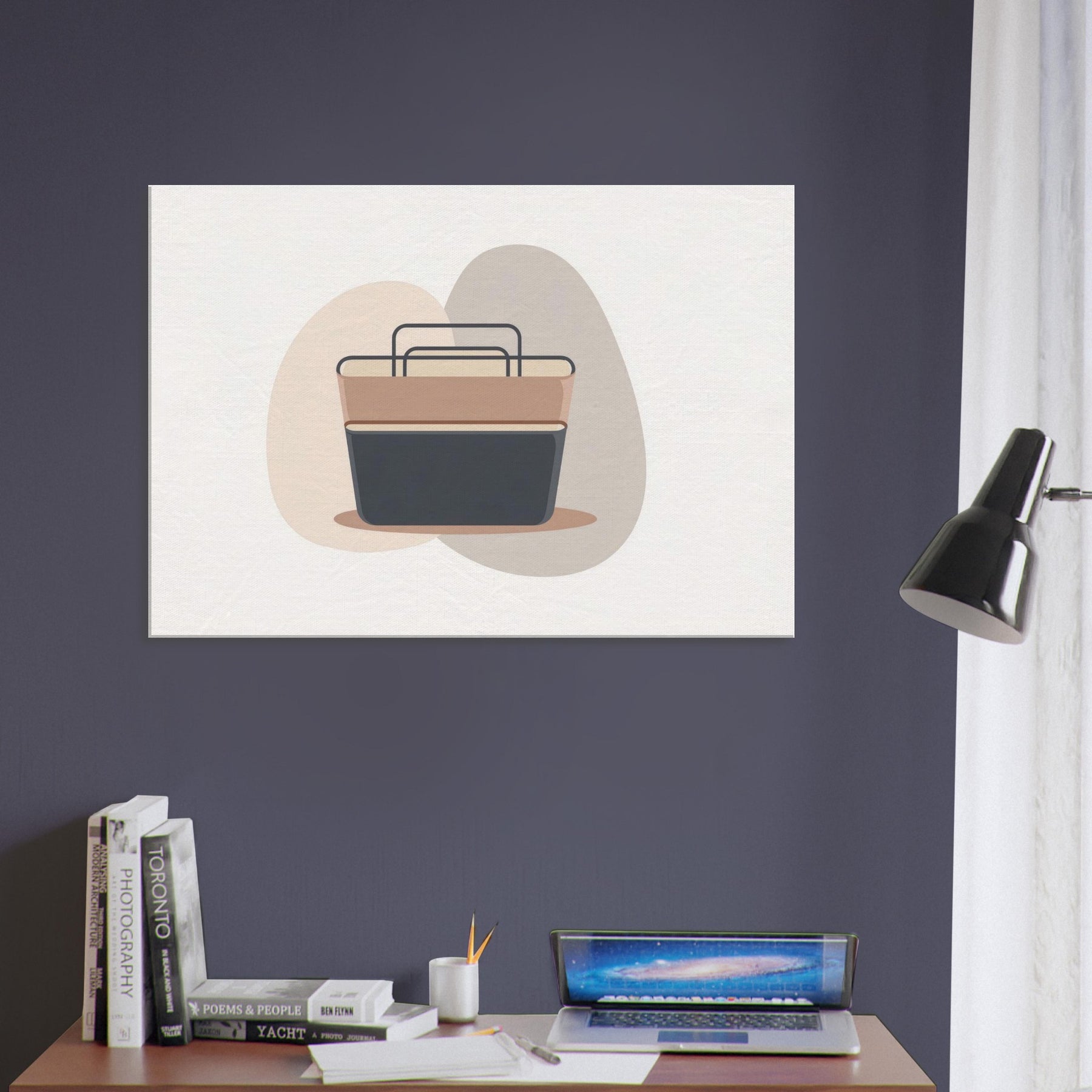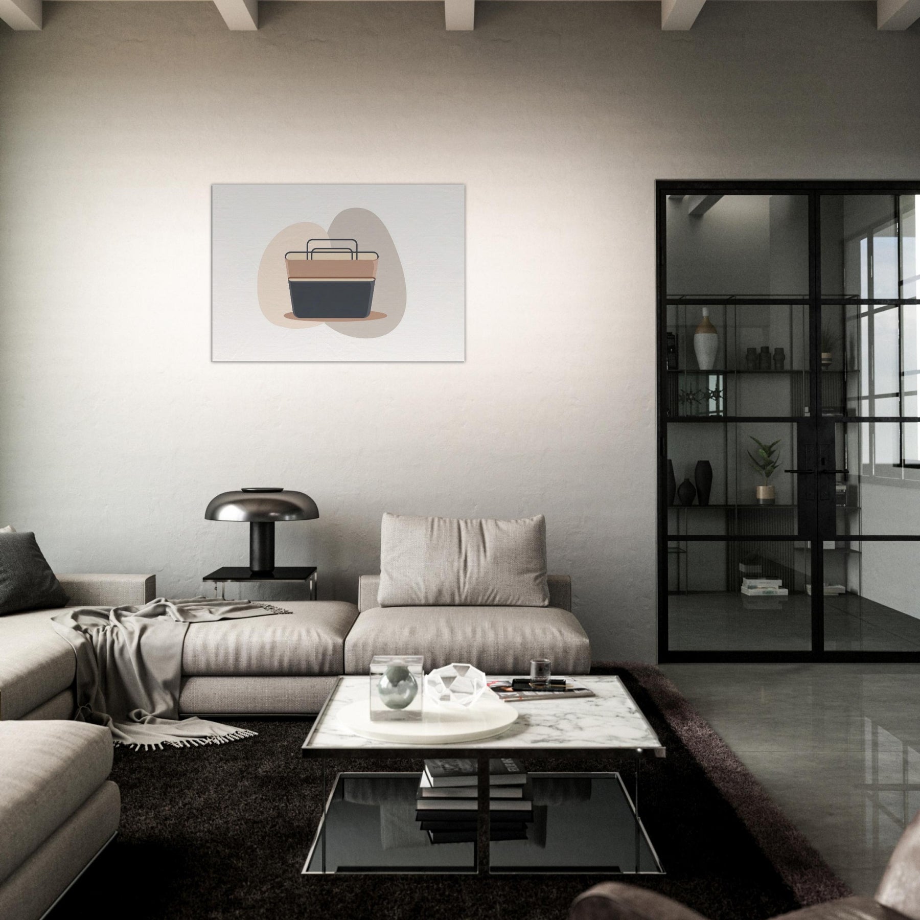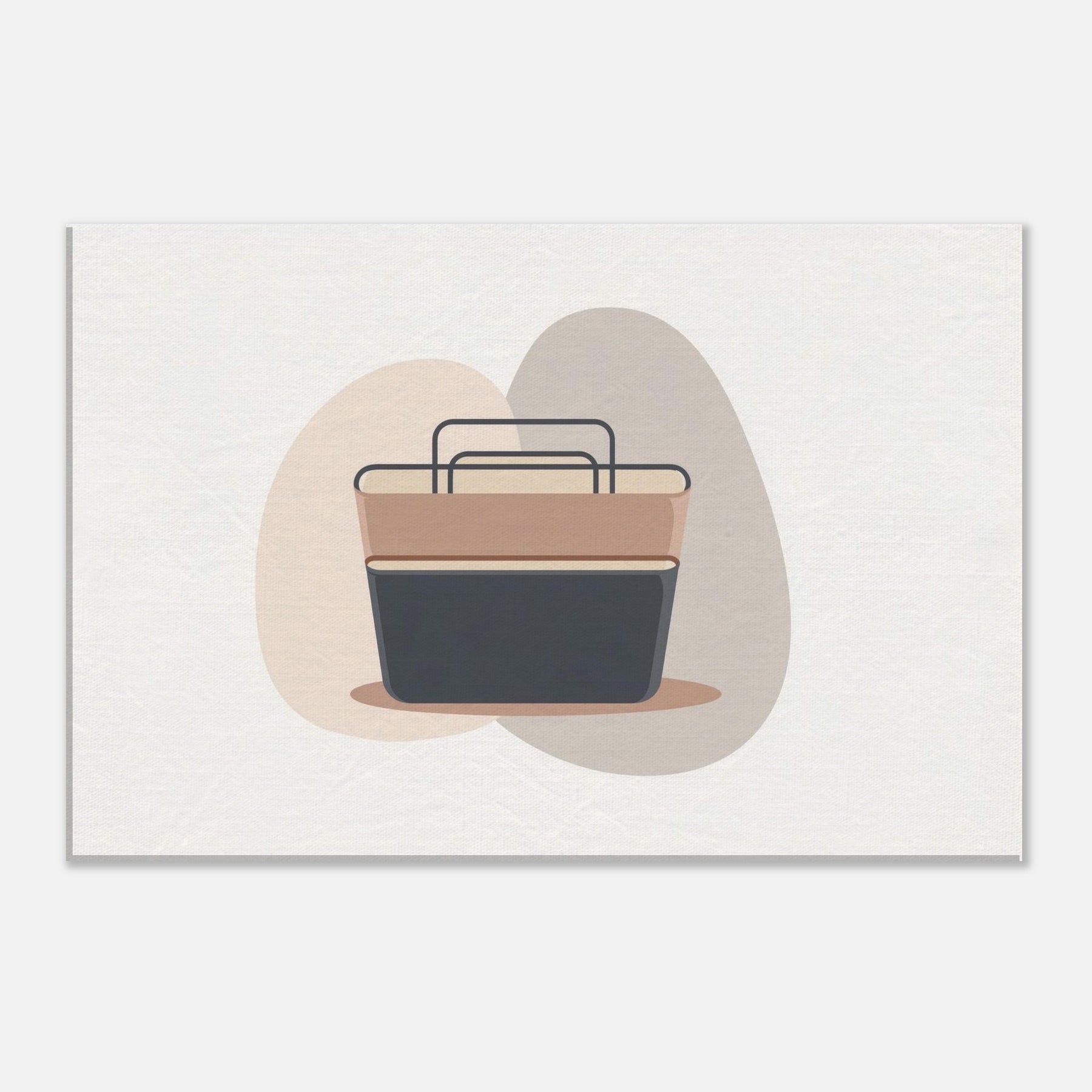 A calm, grounded scene of a Bamboo Basket, rendered in soft, geometric layers of beige, taupe, and charcoal. The minimalist shapes invite the eye to linger, creating space for breath and warmth in a living room. Subtle shadows and rounded edges suggest quiet mornings and a tactile memory of handwoven texture. This piece adds natural texture, gentle balance, and timeless simplicity an everyday object elevated to art that elevates a sofa, desk, or entryway with serene presence.