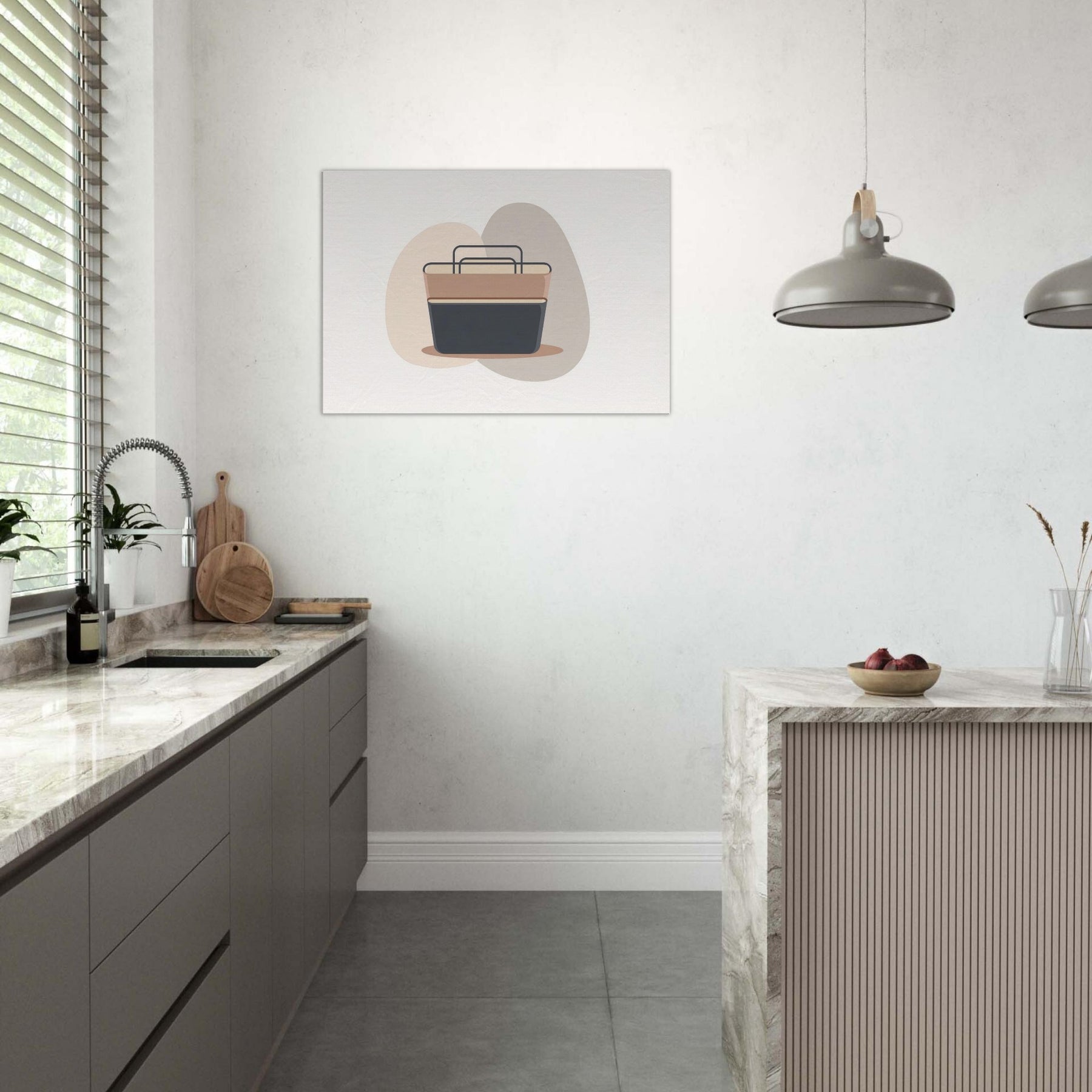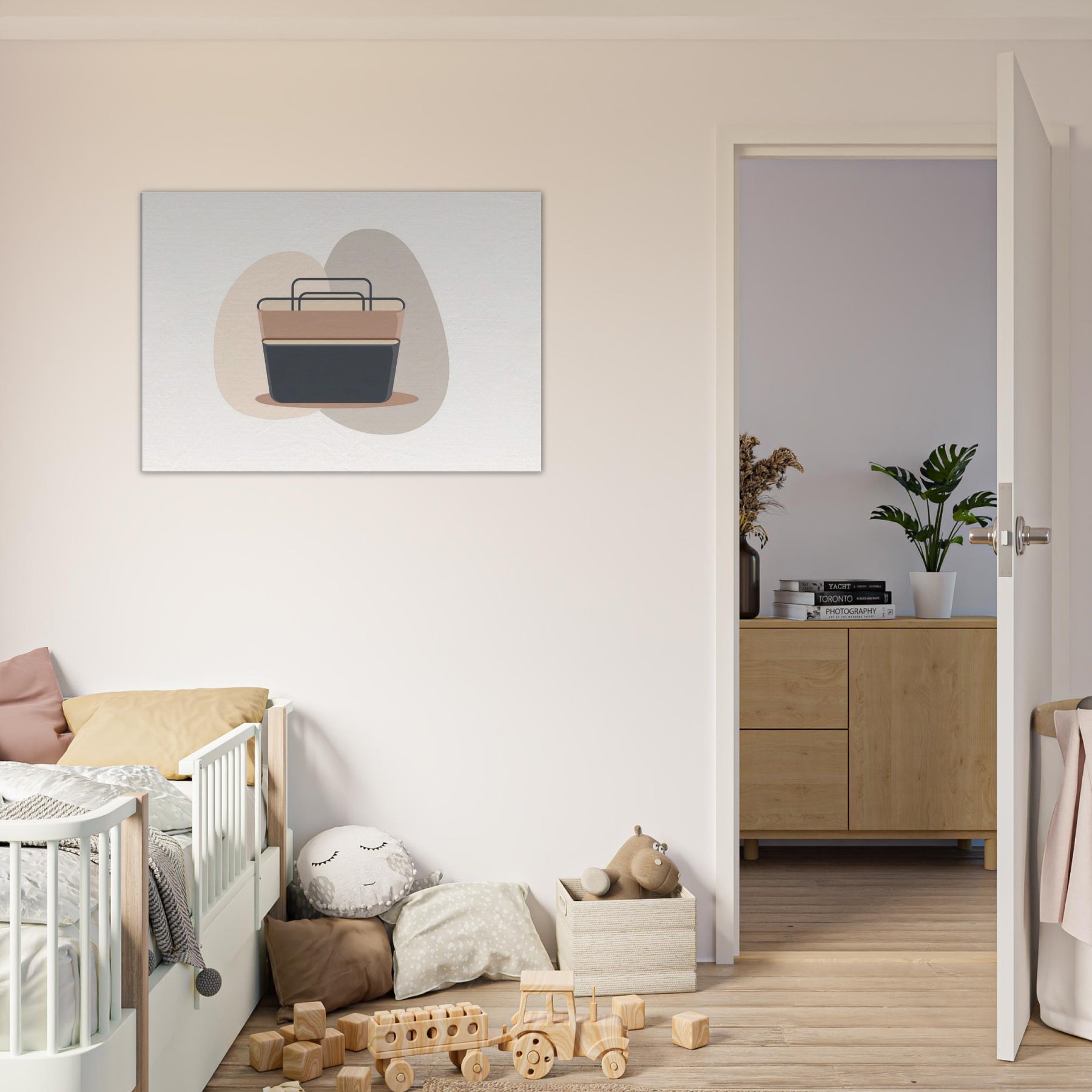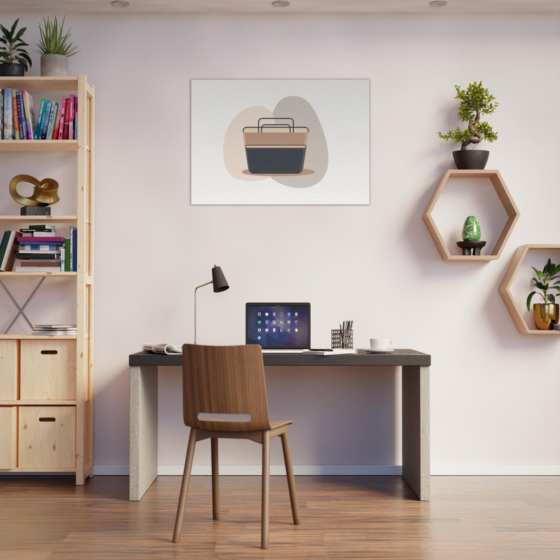 A calm, grounded scene of a Bamboo Basket, rendered in soft, geometric layers of beige, taupe, and charcoal. The minimalist shapes invite the eye to linger, creating space for breath and warmth in a living room. Subtle shadows and rounded edges suggest quiet mornings and a tactile memory of handwoven texture. This piece adds natural texture, gentle balance, and timeless simplicity an everyday object elevated to art that elevates a sofa, desk, or entryway with serene presence.