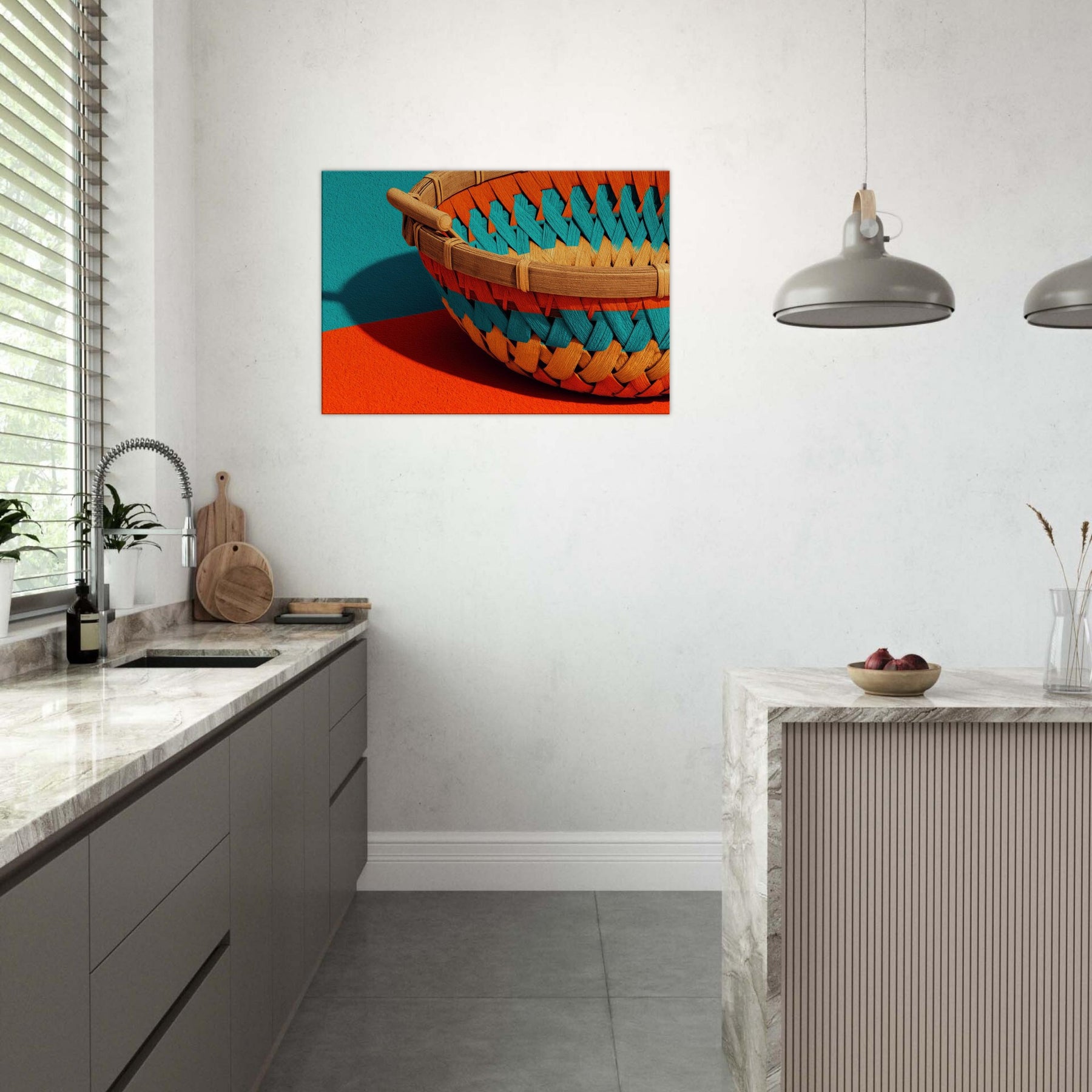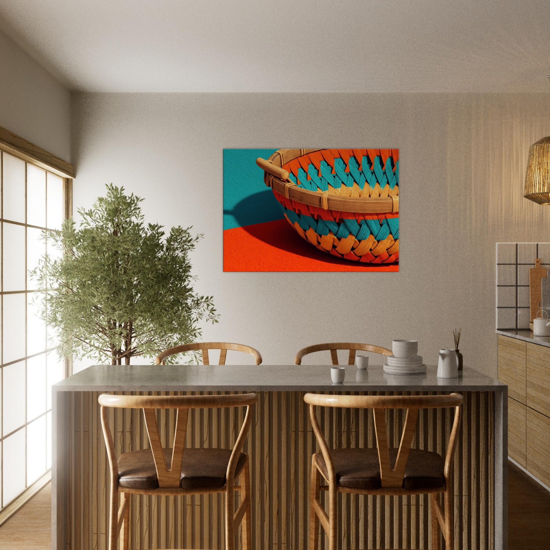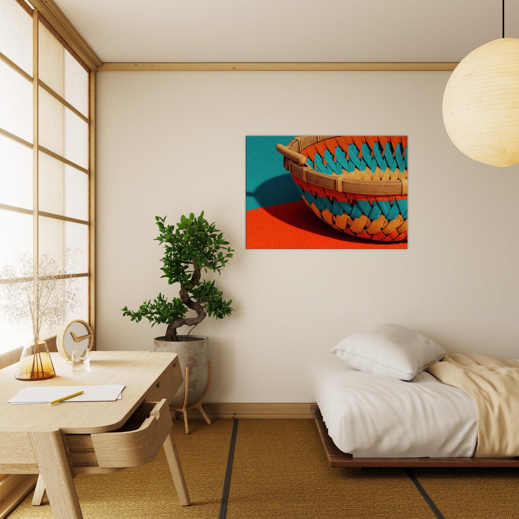 Whispers of sun warmed rattan and quiet shade drift across your wall in this Bamboo Basket study. The abstract weave dissolves into luminous spaces, inviting calm and curiosity into the room. Its tactile texture echoes a sunlit grove, while the playful color pops against neutral walls, shaping a serene focal point. This piece transforms a living space into a gallery of restraint and warmth, where everyday moments feel unhurried and beautifully considered.