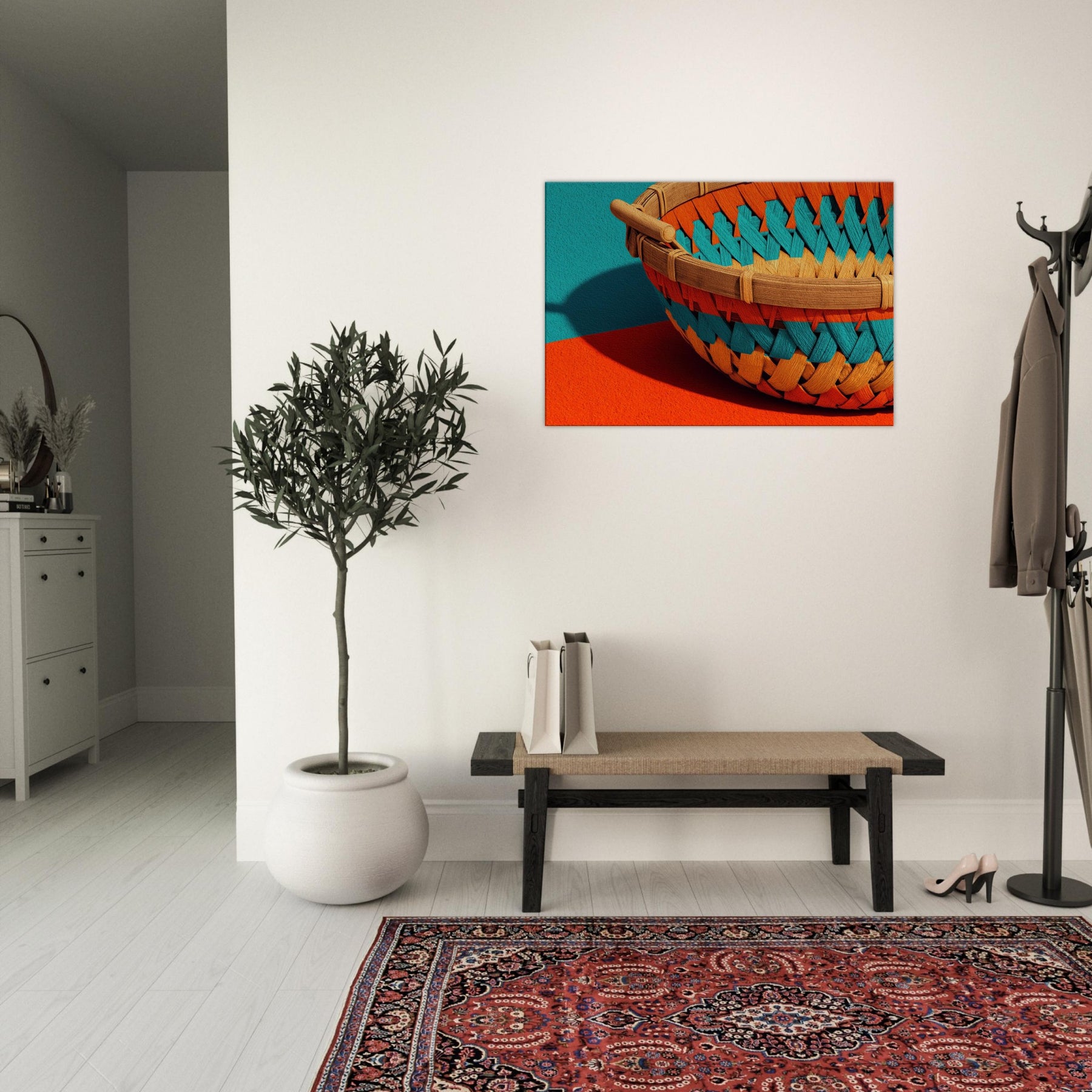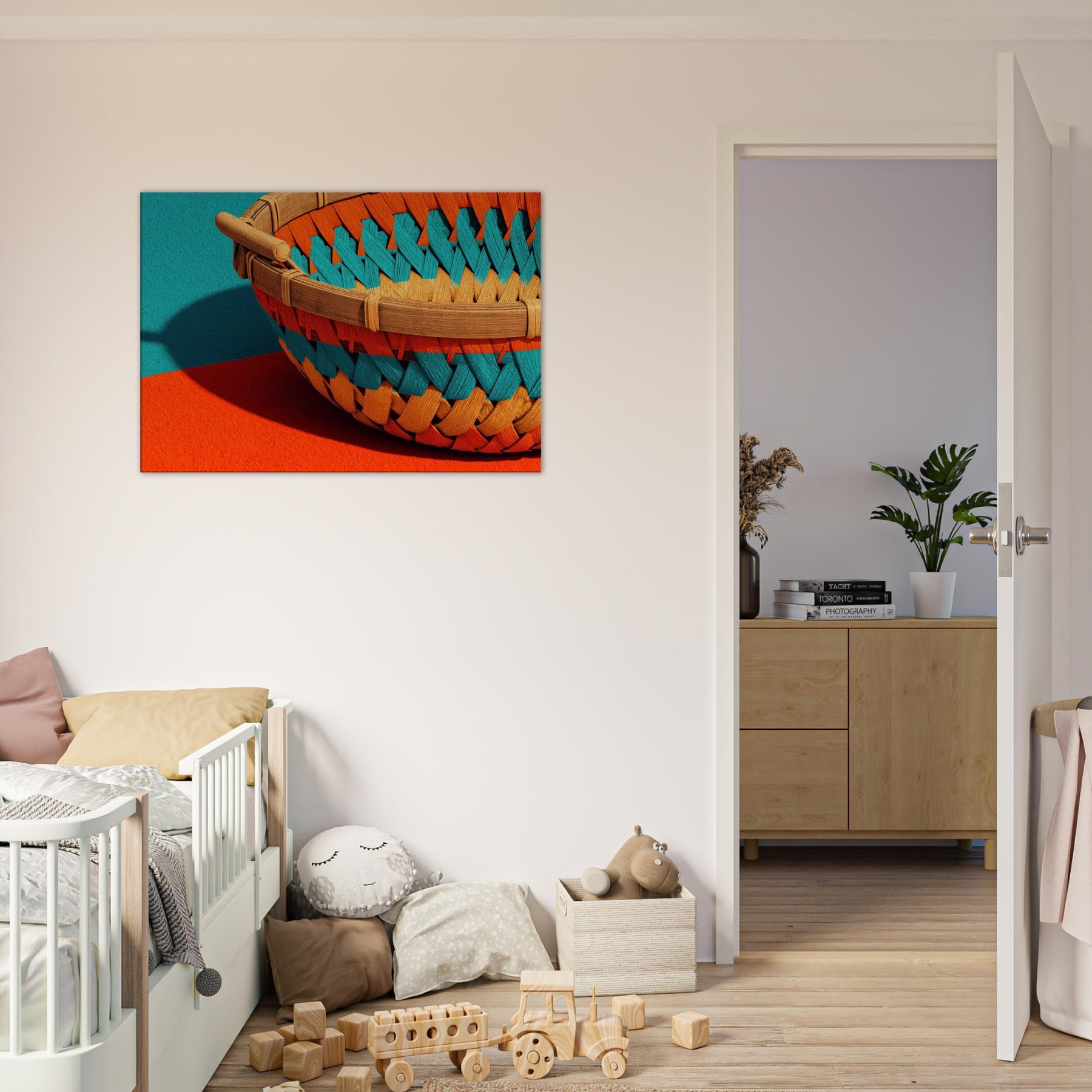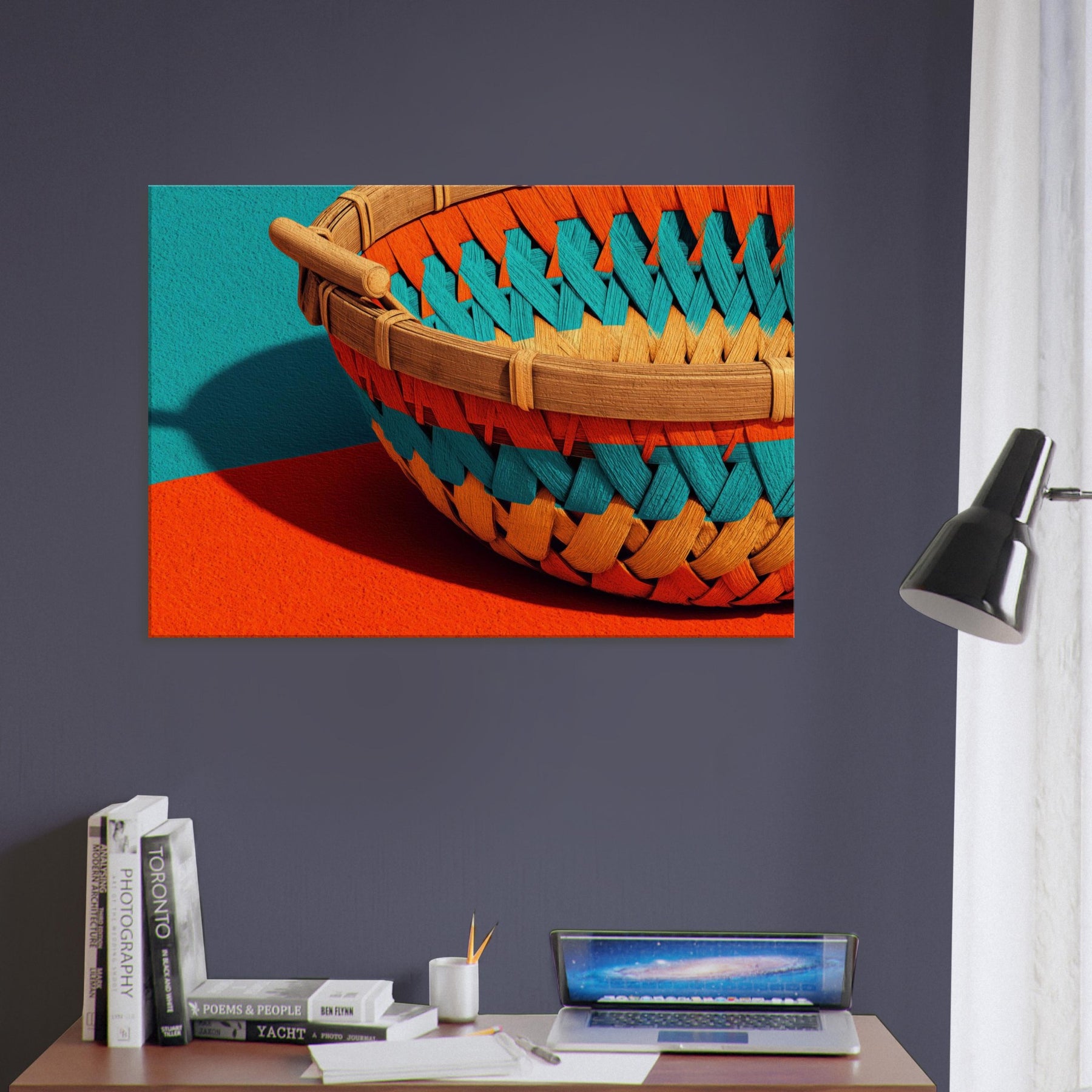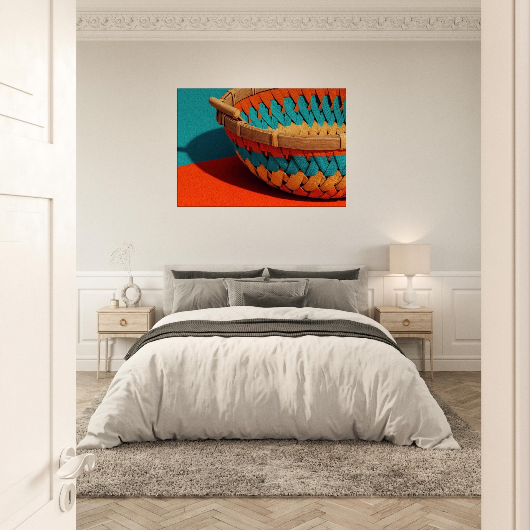 Whispers of sun warmed rattan and quiet shade drift across your wall in this Bamboo Basket study. The abstract weave dissolves into luminous spaces, inviting calm and curiosity into the room. Its tactile texture echoes a sunlit grove, while the playful color pops against neutral walls, shaping a serene focal point. This piece transforms a living space into a gallery of restraint and warmth, where everyday moments feel unhurried and beautifully considered.
