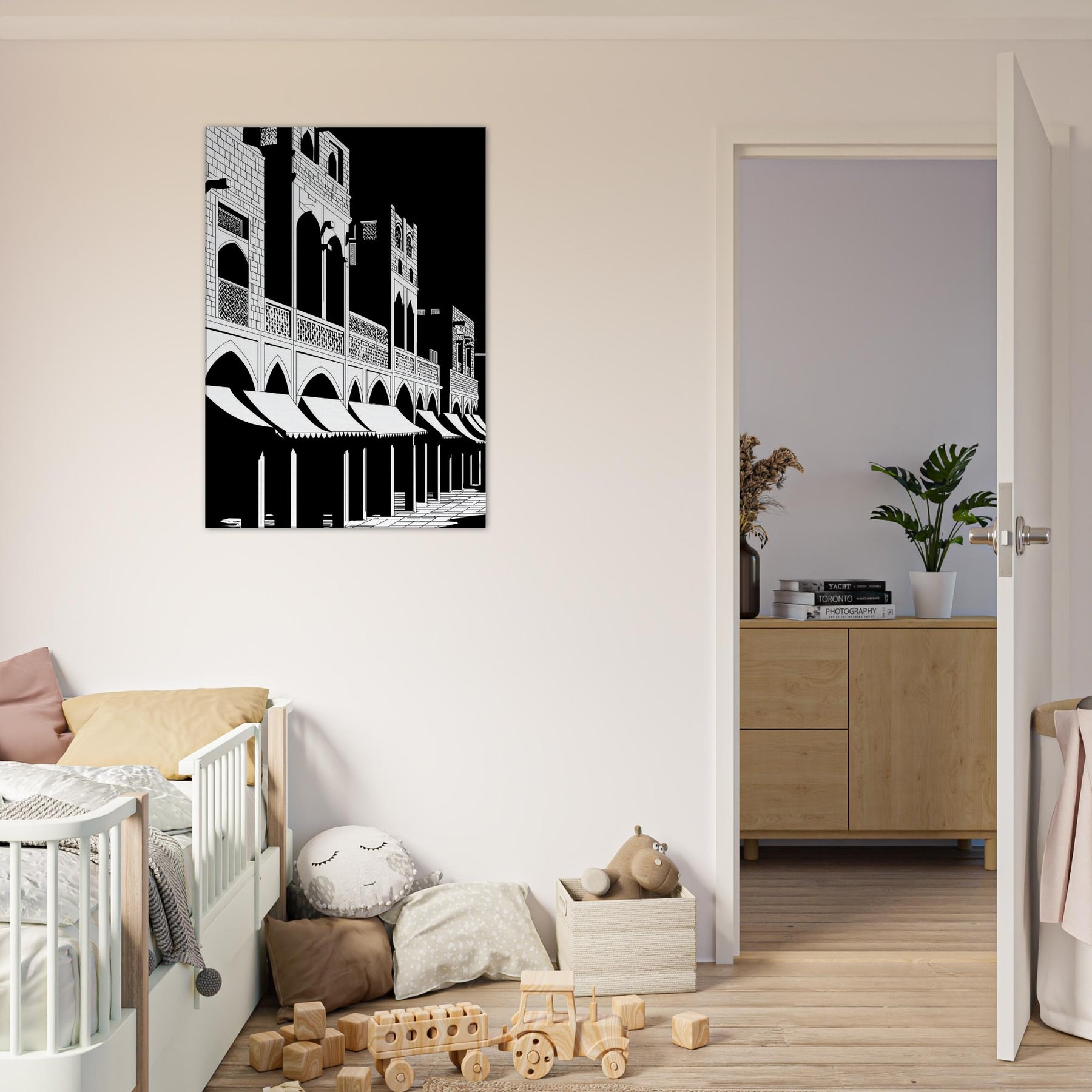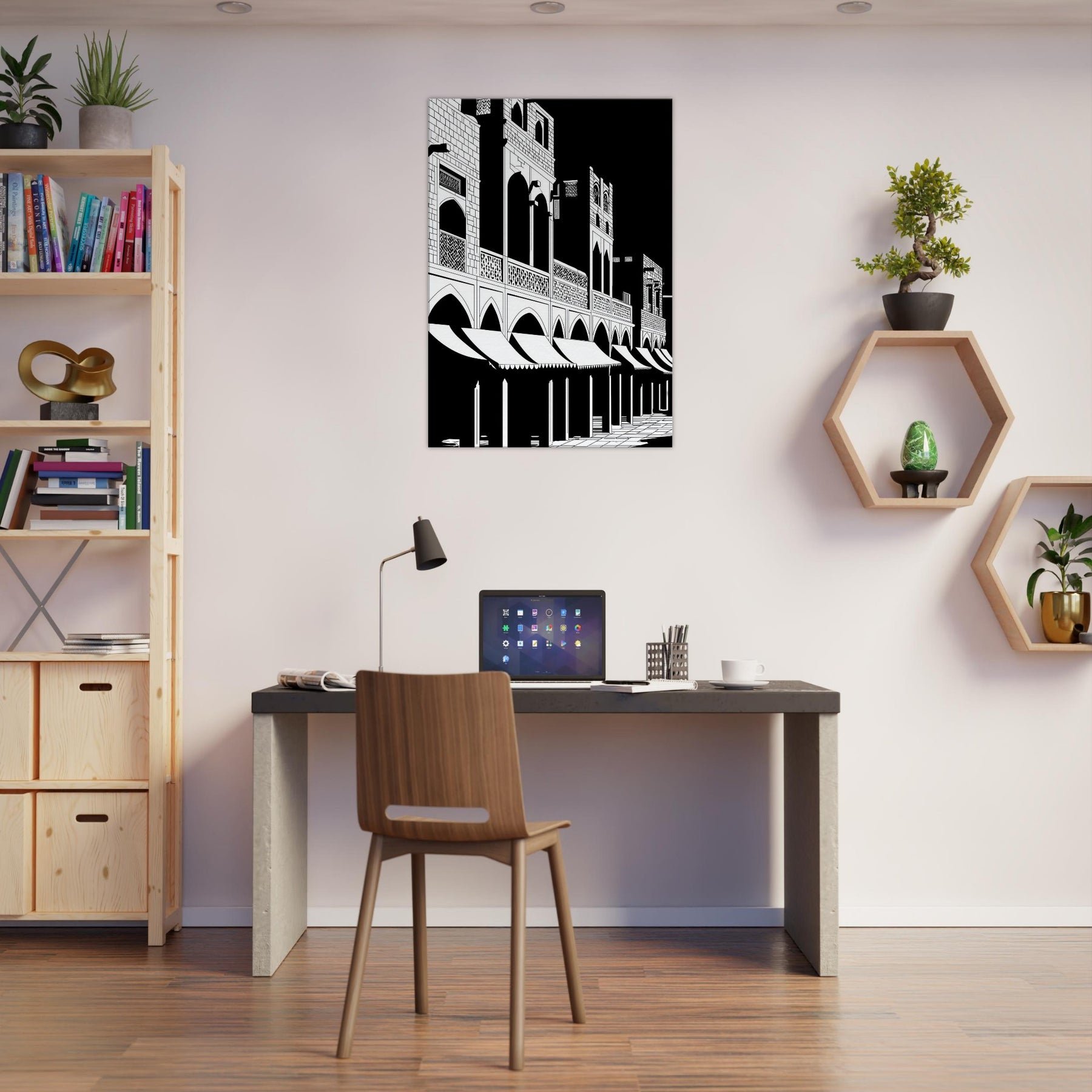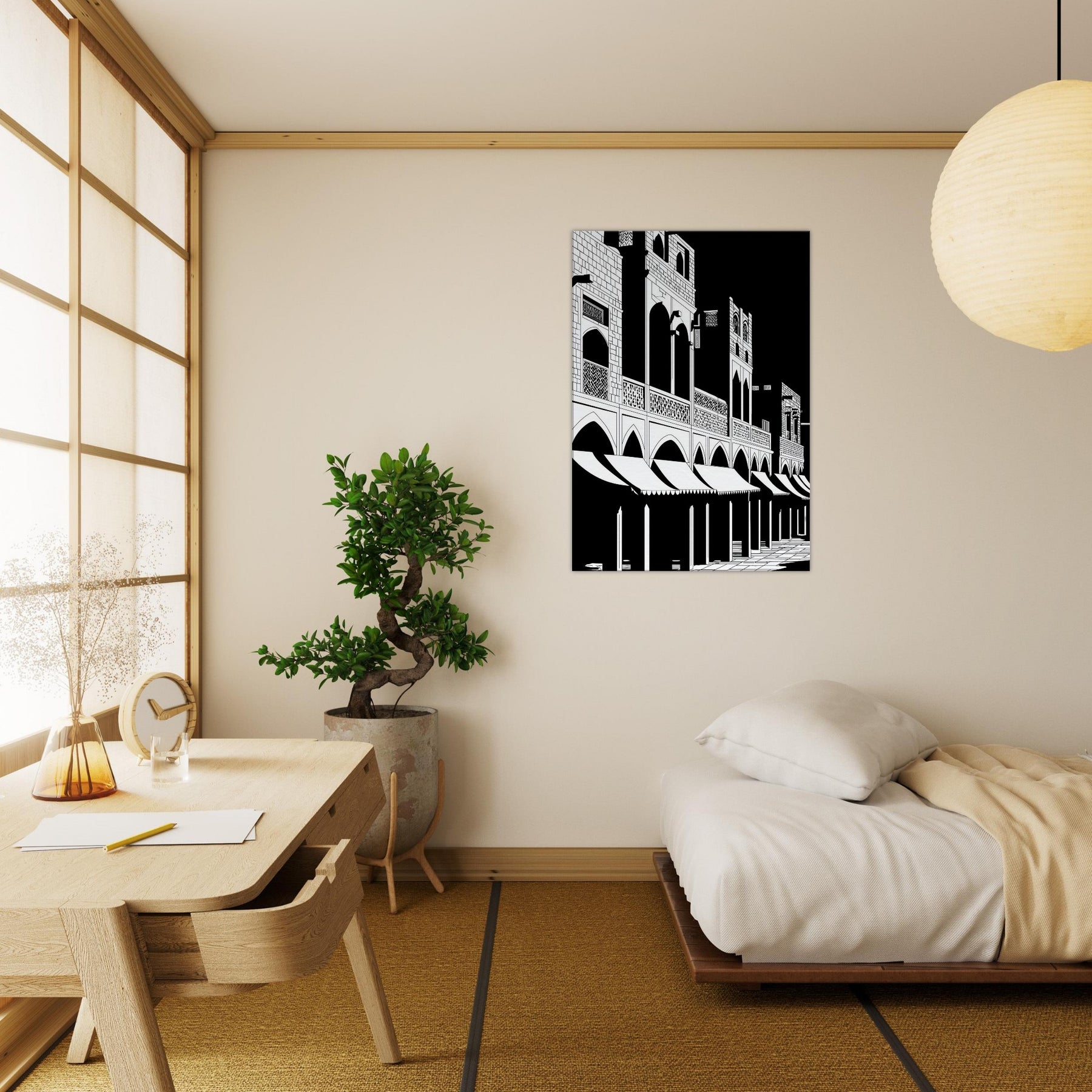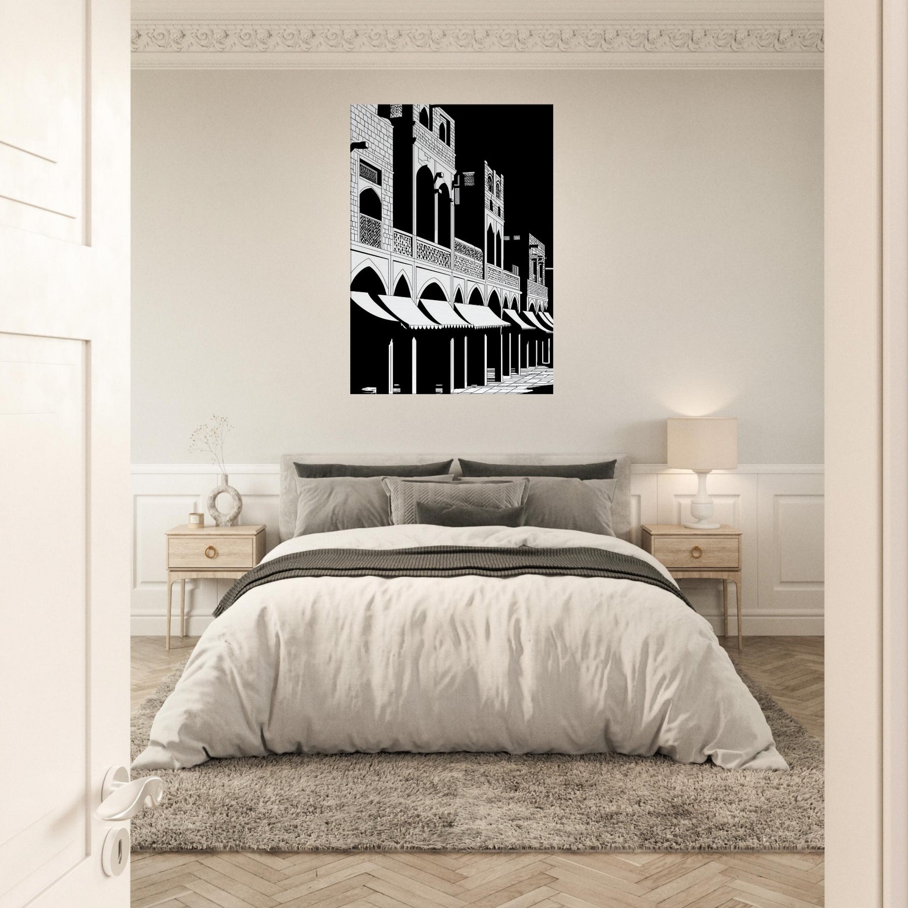 Immerse your space in the quiet grandeur of the Arabian Bazaar, rendered in clean line art that glides across walls like a whispered memory. The architecture arched arcades, balconies, and repeating silhouettes creates a calm rhythm, evoking timeless markets and late day light. In a living room or study, this piece invites quiet focus and expansive space, pairing beautifully with warm woods and soft textures. The Arabian Bazaar line art becomes a conversation starter, a touch of exotic polish without shouting.