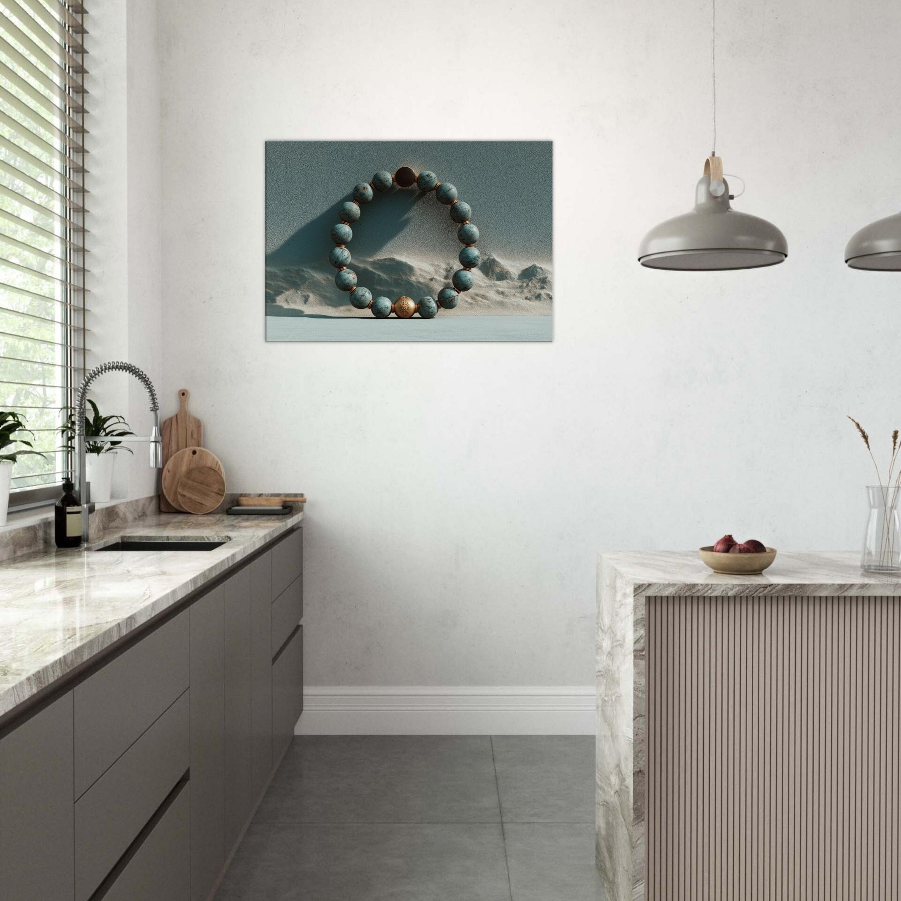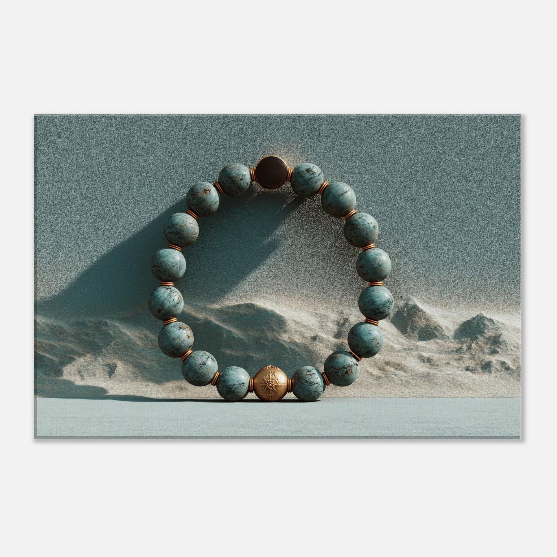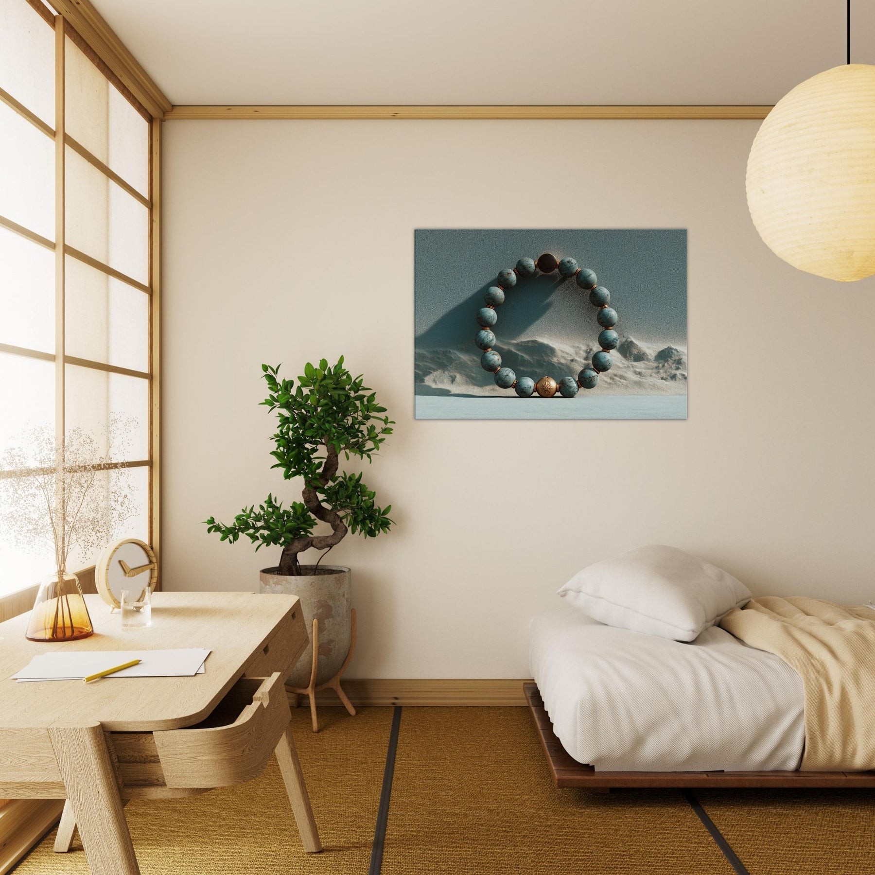 Within the frame, the Primary Subject Prayer Beads (Mala/Tasbih) circles a copper toned bead against a dunes . Turquoise spheres, punctuated by copper spacers, pulse with a soft, meditative glow as light traverses a textured, otherworldly sky. The piece exhales quiet ritual into a room, inviting slow breaths and reflection. It lends tactful depth, warmth, and a sense of spacious calm to a living room or bedroom, turning a wall into a portal of memory, solace, and mystical quiet.