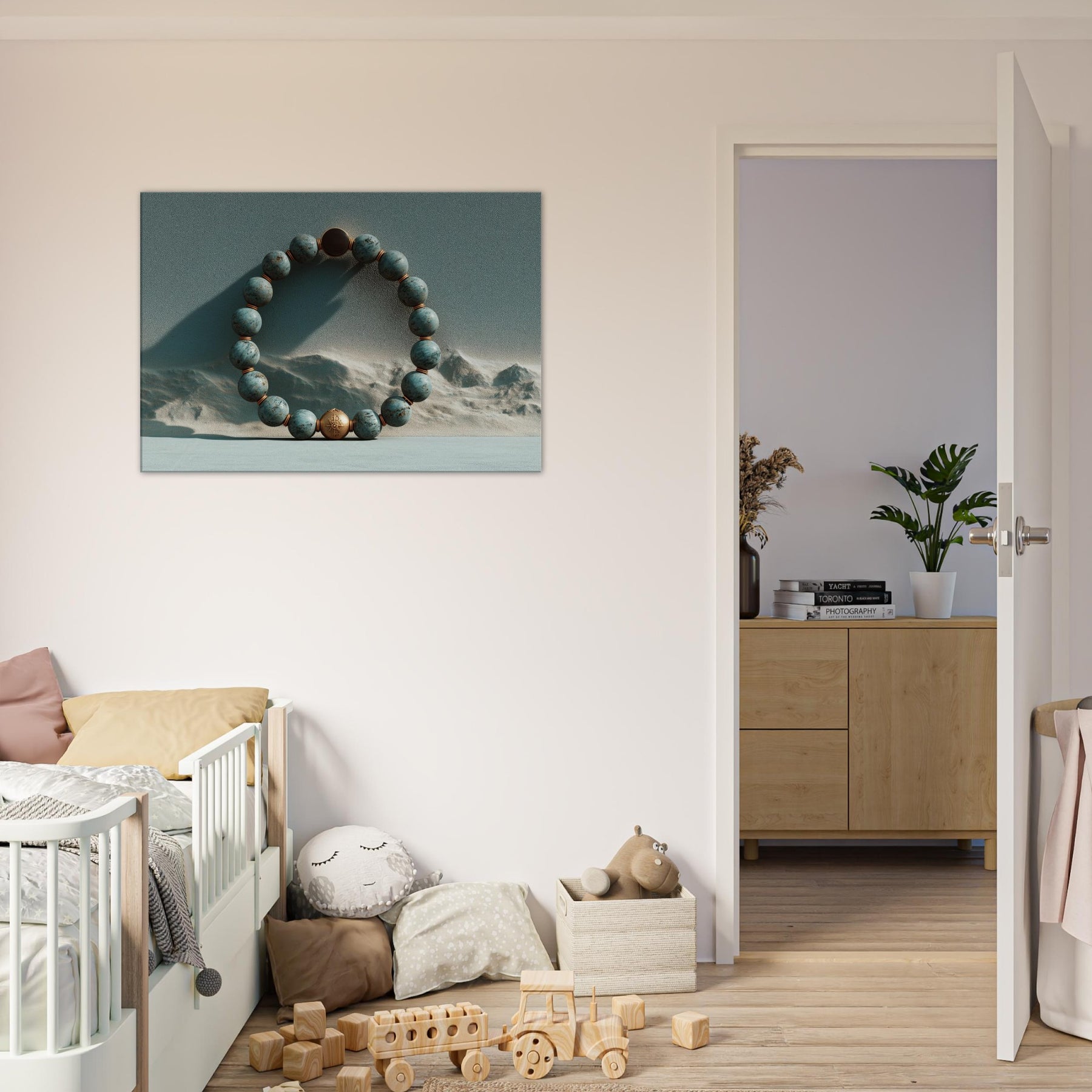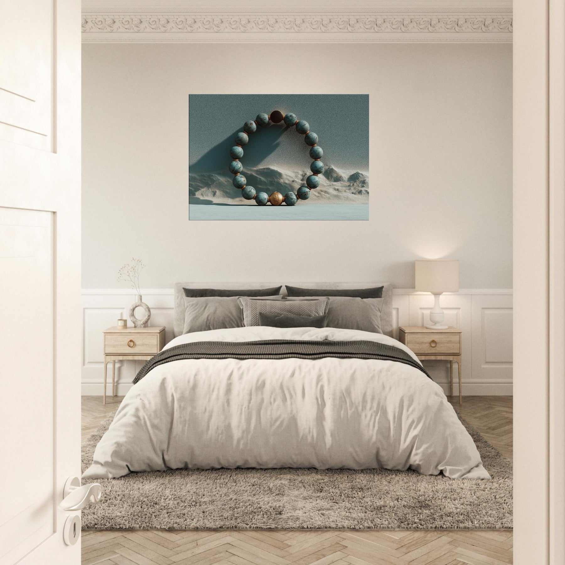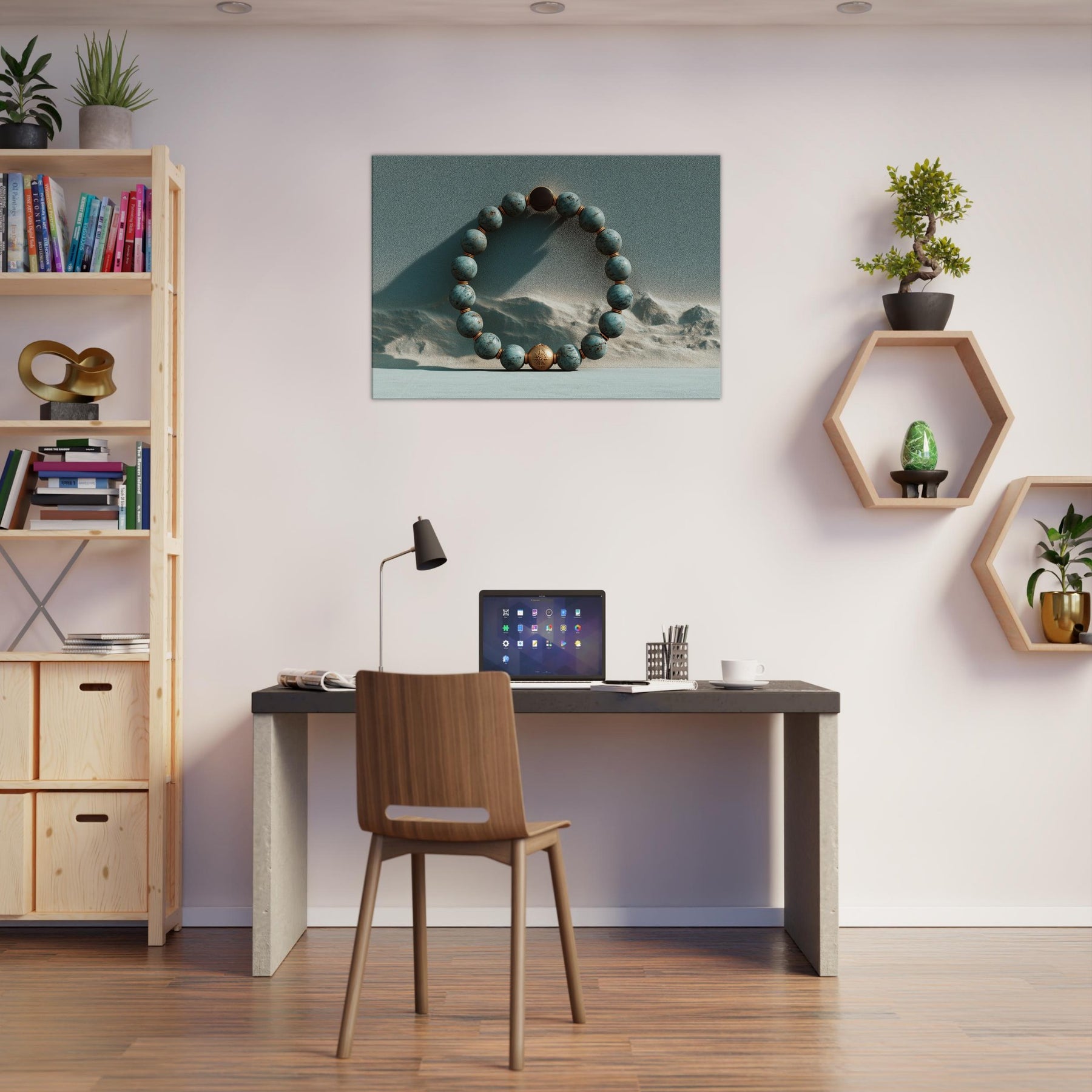 Within the frame, the Primary Subject Prayer Beads (Mala/Tasbih) circles a copper toned bead against a dunes . Turquoise spheres, punctuated by copper spacers, pulse with a soft, meditative glow as light traverses a textured, otherworldly sky. The piece exhales quiet ritual into a room, inviting slow breaths and reflection. It lends tactful depth, warmth, and a sense of spacious calm to a living room or bedroom, turning a wall into a portal of memory, solace, and mystical quiet.