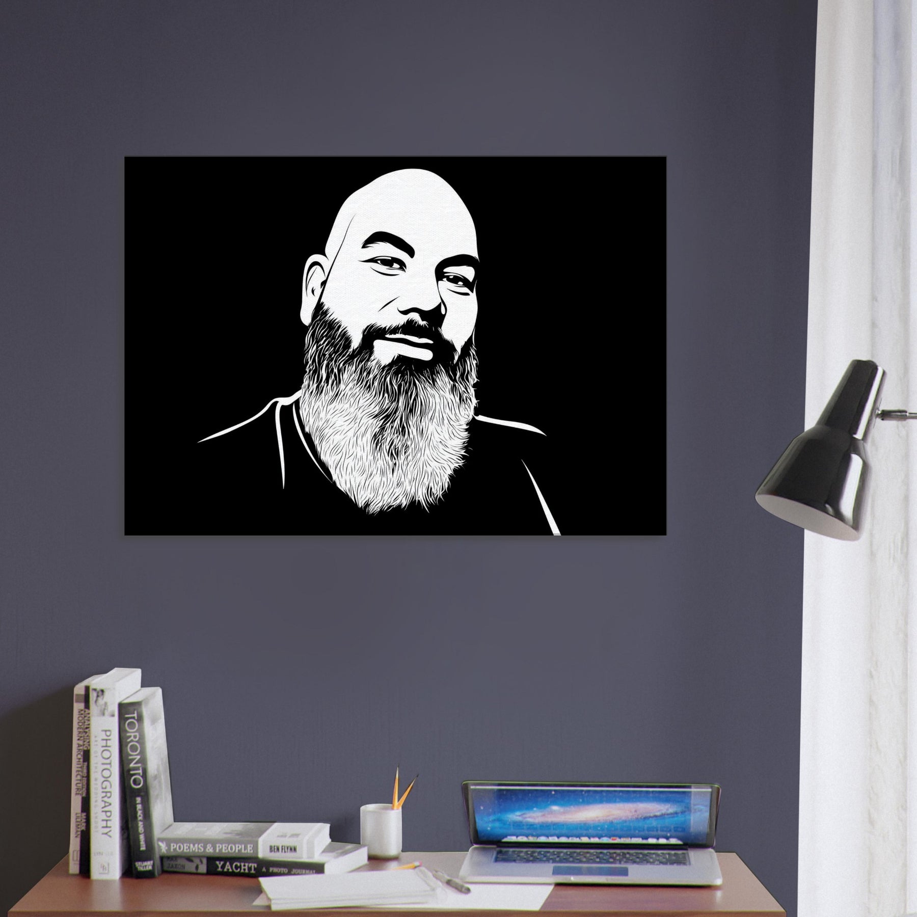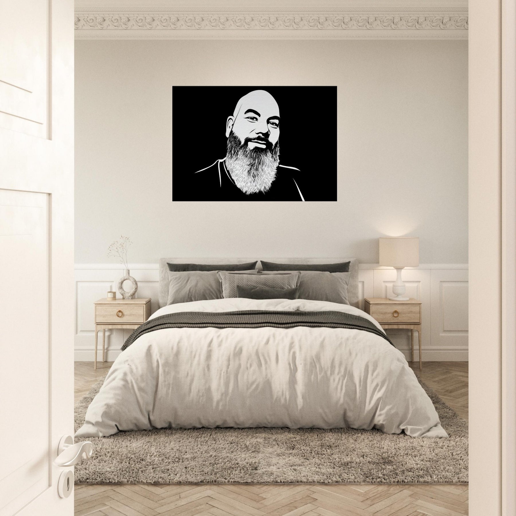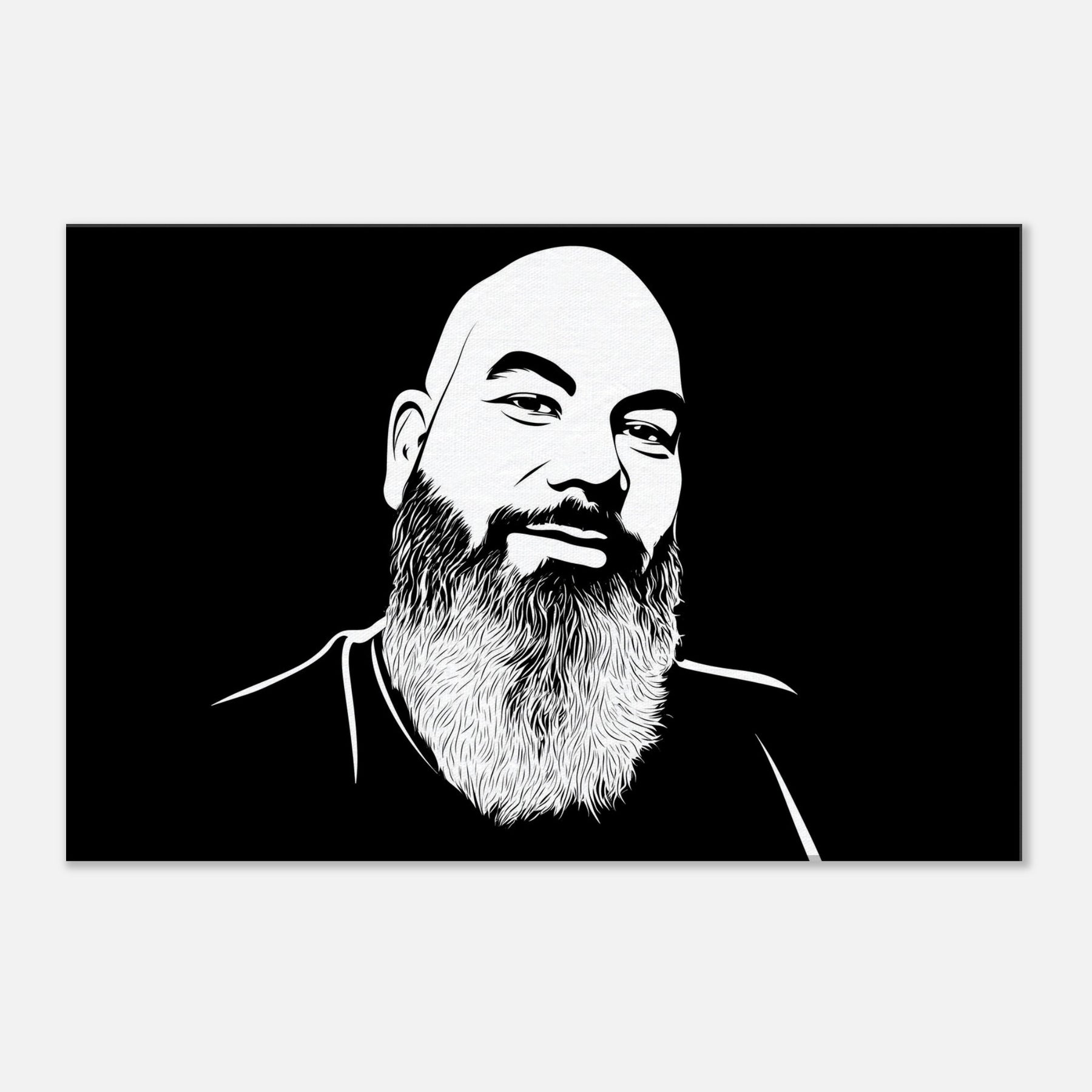 Bearded and bald, this male exudes quiet warmth and unspoken wisdom. Crafted in crisp, sweeping lines against a velvety black field, it invites the eye to linger on the curve of the brow, the texture of the beard, and the subtle smile that hints at stories held in stillness. The piece anchors a room with modern simplicity, offering contrast and serenity in equal measure. Hang it above a sofa or desk to cultivate a calm, confident atmosphere that makes everyday spaces feel gallery like. The central subject is Male (Bearded, Tribal, Bald).