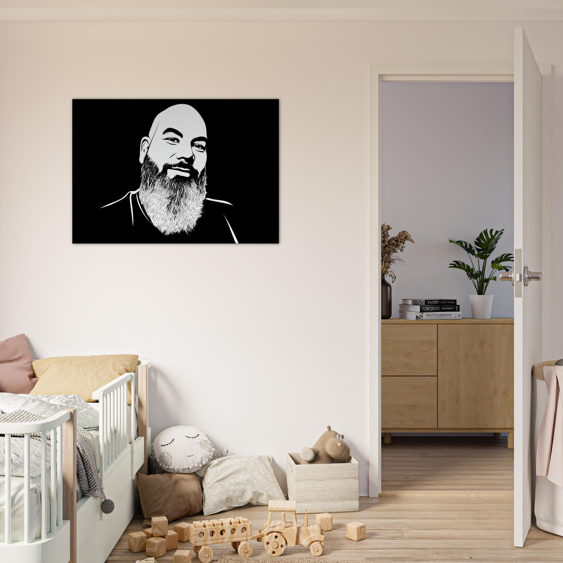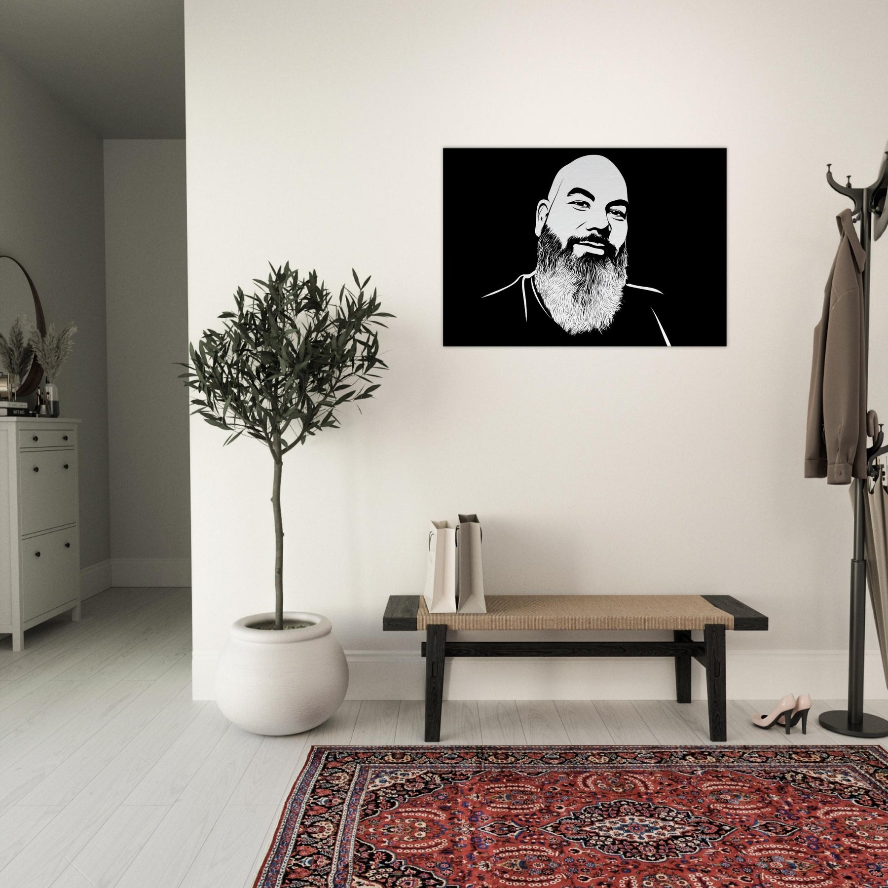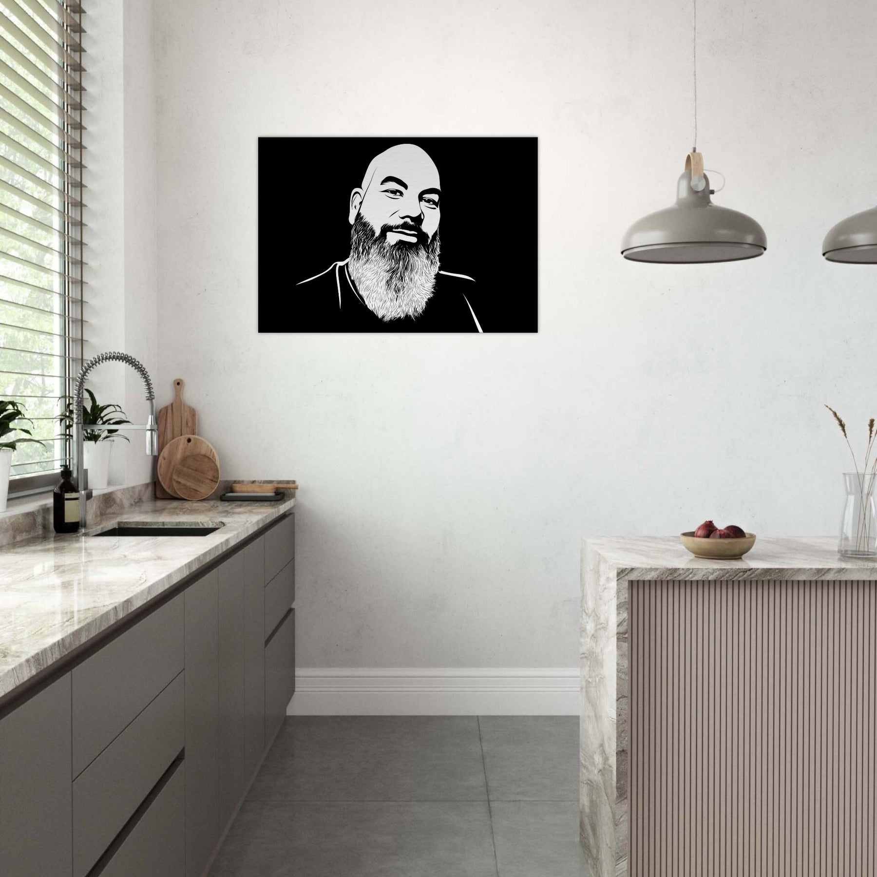 Bearded and bald, this male exudes quiet warmth and unspoken wisdom. Crafted in crisp, sweeping lines against a velvety black field, it invites the eye to linger on the curve of the brow, the texture of the beard, and the subtle smile that hints at stories held in stillness. The piece anchors a room with modern simplicity, offering contrast and serenity in equal measure. Hang it above a sofa or desk to cultivate a calm, confident atmosphere that makes everyday spaces feel gallery like. The central subject is Male (Bearded, Tribal, Bald).