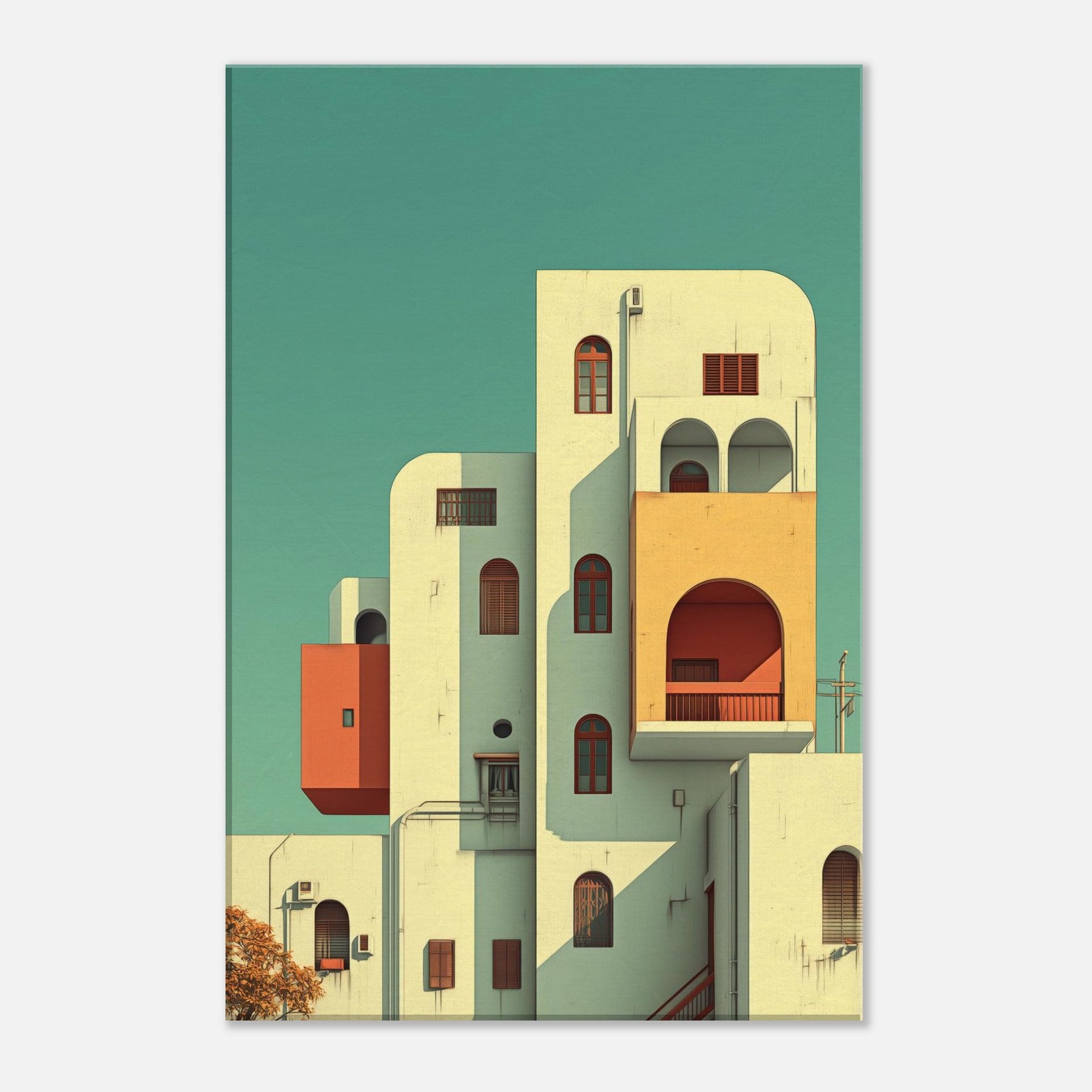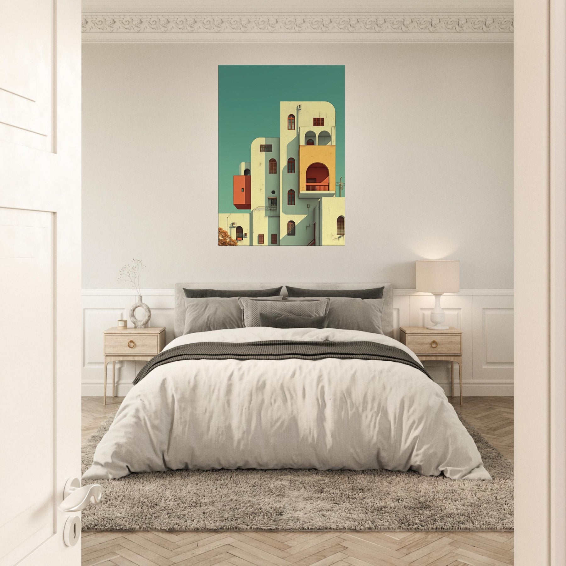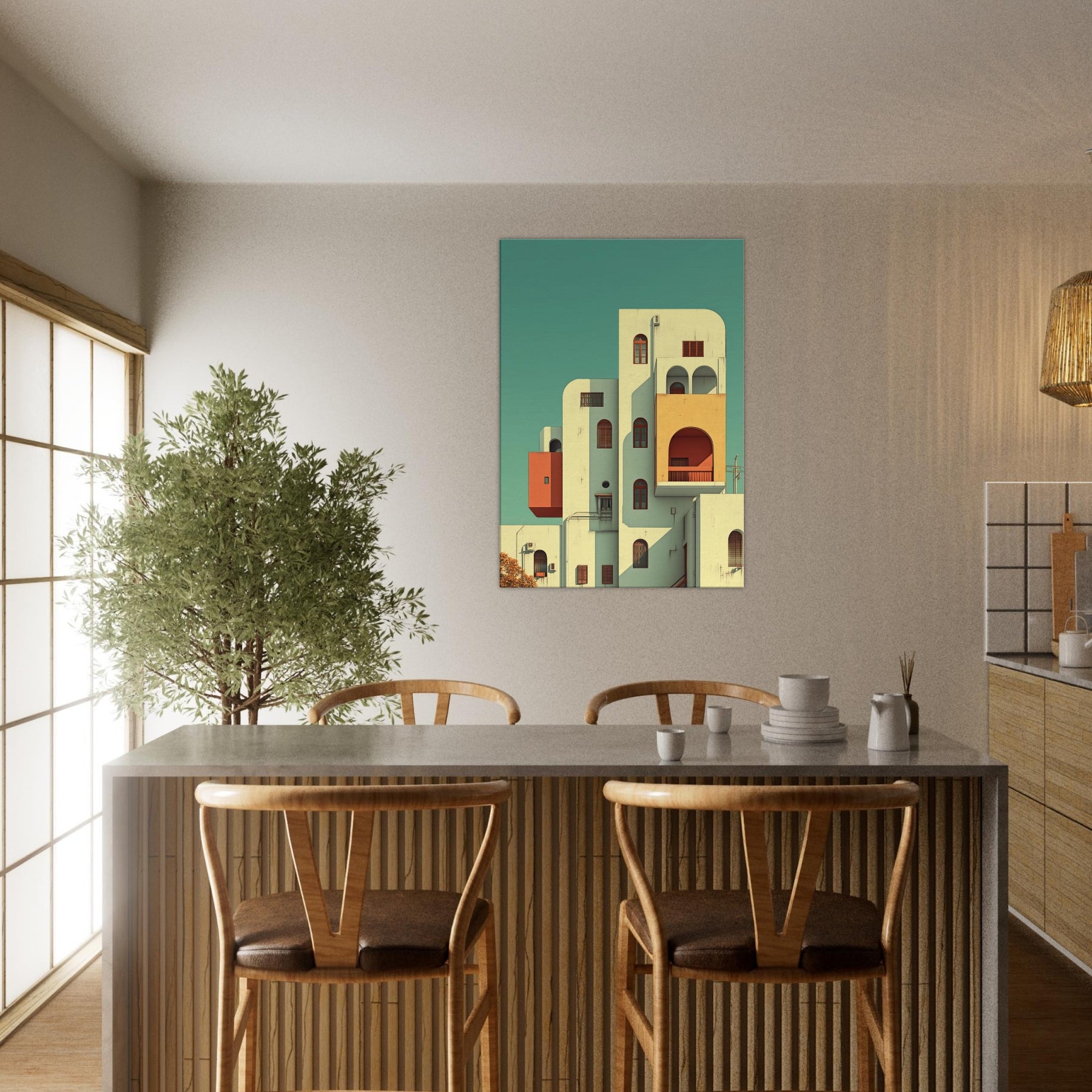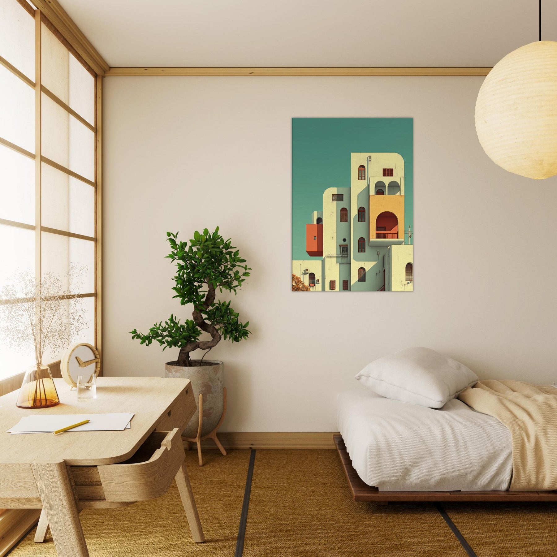Step into a city that folds, where Kyoto rises in gentle geometry and soft light. This surreal scene threads arches, balconies, and pastel volumes into a skyline that feels both ancient and alive. The composition creates a calm, dreamlike atmosphere that slows time and invites reflection, making a living space feel more expansive. Hang it in a foyer, above a sofa, or in a study to let architecture breathe and color quiet the day.