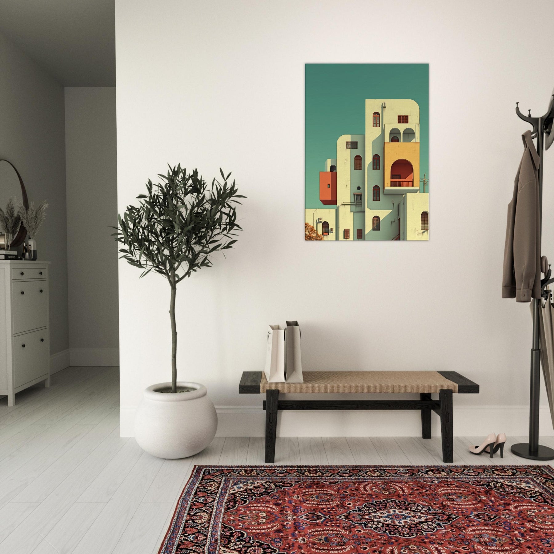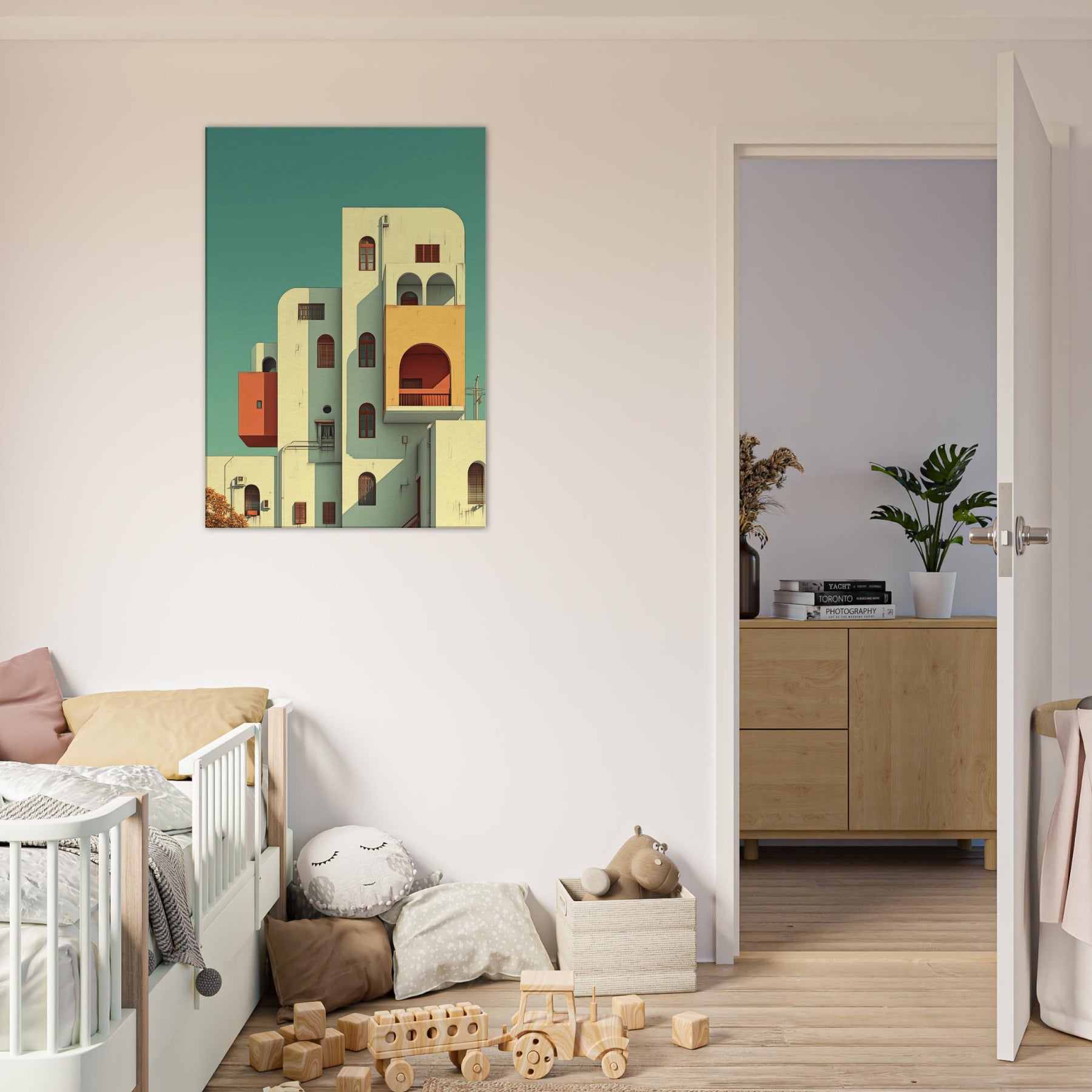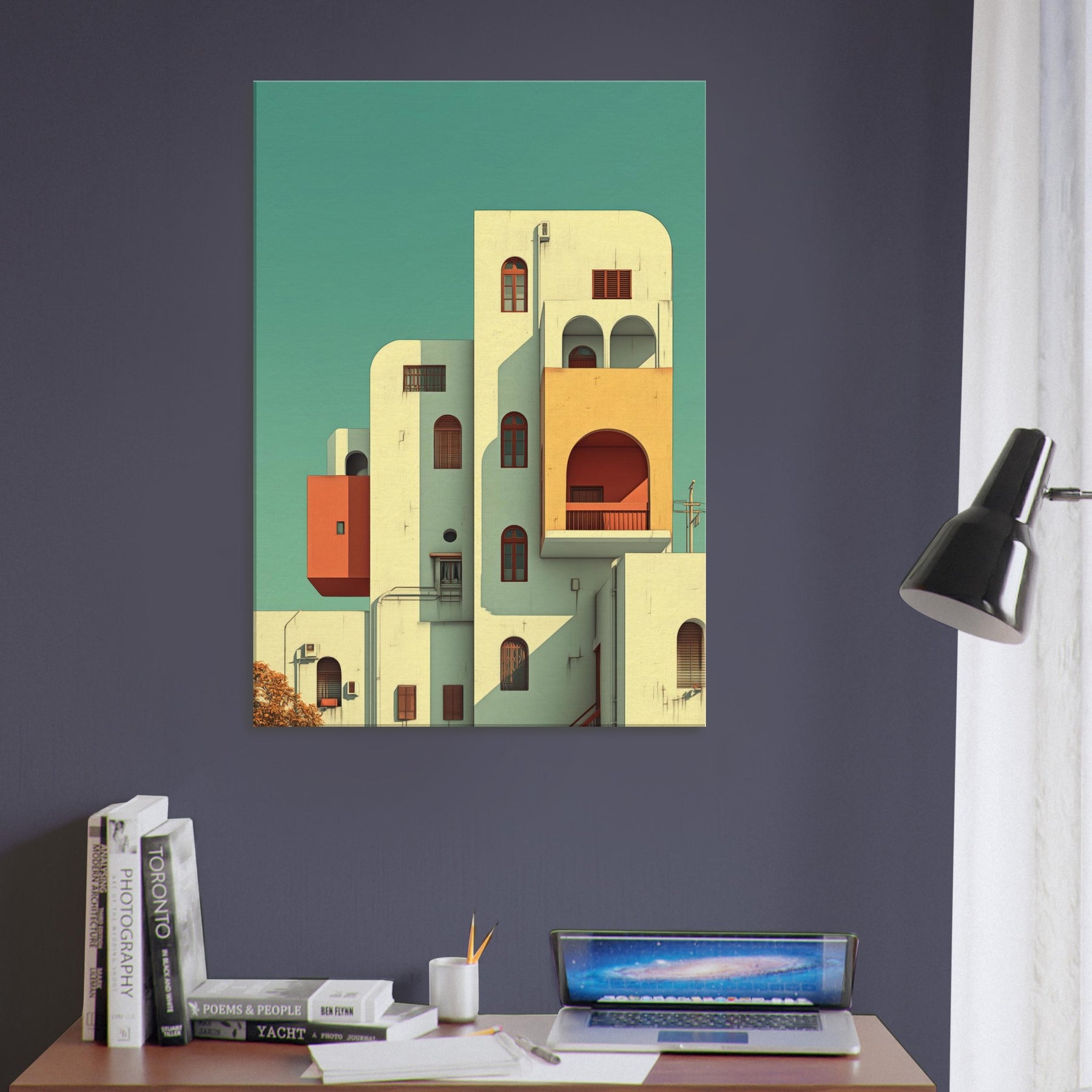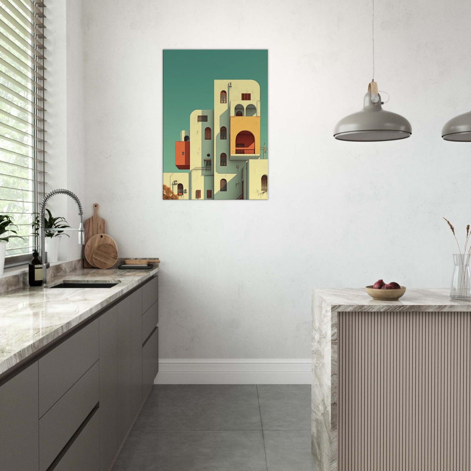 Step into a city that folds, where Kyoto rises in gentle geometry and soft light. This surreal scene threads arches, balconies, and pastel volumes into a skyline that feels both ancient and alive. The composition creates a calm, dreamlike atmosphere that slows time and invites reflection, making a living space feel more expansive. Hang it in a foyer, above a sofa, or in a study to let architecture breathe and color quiet the day.