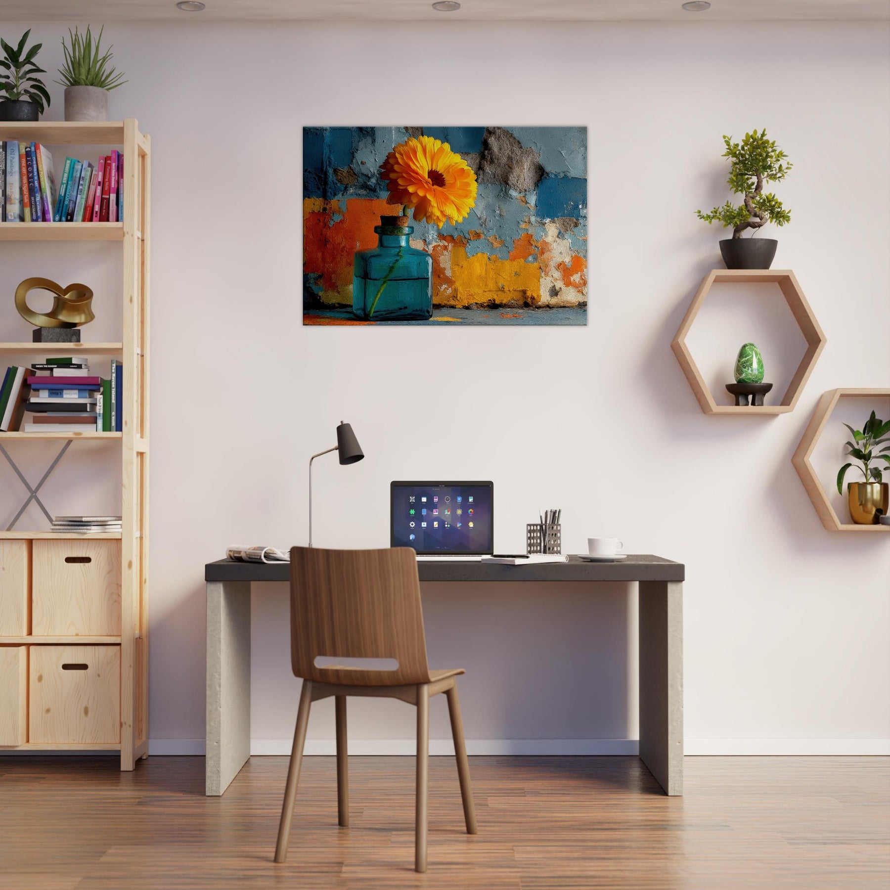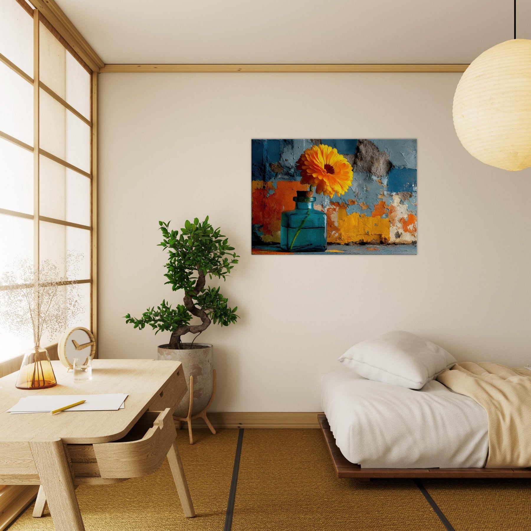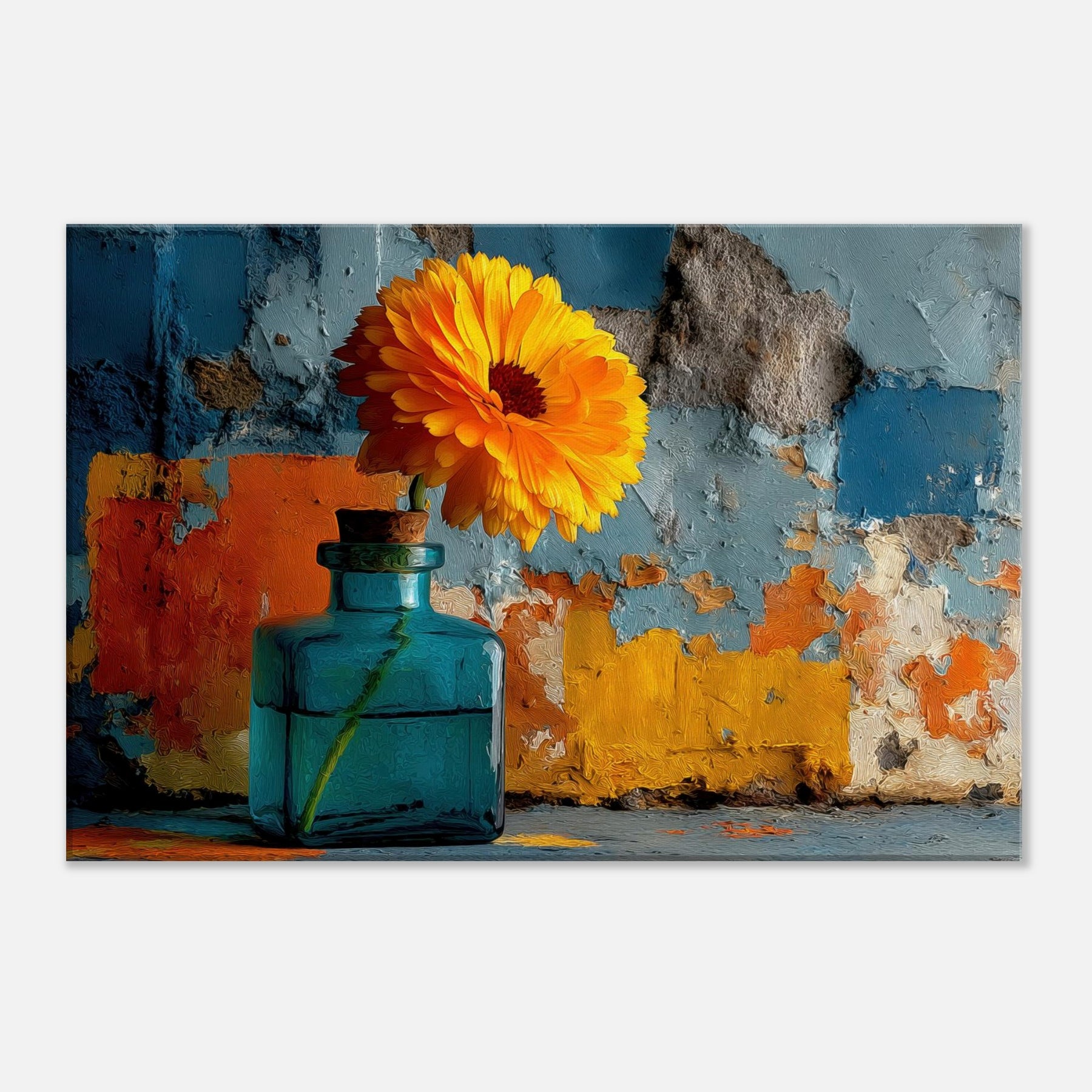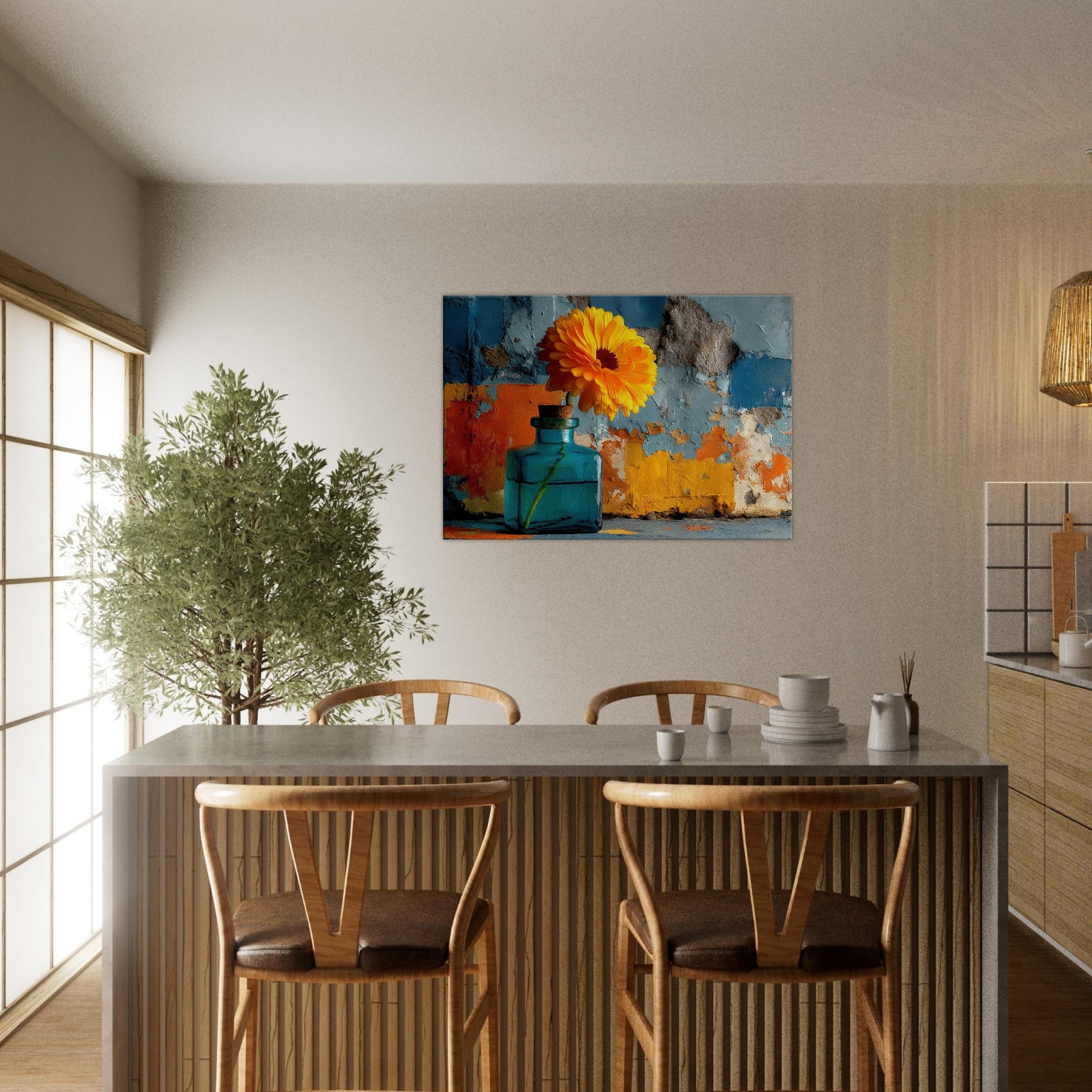 Let this piece cradle your space with a quiet, electric stillness. The focal point a Single Flower in Vase drifts above a blocky, textured backdrop of sunlit blues and burnt ochre tones. The radiant petals glow like dawn, while the blue bottle grounds the scene with cool gravity. Abstract brushwork ripples across the canvas, inviting the eye to wander and the mind to pause. In a living room or quiet corner, it cultivates warmth, mood, and a subtle, cinematic elegance.