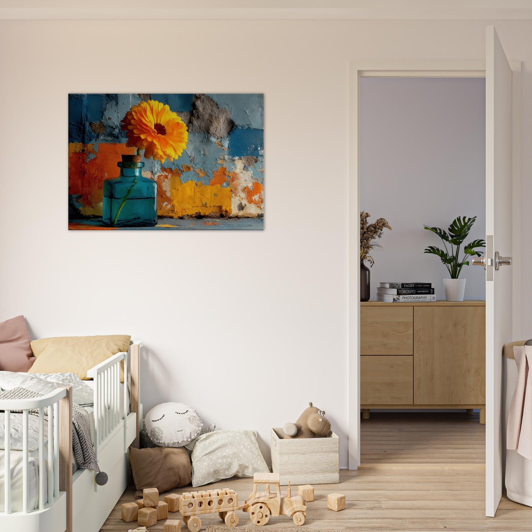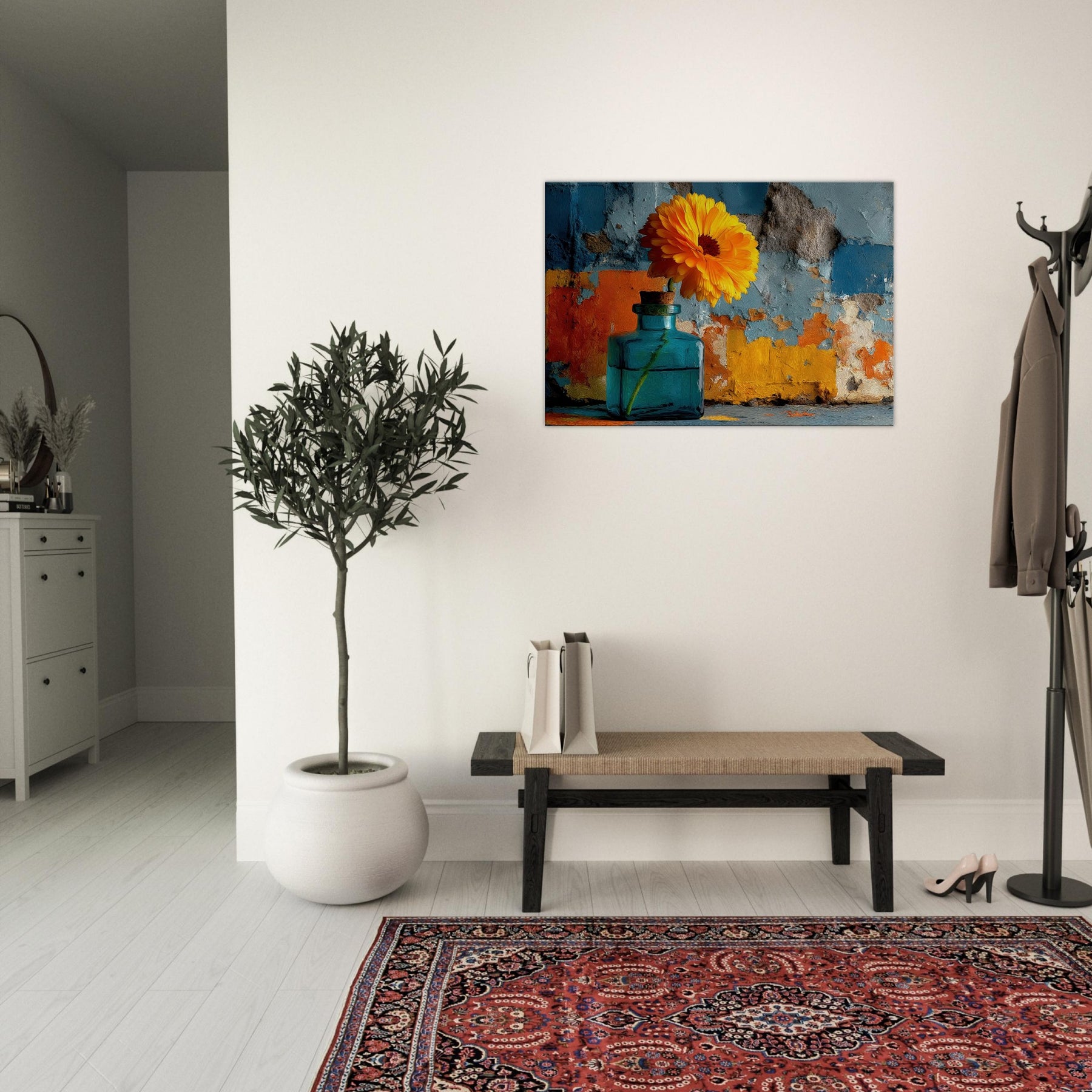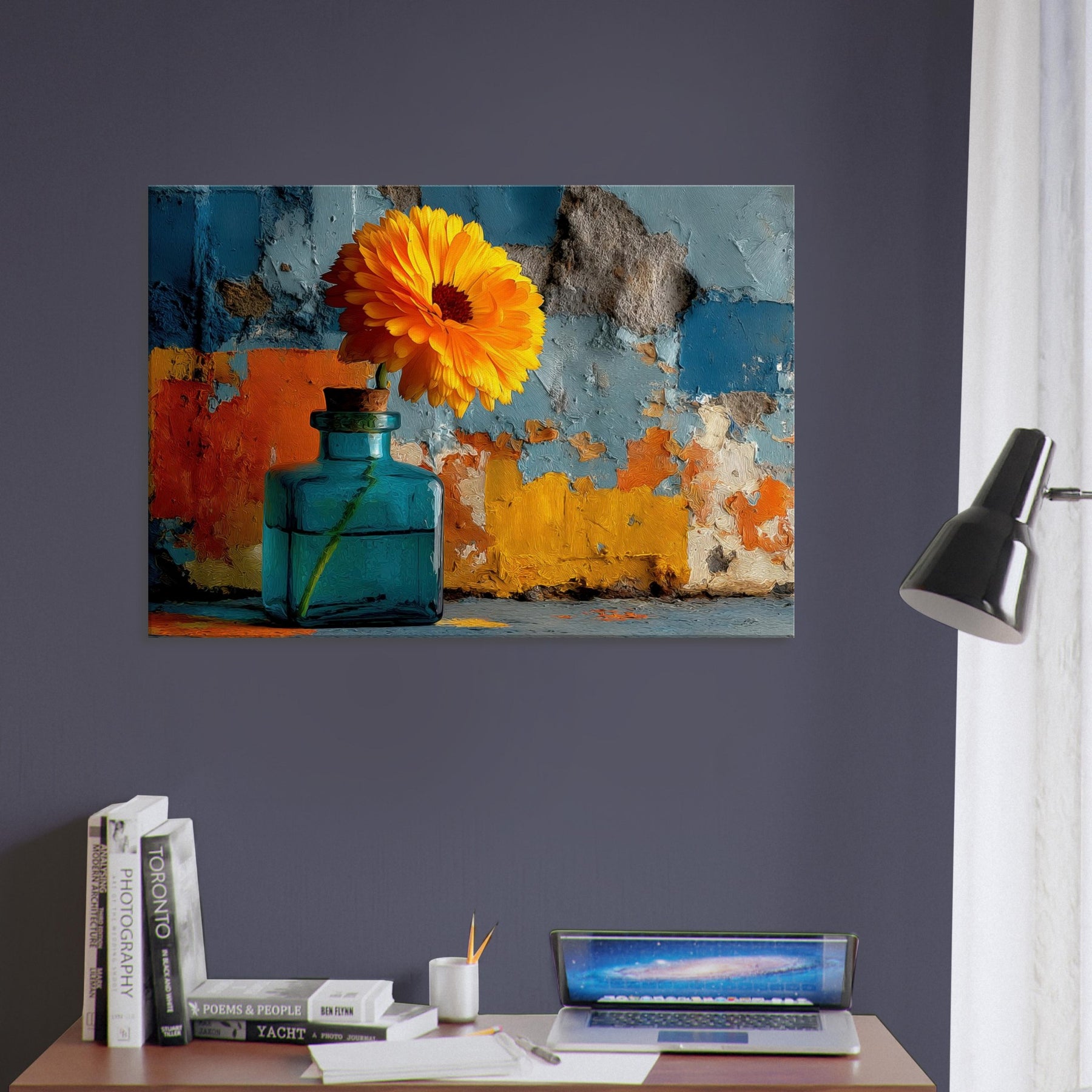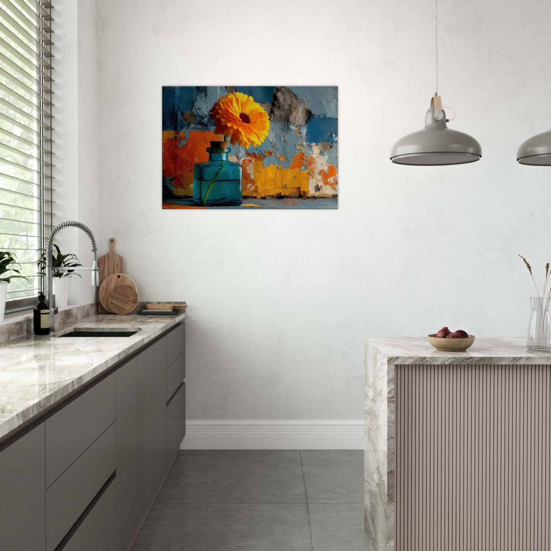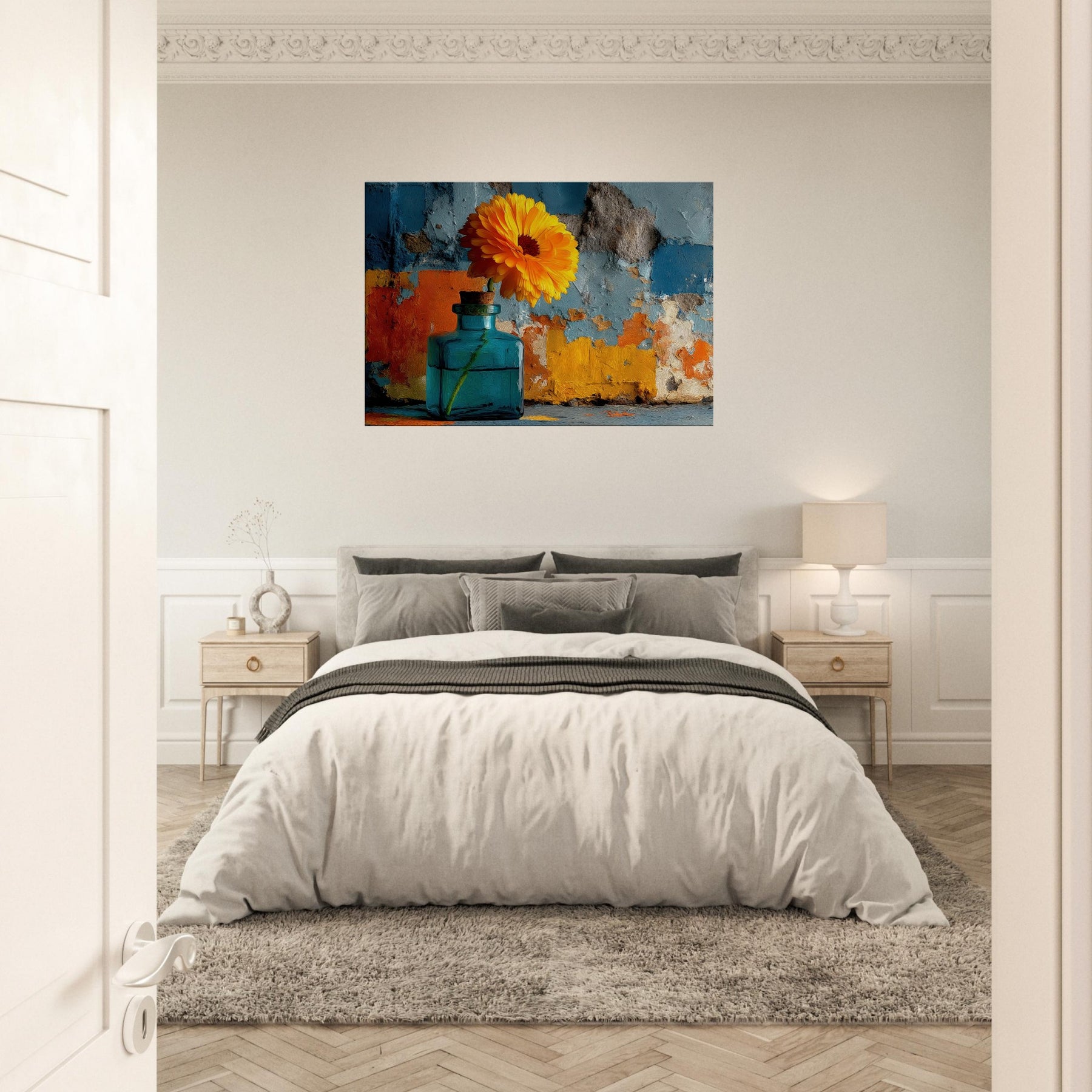 Let this piece cradle your space with a quiet, electric stillness. The focal point a Single Flower in Vase drifts above a blocky, textured backdrop of sunlit blues and burnt ochre tones. The radiant petals glow like dawn, while the blue bottle grounds the scene with cool gravity. Abstract brushwork ripples across the canvas, inviting the eye to wander and the mind to pause. In a living room or quiet corner, it cultivates warmth, mood, and a subtle, cinematic elegance.