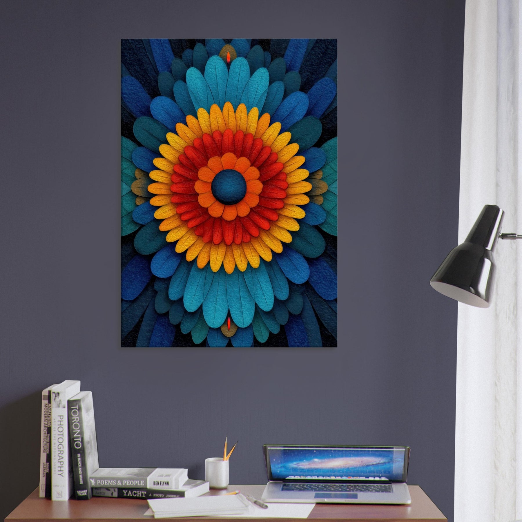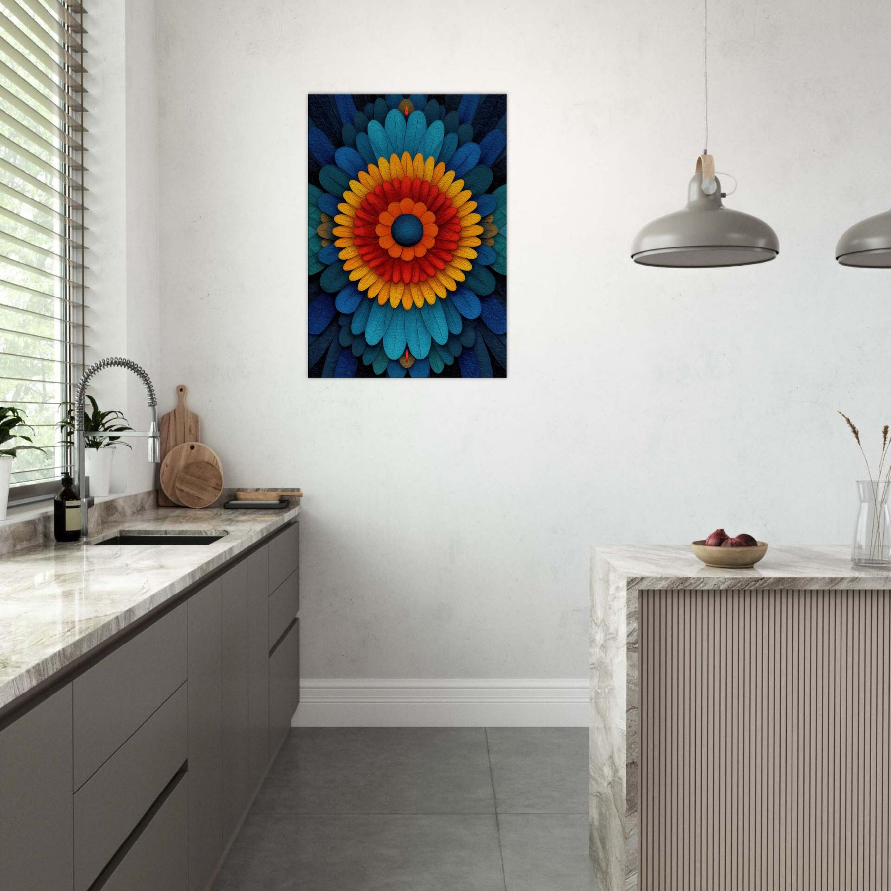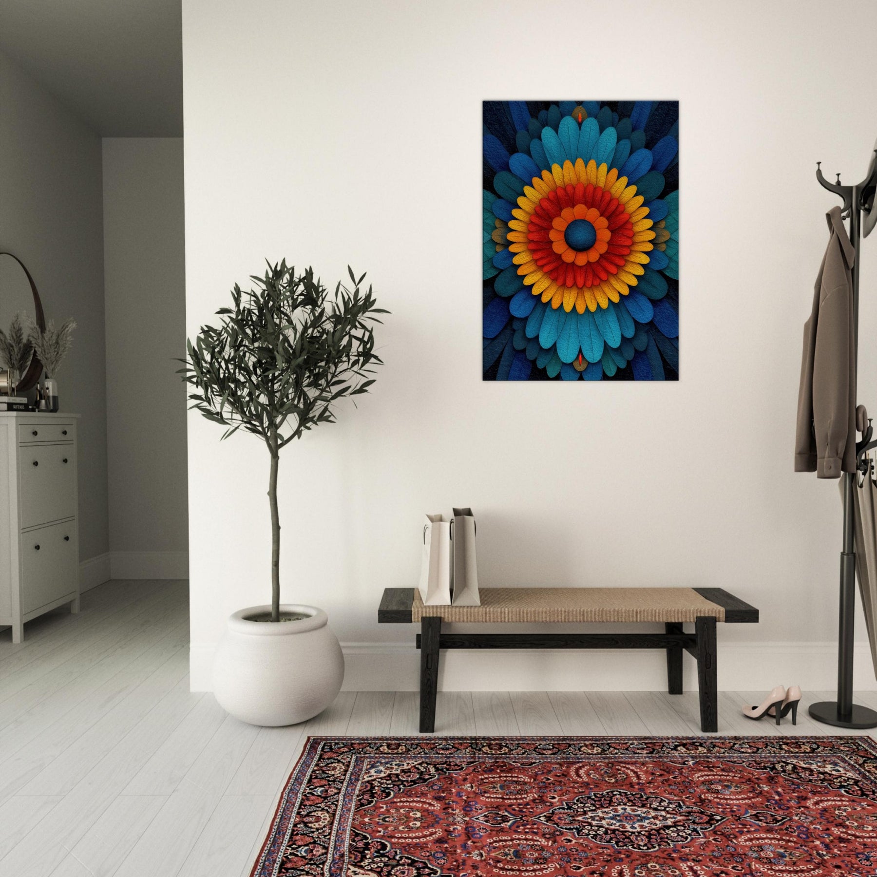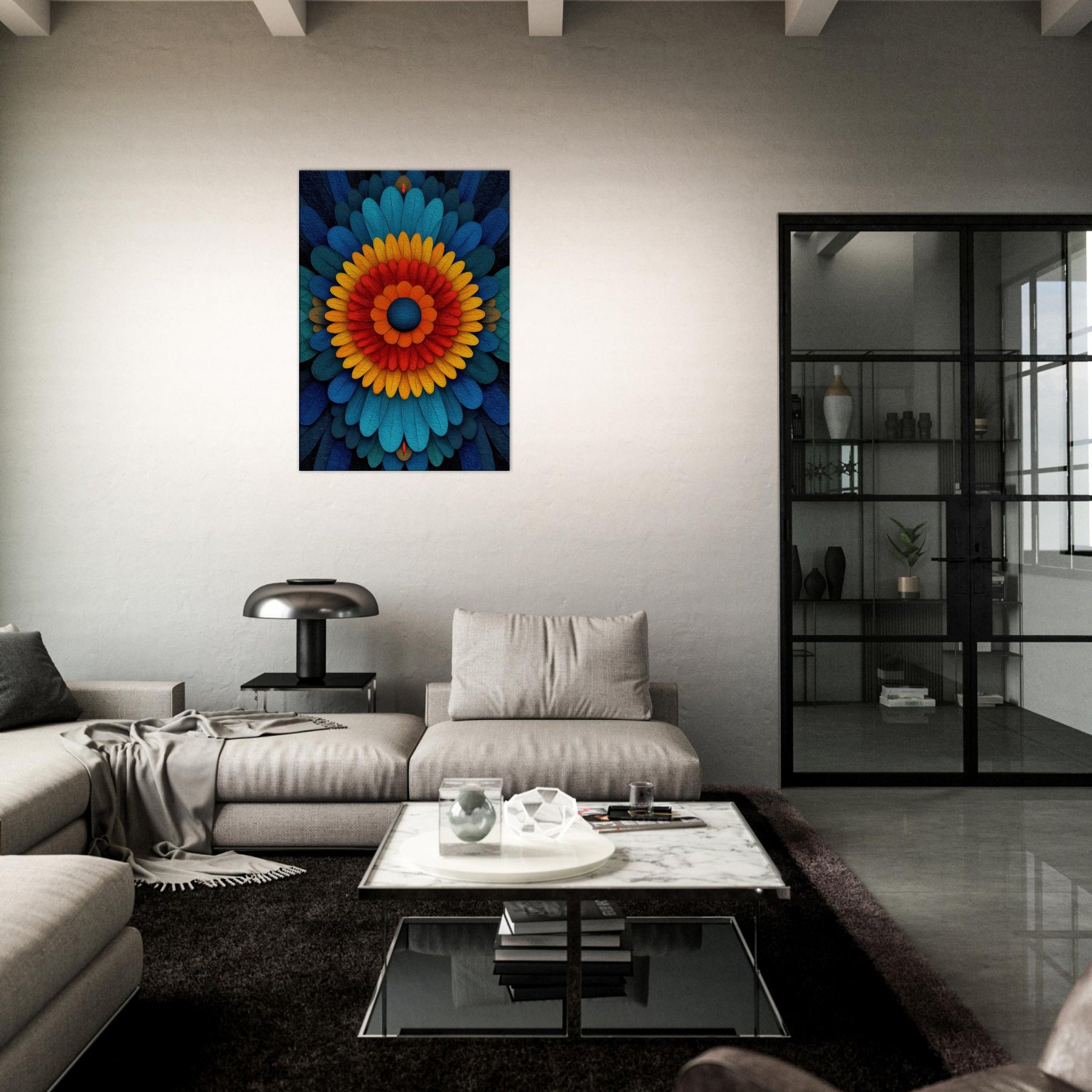 Mandala unfurls in radiant color, a graceful abstract composition folding petals into a breath of warmth. The layers spiral from a deep center, with sunlit oranges giving way to coral reds and cool teals that seem to hum with energy. Each petal texture suggests velvet, inviting the eye to linger and the mind to soften. Hang this in the living room or hallway to anchor conversations, invite mindfulness, and transform a wall into a portal of mystical serenity.