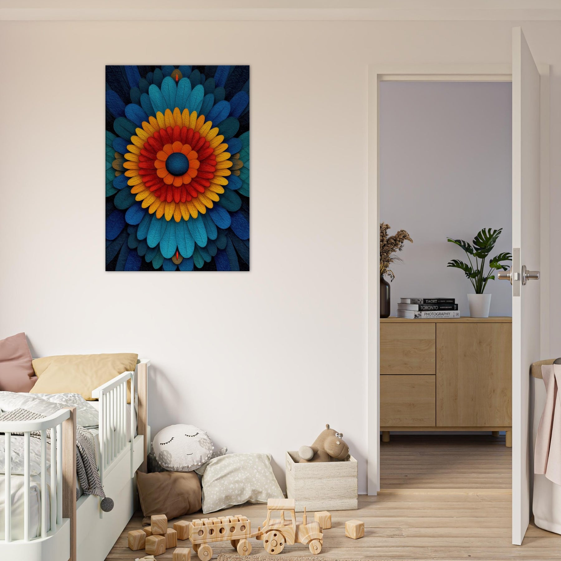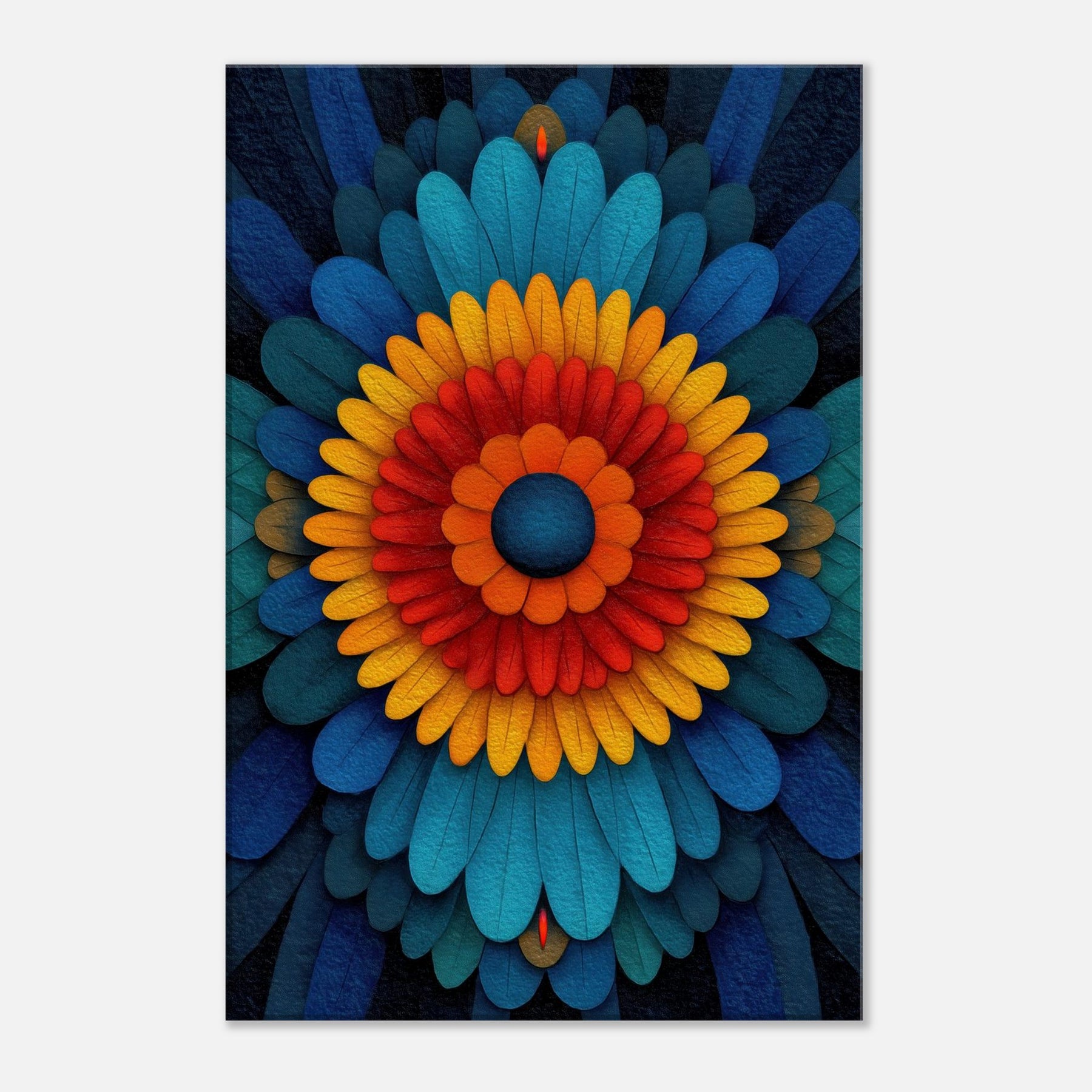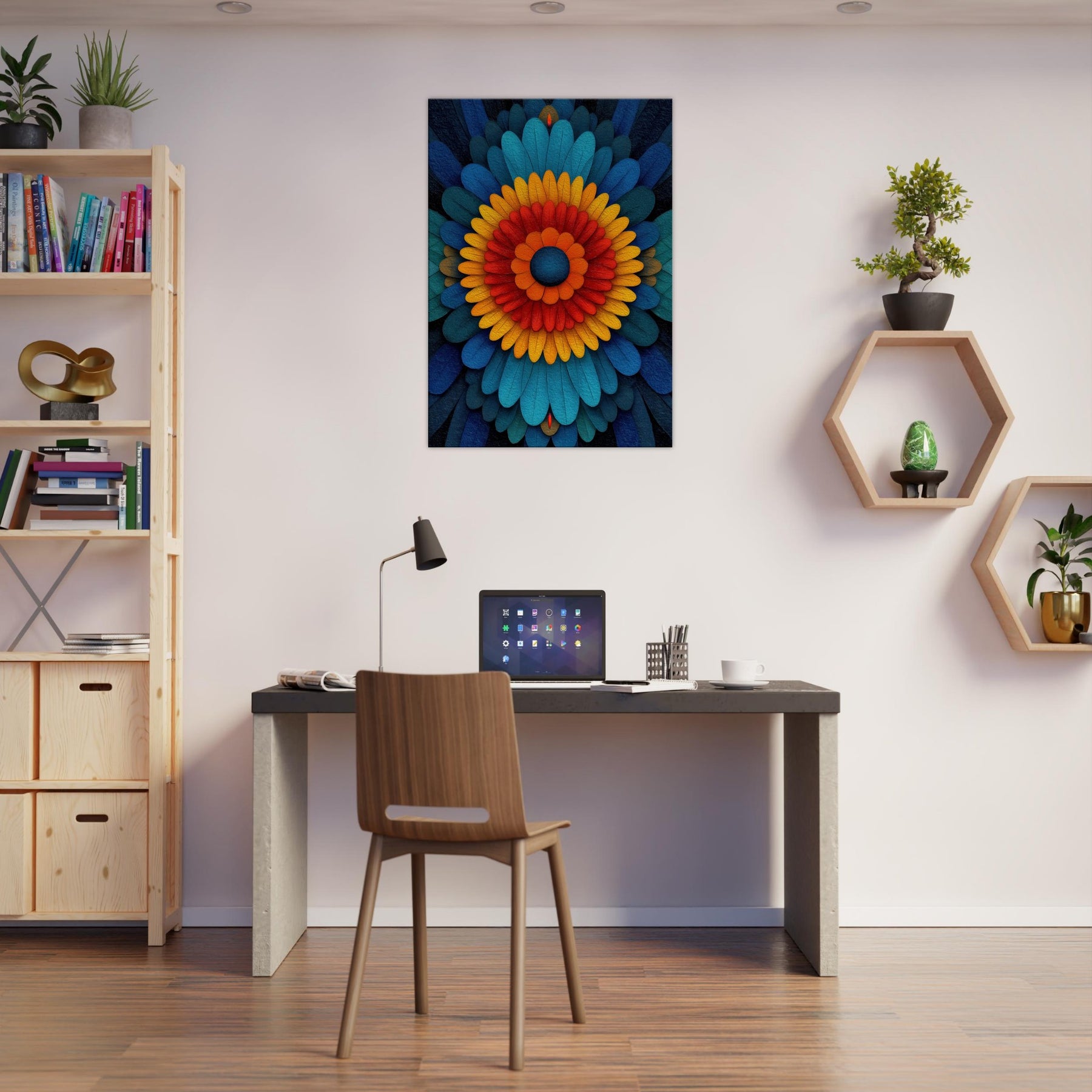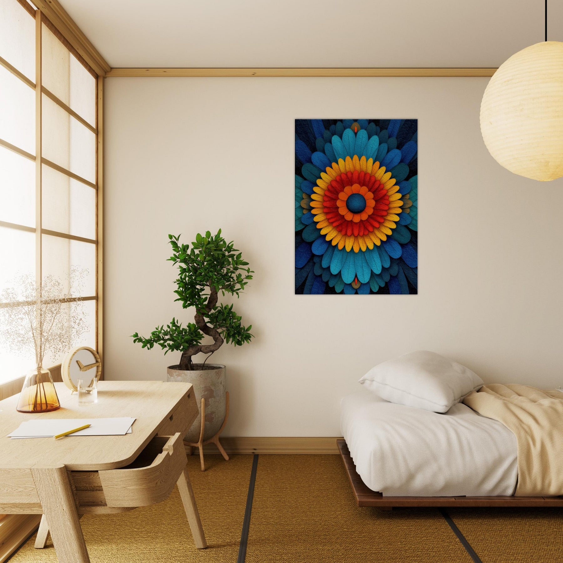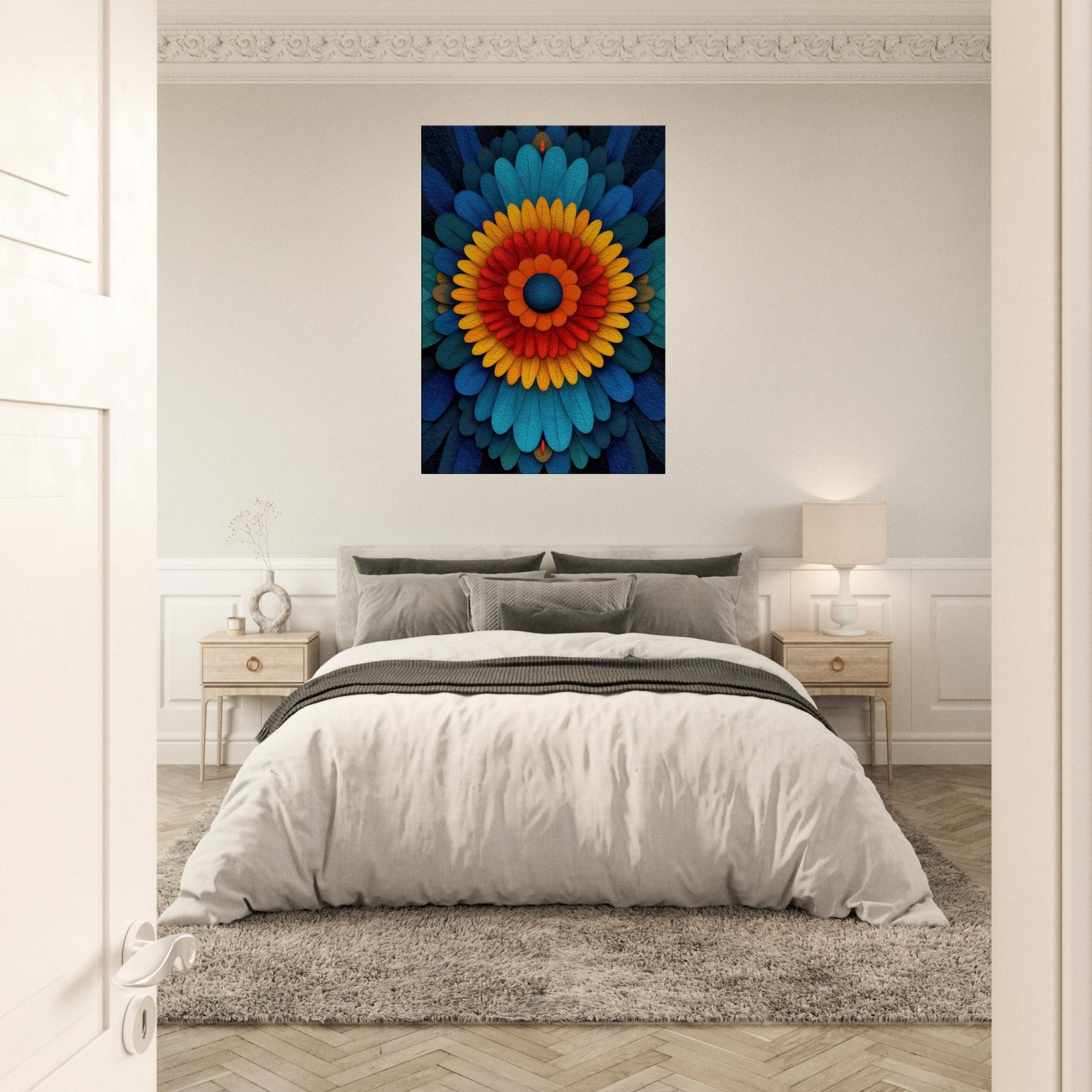 Mandala unfurls in radiant color, a graceful abstract composition folding petals into a breath of warmth. The layers spiral from a deep center, with sunlit oranges giving way to coral reds and cool teals that seem to hum with energy. Each petal texture suggests velvet, inviting the eye to linger and the mind to soften. Hang this in the living room or hallway to anchor conversations, invite mindfulness, and transform a wall into a portal of mystical serenity.