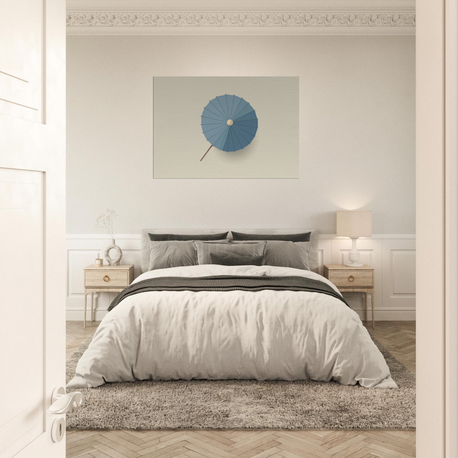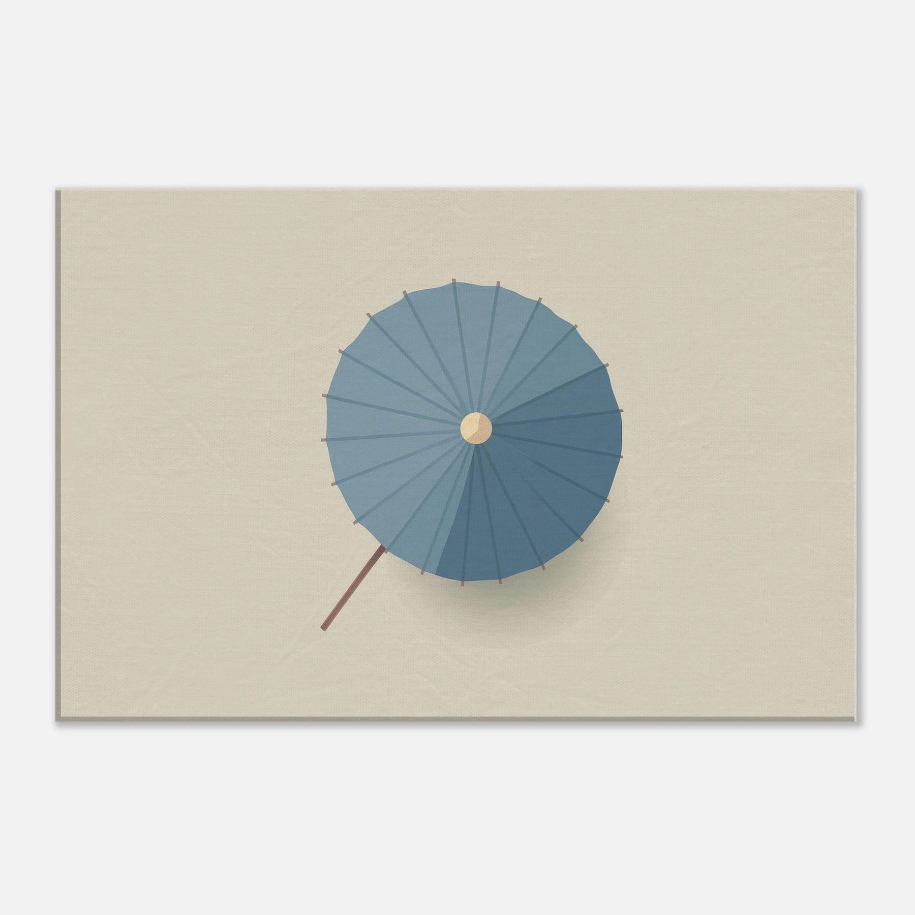 Paper Umbrella rests as a quiet anchor on your wall, a minimalist circle of calm that softens light into a gentle mood. The blue canopy unfolds in precise radial segments, its restraint inviting focus, memory, and breath. In a sunlit living room or tranquil bedroom, this piece grounds the space with elegance, creating room for stillness and conversation. The Primary Subject, Paper Umbrella, hints at distant shores and shelter, turning everyday walls into a serene frame for color, texture, and the quiet rituals of home.