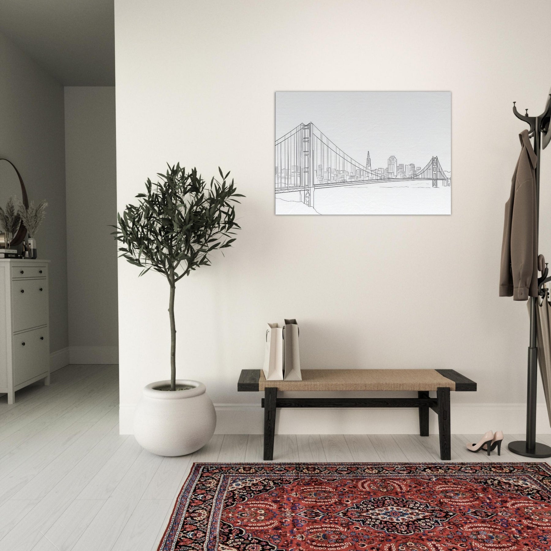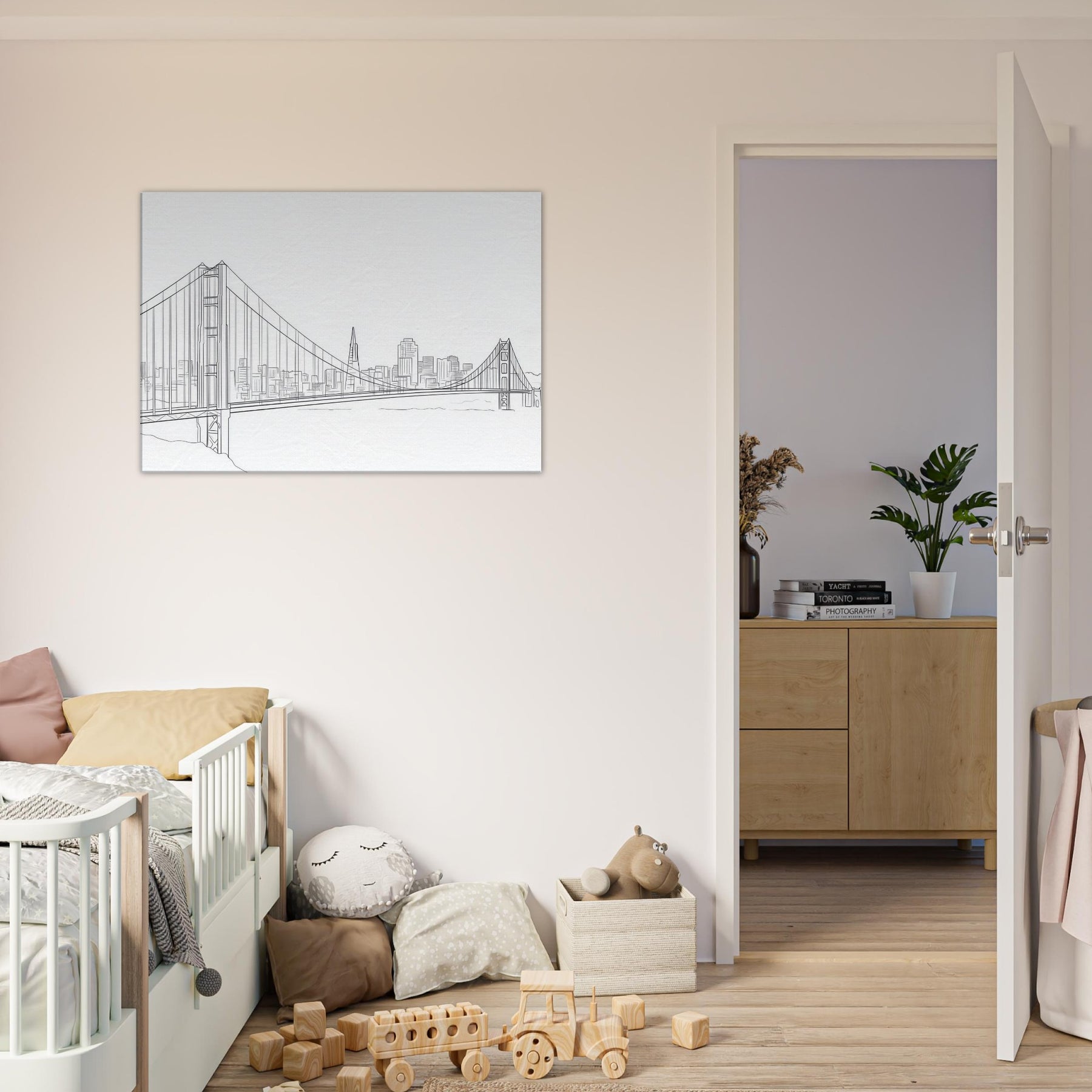 This piece centers on the Primary Subject: Famous Bridges (Golden Gate, Tower Bridge) rendered in clean, continuous lines that echo city skylines. The result is a quiet, confident presence: a monochrome echo of steel cables, towers, and shimmering water. The mood is airy and contemplative, ideal for a modern living room or studio, where the art breathes with you and softens bold furniture. It invites slow, daydreaming gaze, turning any wall into an invitation to travel, architecture, and the beauty of disciplined simplicity.