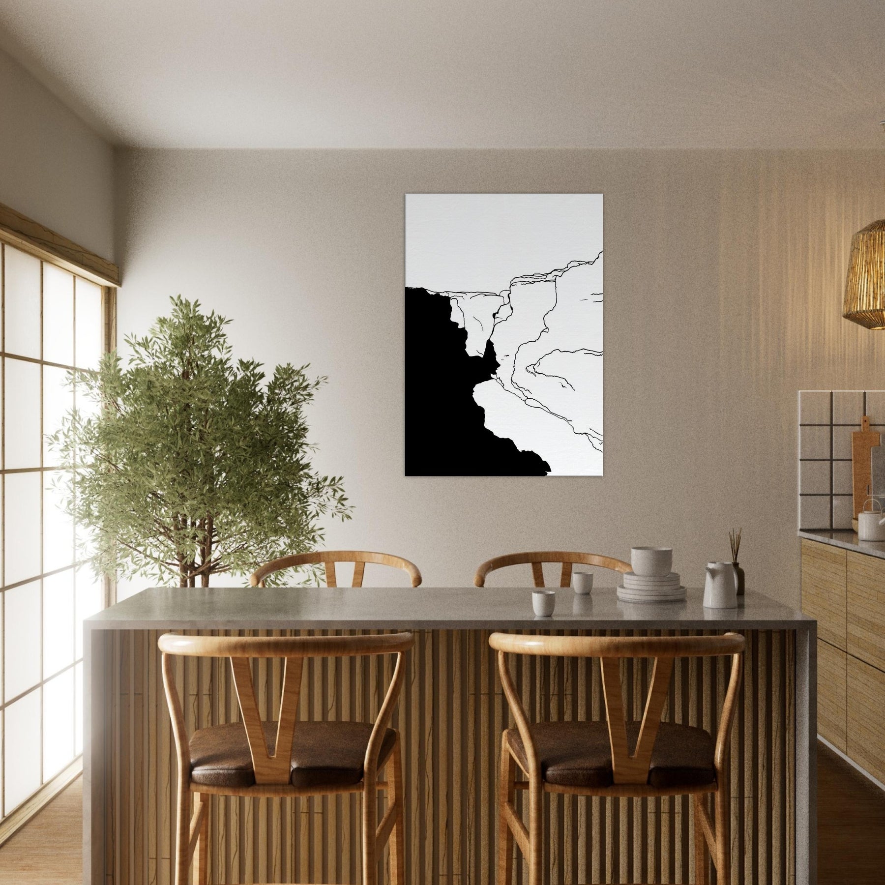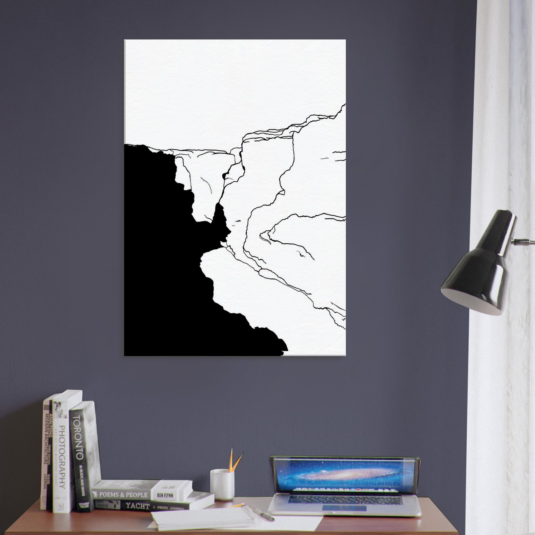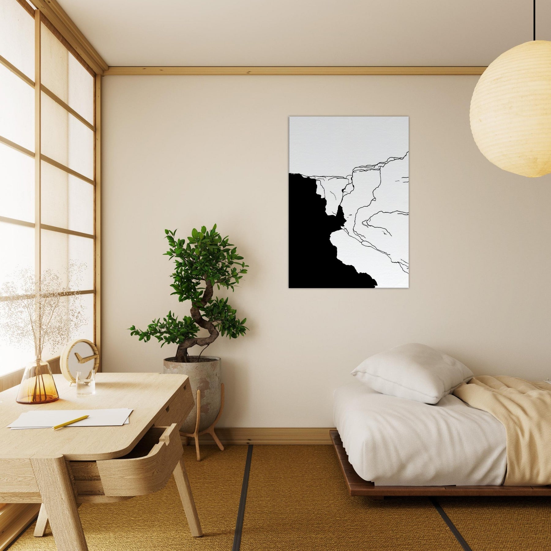 Immerse your space in the quiet grandeur of the Canyon, distilled into a single, elegant line drawing. This piece celebrates nature's vastness through simplicity: a carved edge, a whisper of shadow, and the rhythm of wind swept cliffs rendered in confident strokes. The stark black and white contrast invites calm focus, turning a living room corner into a meditative moment. Perfect over a sofa or bedside, it pairs with warm textures or cool metals, inviting daylight or lamplight to trace its contours.