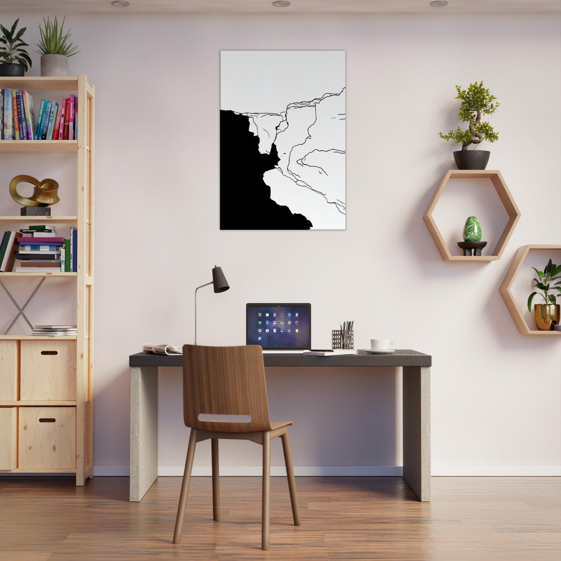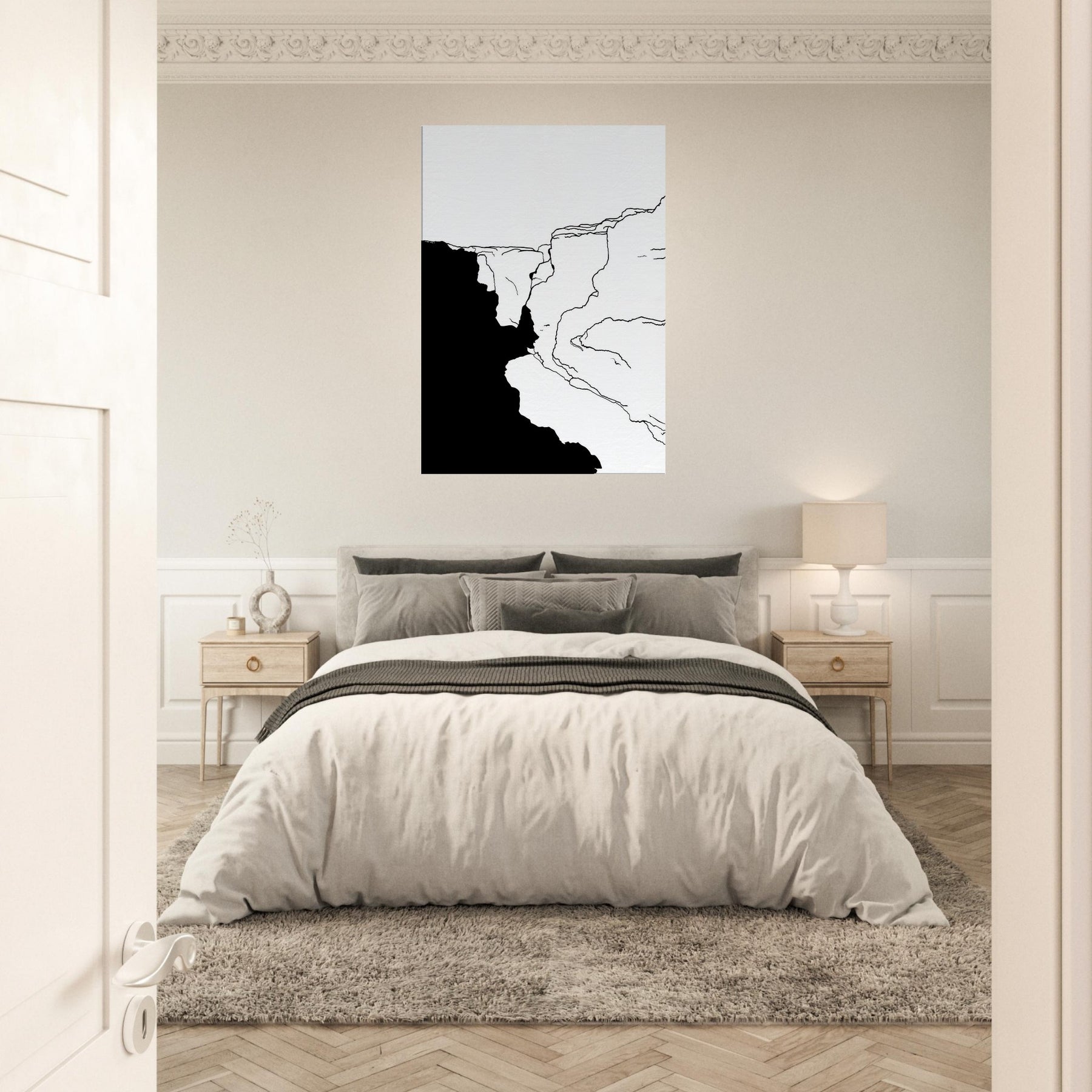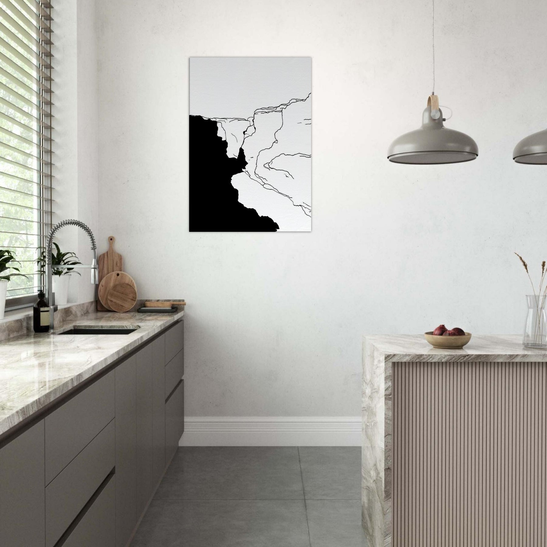 Immerse your space in the quiet grandeur of the Canyon, distilled into a single, elegant line drawing. This piece celebrates nature's vastness through simplicity: a carved edge, a whisper of shadow, and the rhythm of wind swept cliffs rendered in confident strokes. The stark black and white contrast invites calm focus, turning a living room corner into a meditative moment. Perfect over a sofa or bedside, it pairs with warm textures or cool metals, inviting daylight or lamplight to trace its contours.