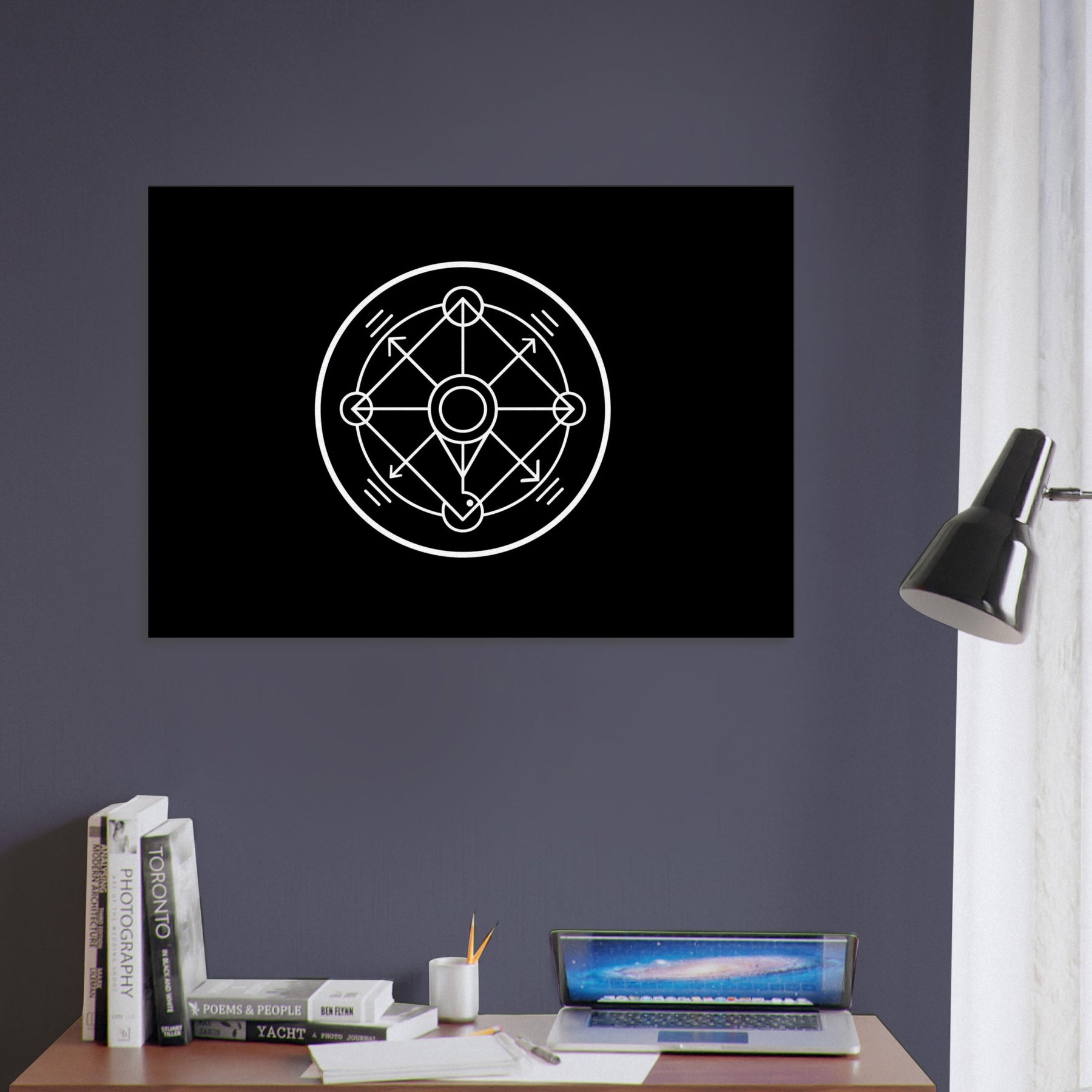 Drawn in luminous line, this piece gathers mystery and calm into a single, hypnotic circle. A line art meditation on Alchemy Symbols (Salt, Sulfur, Mercury), the geometric paths tracing balance between polarity and unity. The stark white on black creates a quiet radiance, as if a secret formula hums behind the wall. Hang it to transform a living room corner into a sanctuary of focus and wonder an elegant focal point that invites reflection and conversation.