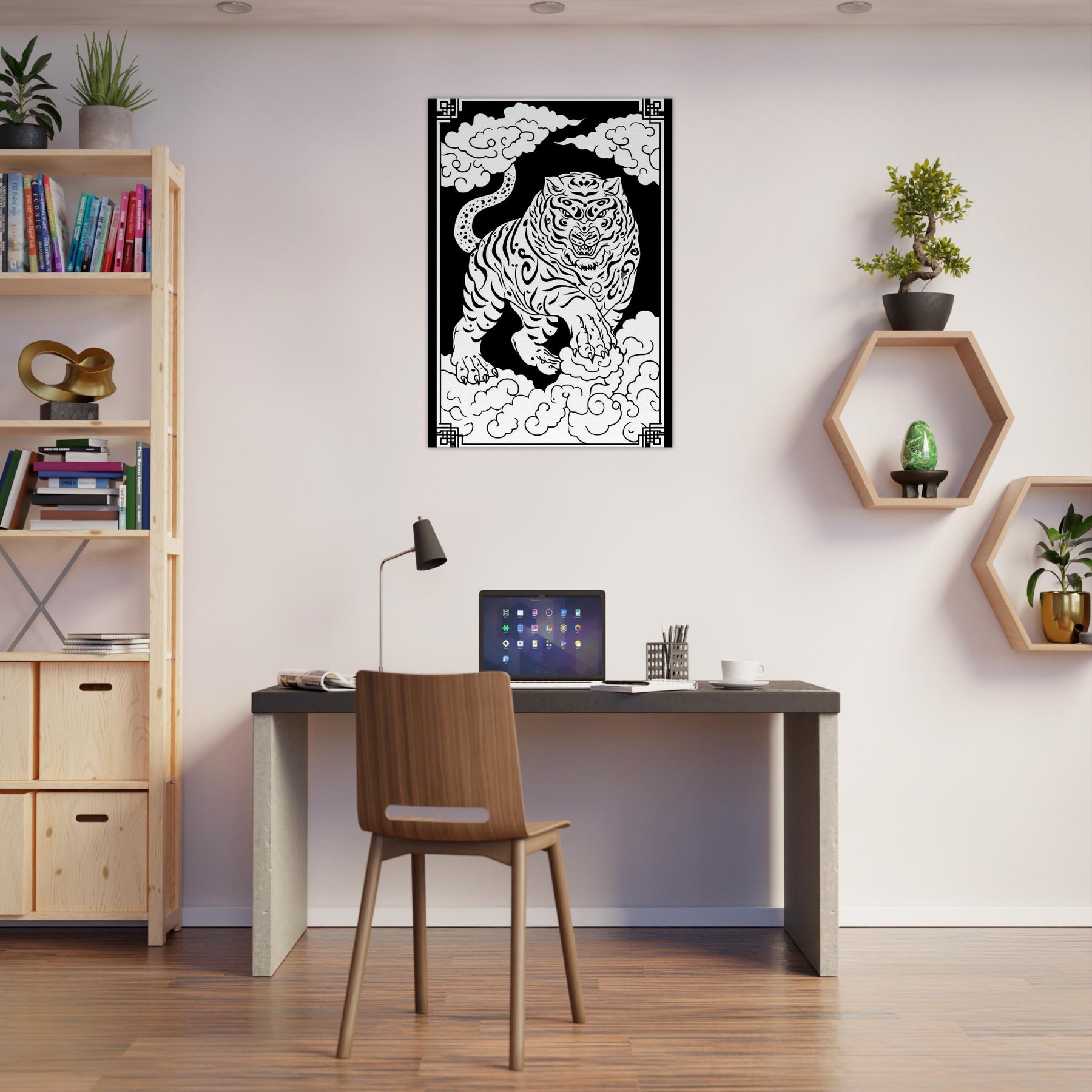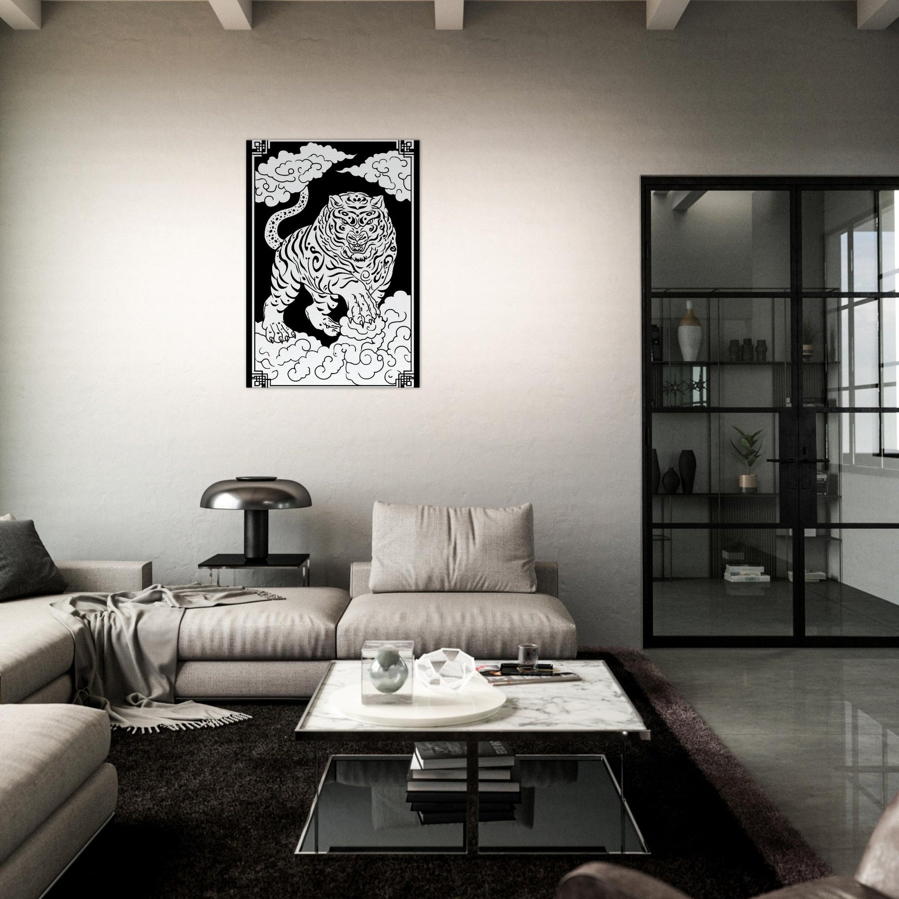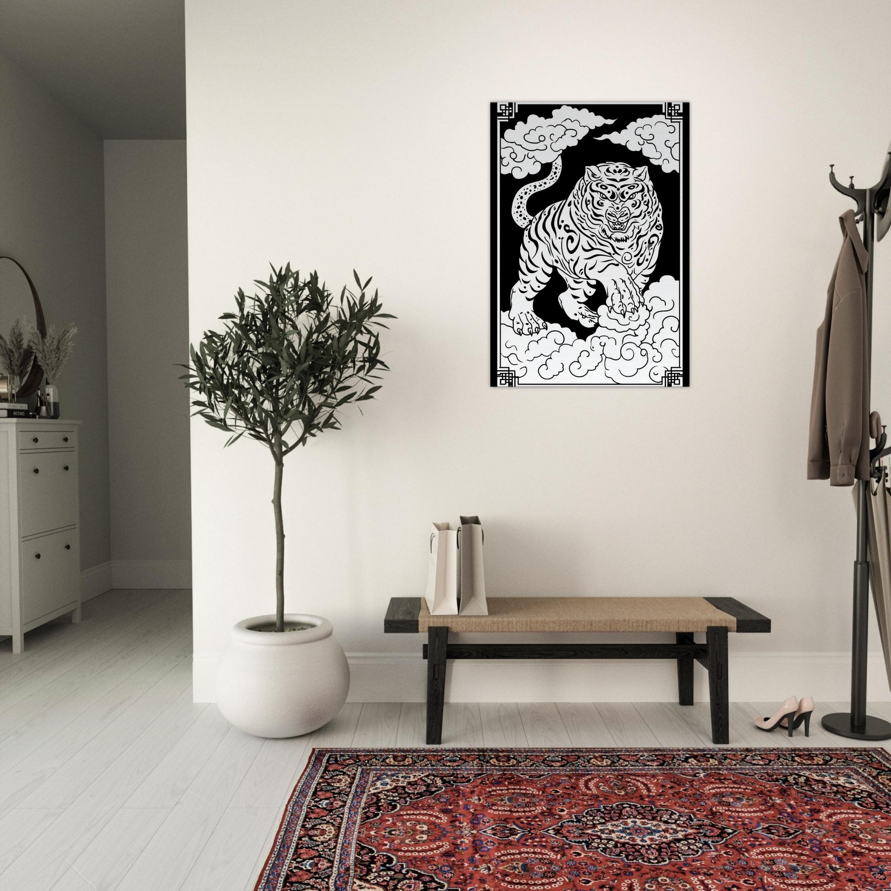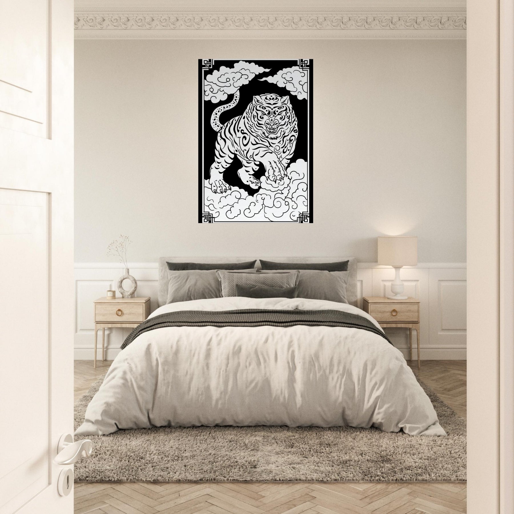 Bold, flowing line art renders the White Tiger of the West, Celestial Guardian of Chinese Mythology, as a poised sentinel among curling clouds. The monochrome contrast ink against white breathes ancient weather into a modern room, inviting contemplation and quiet power. Its spectral energy elevates a living space, adding drama without clutter, guiding the eye, and uplifting walls with timeless mythic presence.