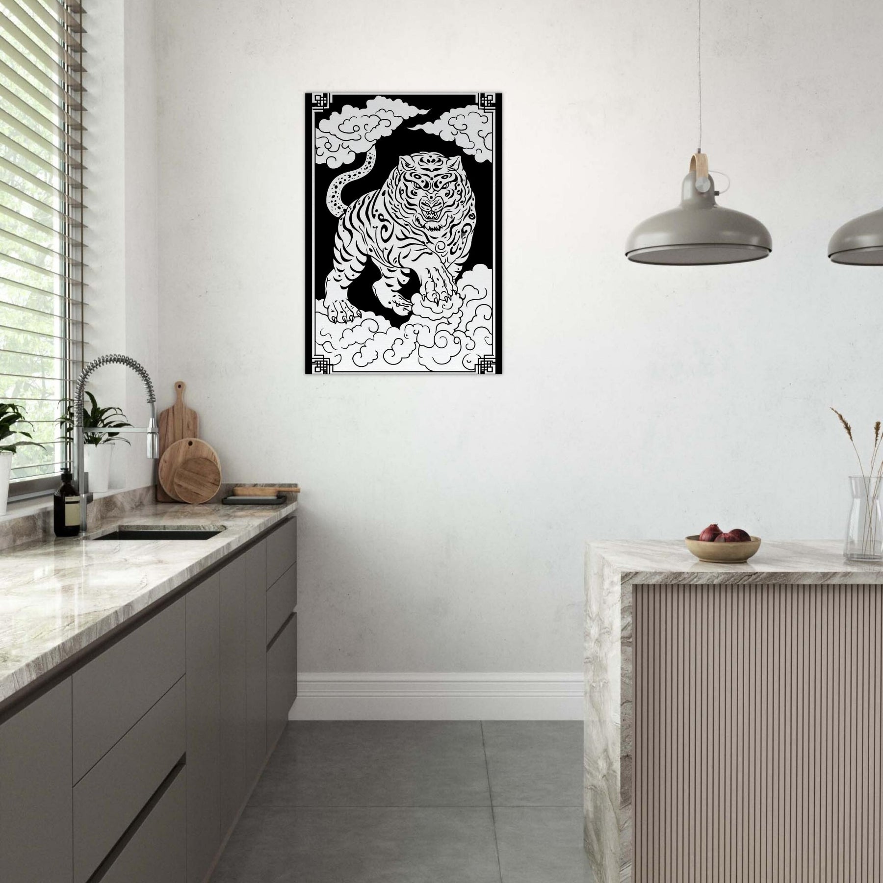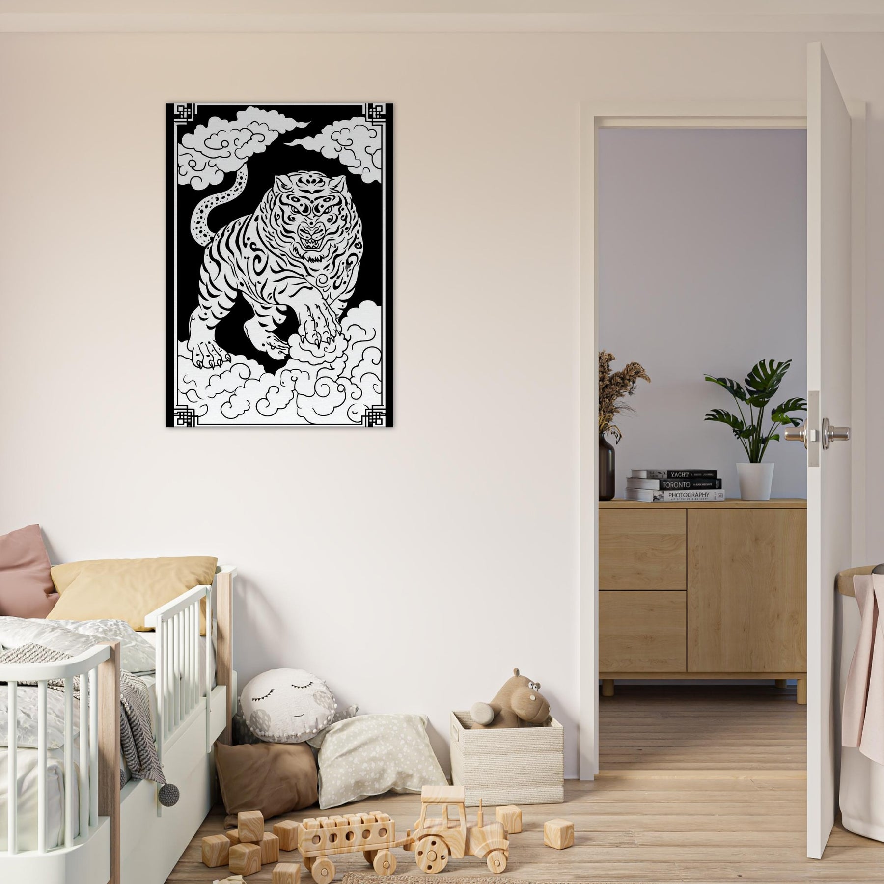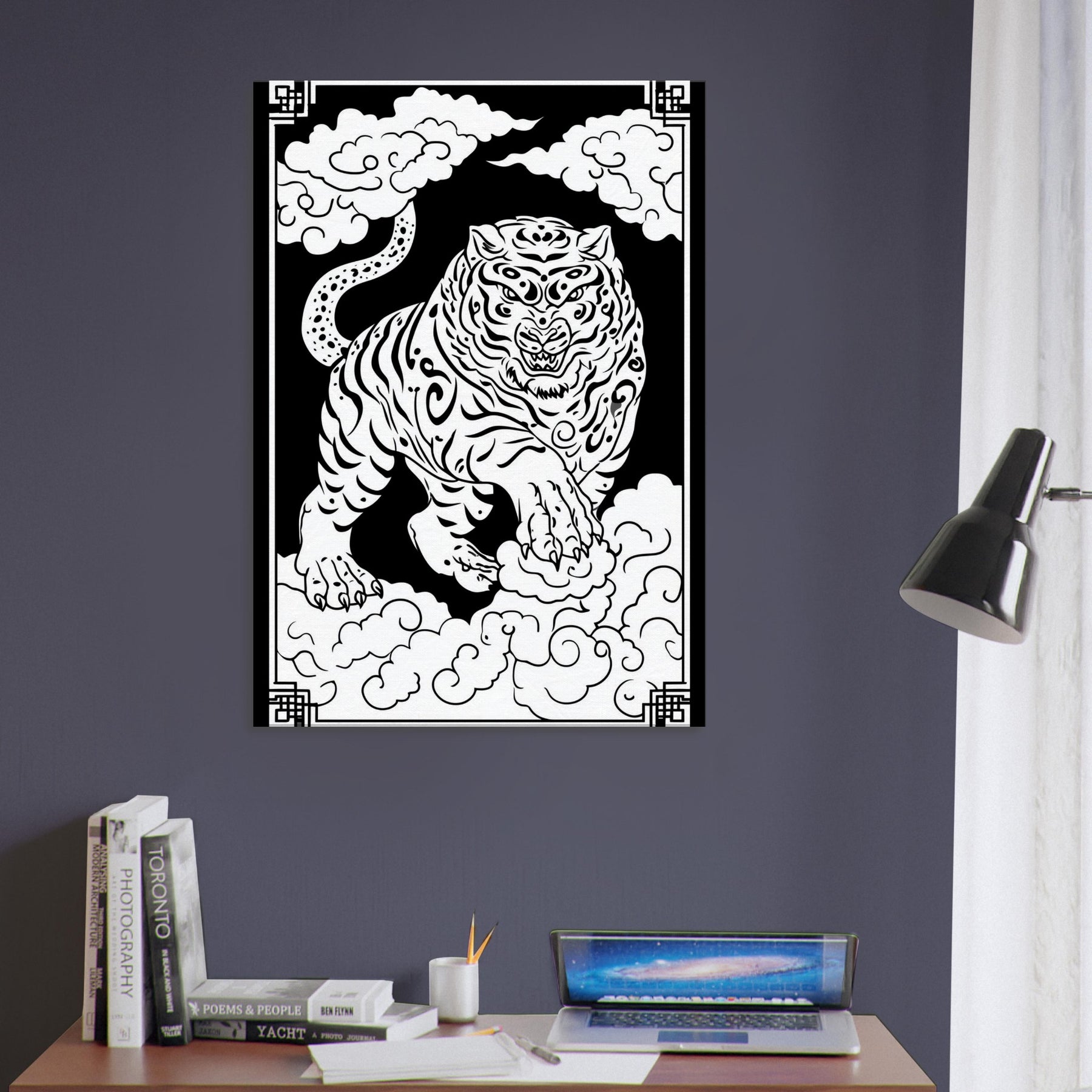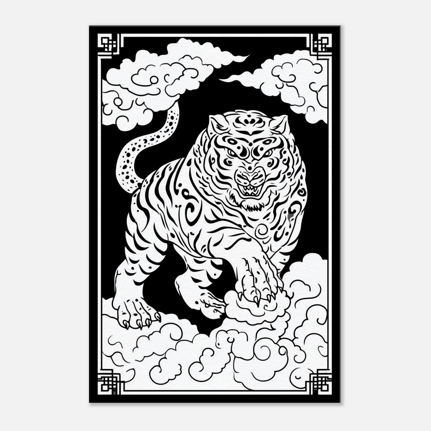 Bold, flowing line art renders the White Tiger of the West, Celestial Guardian of Chinese Mythology, as a poised sentinel among curling clouds. The monochrome contrast ink against white breathes ancient weather into a modern room, inviting contemplation and quiet power. Its spectral energy elevates a living space, adding drama without clutter, guiding the eye, and uplifting walls with timeless mythic presence.