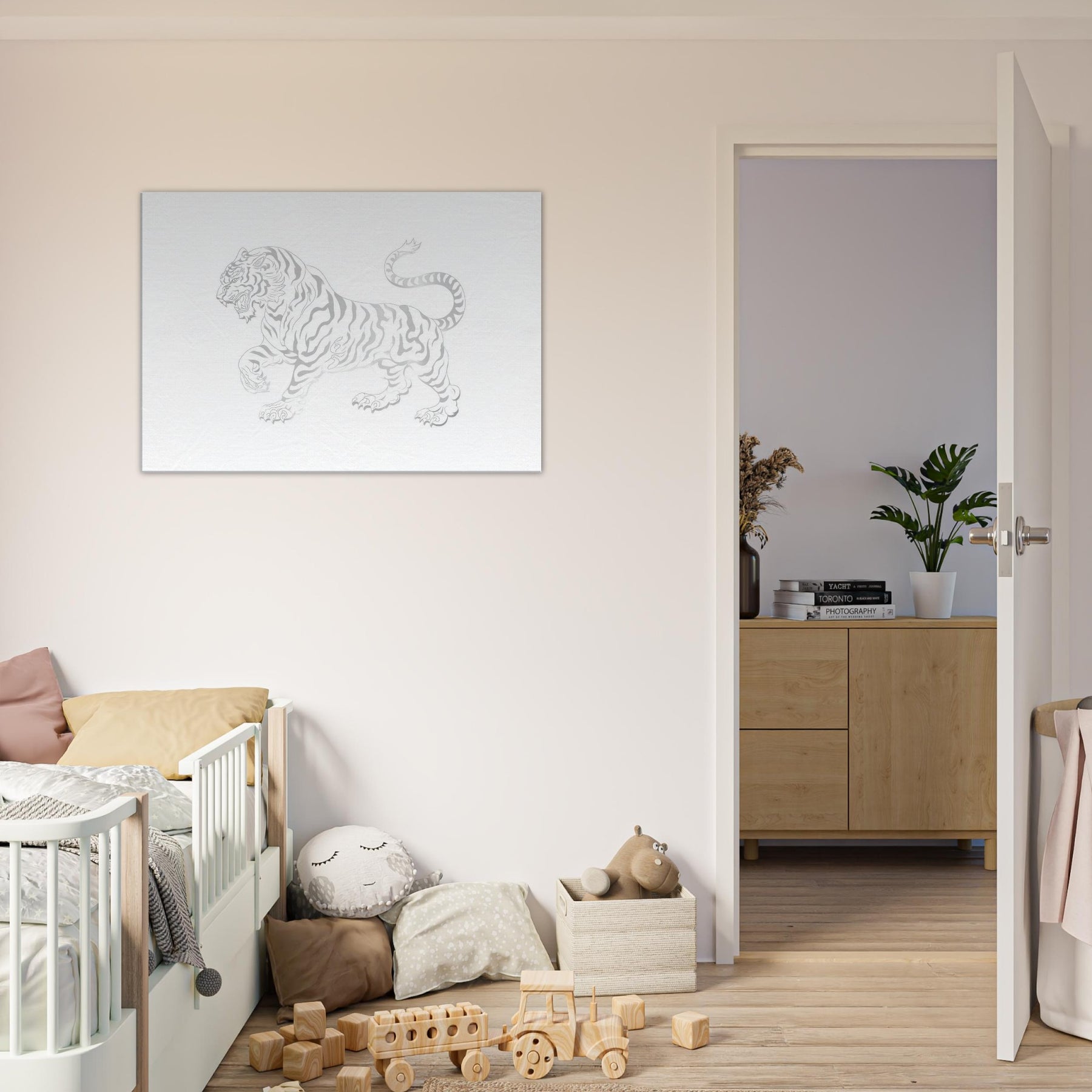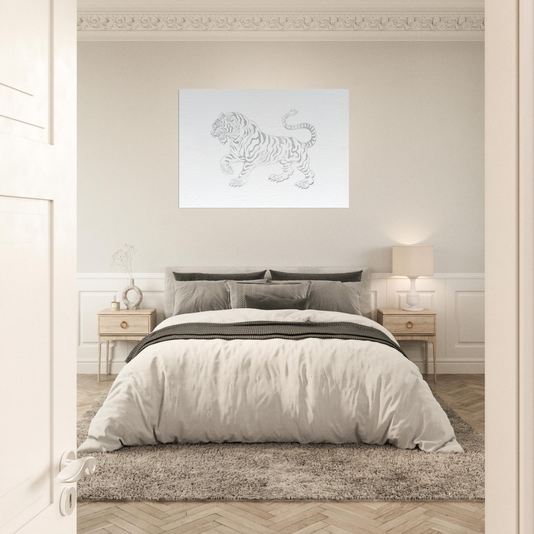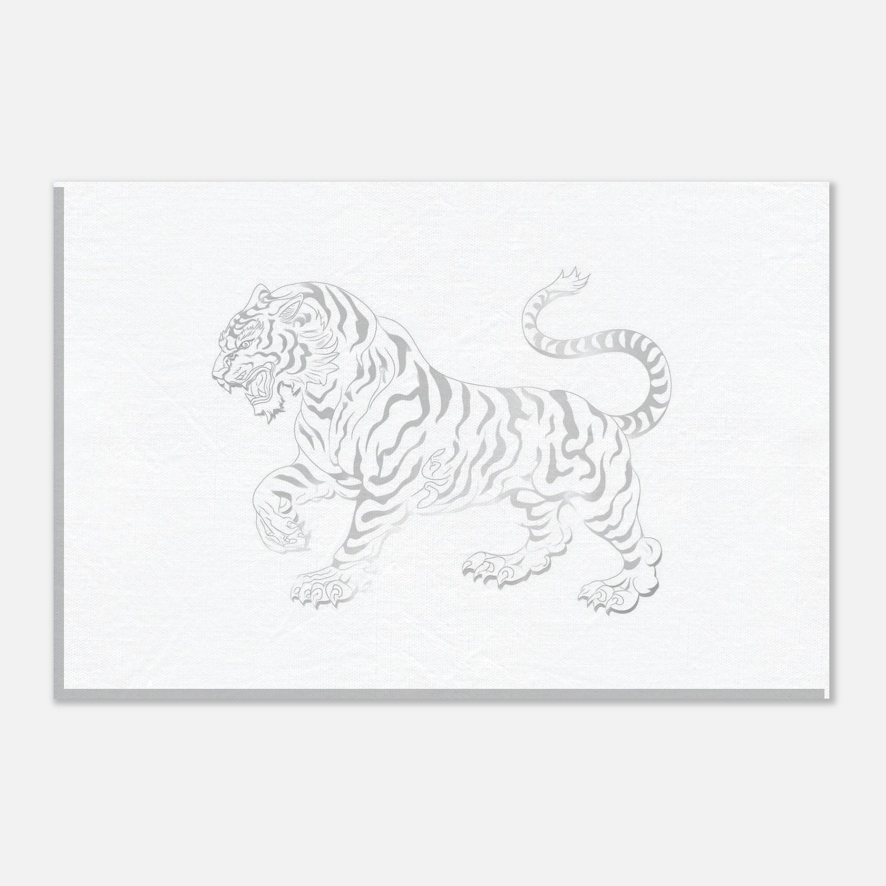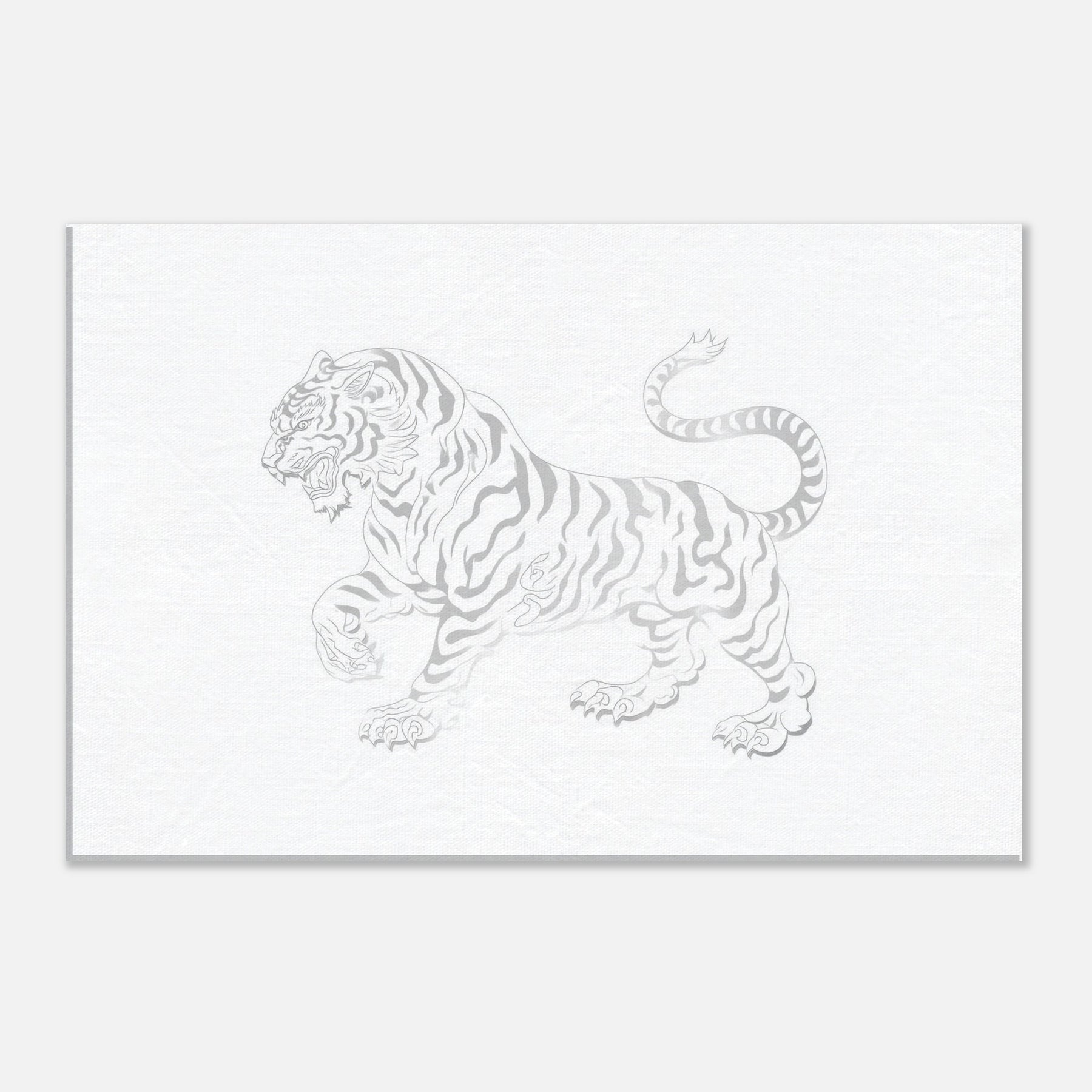 The White Tiger of the West, Celestial Guardian of Chinese Mythology steps across your wall in a whisper of line and light. Rendered in elegant, continuous contour, its powerful form and striped grace exude ancient dignity, while the clean grayscale lends modern calm. Perfect for a living room, study, or entry, this artwork invites quiet focus and instant atmosphere, a mythical guardian that sharpens the room's mood without shouting, balancing drama with serene balance.