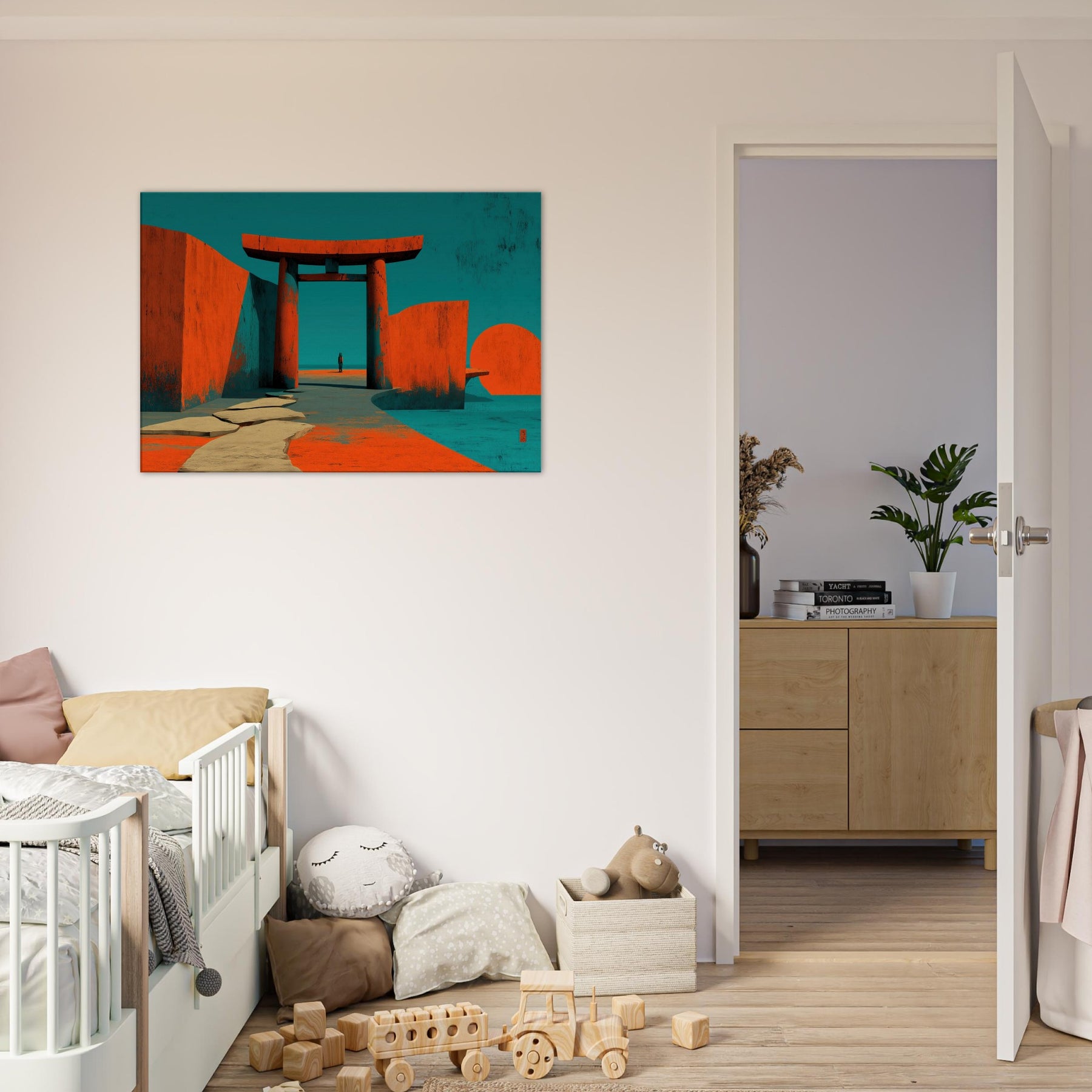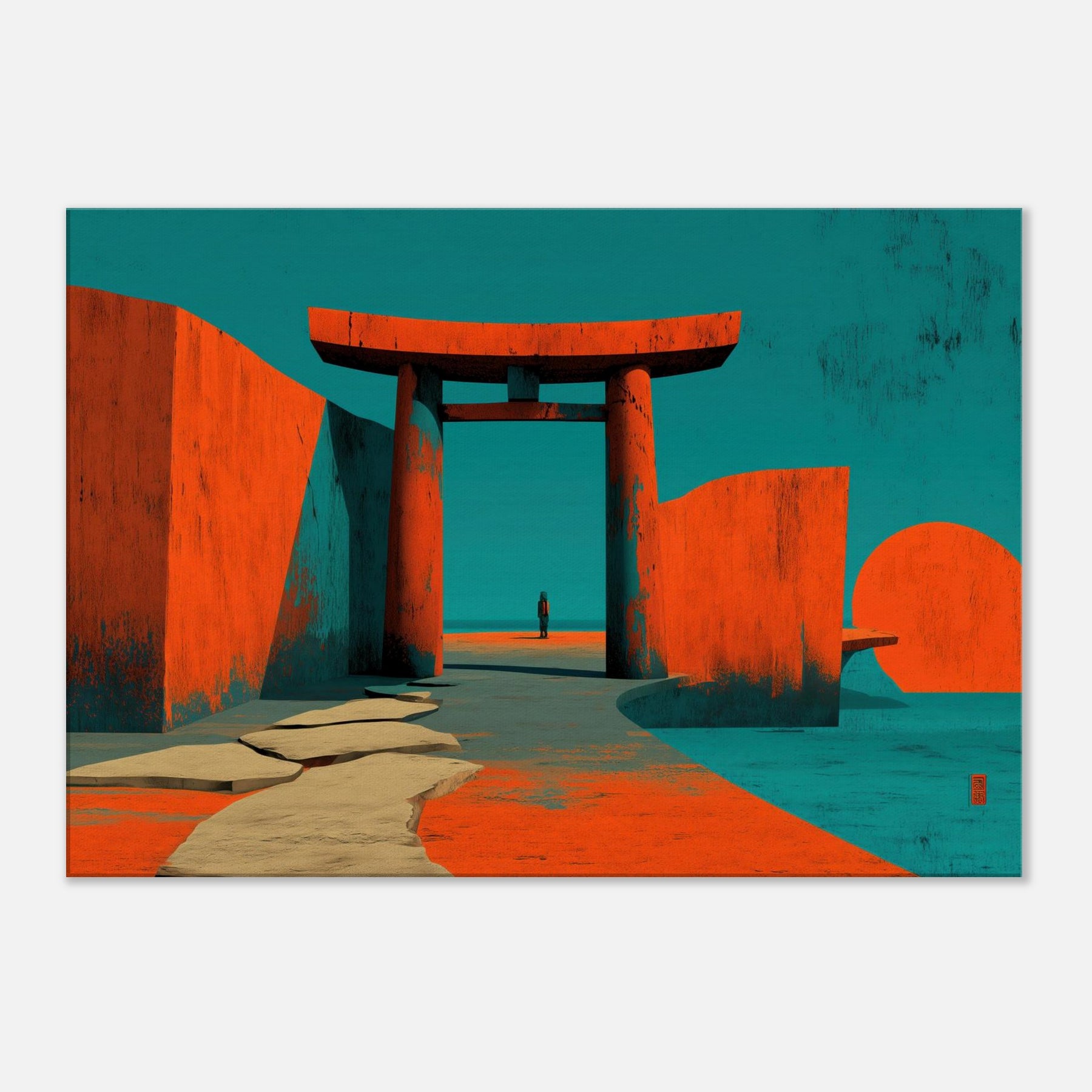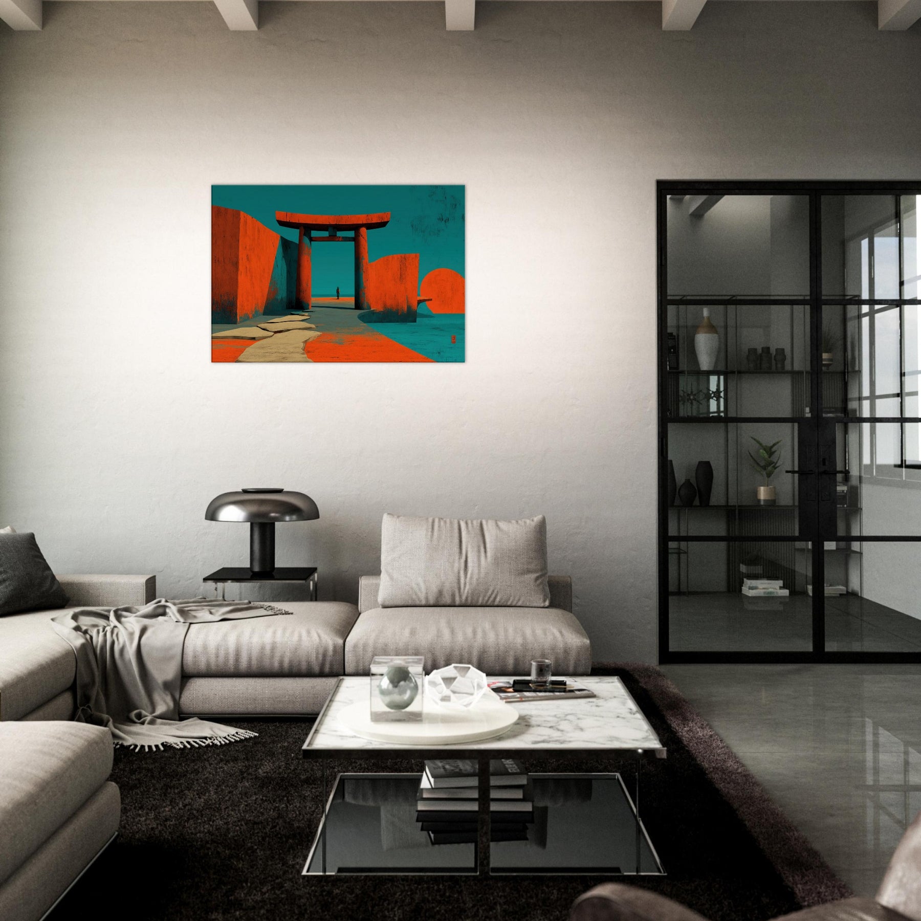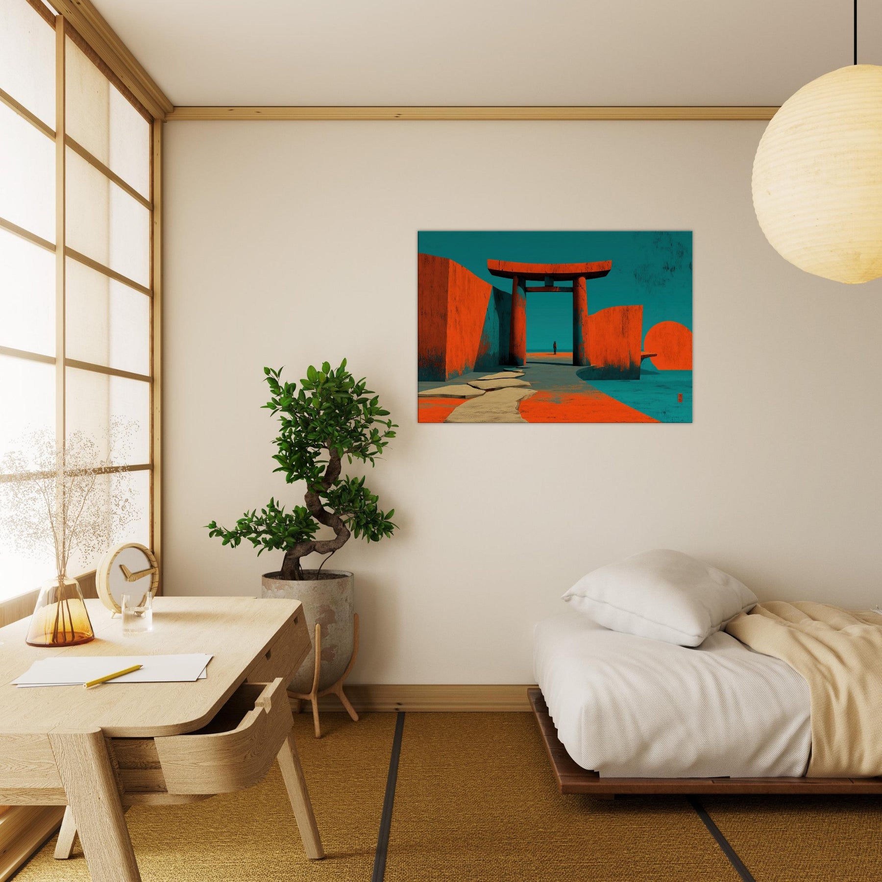 Step through the Torii Gate into a dreamlike cityscape where warm orange walls meet a sea of teal. This abstract composition fuses architecture with horizon, inviting calm and curiosity into any living space. The tactile textures evoke sun warmed stone and salt air, while the bold contrast awakens walls with everyday poetry. A serene focal point that enhances rooms with depth, balance, and a whisper of distant shores.
