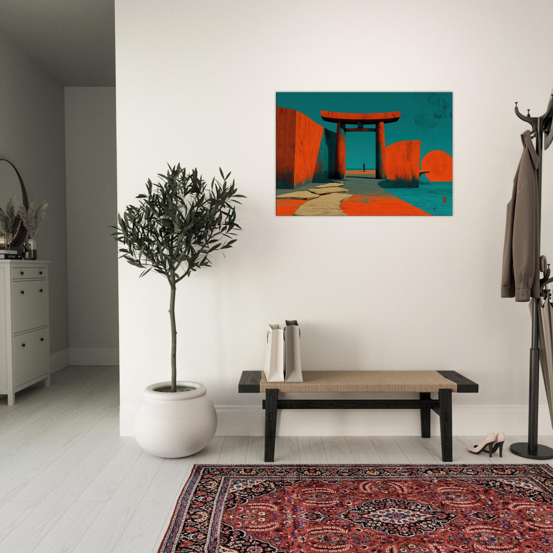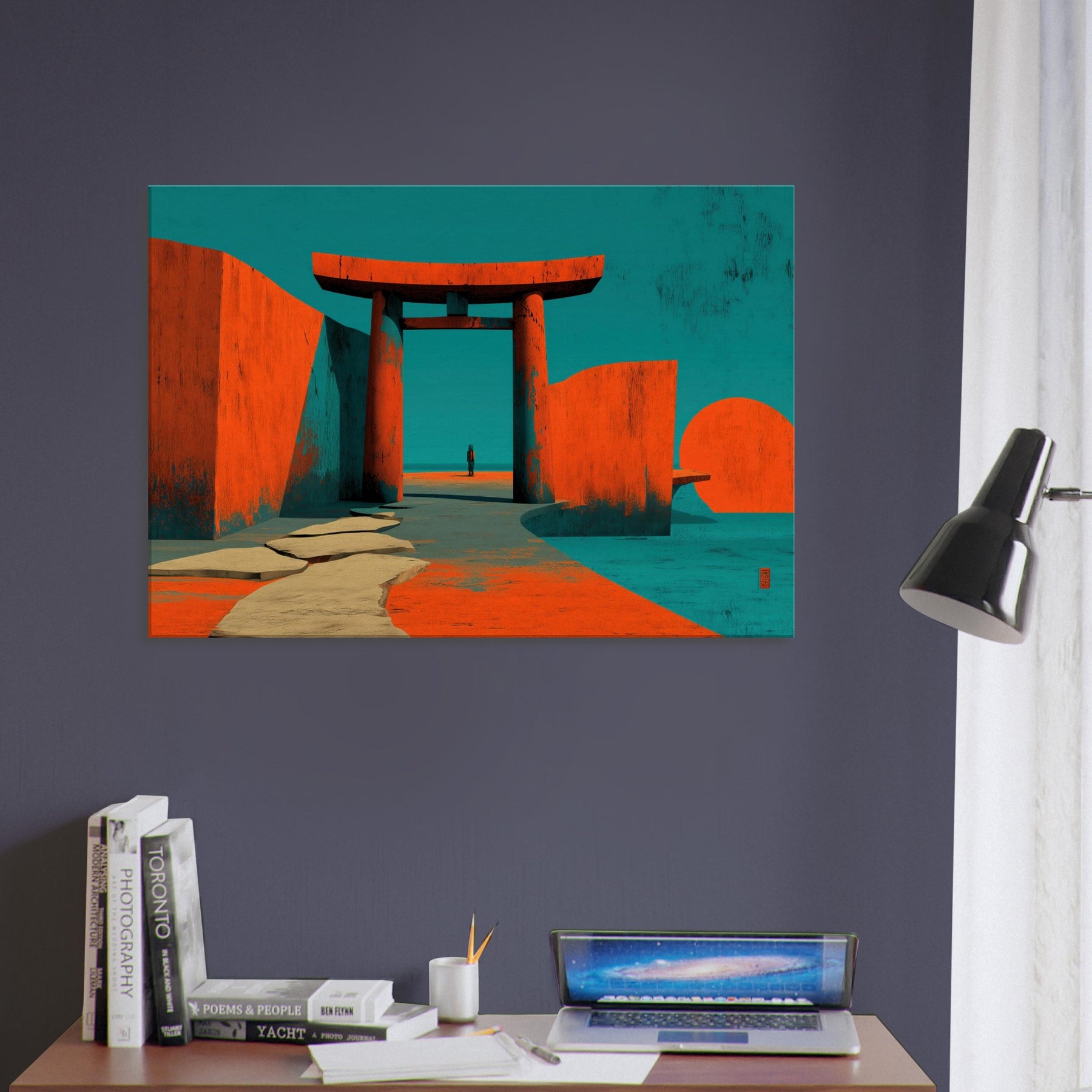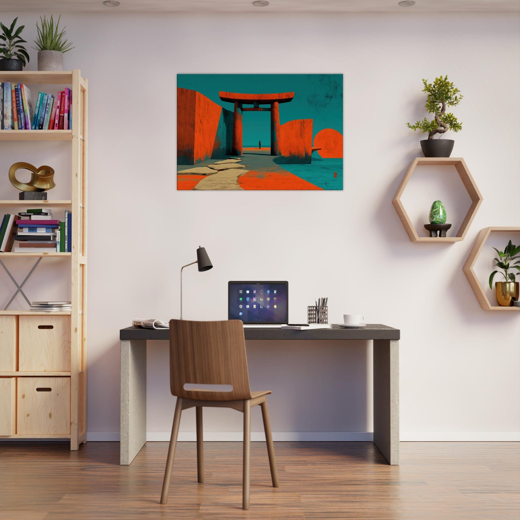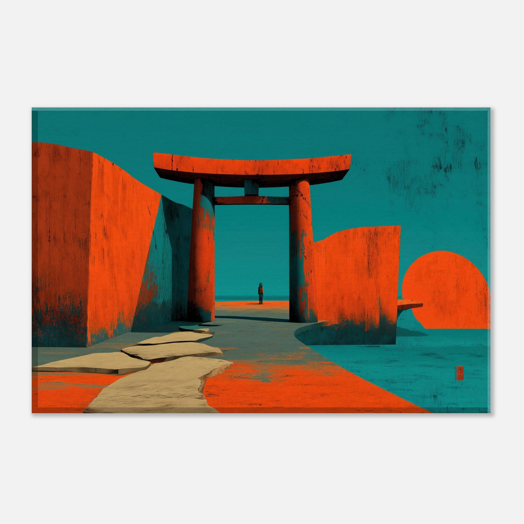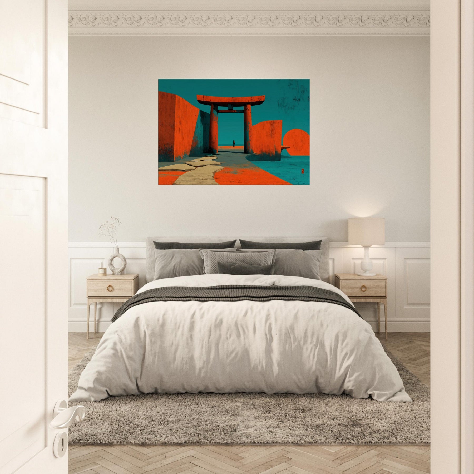Step through the Torii Gate into a dreamlike cityscape where warm orange walls meet a sea of teal. This abstract composition fuses architecture with horizon, inviting calm and curiosity into any living space. The tactile textures evoke sun warmed stone and salt air, while the bold contrast awakens walls with everyday poetry. A serene focal point that enhances rooms with depth, balance, and a whisper of distant shores.