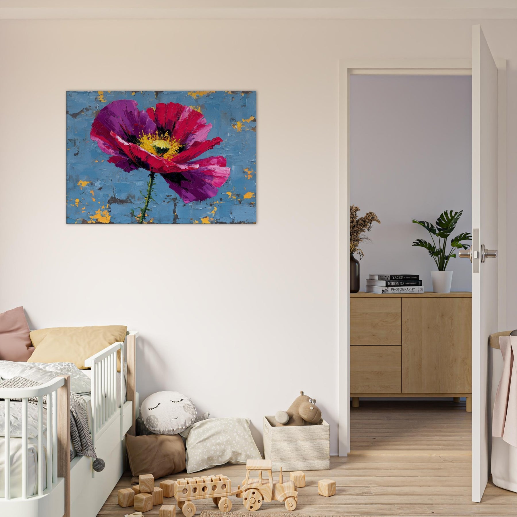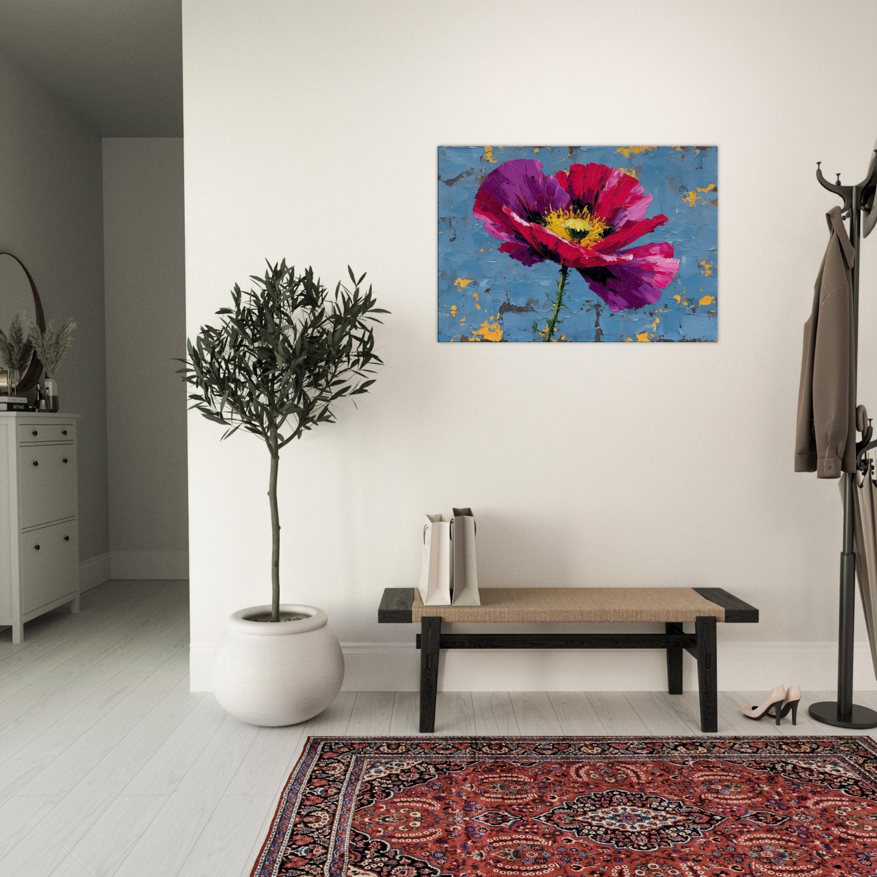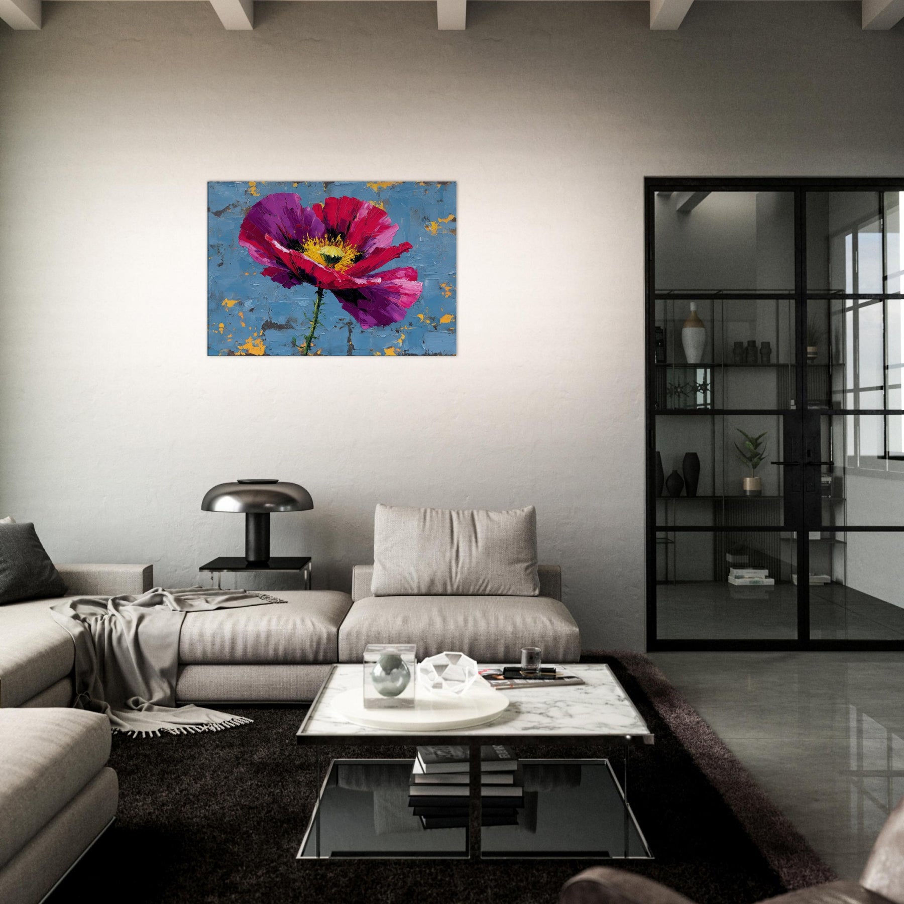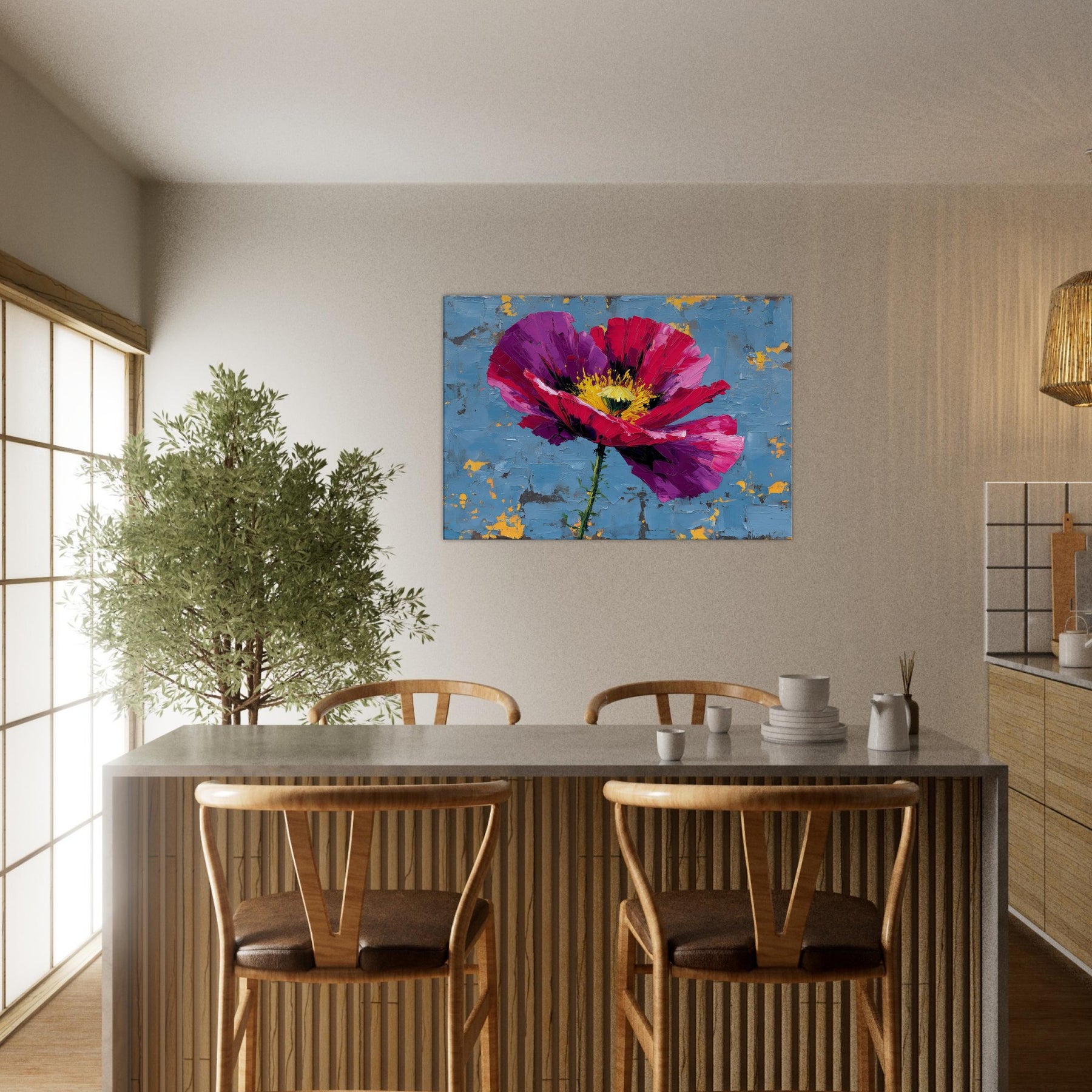 Let this Poppy rise from a field of texture and color, a radiant bloom that infuses the room with sunlit energy. The abstract strokes ripple like petals catching wind, revealing a bold center of yellow and green that hums with life. In living spaces, its generous scale and luminous contrasts invite touch and conversation, turning walls into a quiet celebration of nature. A statement piece that warms, soothes, and elevates daily moments.