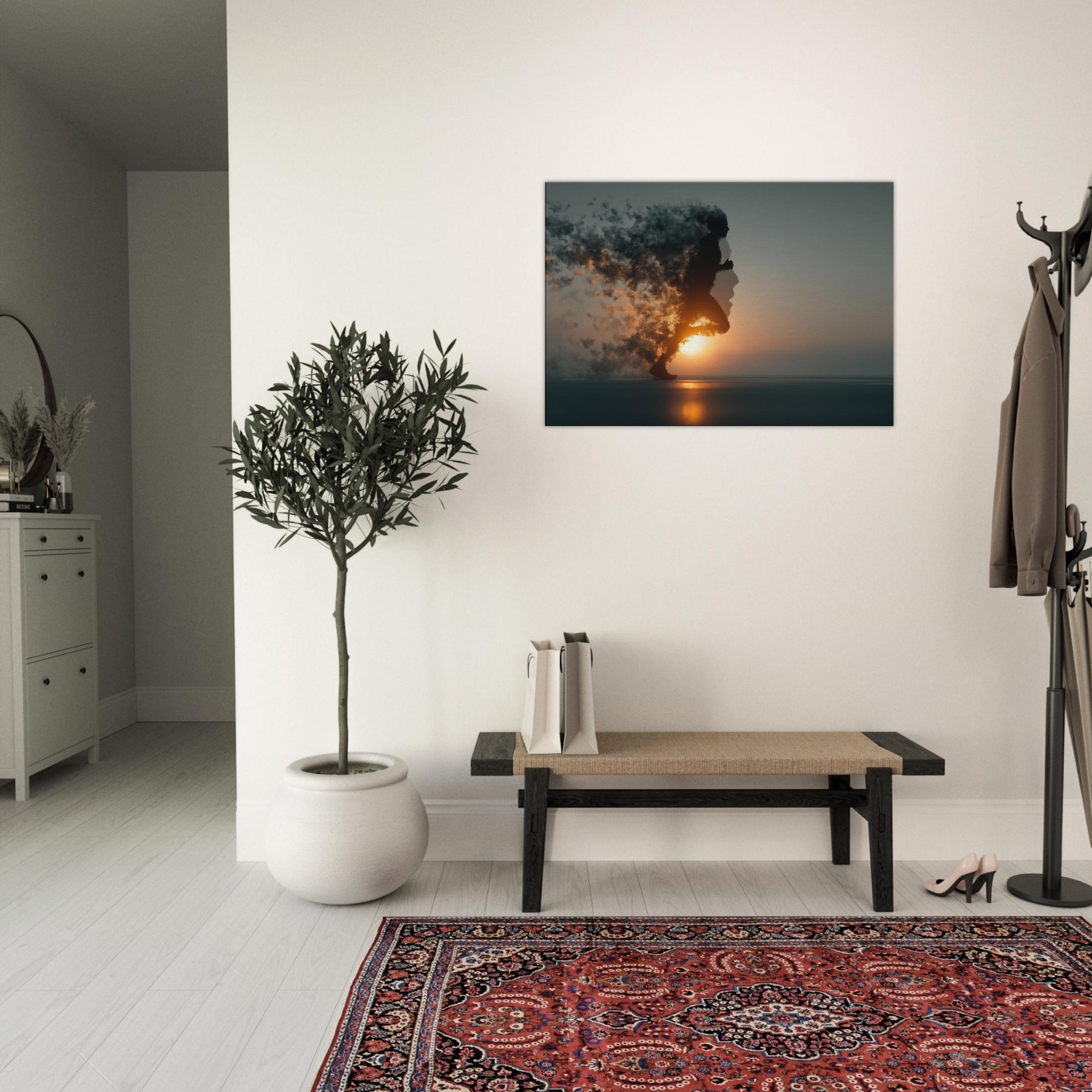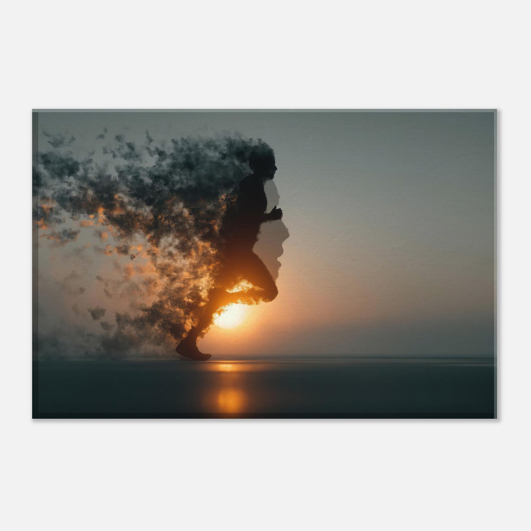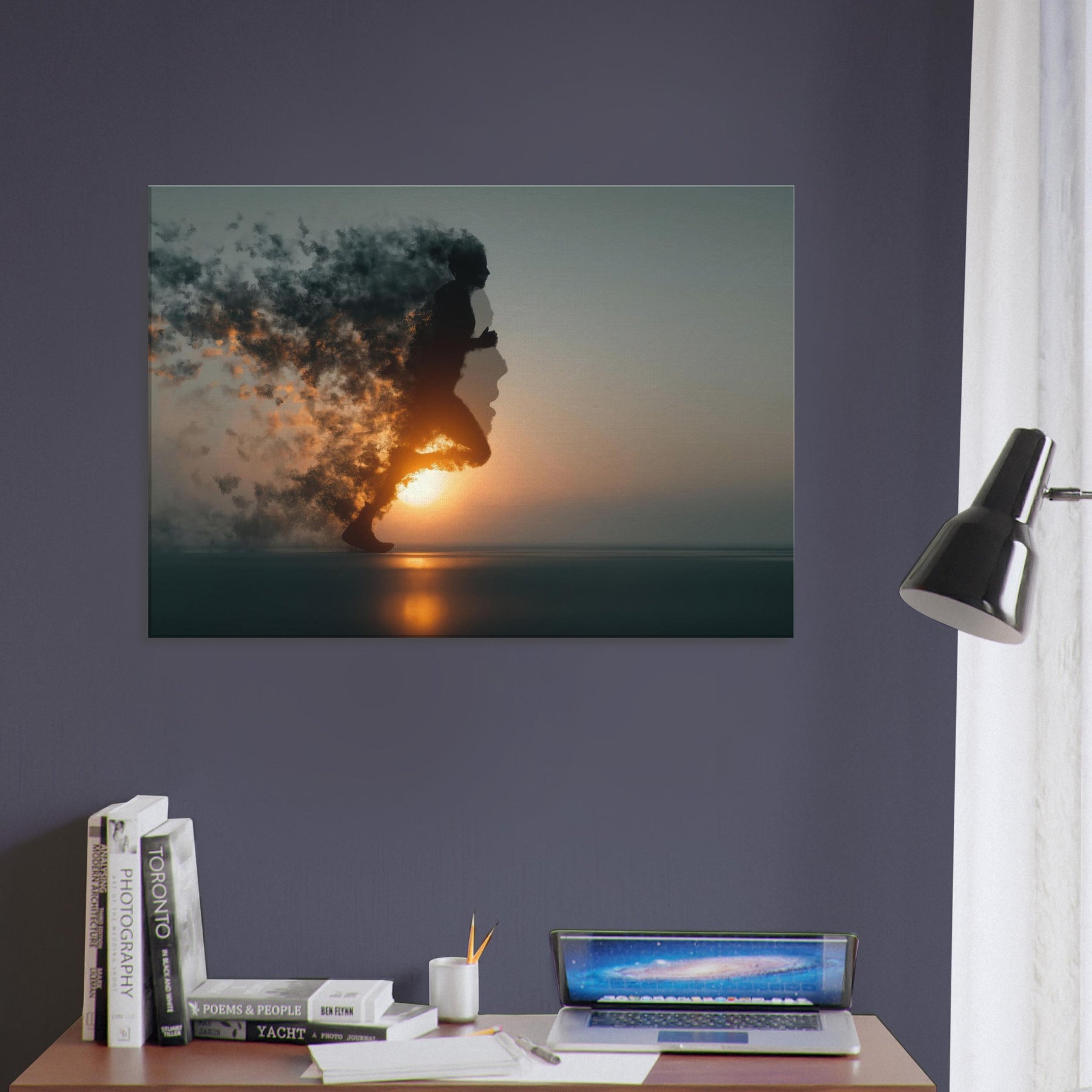 A luminous meditation on velocity and presence, this piece suspends gravity as the Runner in Motion dissolves into smoke and light. The surreal fusion of chasing shadows and a sleeping figure creates a living room air of dawn and memory; it glows with sunset hues and a soft, metallic hush. Hang it where morning light licks the edge of the frame; the artwork invites breath, rhythm, and conversation, turning walls into a quiet stage for ambition and tenderness alike.