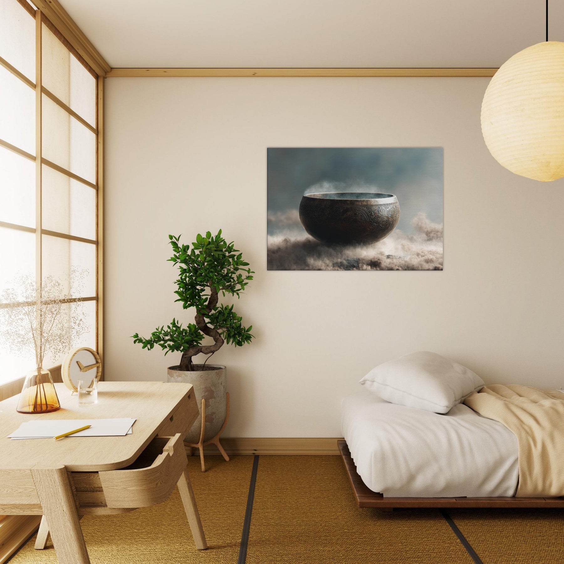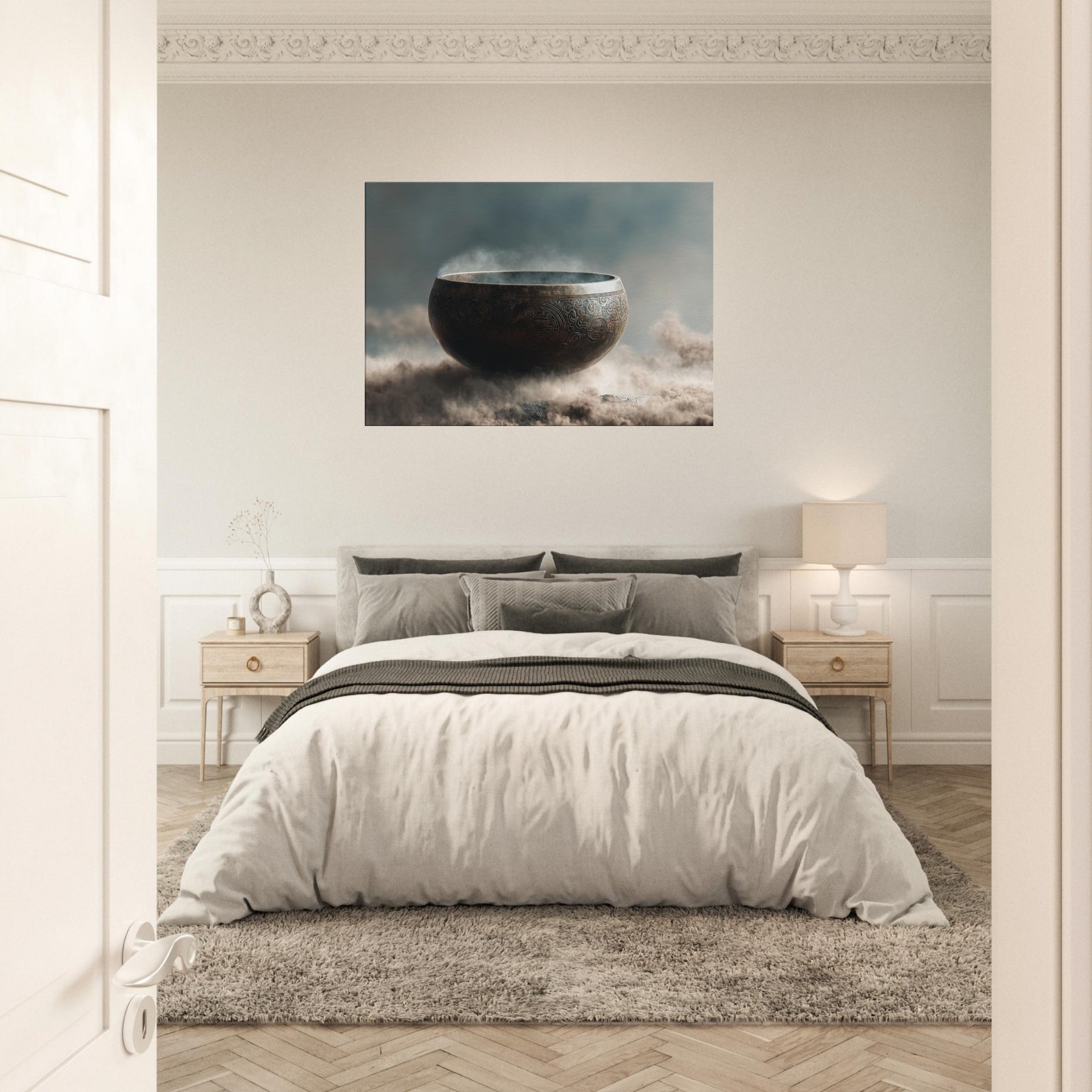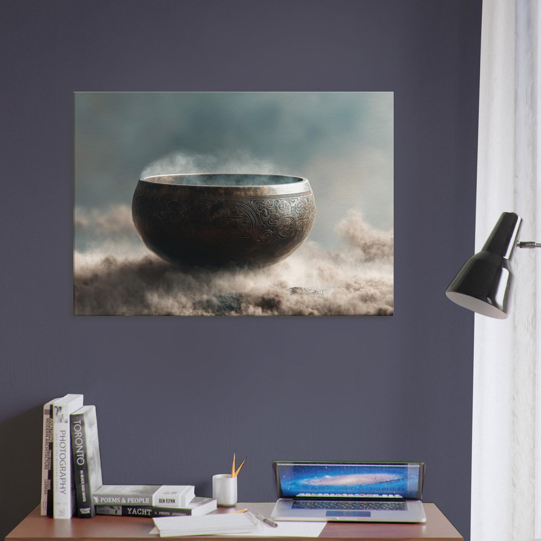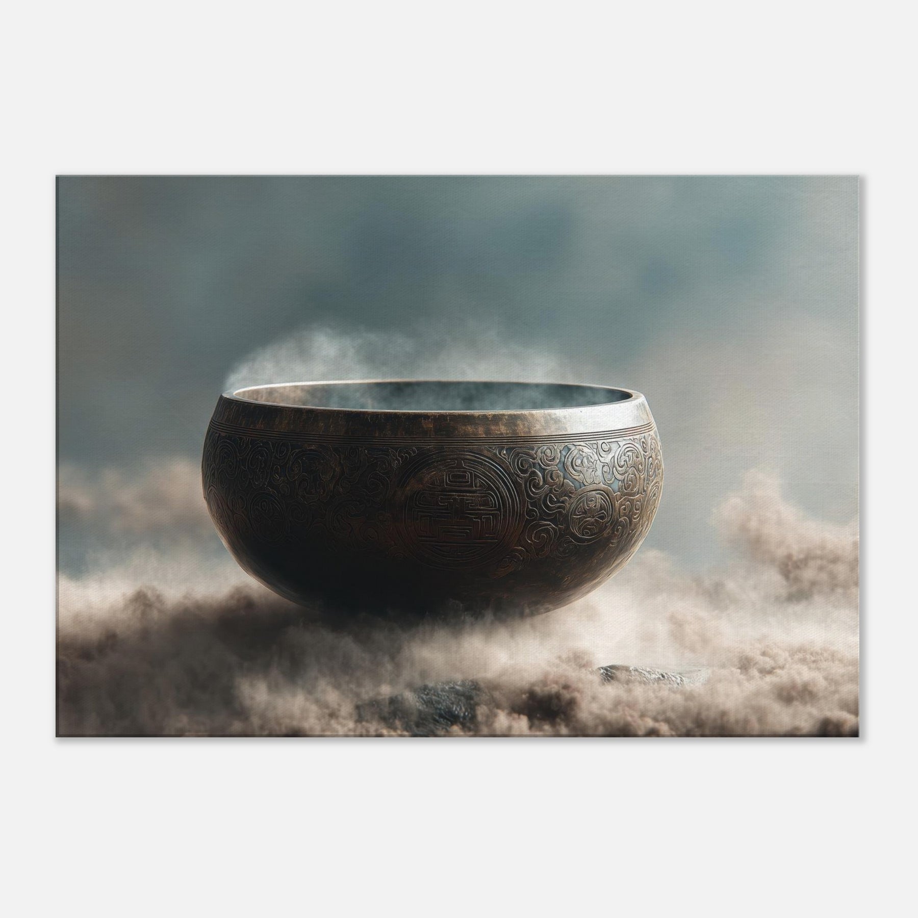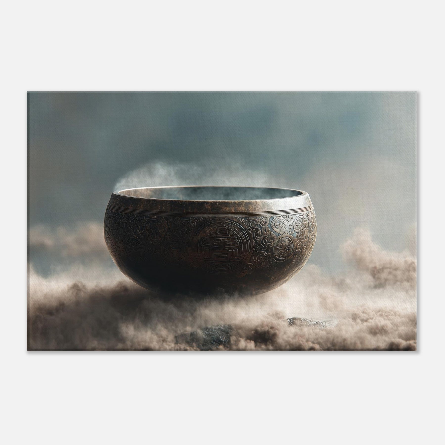 Mystical melodies rise from the Singing Bowl as this surreal composition glows with a copper bronze radiance, floating above a misty . The bowl’s etched patterns spiral like ancient mandalas, inviting quiet reverie and slow breathing. In your living space, it becomes a whispered focal point a gateway between dream and room, softness and edge. Tempered light glints along its rim, while vapor swirls around its curve, making the air feel thicker with intention. A contemplative piece that transforms any wall into a sanctuary.