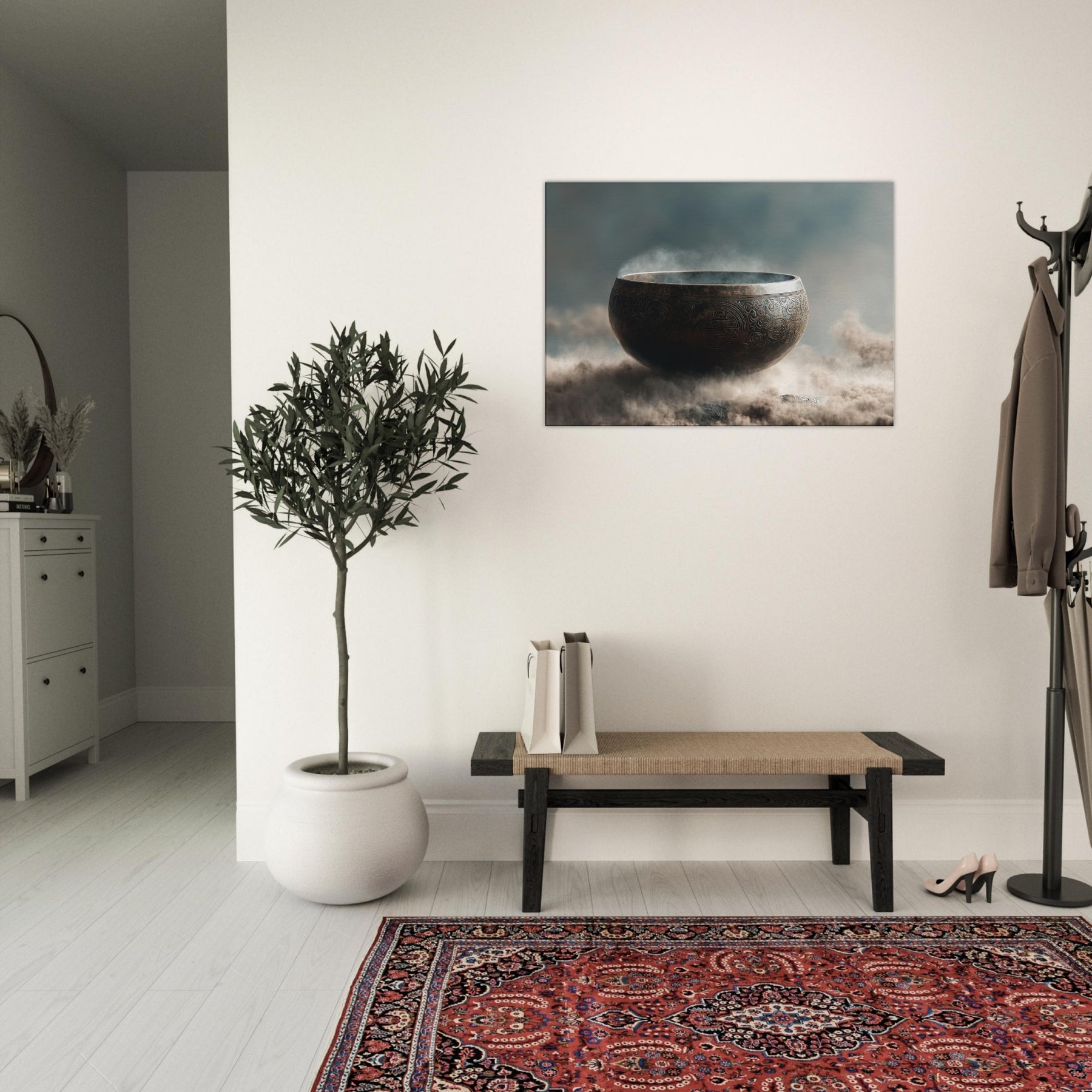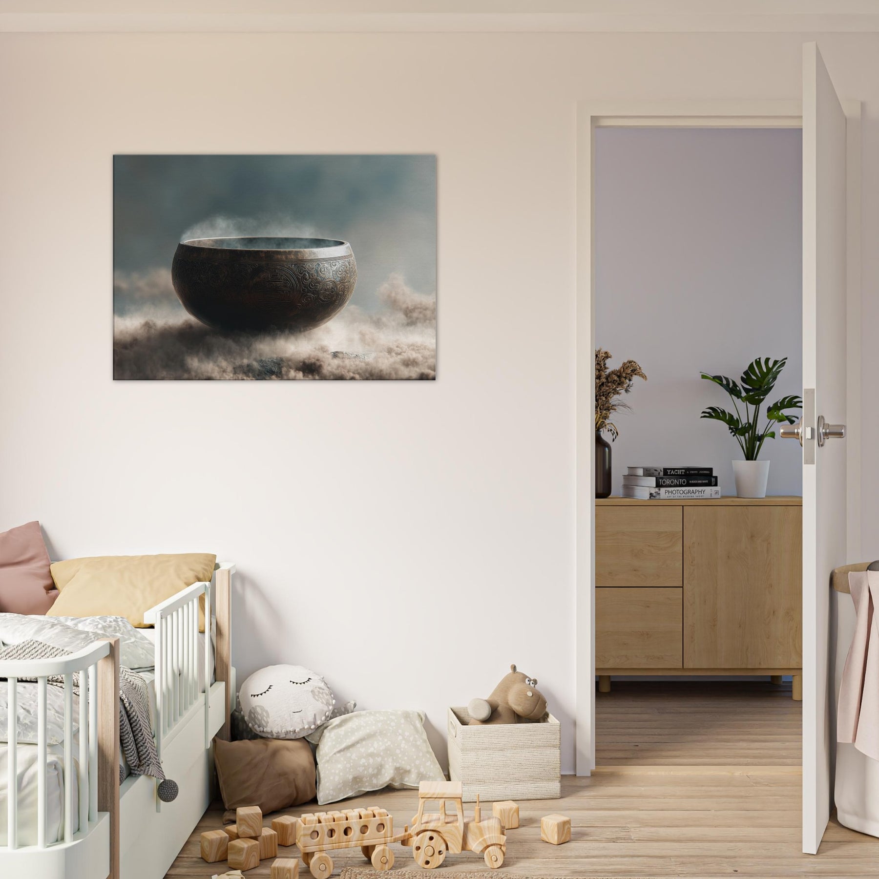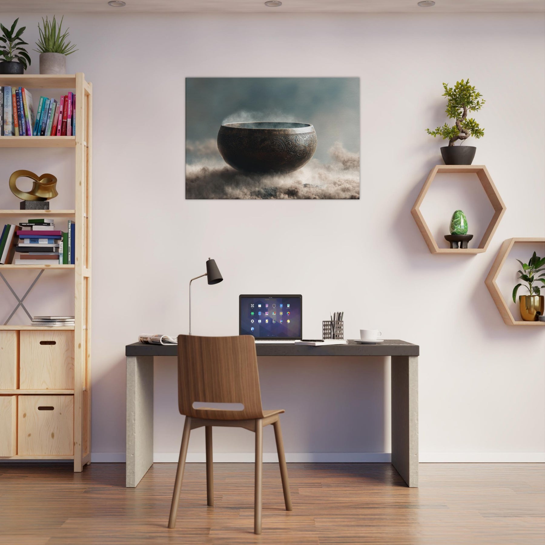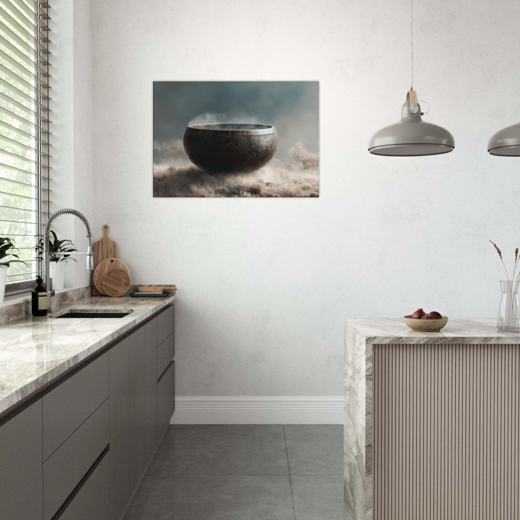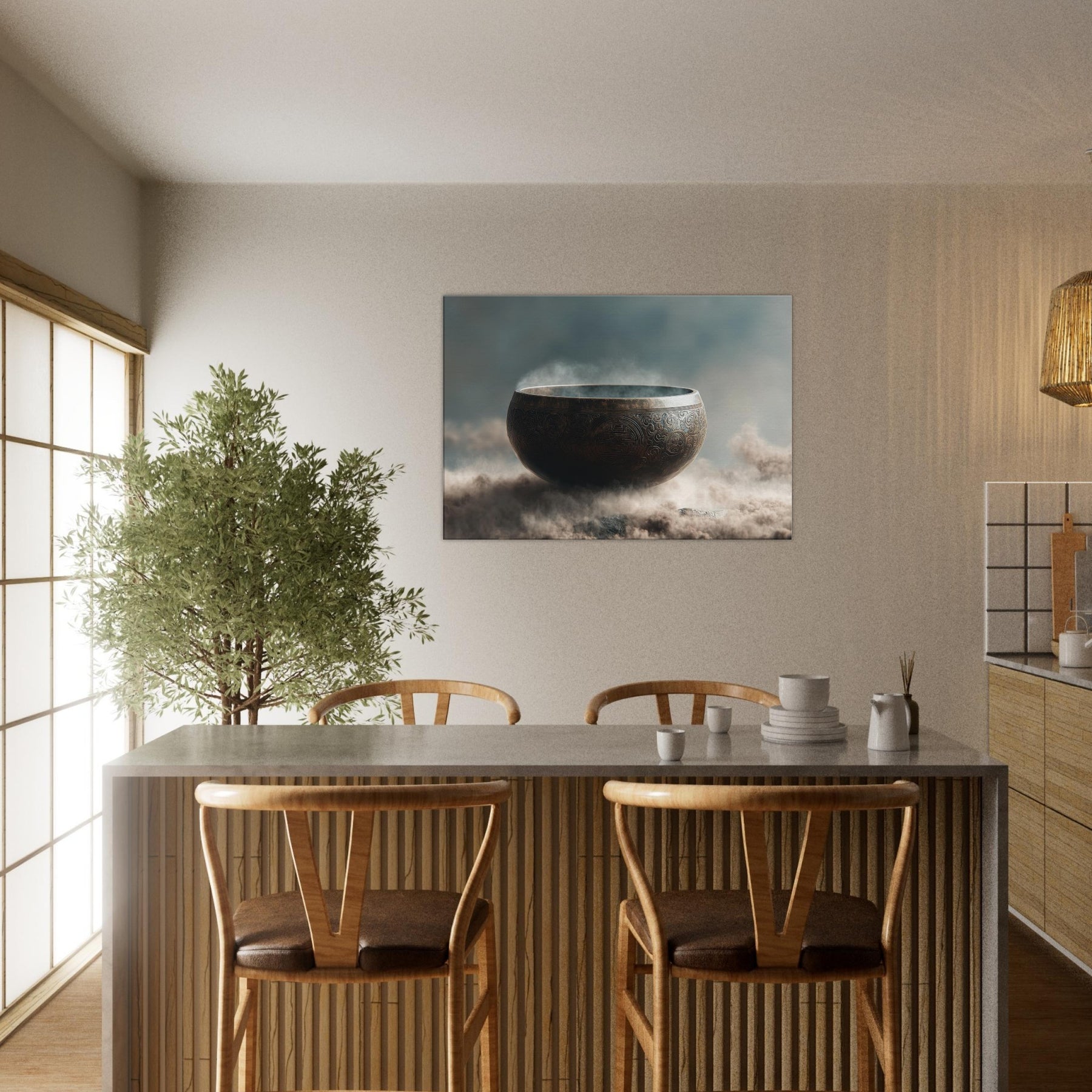 Mystical melodies rise from the Singing Bowl as this surreal composition glows with a copper bronze radiance, floating above a misty . The bowl’s etched patterns spiral like ancient mandalas, inviting quiet reverie and slow breathing. In your living space, it becomes a whispered focal point a gateway between dream and room, softness and edge. Tempered light glints along its rim, while vapor swirls around its curve, making the air feel thicker with intention. A contemplative piece that transforms any wall into a sanctuary.