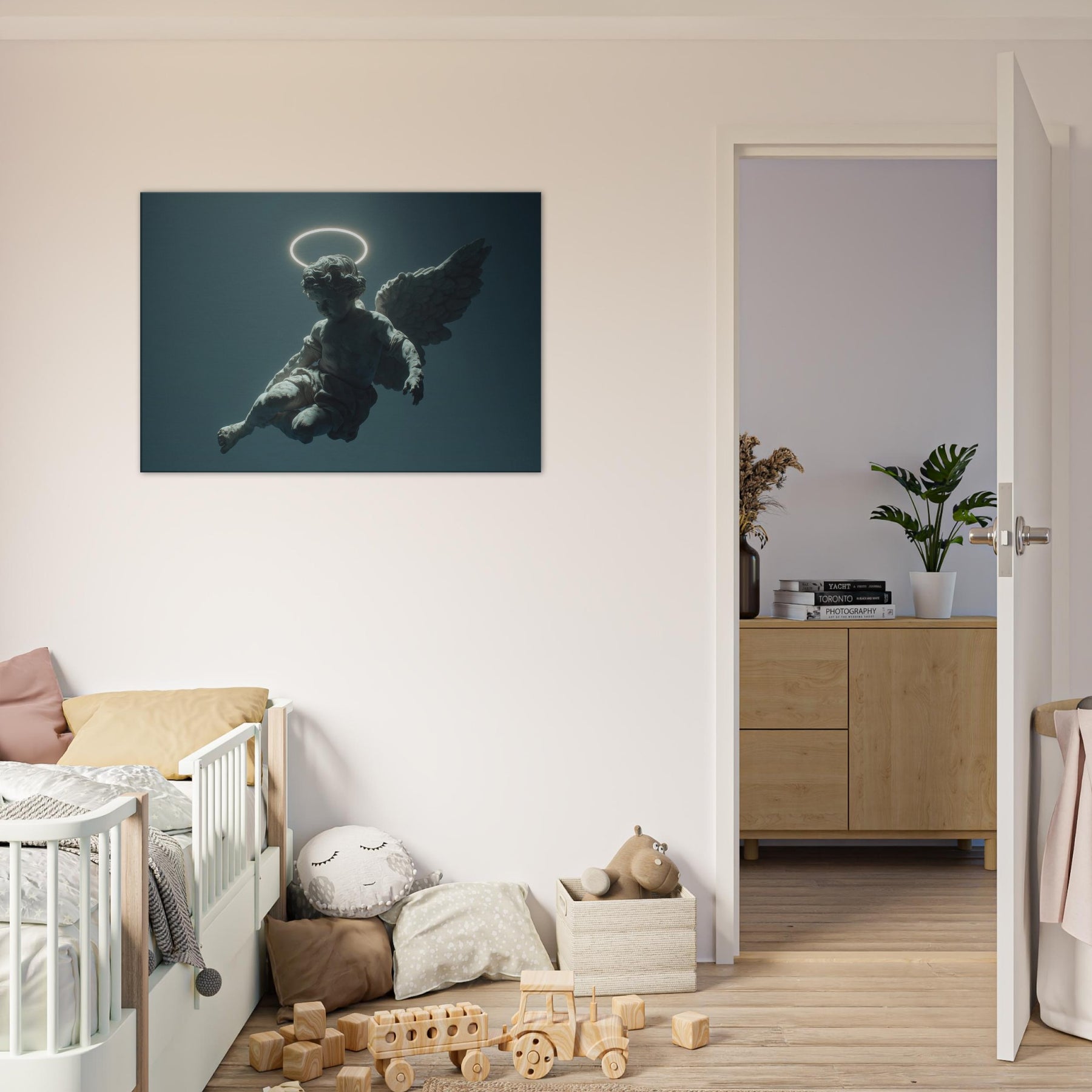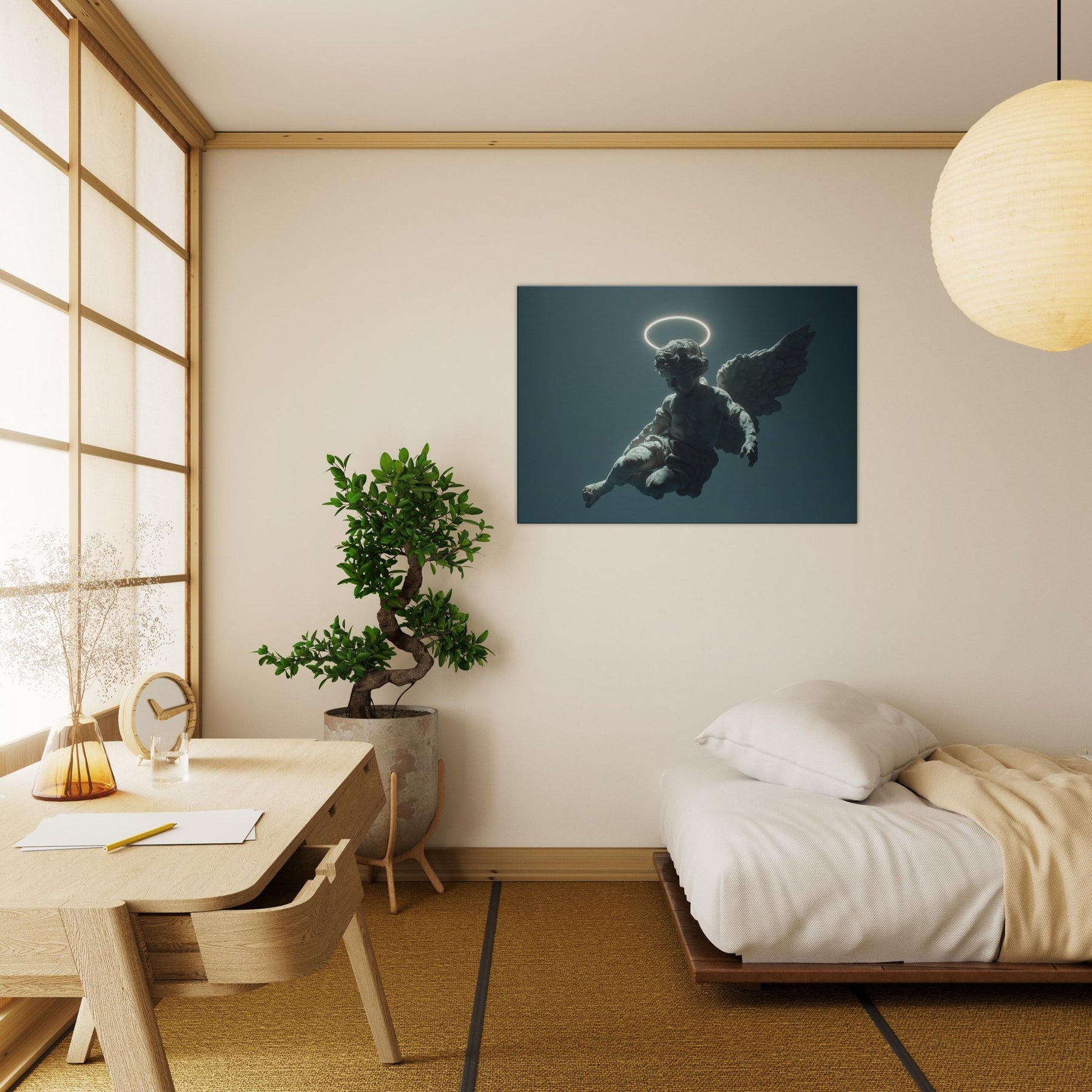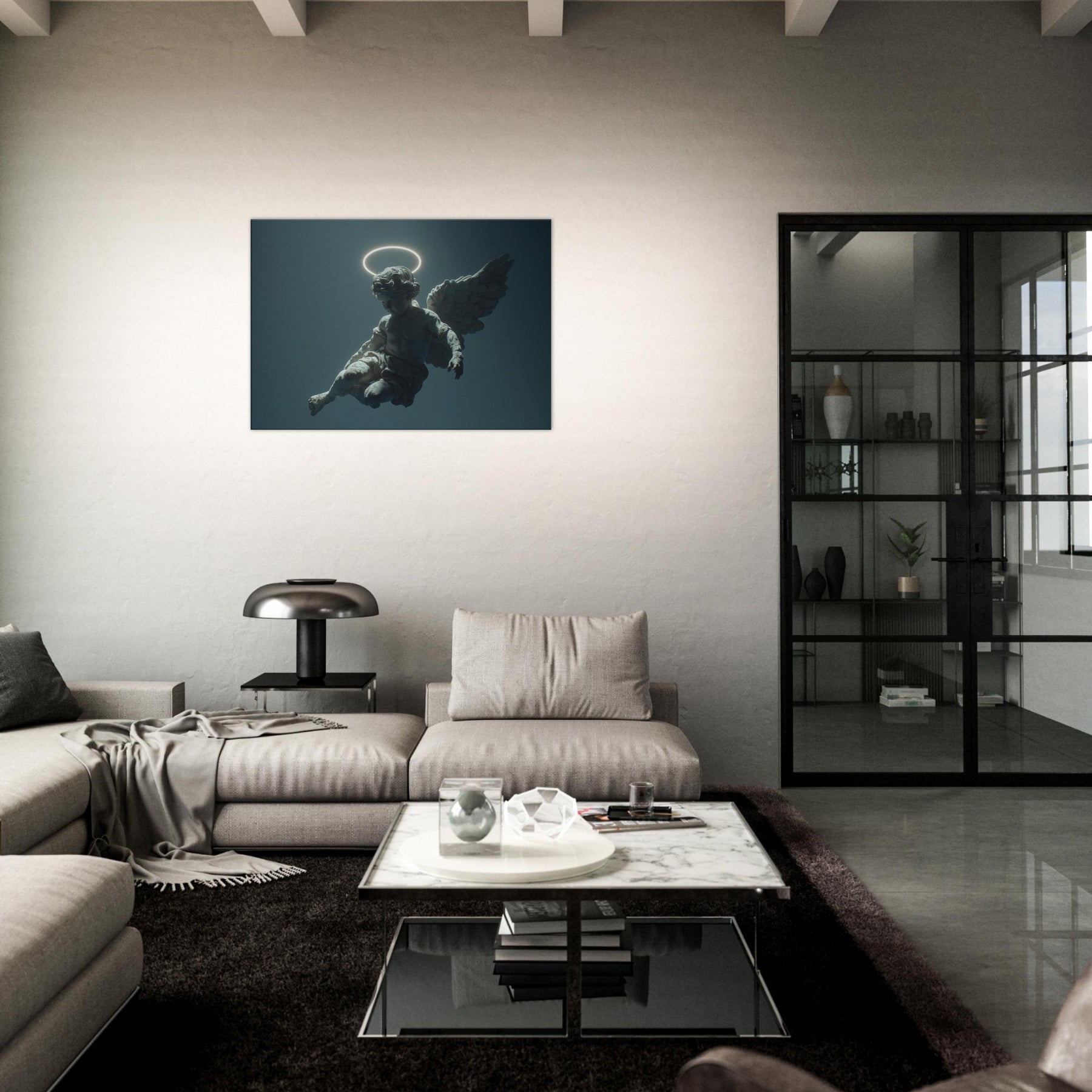 This sculpture inspired print presents a Cherub with wings unfurled, suspended in a dreamlike ascent. A pale halo radiates above, casting a soft glow that deepens the chiaroscuro of the statue’s calm features. The atmosphere blends classical grace with surreal quiet, inviting quiet reflection and wonder. Placed above a sofa or in a study, it softens hard lines while lending a sense of mystic elevation transforming daily space into a sanctuary where memory and aspiration softly converge. The central subject is Cherub (Wings Only).