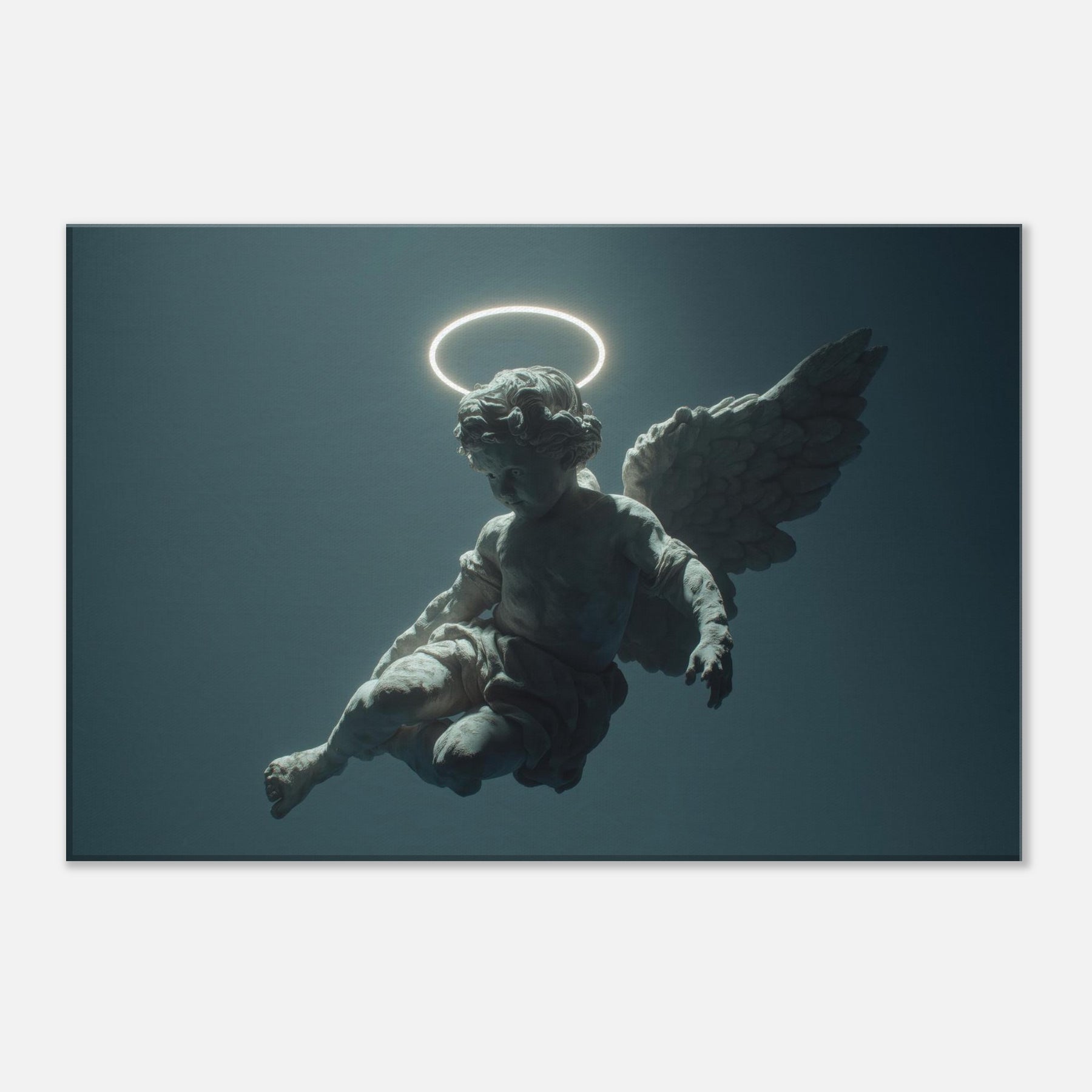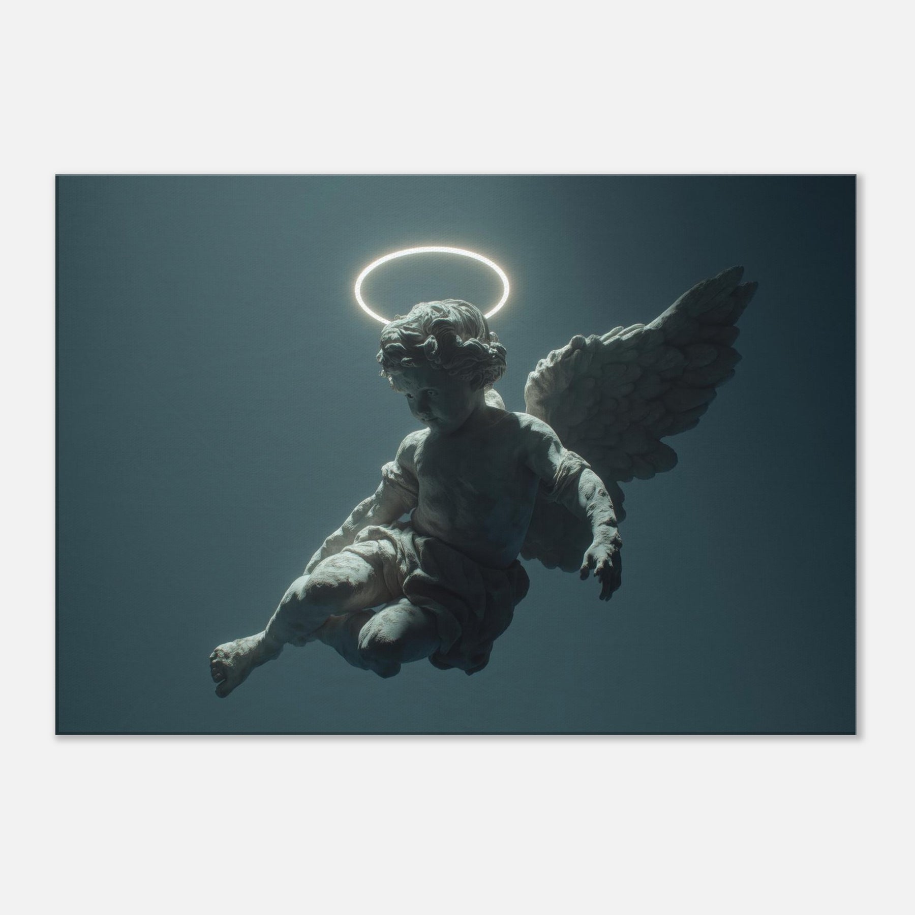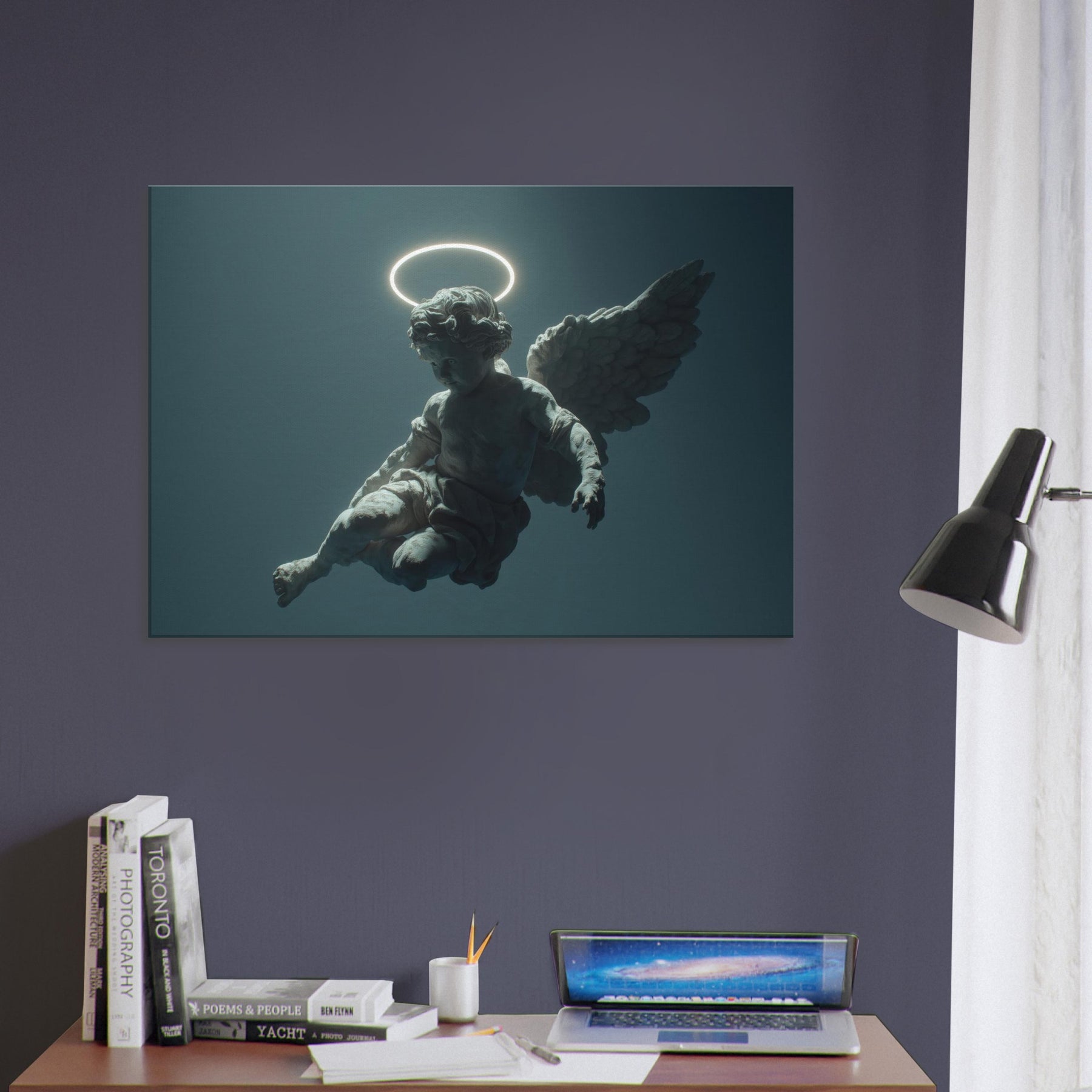 This sculpture inspired print presents a Cherub with wings unfurled, suspended in a dreamlike ascent. A pale halo radiates above, casting a soft glow that deepens the chiaroscuro of the statue’s calm features. The atmosphere blends classical grace with surreal quiet, inviting quiet reflection and wonder. Placed above a sofa or in a study, it softens hard lines while lending a sense of mystic elevation transforming daily space into a sanctuary where memory and aspiration softly converge. The central subject is Cherub (Wings Only).