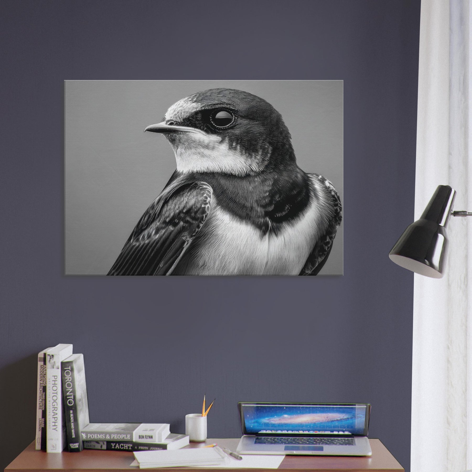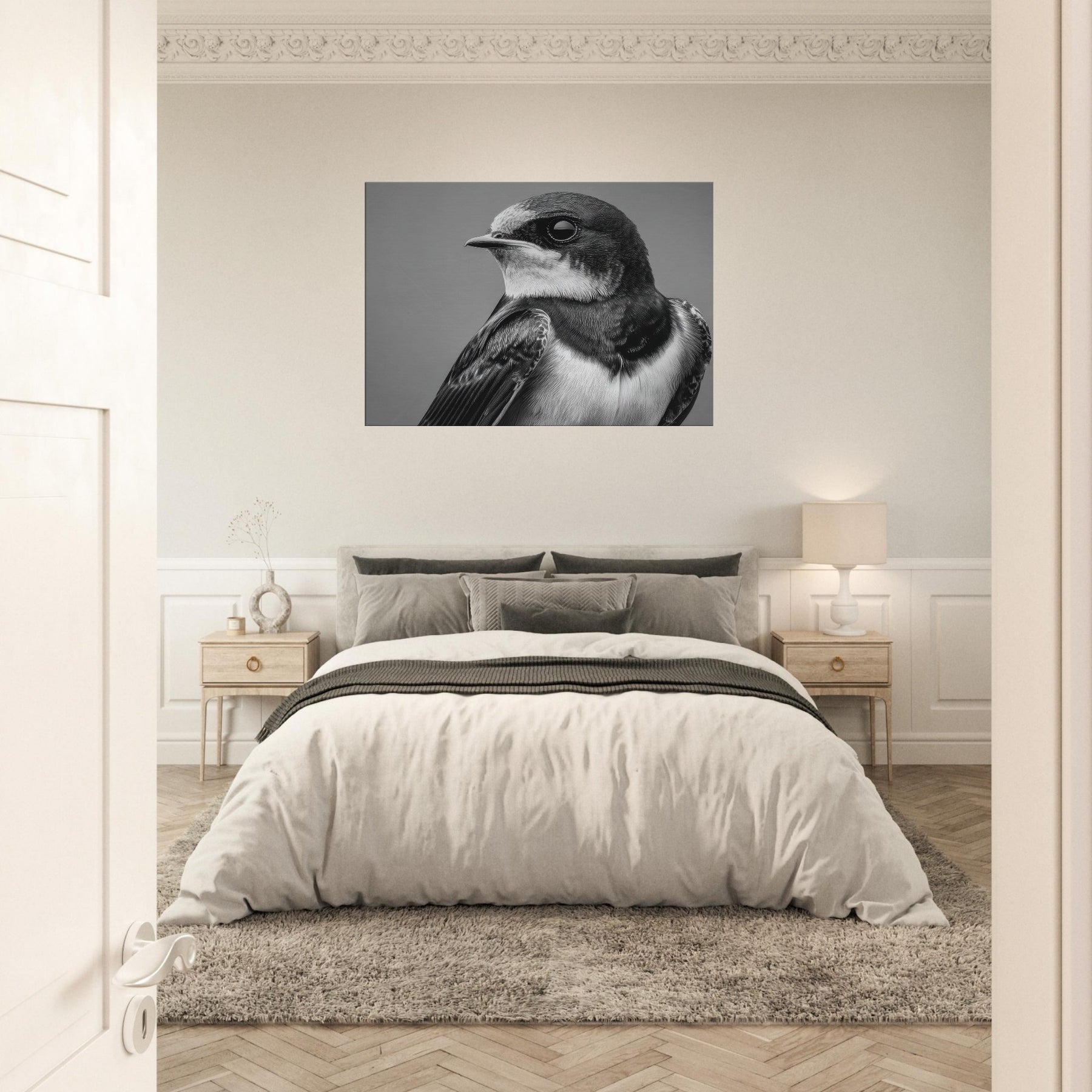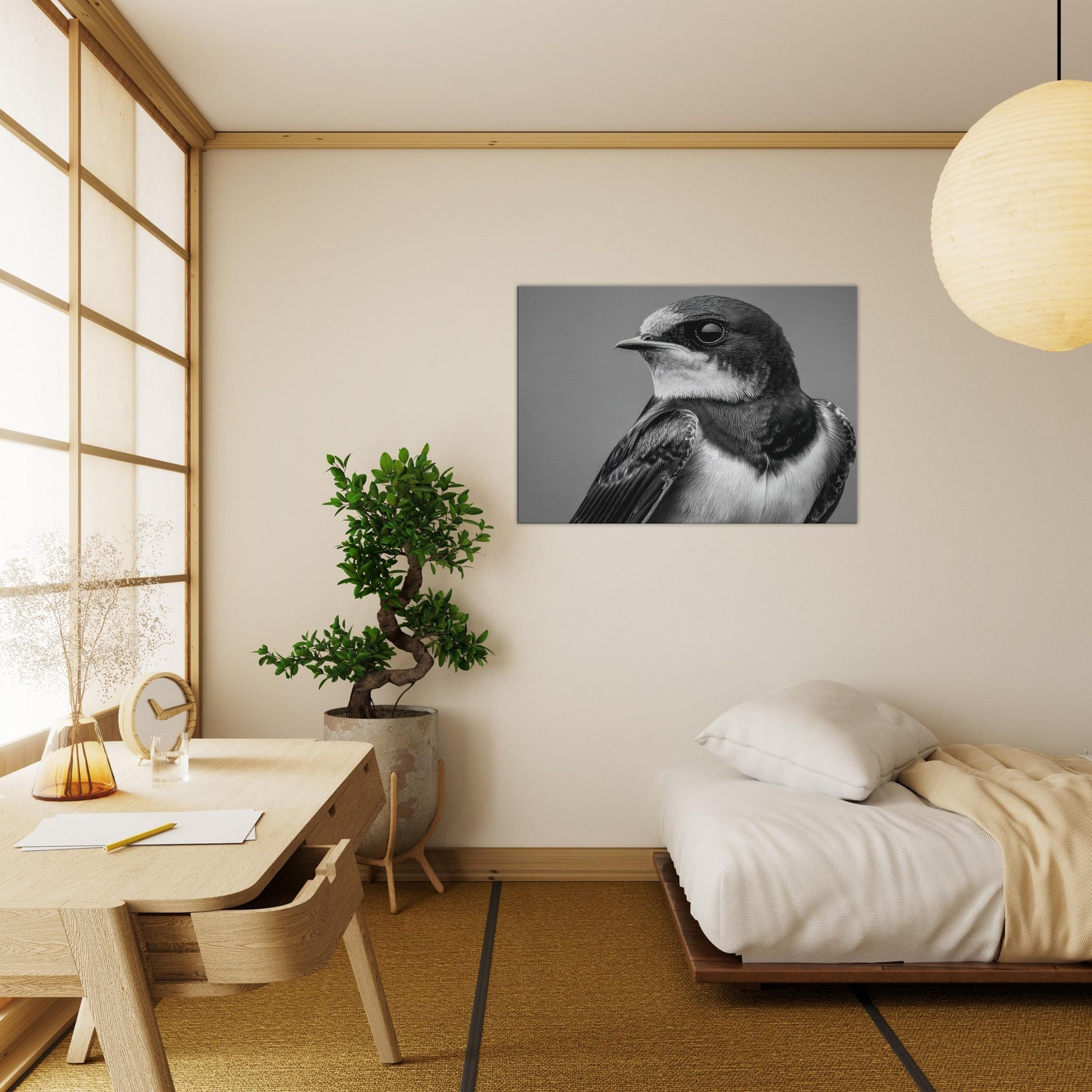 Mindfully perched in monochrome, this study of a swallow captures a moment between breath and breeze. The bold black ink traces its contour, while gentle whites carve light across a feathered chest, inviting quiet contemplation. Hang this piece where a sunlit room meets evening calm a hallway, a study, or a living room corner where the swallow’s poised elegance can slow the tempo of daily life. It pairs effortlessly with clean lines, soft textures, and the quiet drama of black and white interiors.