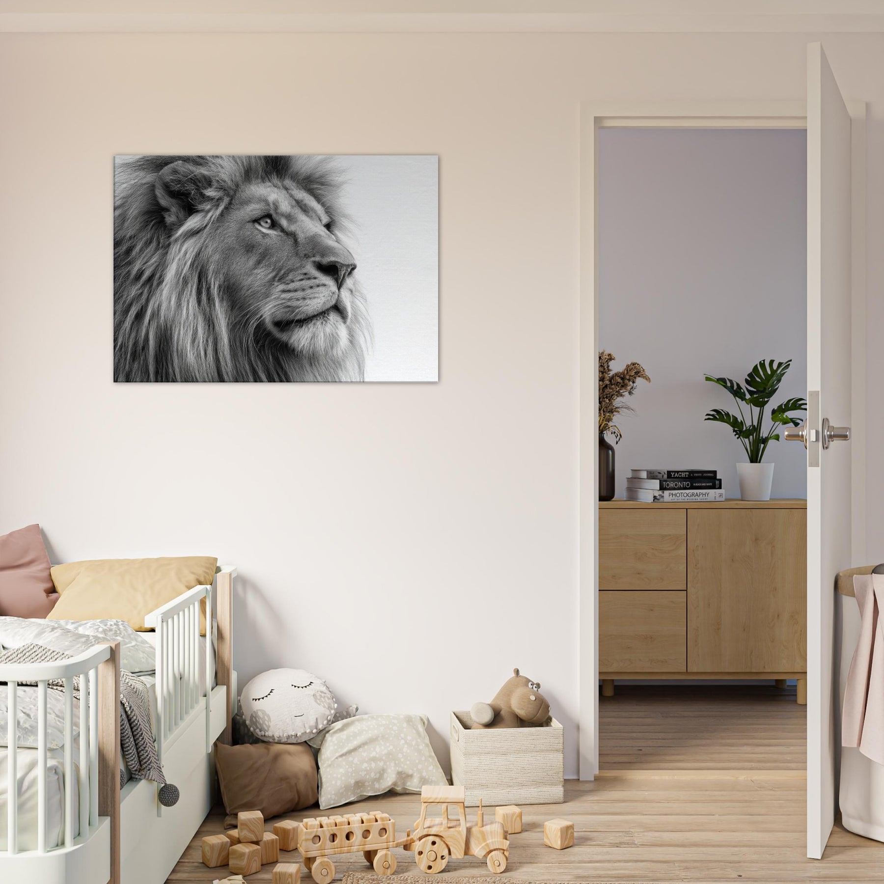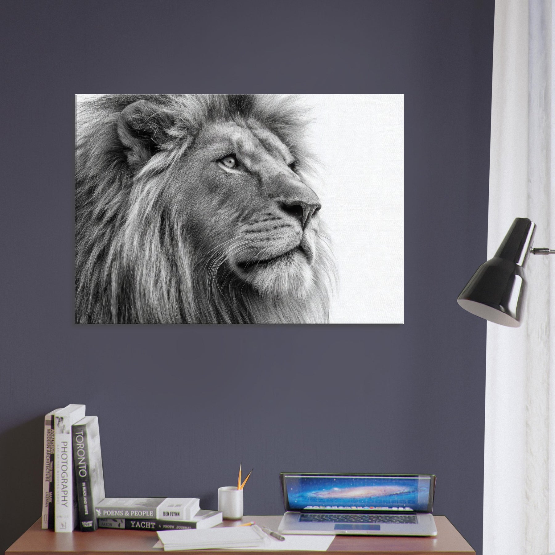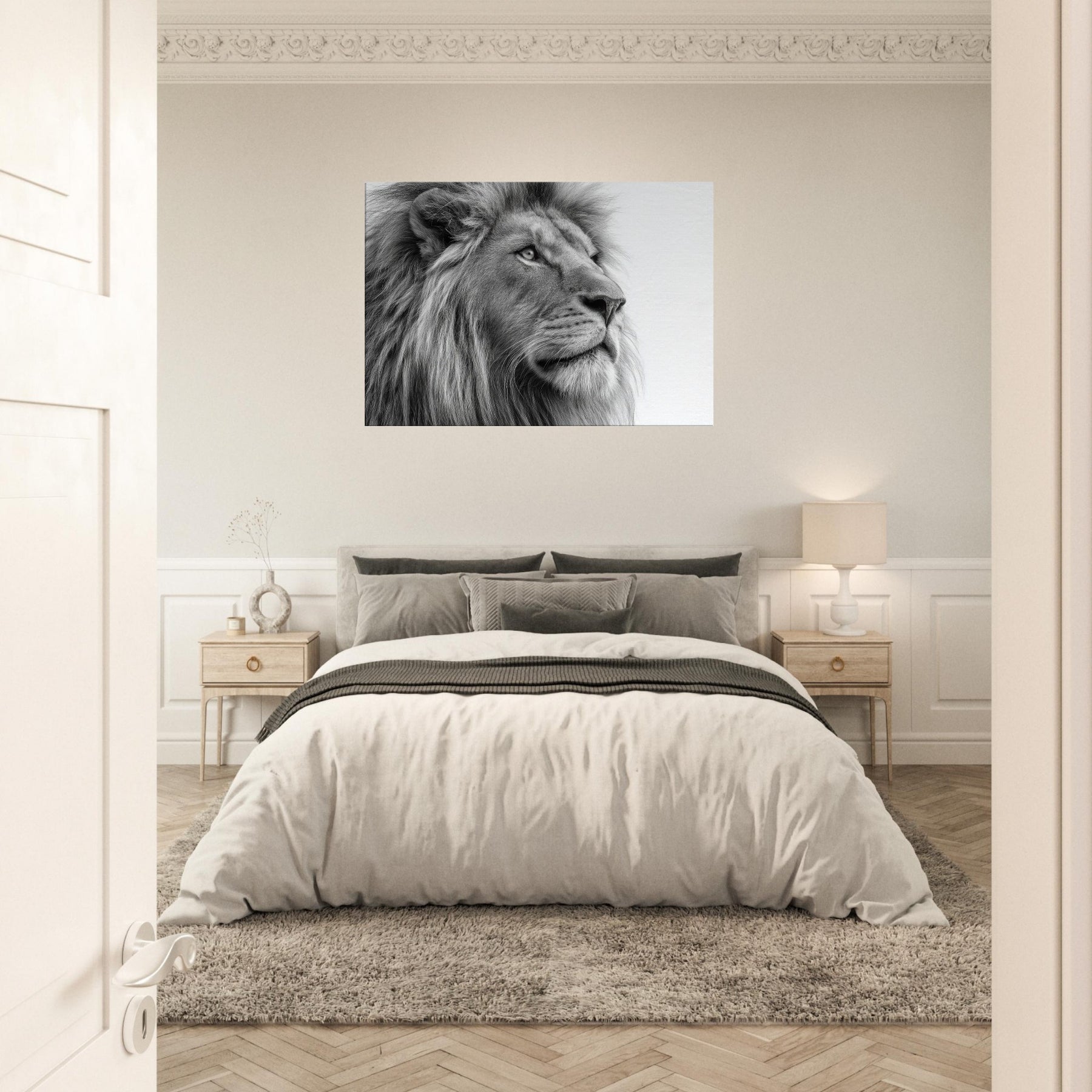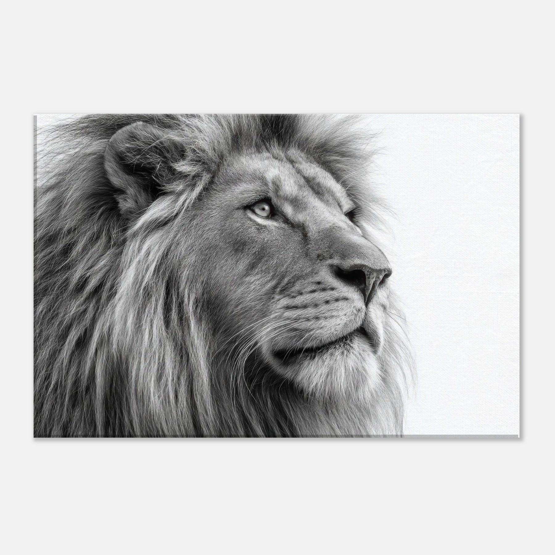 A meditative study of power and poise, this lion wields black and white contrast with quiet majesty. Every strand of mane and contour of the snout is rendered with tactile detail, drawing the eye and inviting a closer gaze. Perfect for living rooms, studies, or hallways, it brings timeless elegance and a calm sophistication. The absence of color sharpens light and shadow, turning your wall into a contemplative sanctuary where presence and art meet.