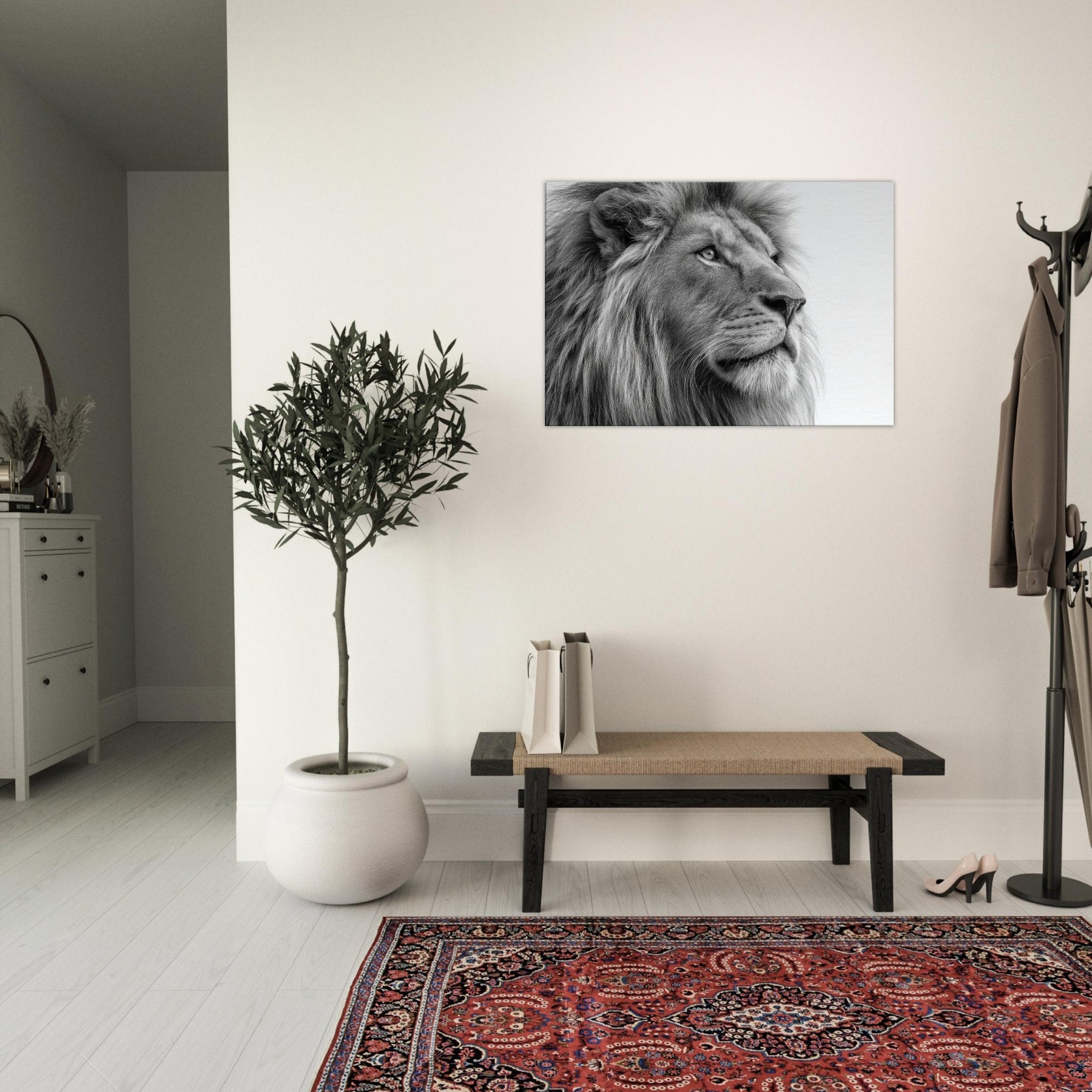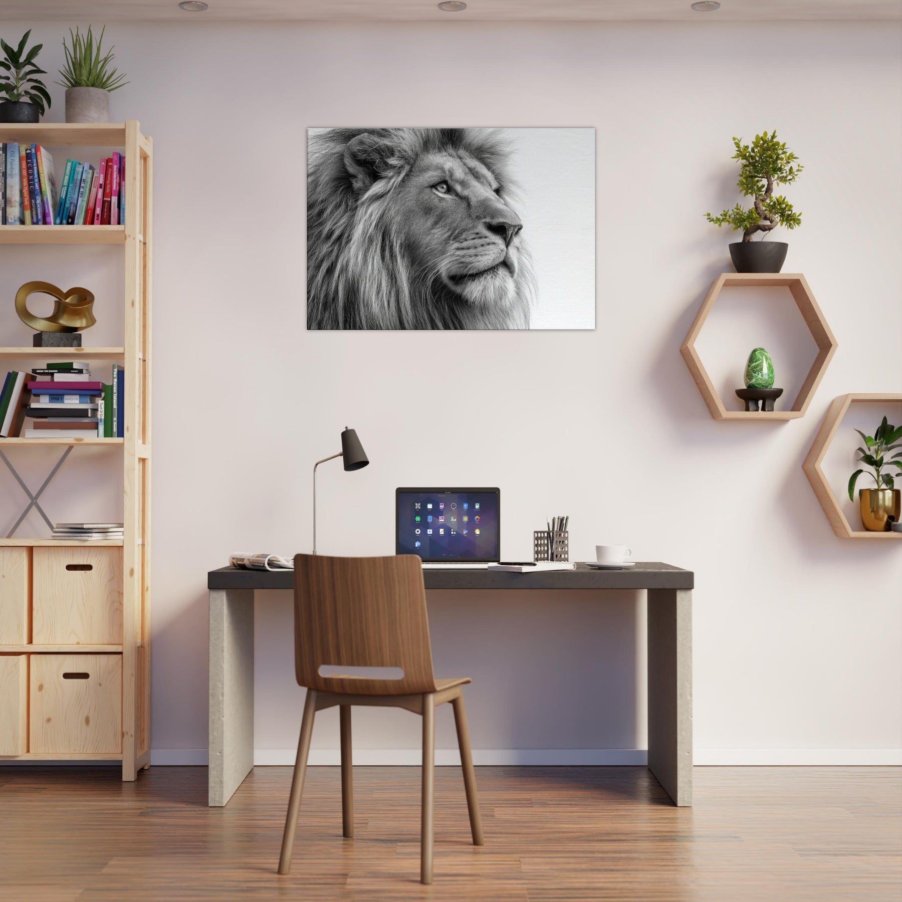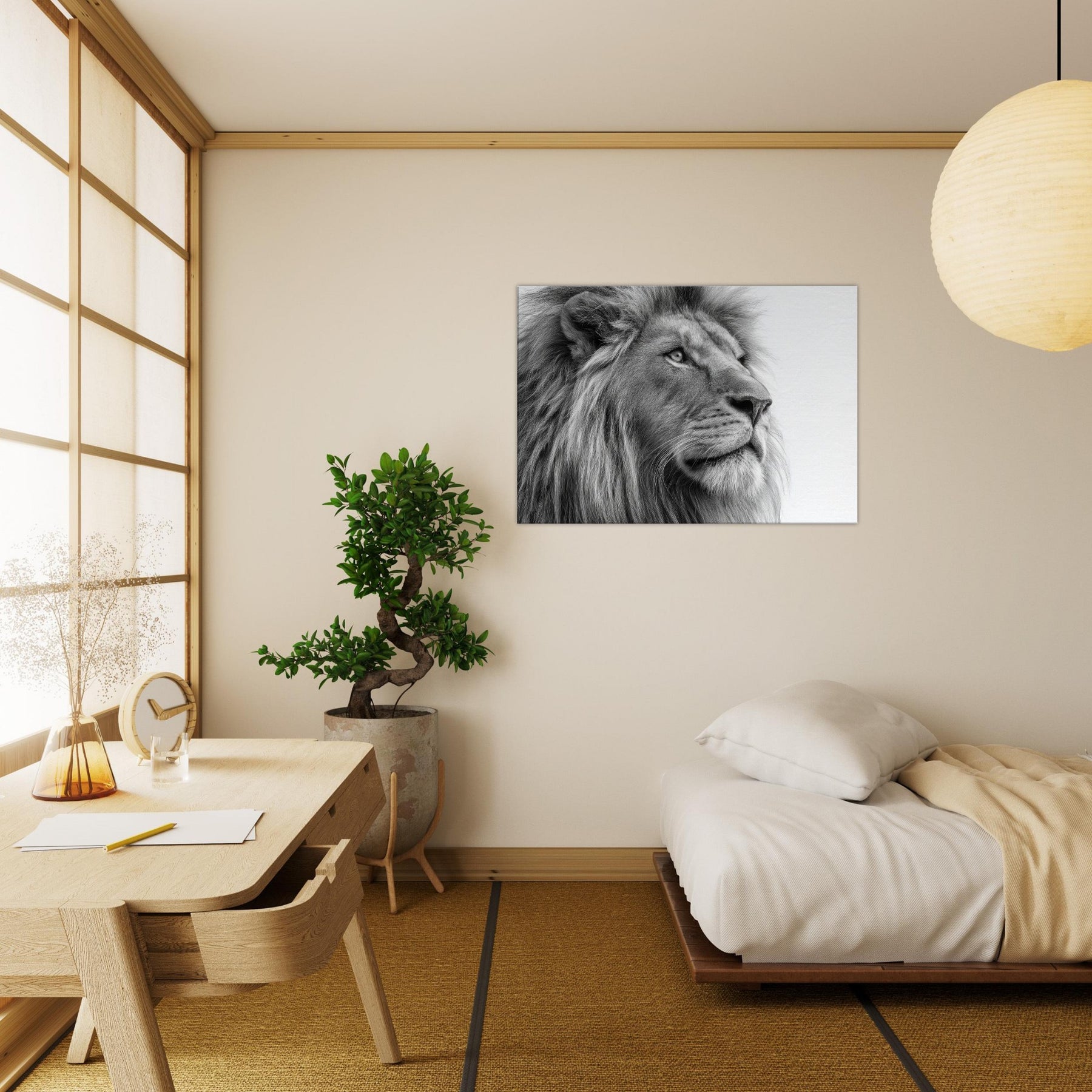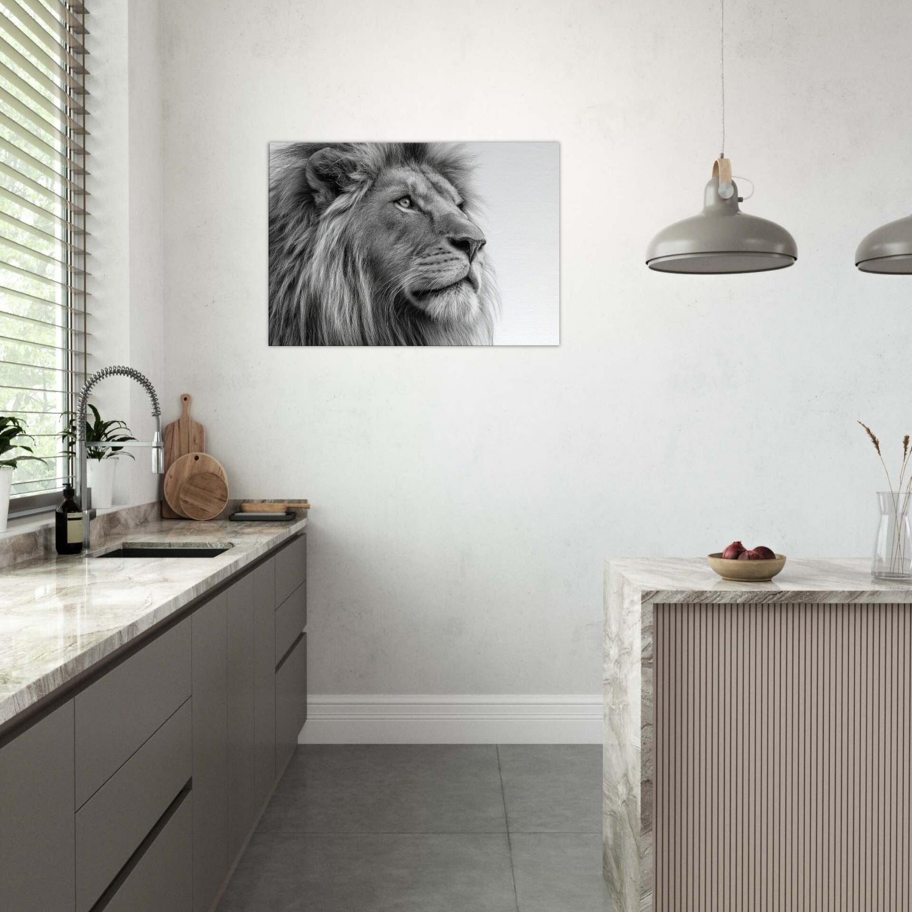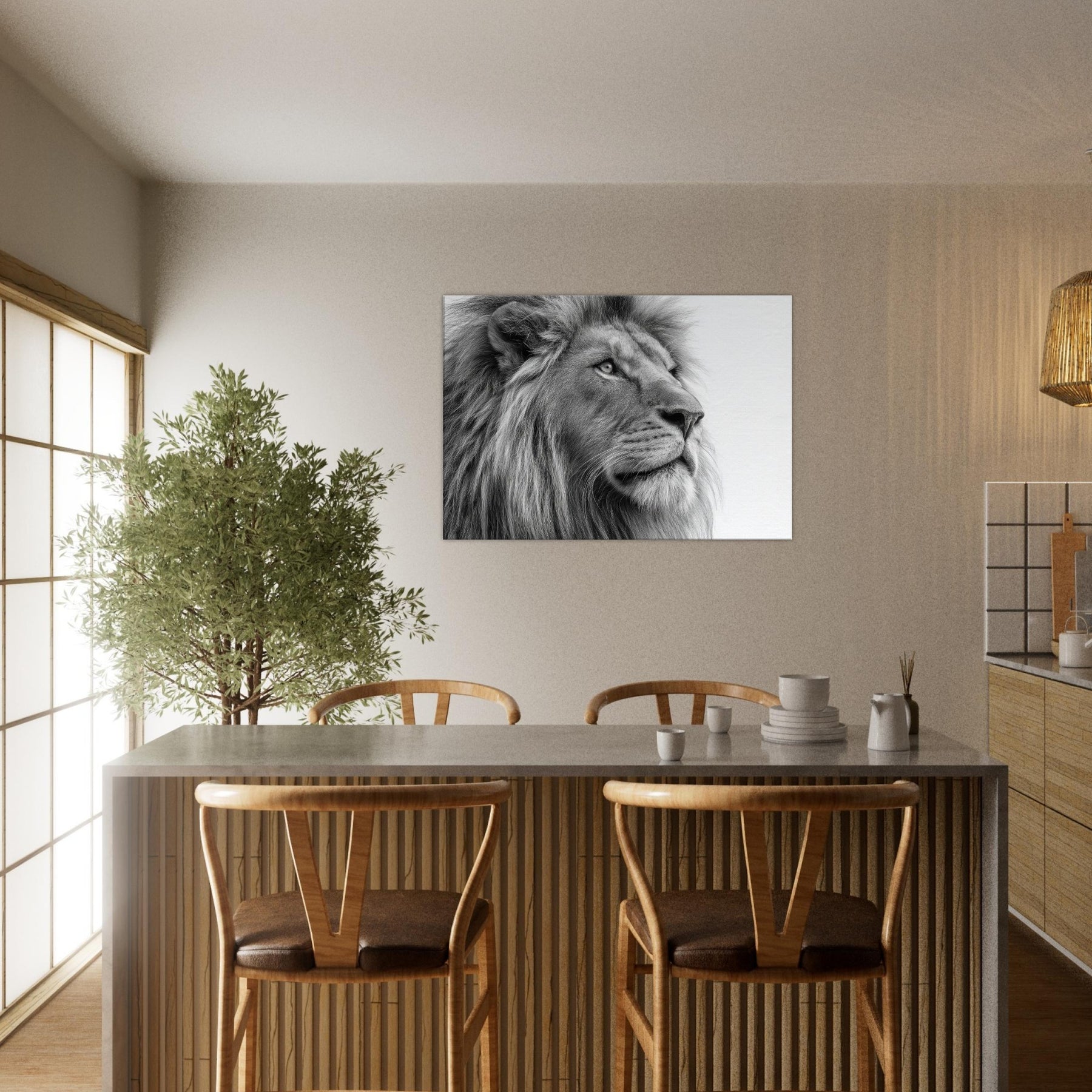 A meditative study of power and poise, this lion wields black and white contrast with quiet majesty. Every strand of mane and contour of the snout is rendered with tactile detail, drawing the eye and inviting a closer gaze. Perfect for living rooms, studies, or hallways, it brings timeless elegance and a calm sophistication. The absence of color sharpens light and shadow, turning your wall into a contemplative sanctuary where presence and art meet.