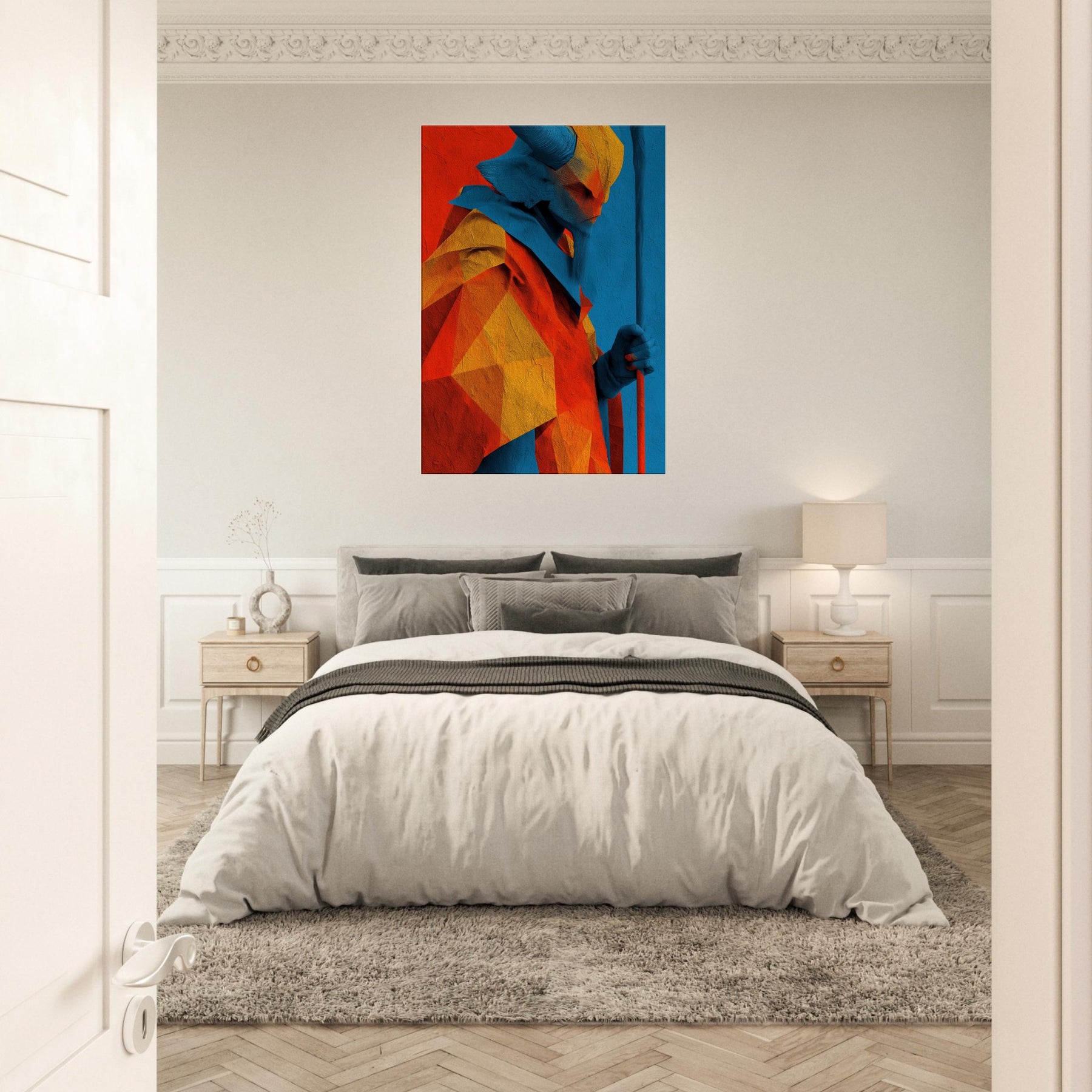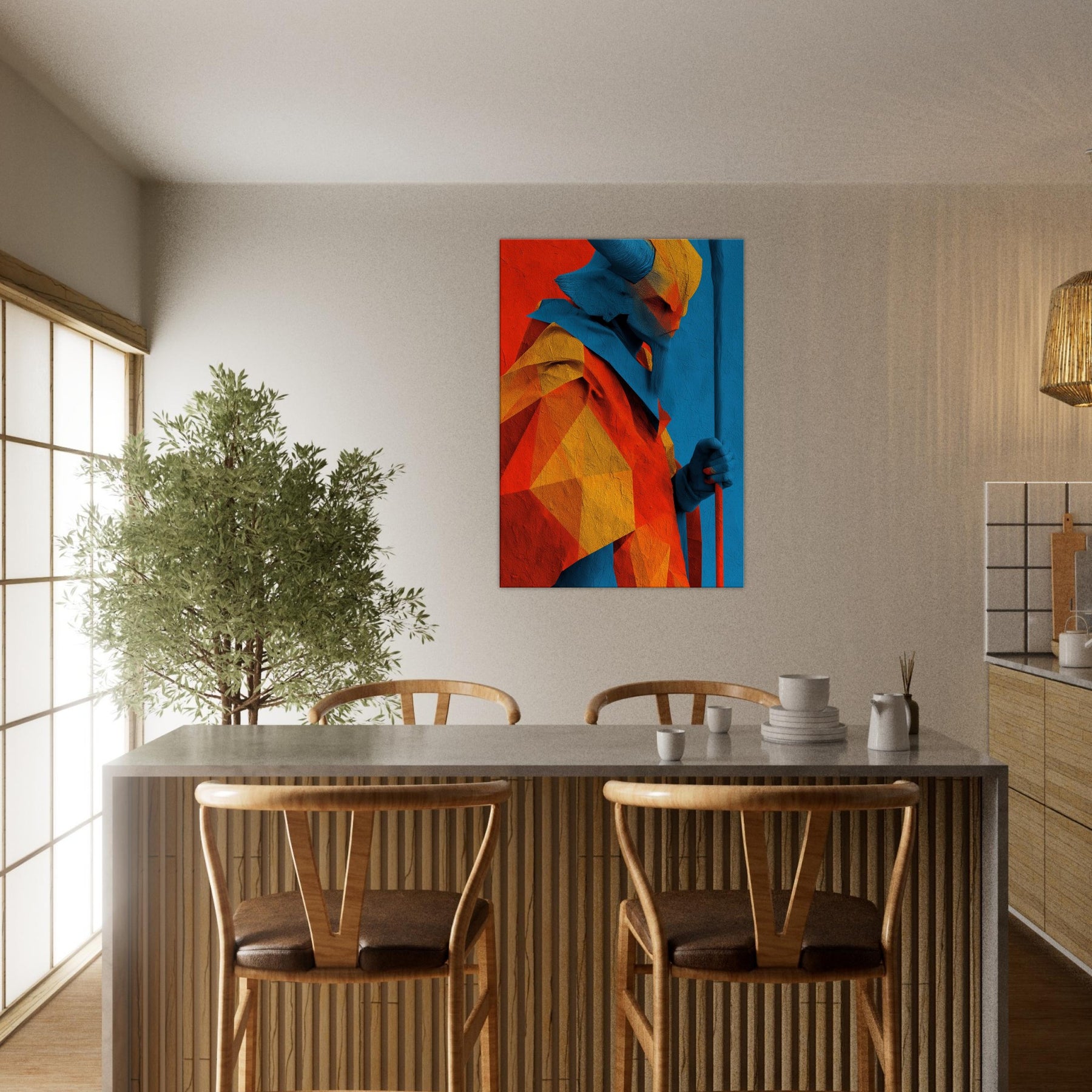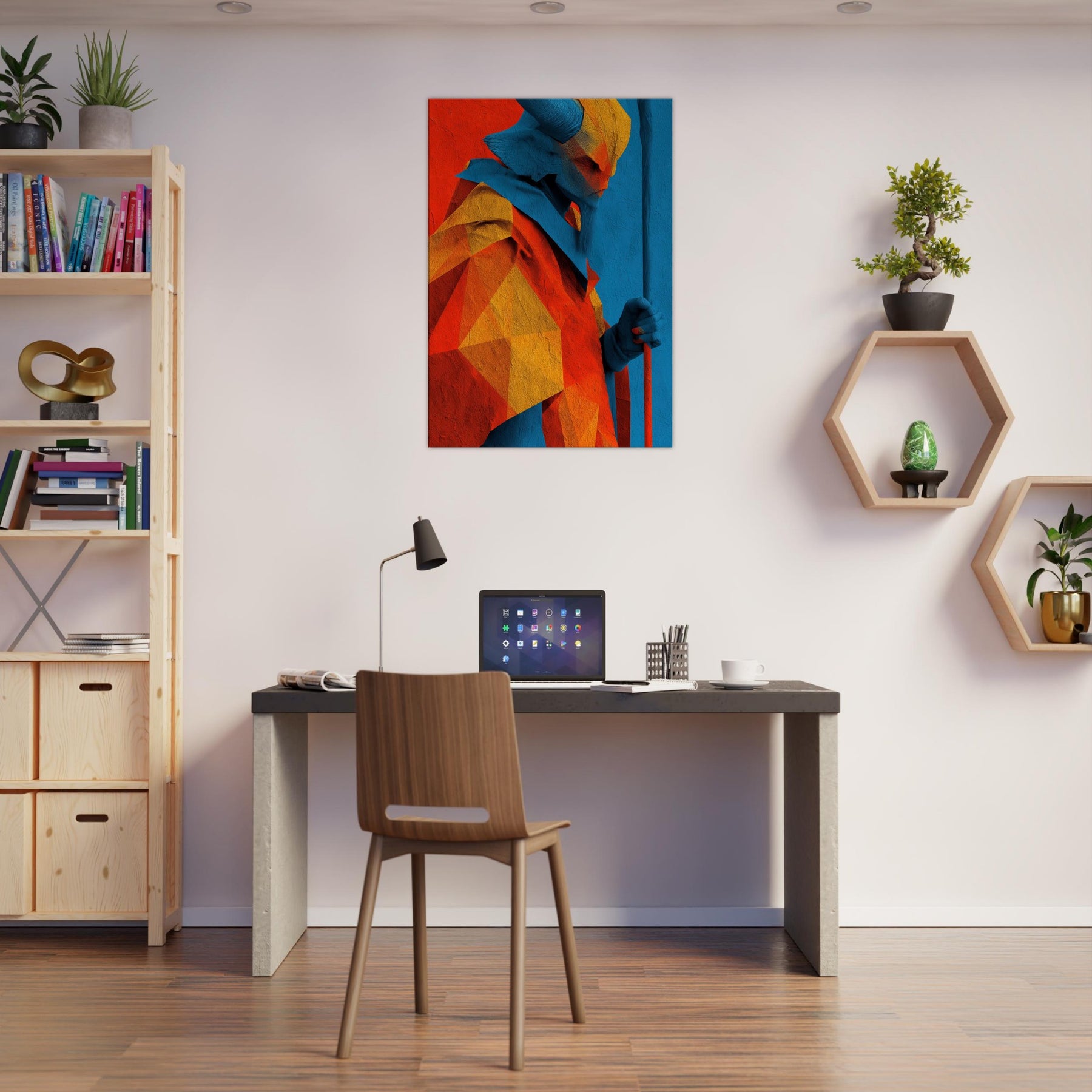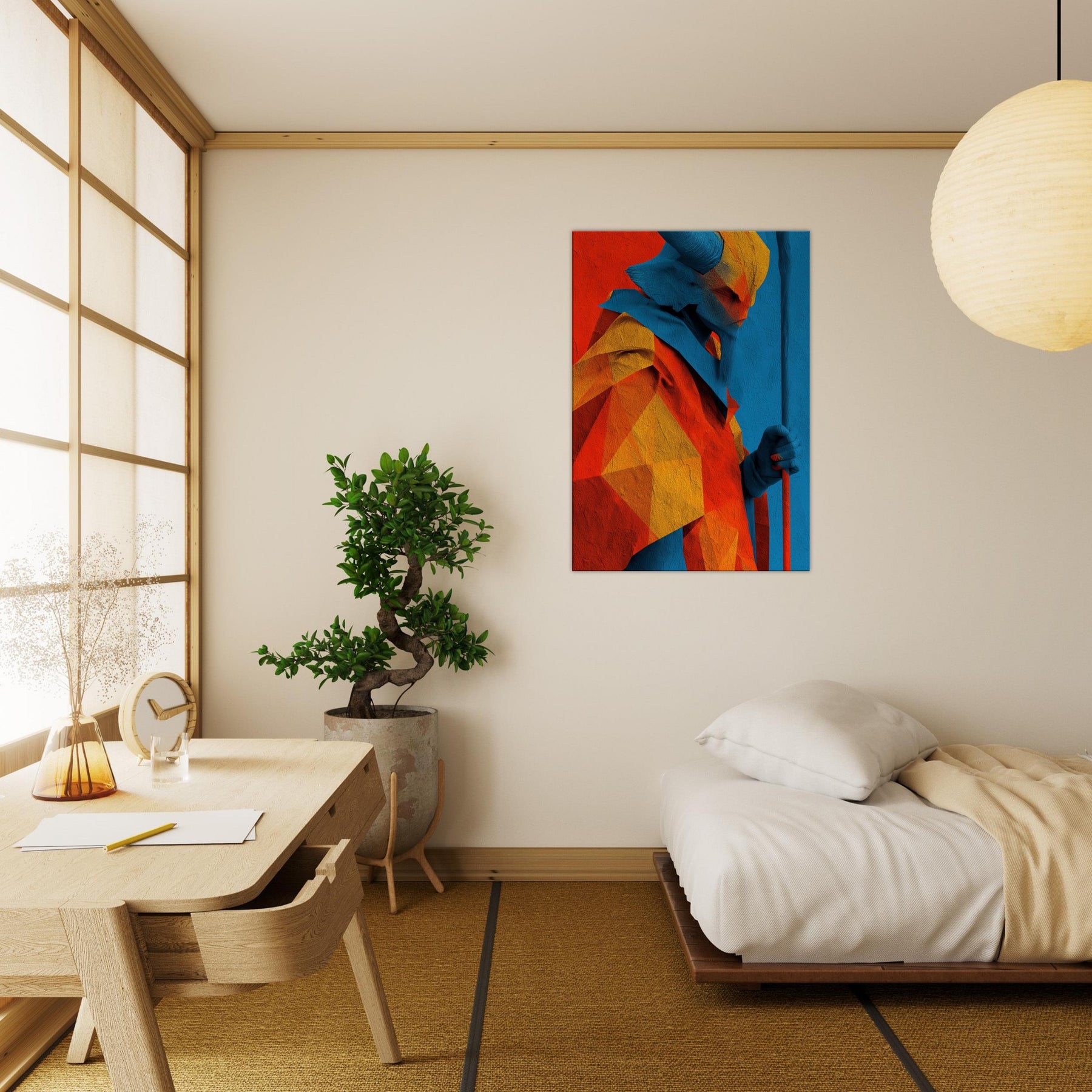 An abstract odyssey in color, Ra emerges as a radiant oracle against a field of heat and sky. The layered geometry and electric azure channel sunlight into your room, turning walls into a quiet temple. The sculpture like folds invite touch (though 2D), the warmth of orange and gold balances cool blues, creating a paradox of crossing horizons. Hang it in a living room or study to evoke mythic energy, daily ritual, and timeless wonder.