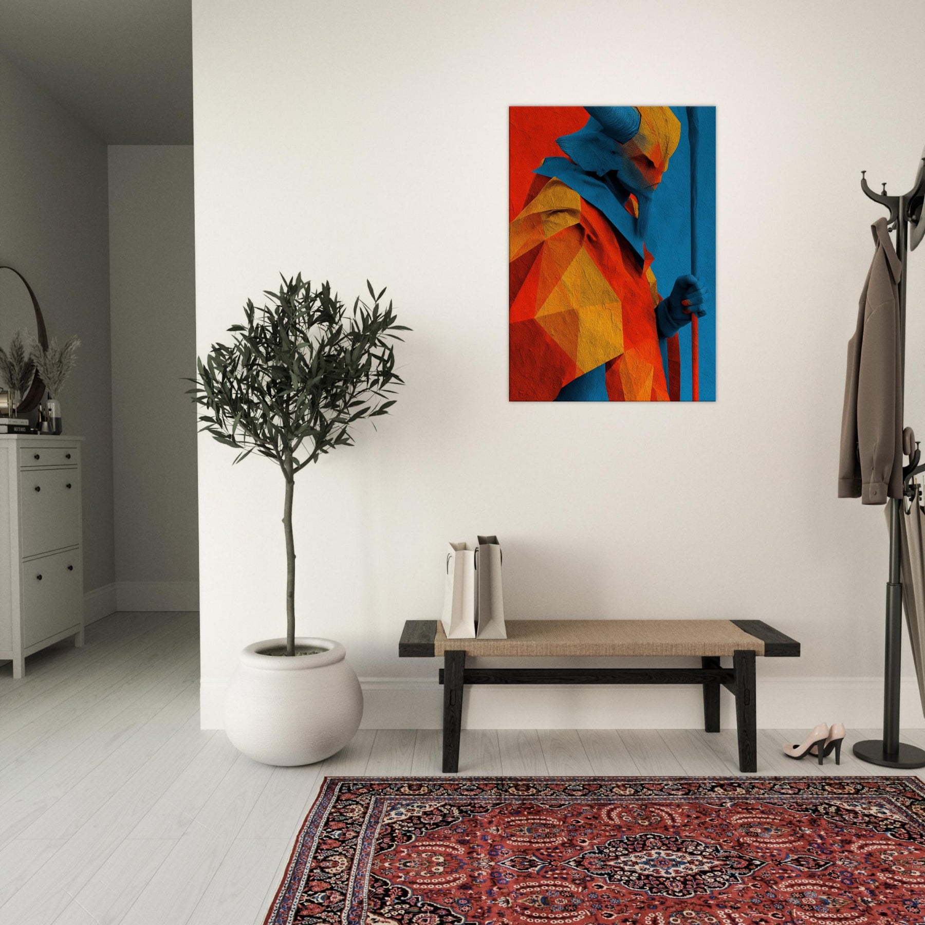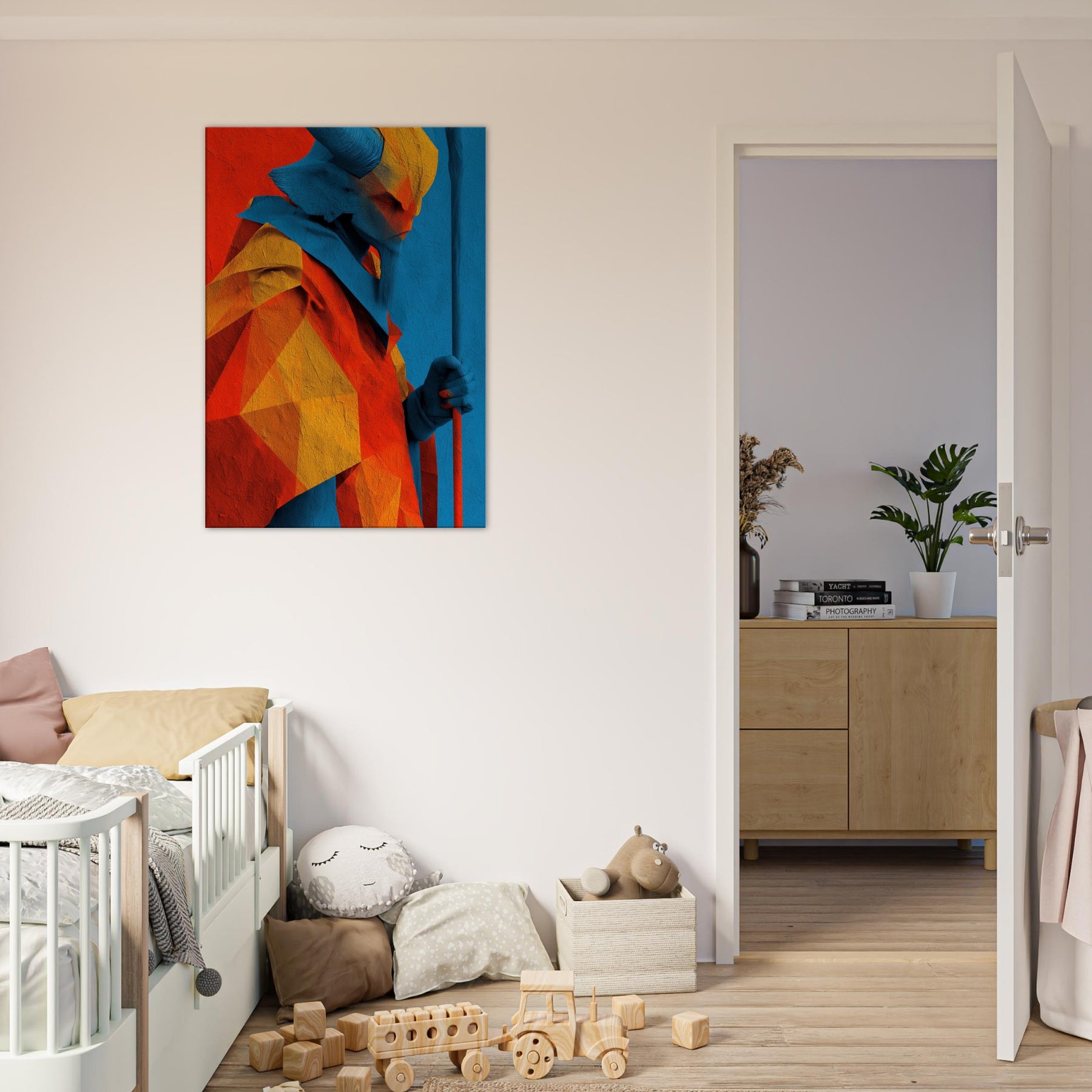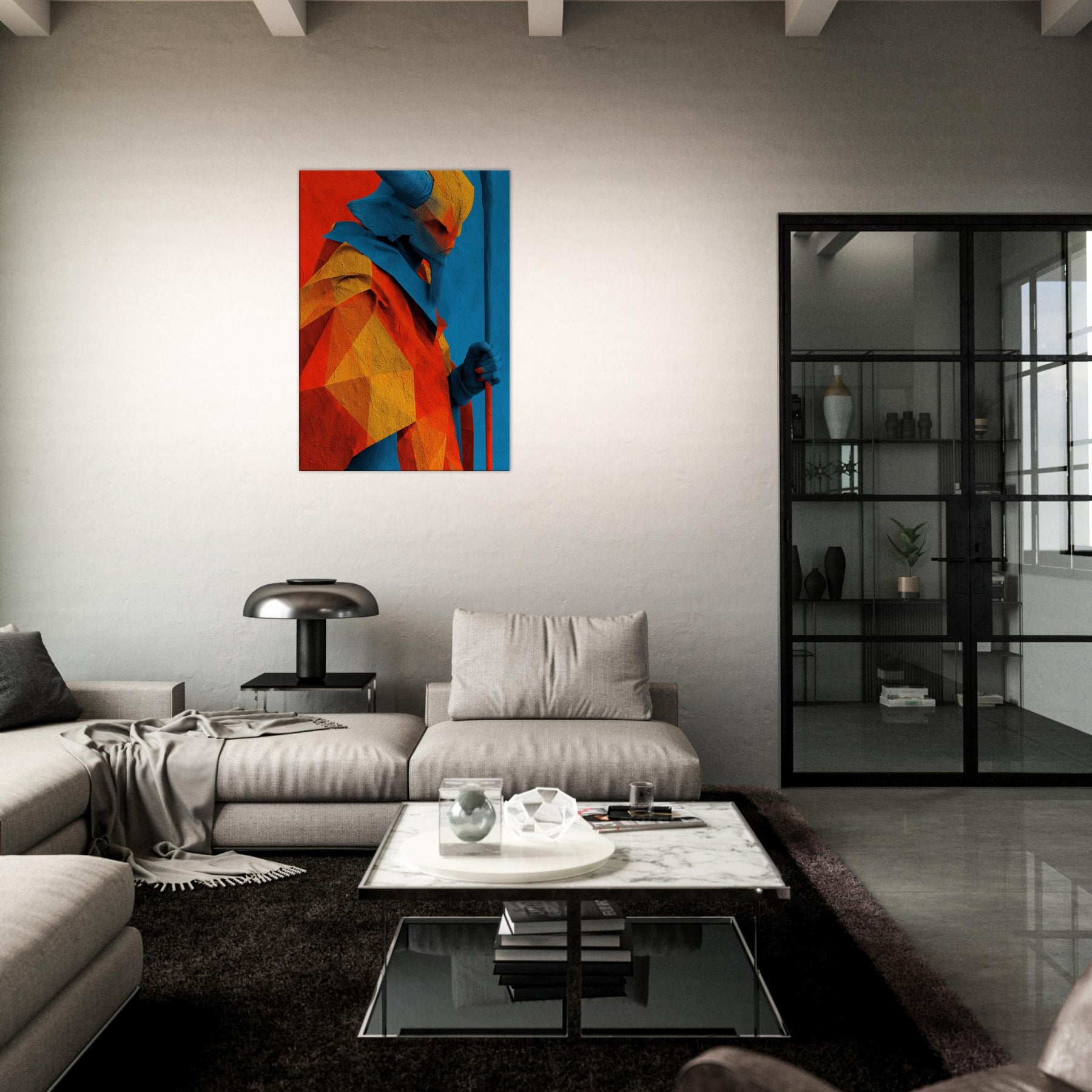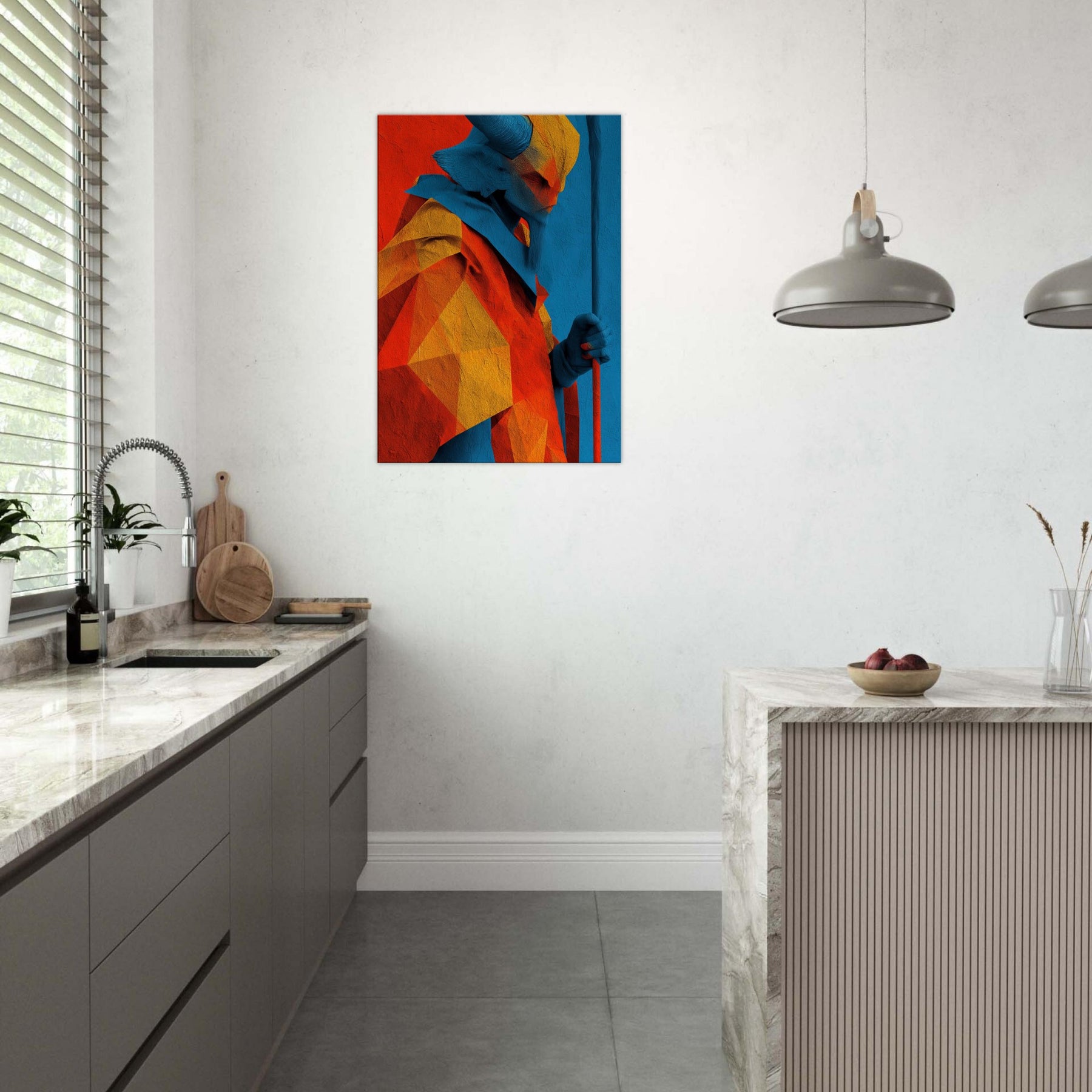 An abstract odyssey in color, Ra emerges as a radiant oracle against a field of heat and sky. The layered geometry and electric azure channel sunlight into your room, turning walls into a quiet temple. The sculpture like folds invite touch (though 2D), the warmth of orange and gold balances cool blues, creating a paradox of crossing horizons. Hang it in a living room or study to evoke mythic energy, daily ritual, and timeless wonder.