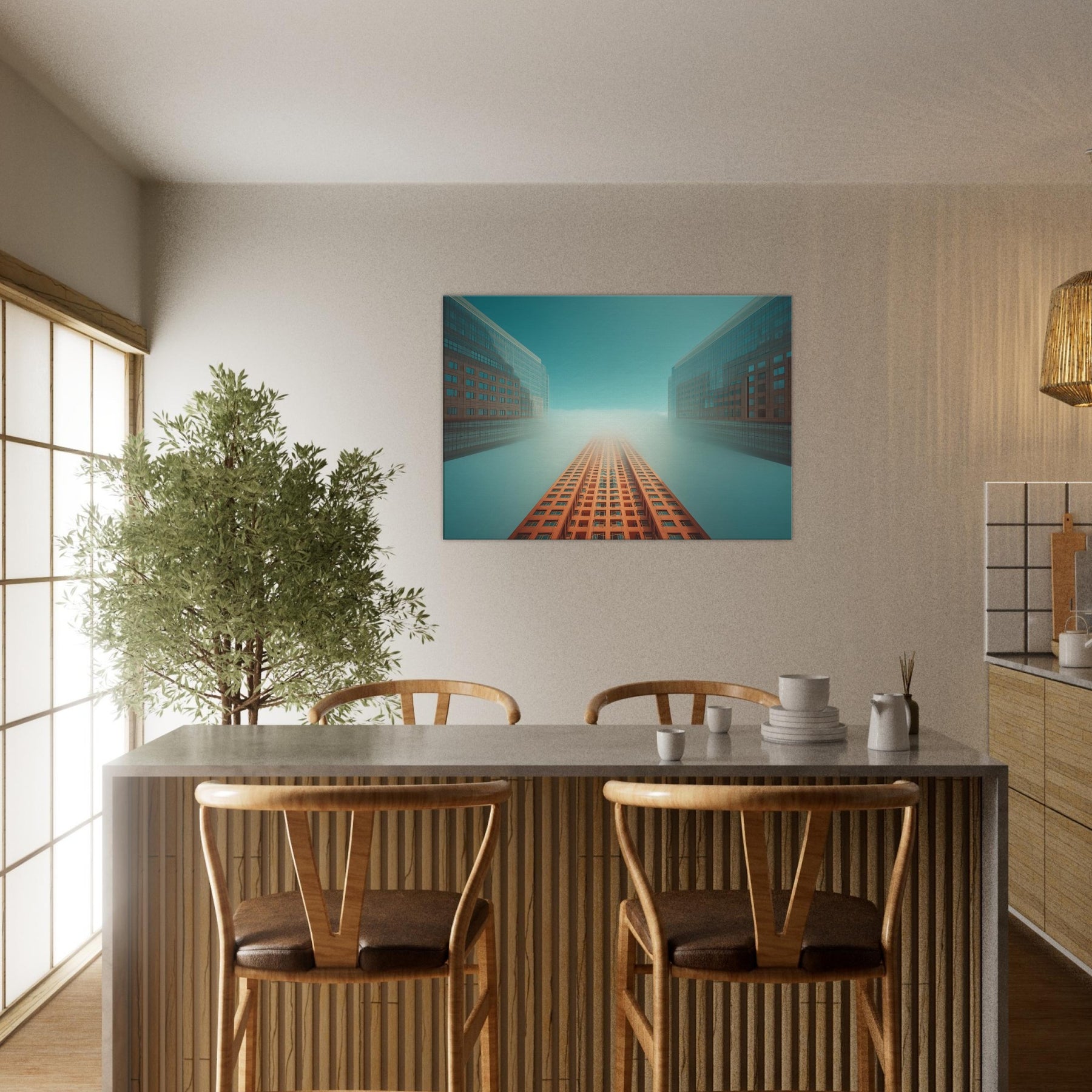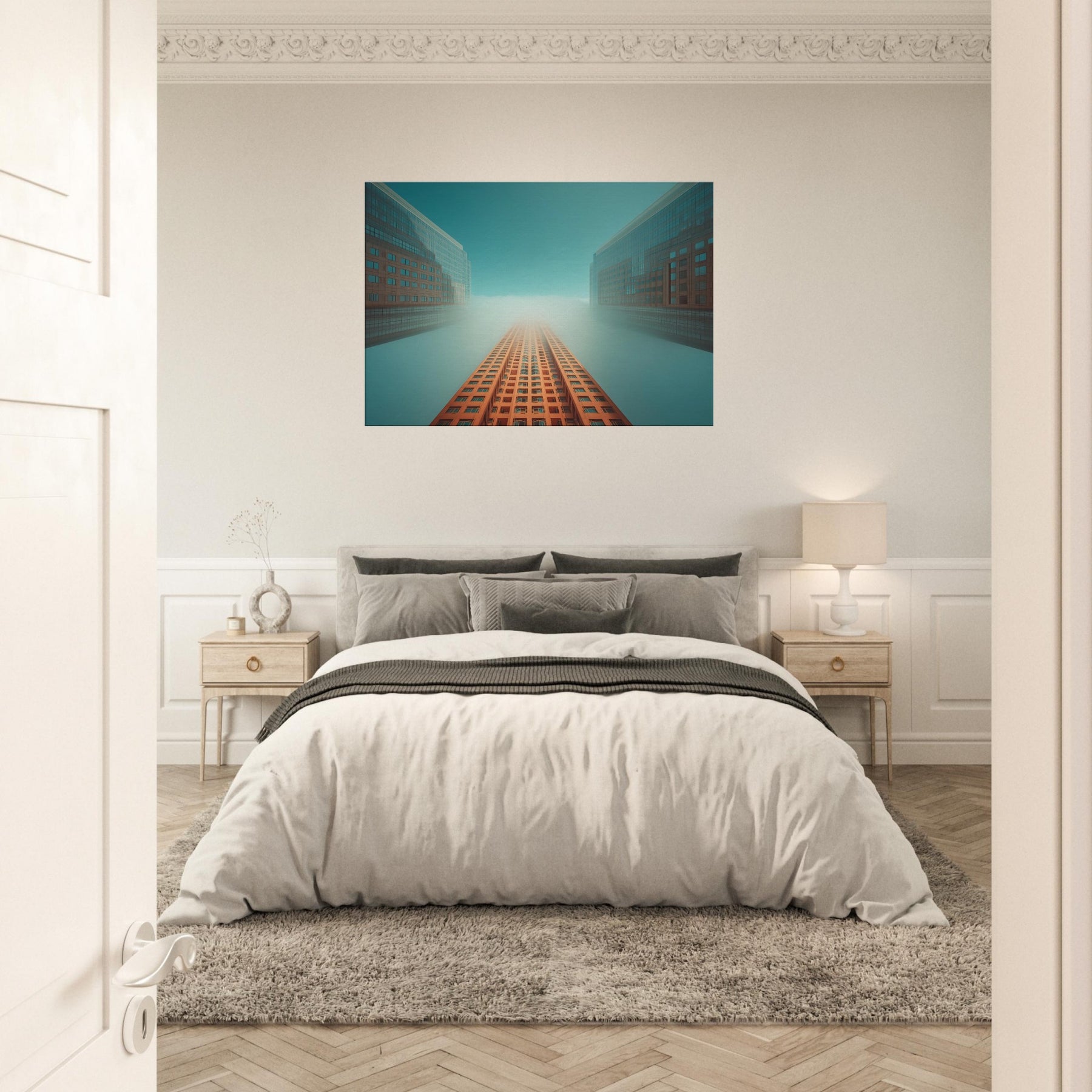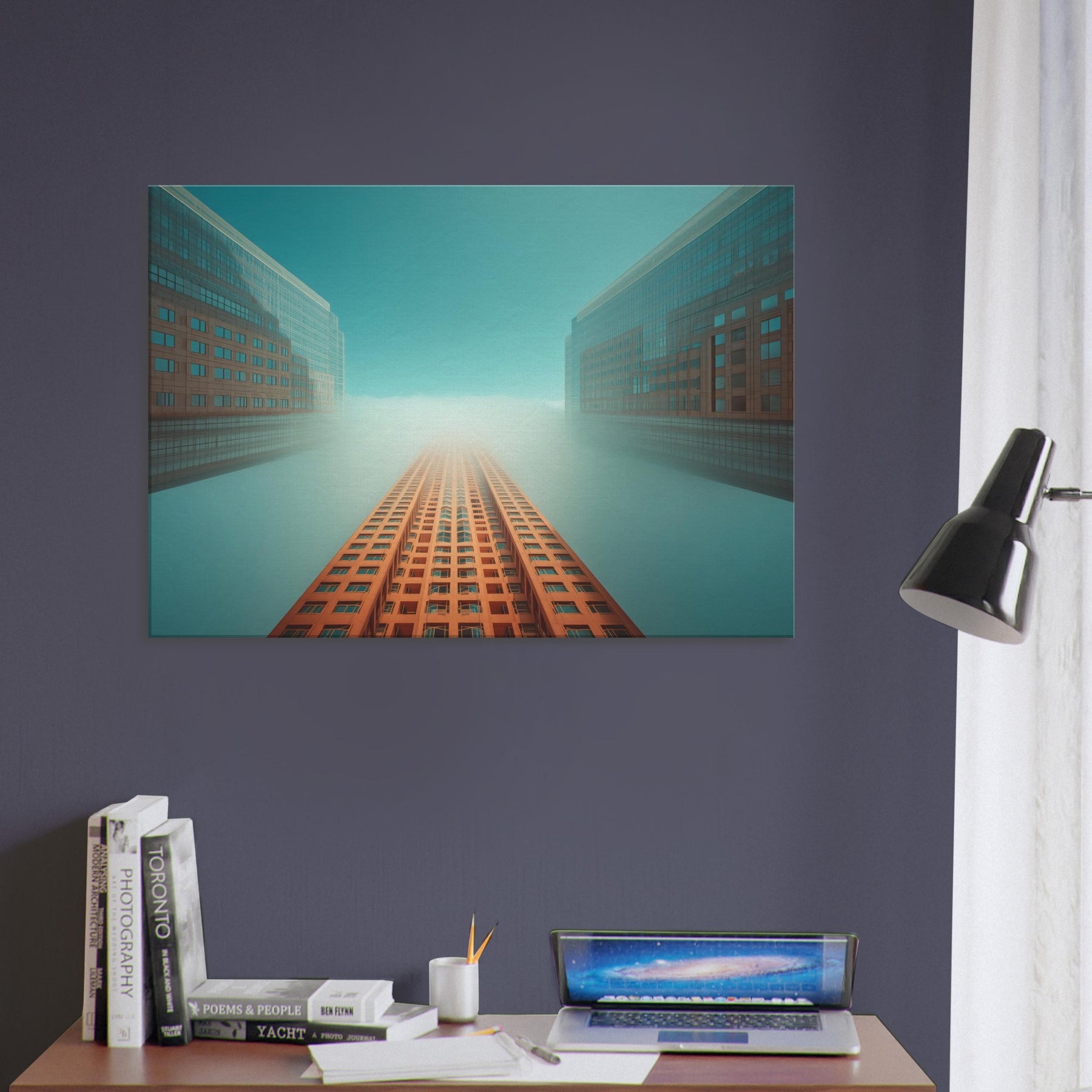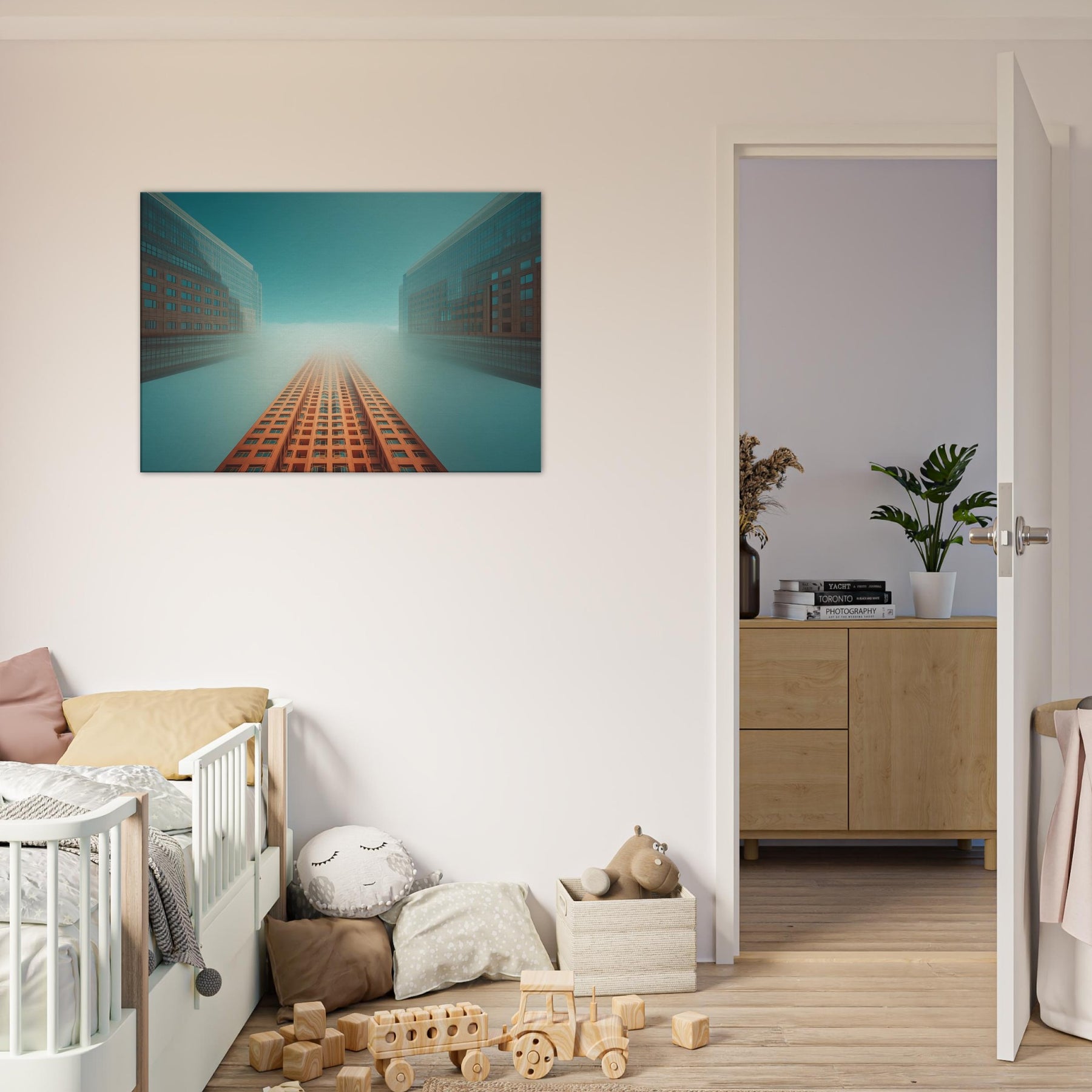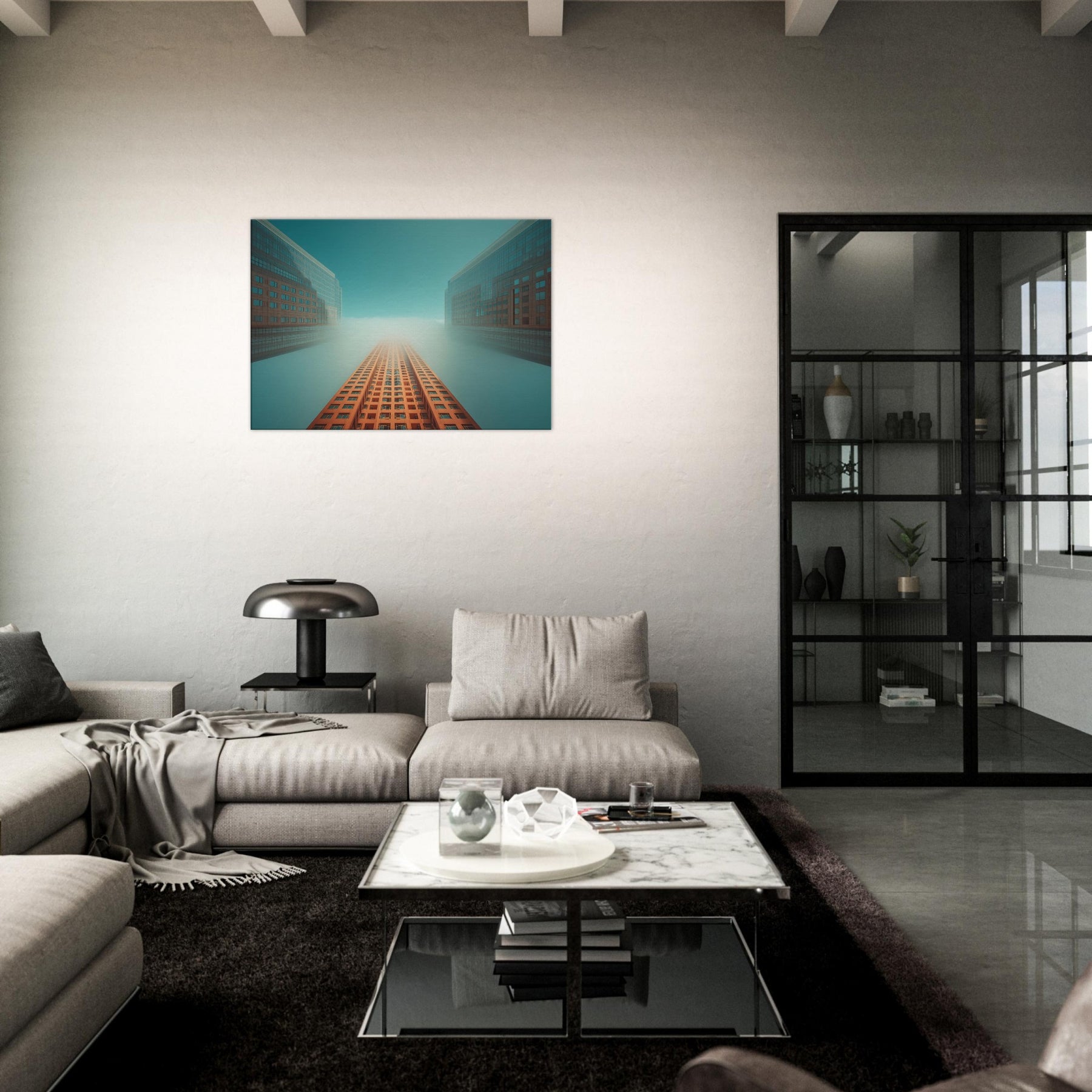 Los Angeles rises as a dreamscape where towers stretch toward an uncharted horizon. In this surreal composition, a copper hued central spine threads upward between two glass and brick canyons, guiding the eye into a pale, misty void. The atmosphere feels hushed yet awake warm light dissolving into cool air, the city breathing in a slow, cinematic tempo. This piece enhances a living space with quiet drama and spacious rhythm, turning a wall into a portal of imagination and reflection, a daily reminder that wonder can reside in the everyday.