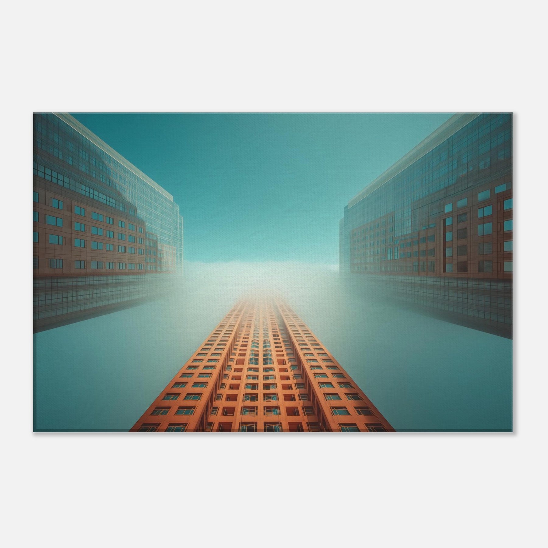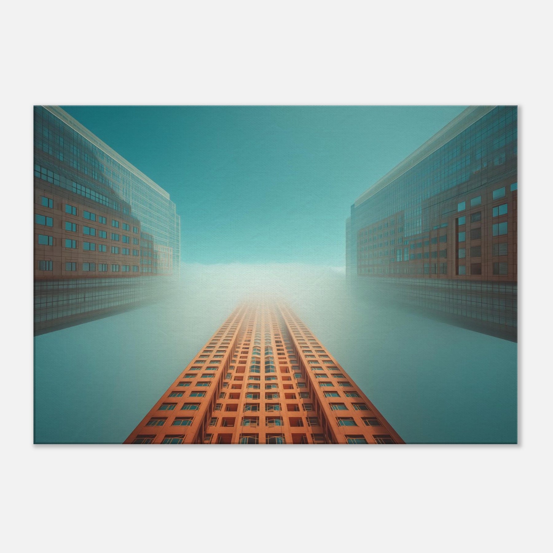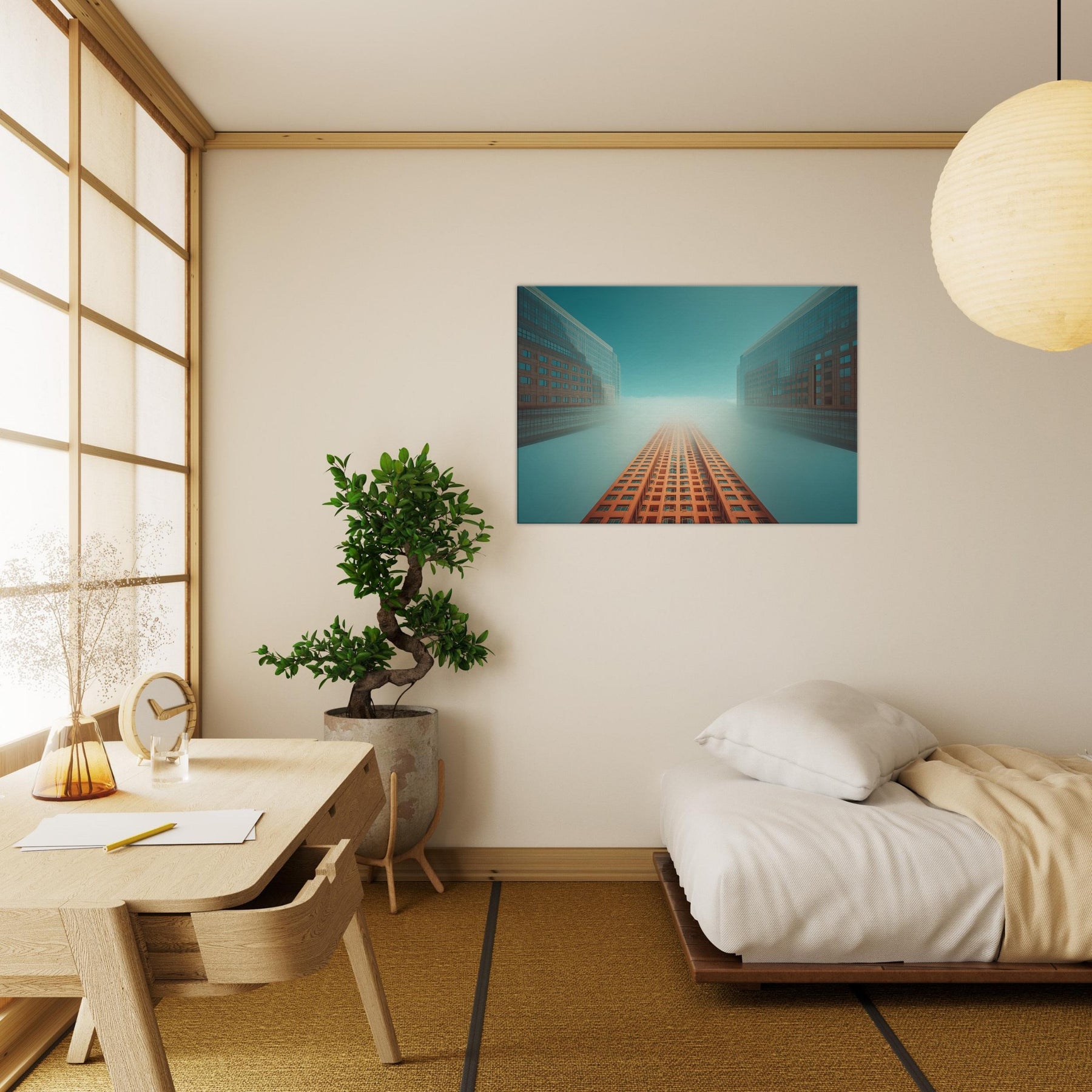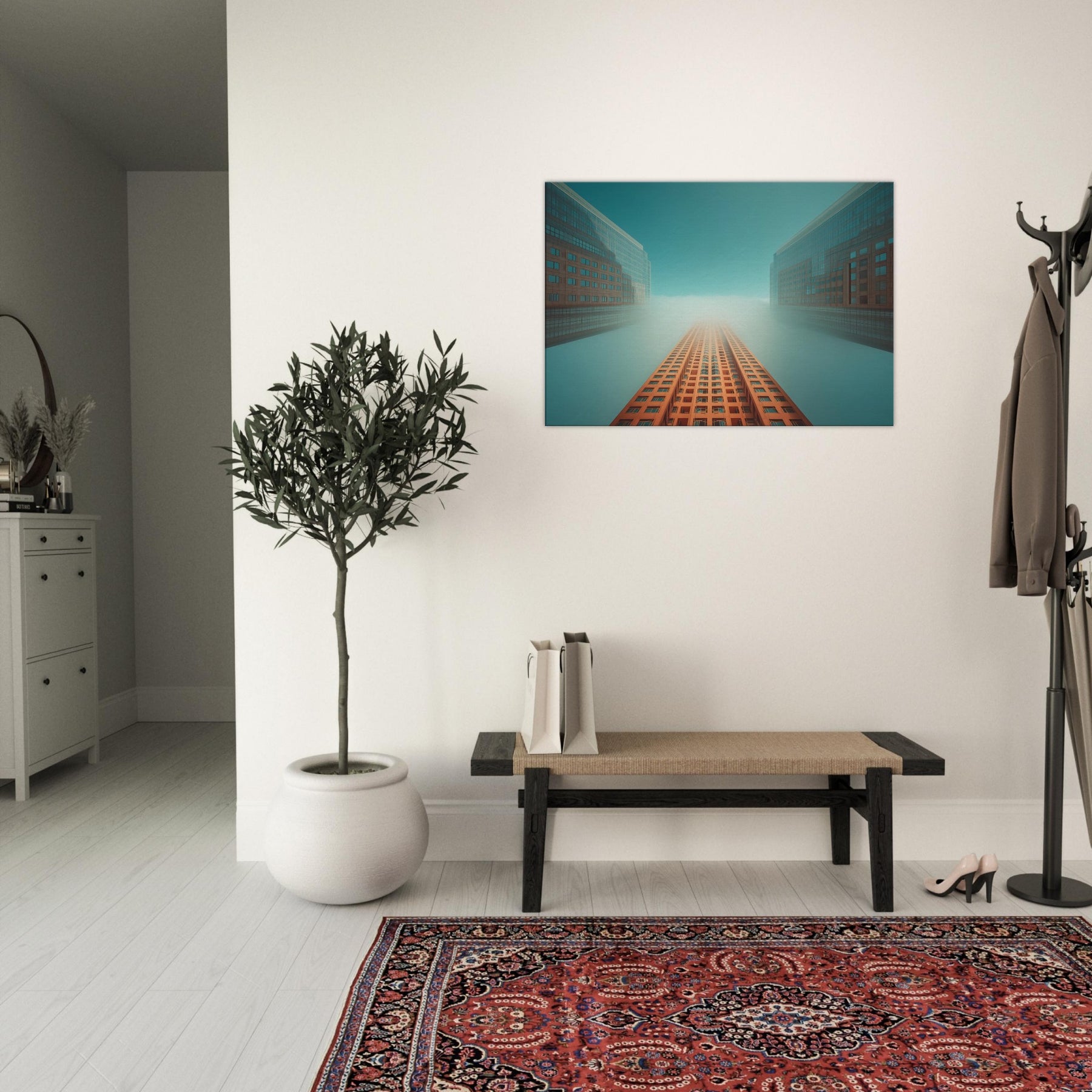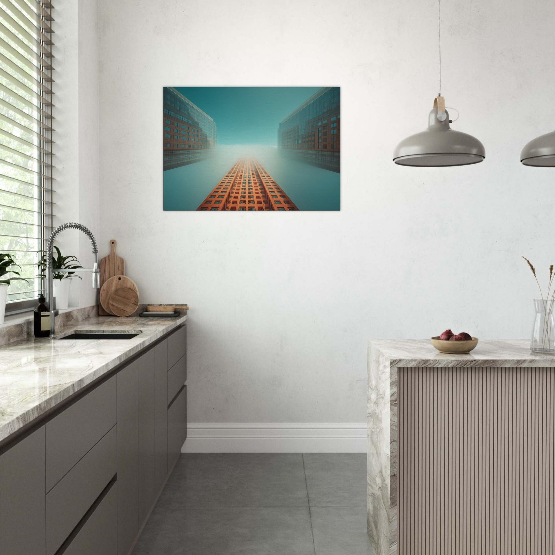 Los Angeles rises as a dreamscape where towers stretch toward an uncharted horizon. In this surreal composition, a copper hued central spine threads upward between two glass and brick canyons, guiding the eye into a pale, misty void. The atmosphere feels hushed yet awake warm light dissolving into cool air, the city breathing in a slow, cinematic tempo. This piece enhances a living space with quiet drama and spacious rhythm, turning a wall into a portal of imagination and reflection, a daily reminder that wonder can reside in the everyday.