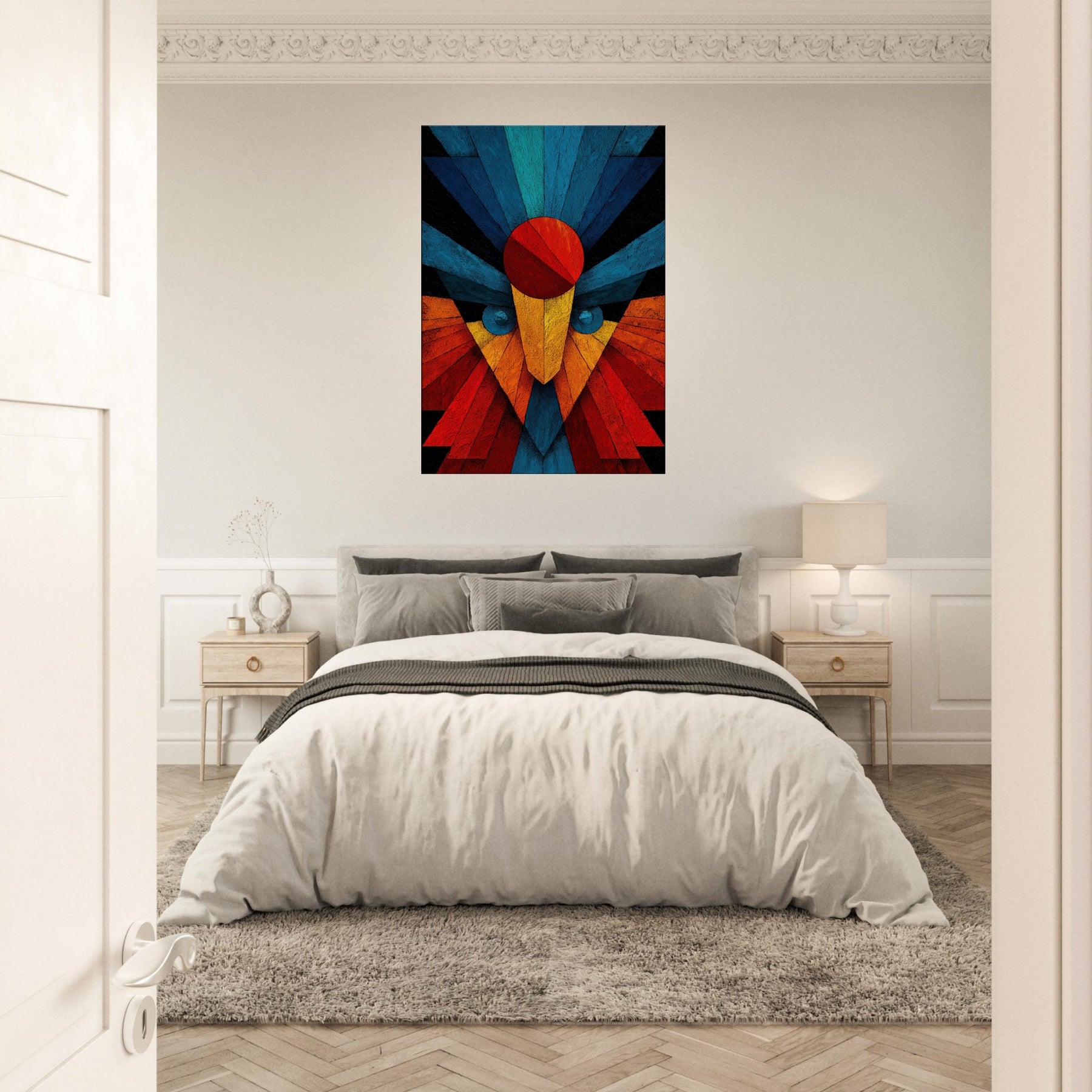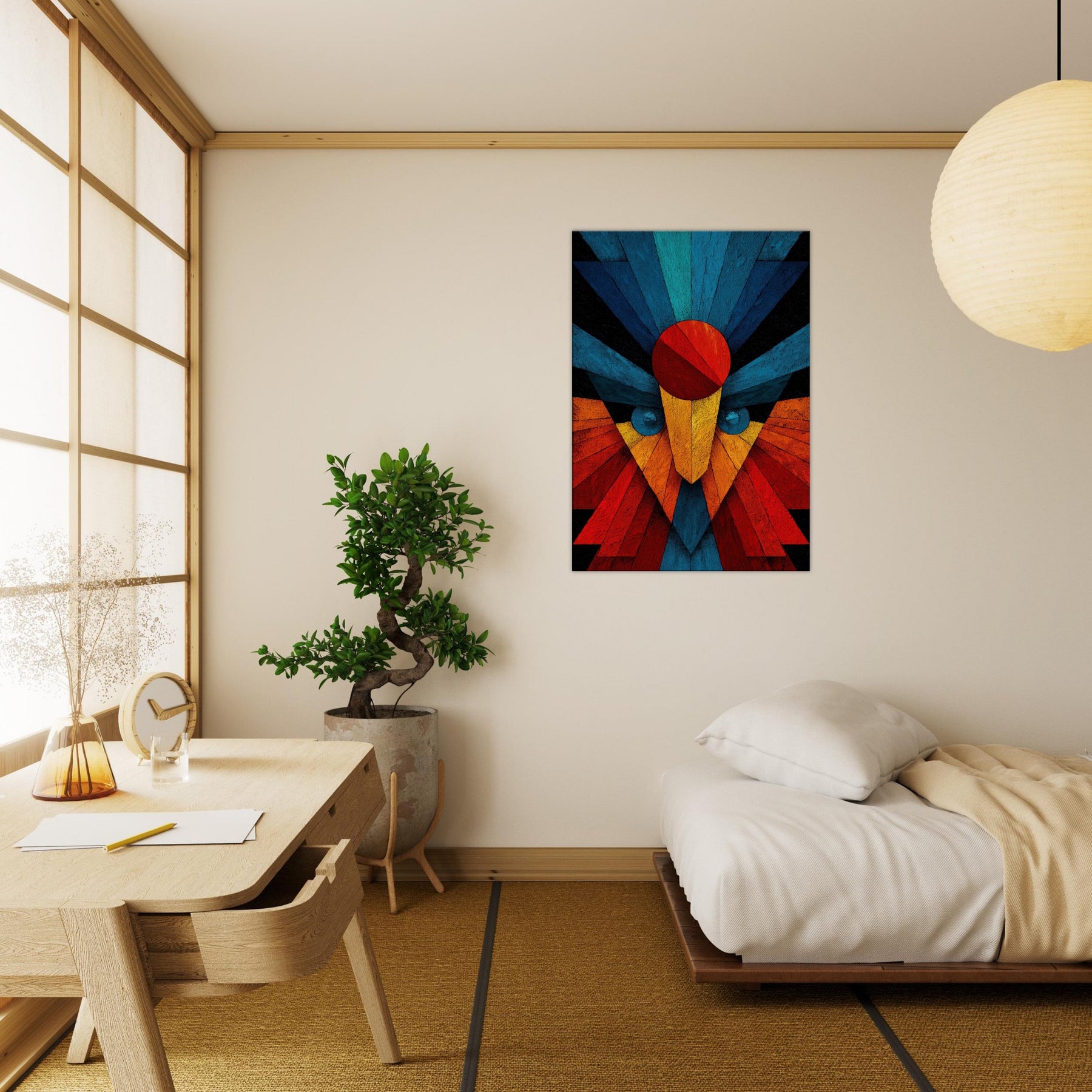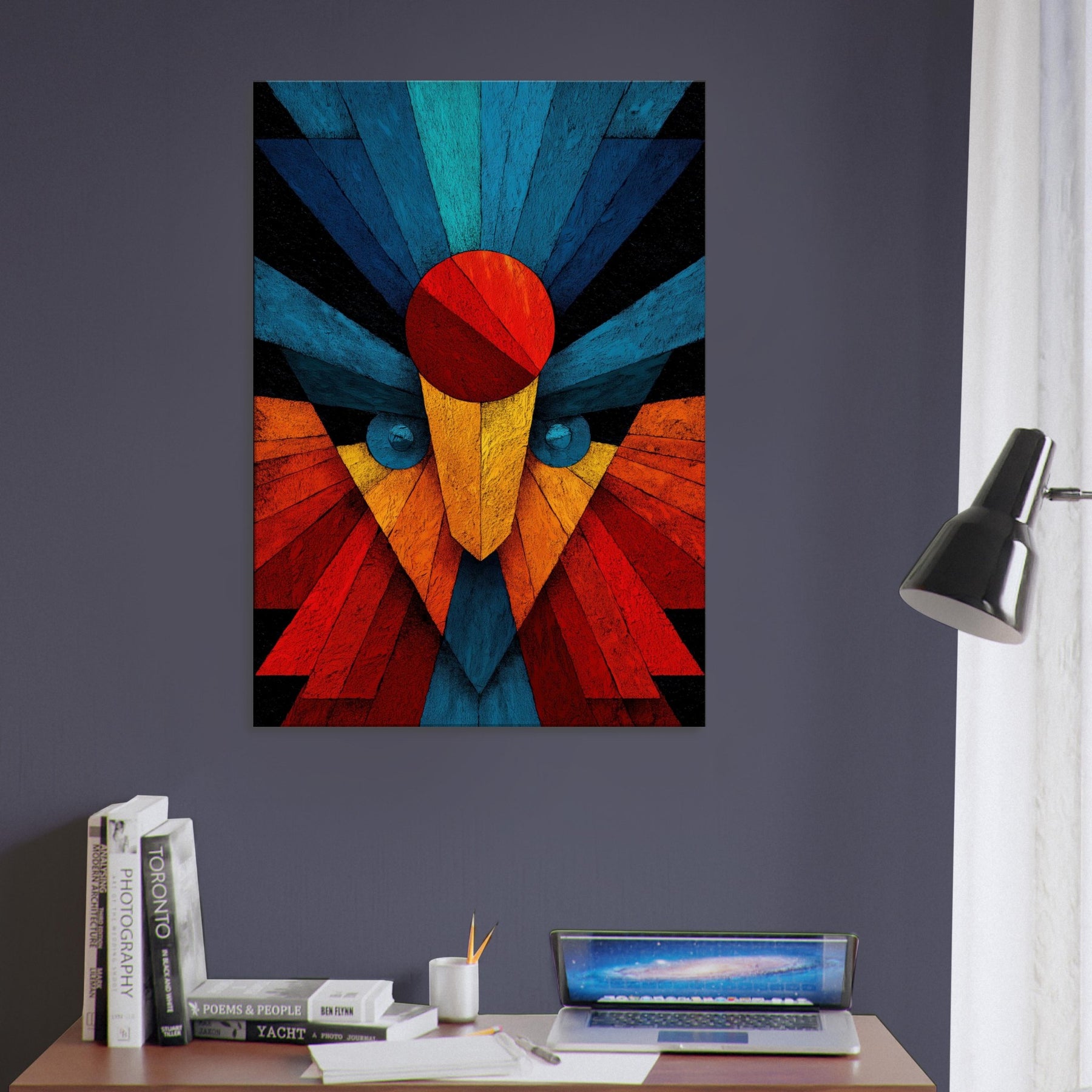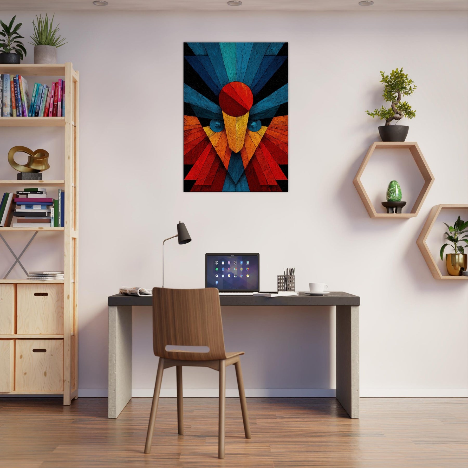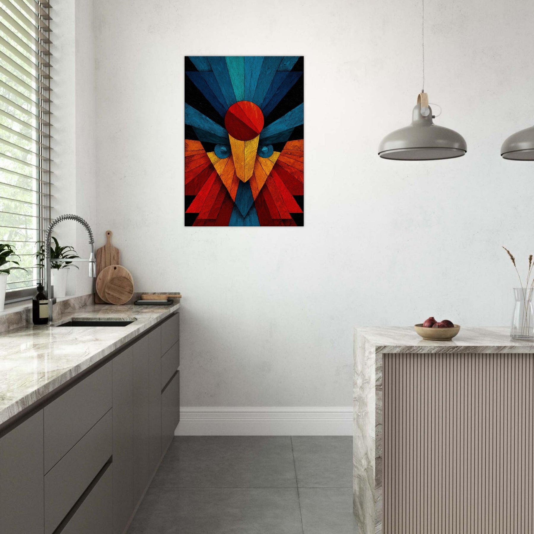Totem emerges as a radiant totemic silhouette, a ceremonial beacon cast in a blaze of stacked color. This piece folds sunrise into geometry, where warm crimsons, oranges, and golds meet cool teals and midnight blues in a hypnotic ascent. The surface texture suggests carved cedar and weathered stone, inviting touch and contemplation. In a living room or study, the presence of Totem anchors the space with mystic rhythm, turning mundane moments into quiet rituals and opening a doorway to imagination.