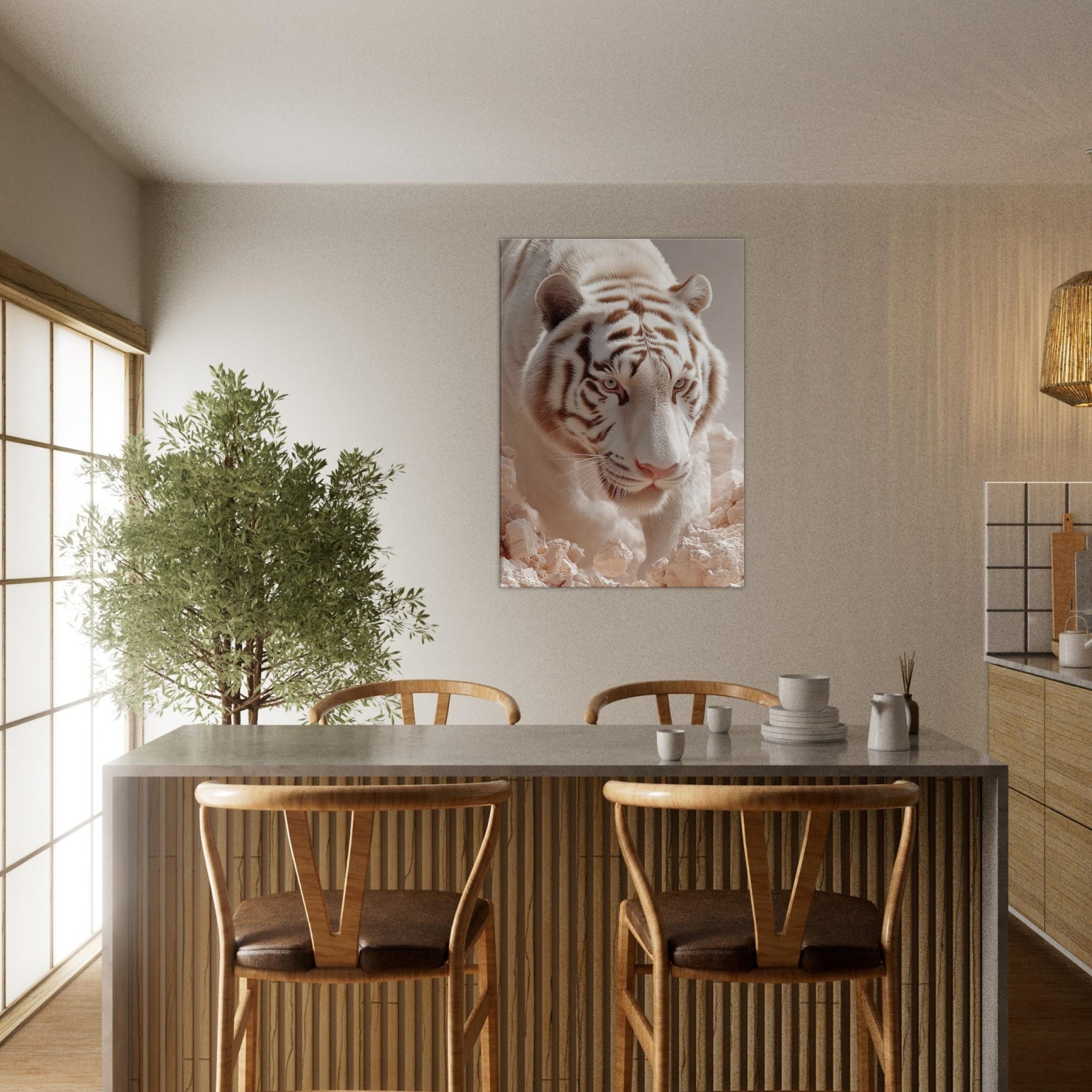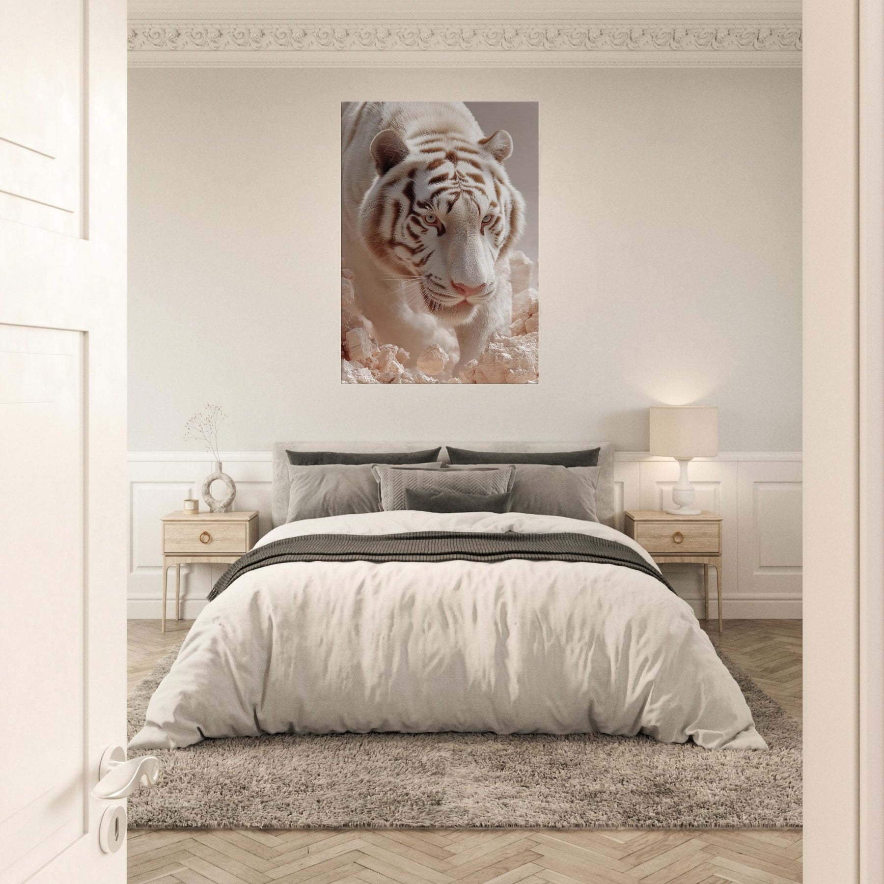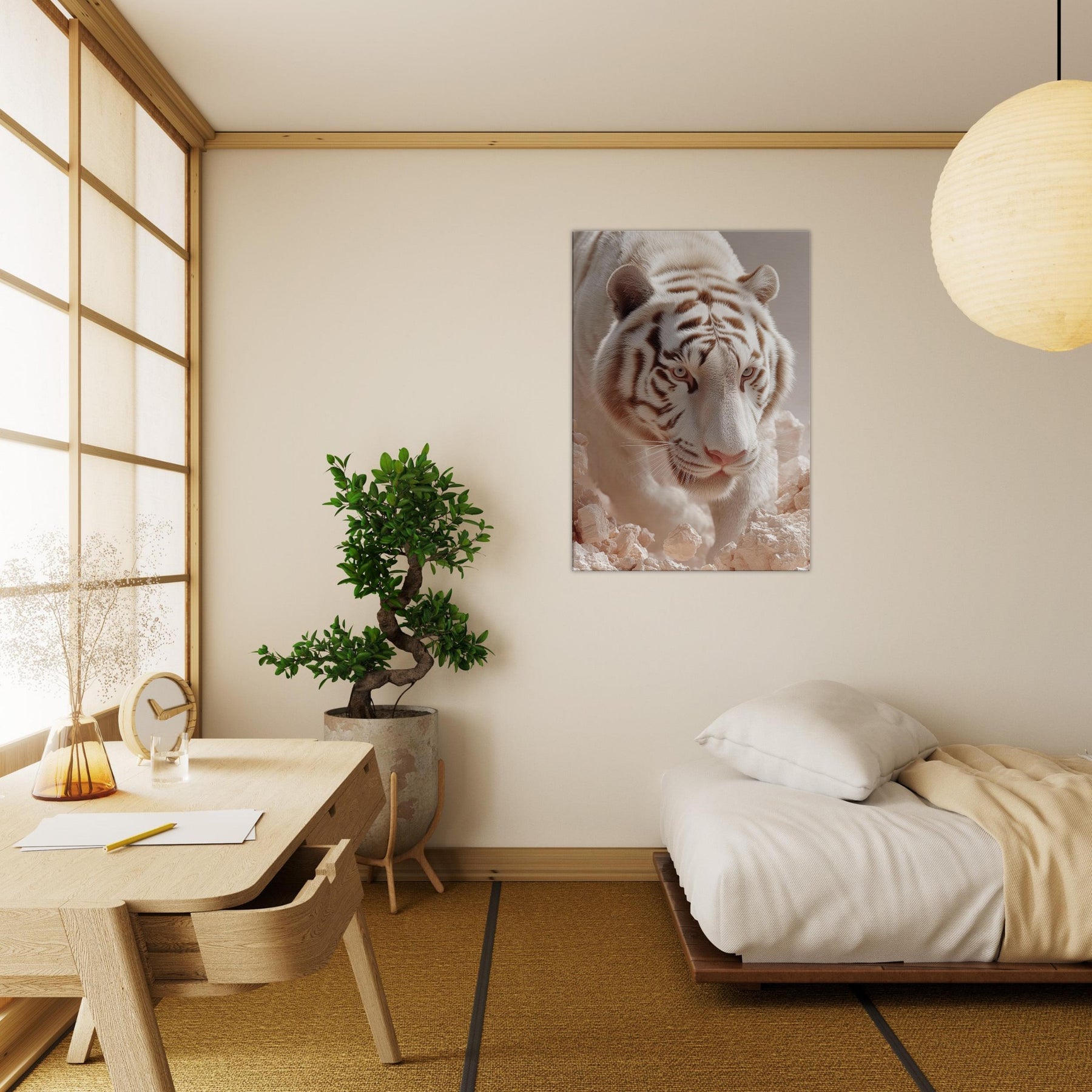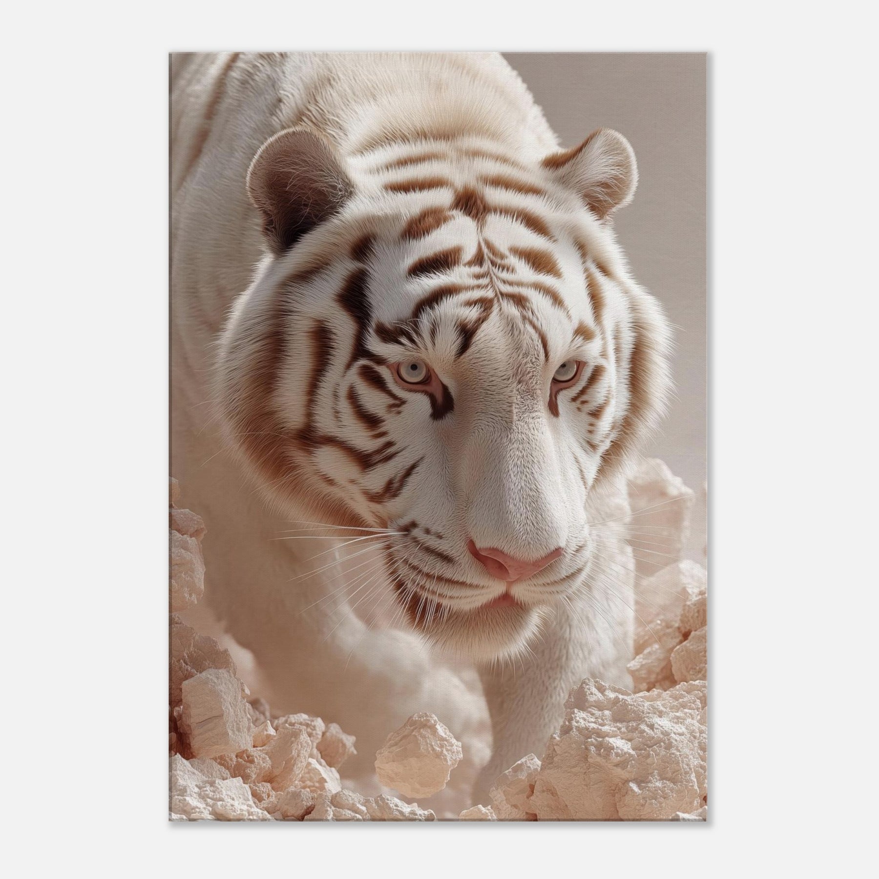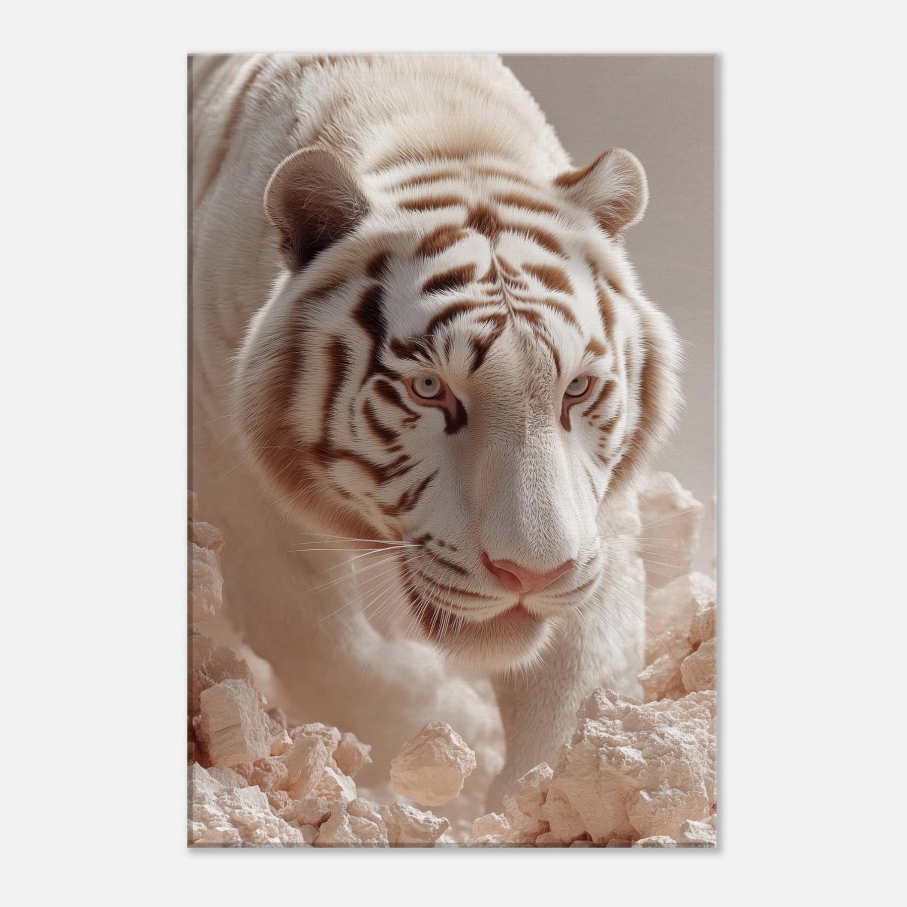 White Tiger of the West, Celestial Guardian of Chinese Mythology strides through a dreamscape where rock and light shimmer. This surreal composition blends lunar fur, haloed glow, and pale stone to evoke reverence, mystery, and quiet power. Hang it in a living room or hallway to awaken mythic calm and protective wonder, turning walls into portals for awe and everyday grace.