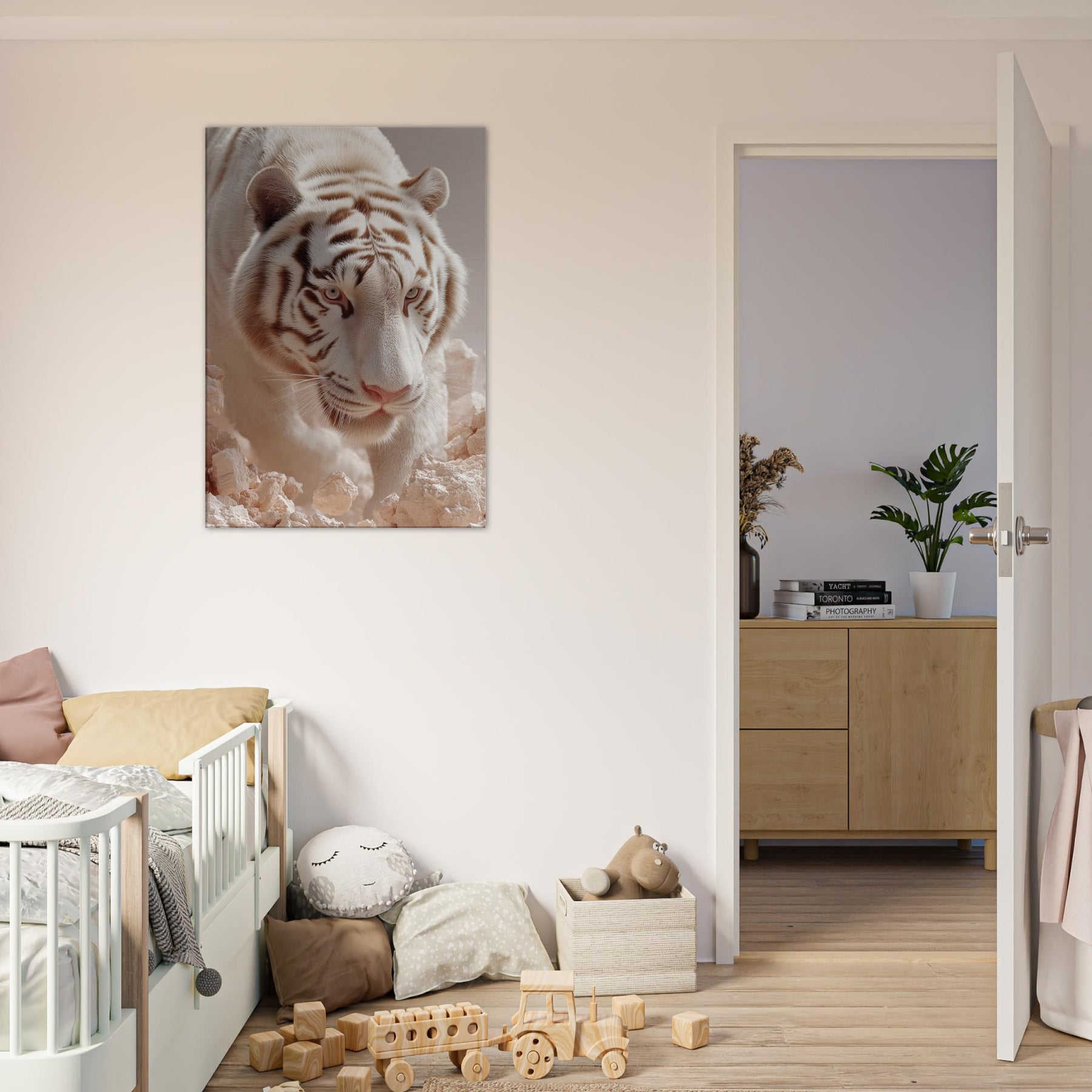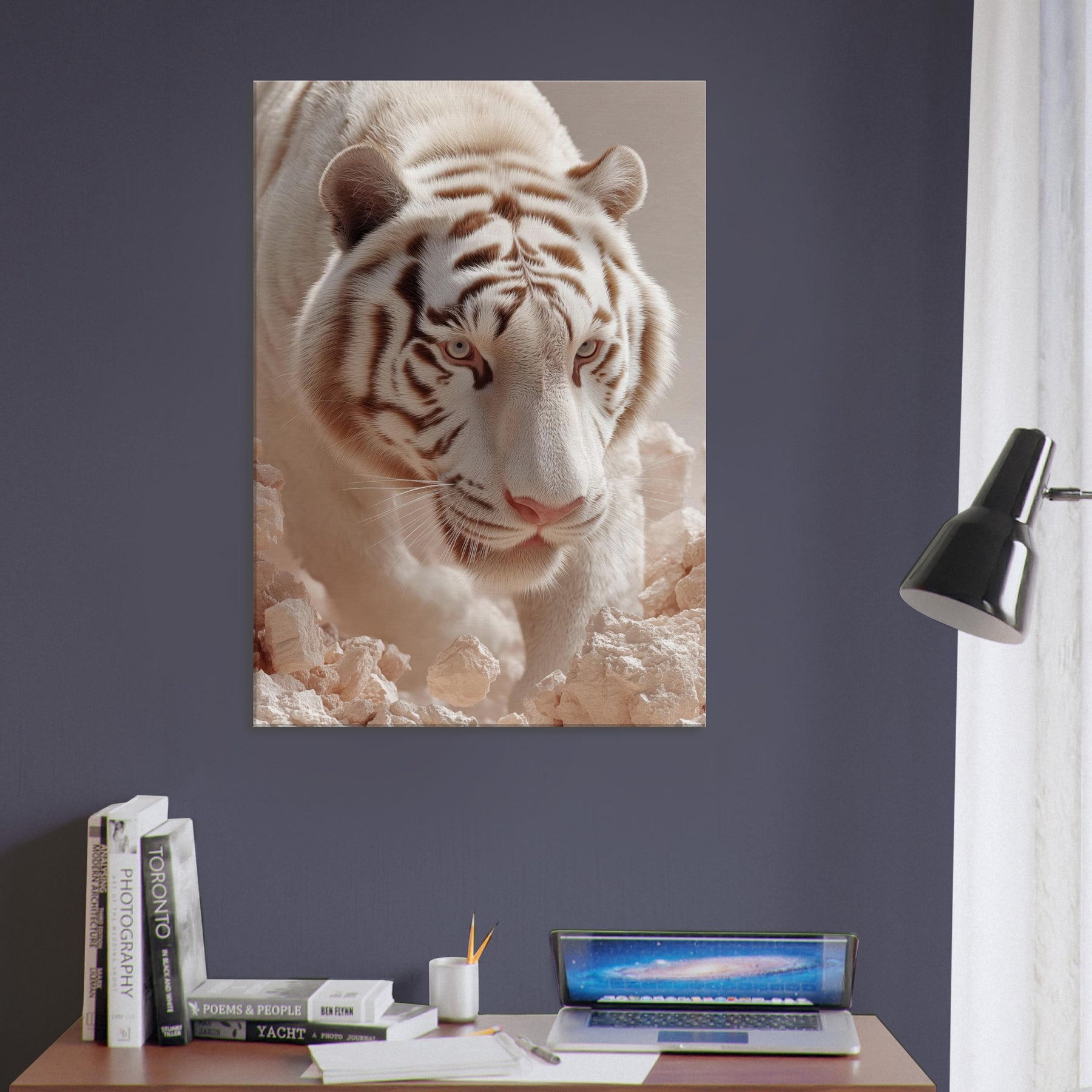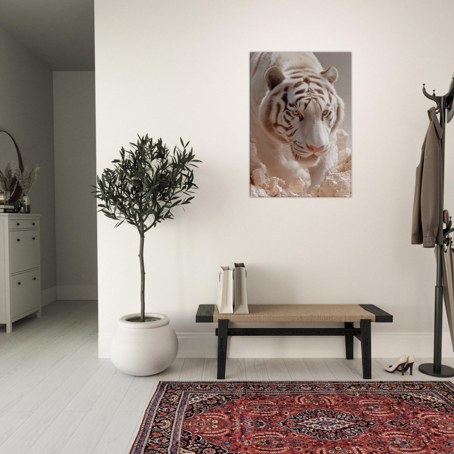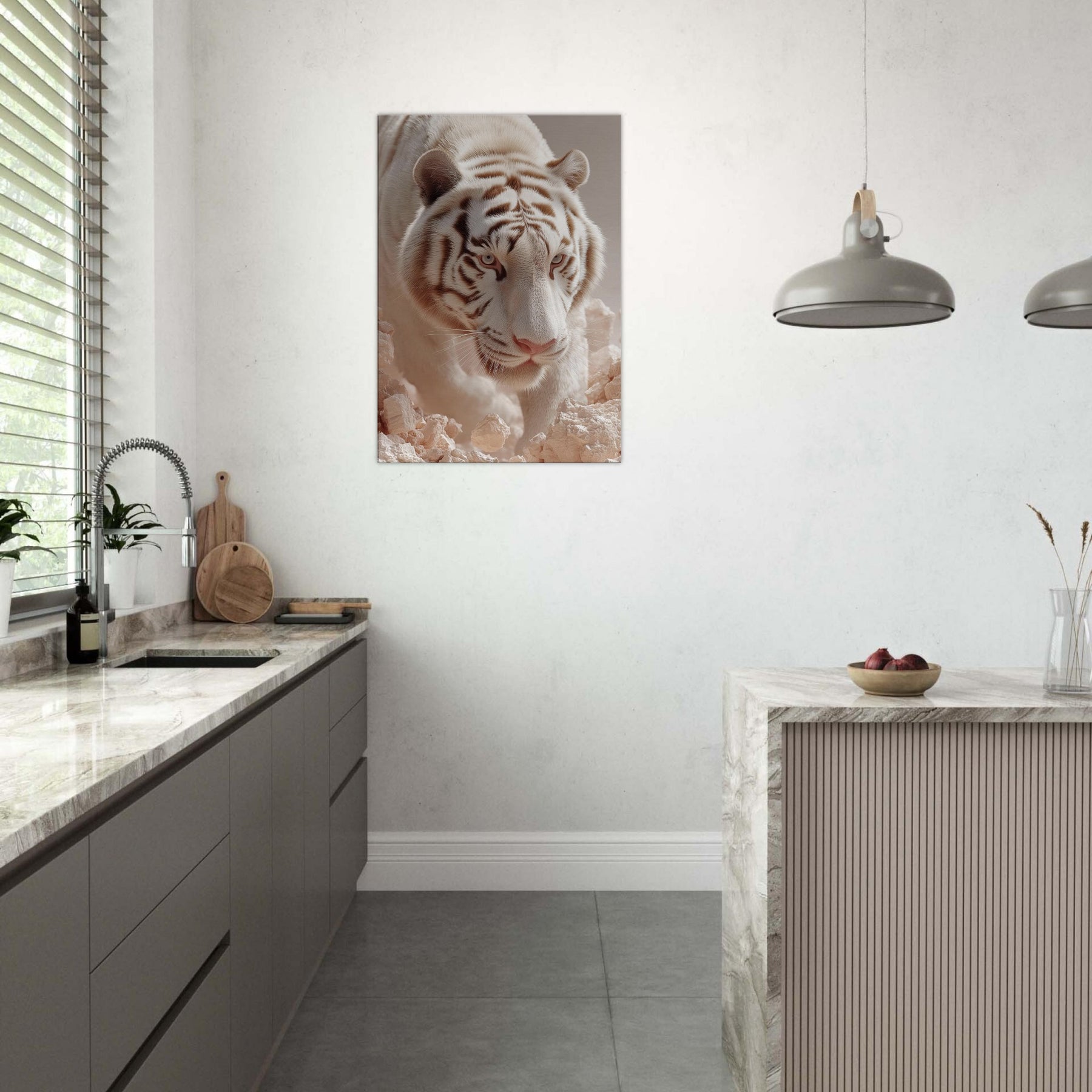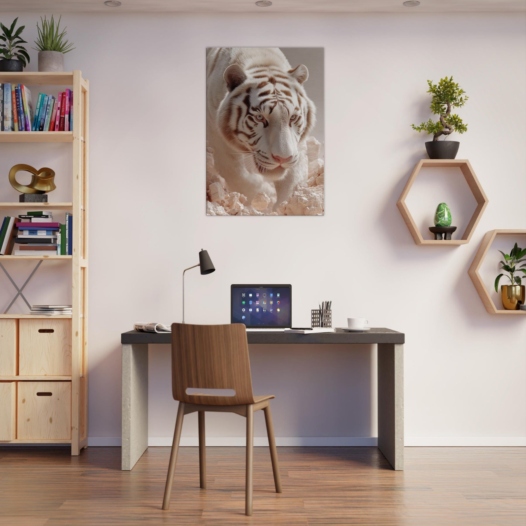 White Tiger of the West, Celestial Guardian of Chinese Mythology strides through a dreamscape where rock and light shimmer. This surreal composition blends lunar fur, haloed glow, and pale stone to evoke reverence, mystery, and quiet power. Hang it in a living room or hallway to awaken mythic calm and protective wonder, turning walls into portals for awe and everyday grace.