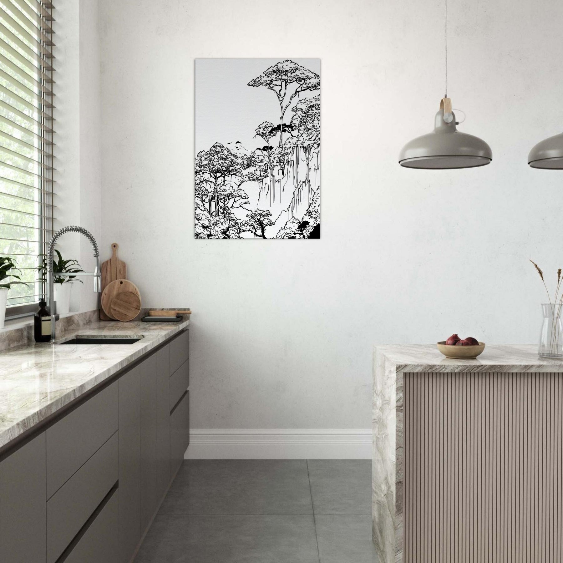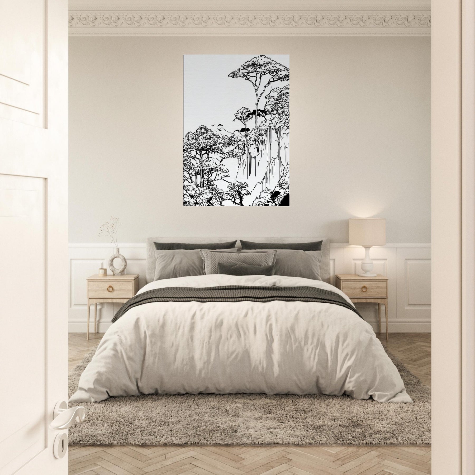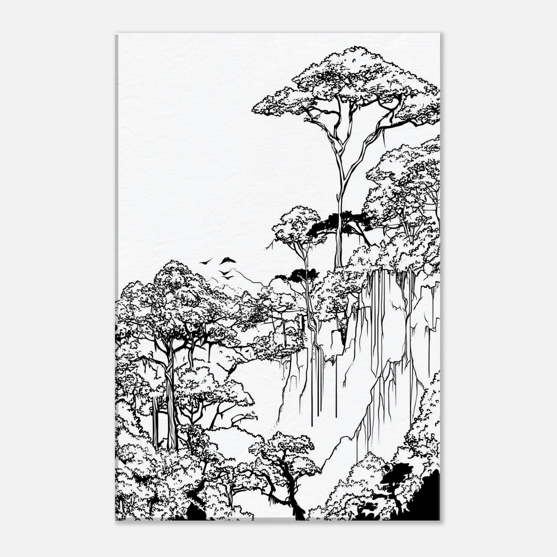 Let the Jungle unfold in clean, black line precision. This line art composition renders nature as a quiet, meditative where treetops rise like inked silhouettes above sheer cliffs. The stark contrast invites calm and focus, making a room feel larger and more luminous. Hang it where morning light or evening glow can trace the delicate curves of branches, inviting the eye to wander the wild without noise. A timeless centerpiece for living rooms, studios, and alcoves alike.