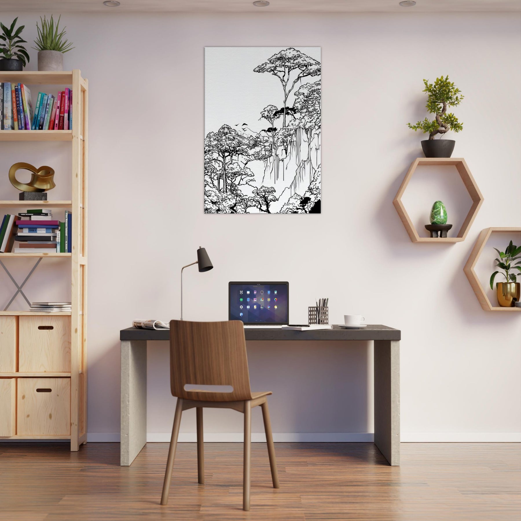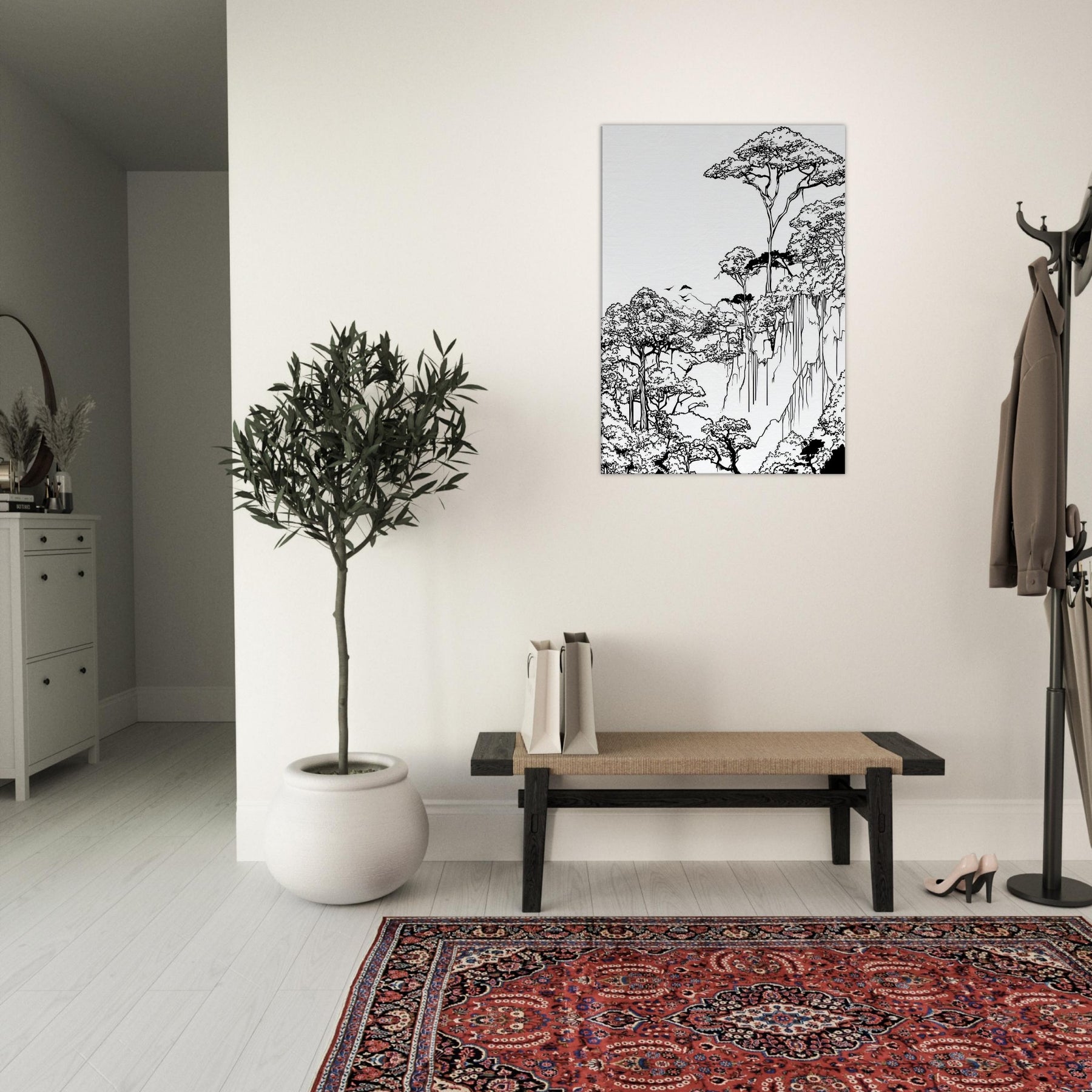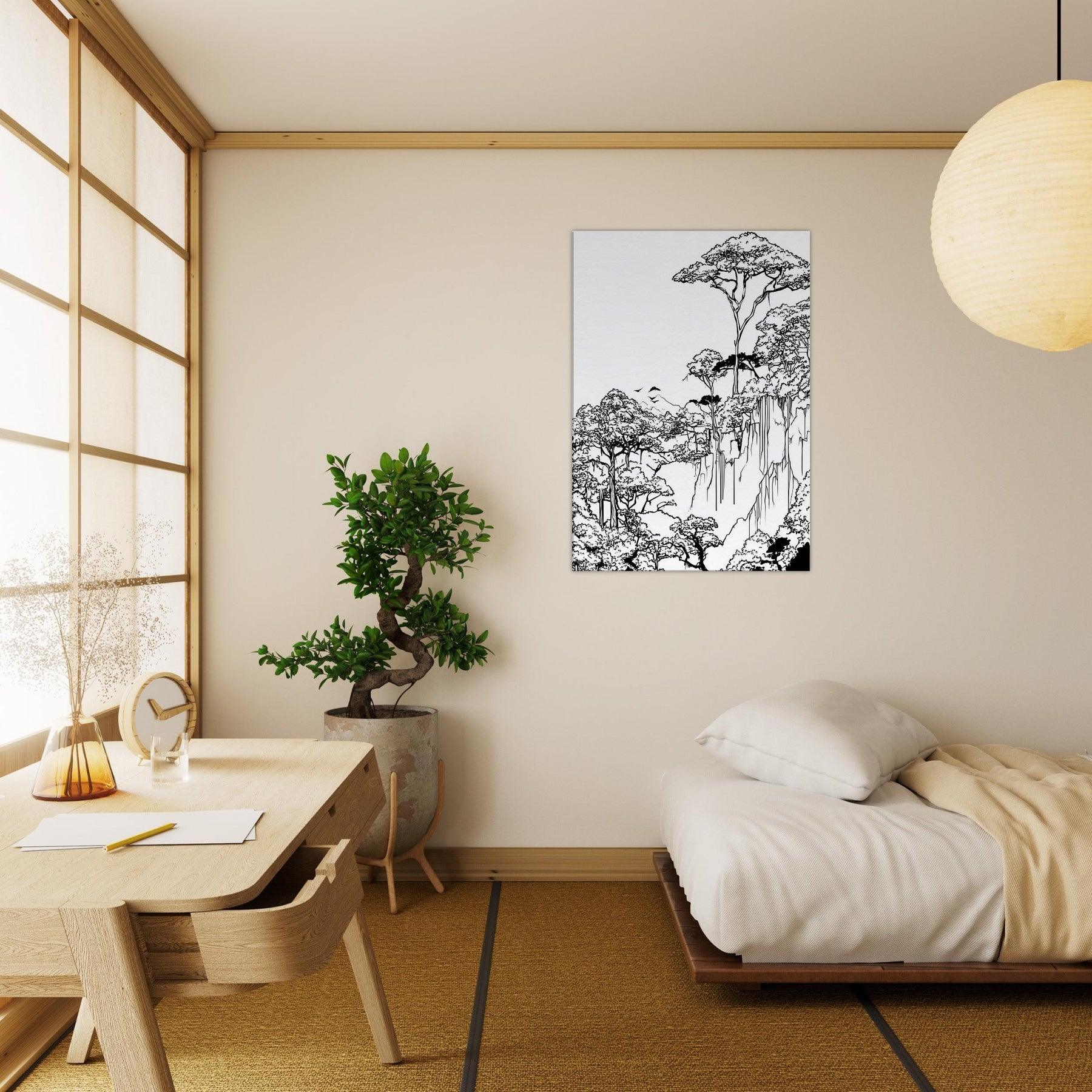 Let the Jungle unfold in clean, black line precision. This line art composition renders nature as a quiet, meditative where treetops rise like inked silhouettes above sheer cliffs. The stark contrast invites calm and focus, making a room feel larger and more luminous. Hang it where morning light or evening glow can trace the delicate curves of branches, inviting the eye to wander the wild without noise. A timeless centerpiece for living rooms, studios, and alcoves alike.