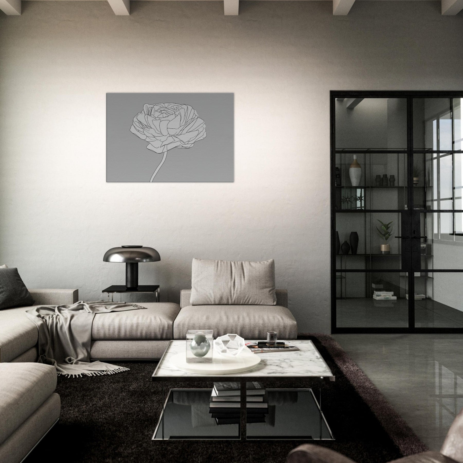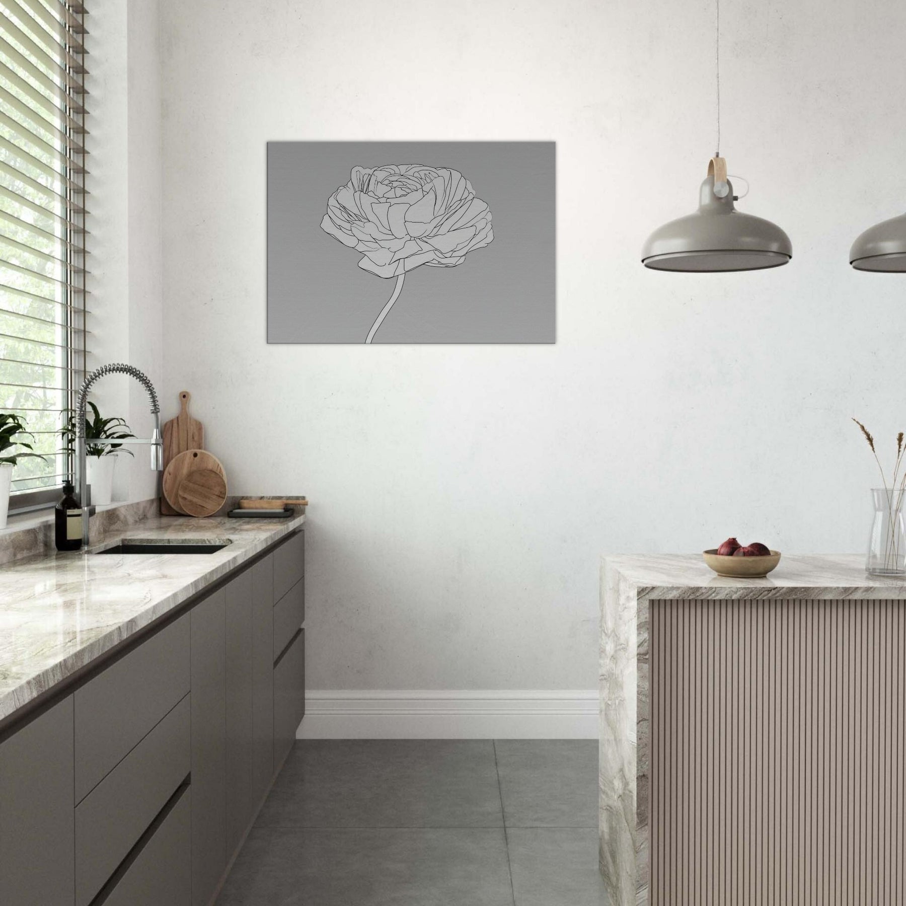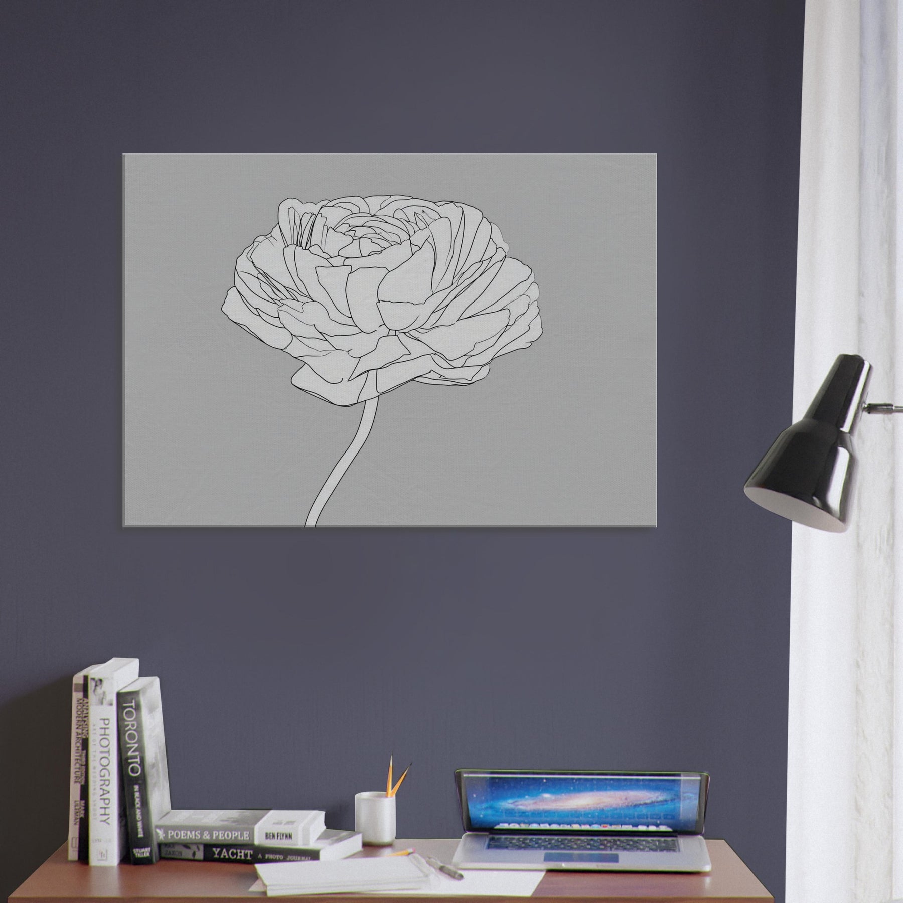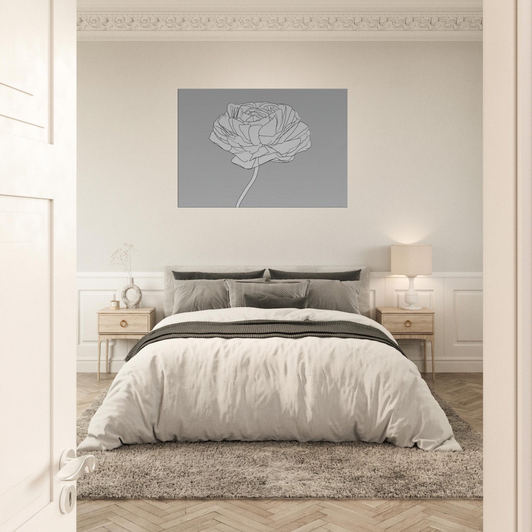 Let your walls breathe with a line drawing that captures the quiet grace of the Ranunculus. This elegant study of petals unfolds in clean, continuous contours, inviting soft light and calm into any room. The restrained palette and airy composition turn the subject into a meditative focal point, pairing beautifully with both modern neutrals and warm textures. A single Ranunculus, rendered in precise line, becomes a timeless motif for bedrooms, living rooms, or hallways an artful reminder of nature's delicate balance.