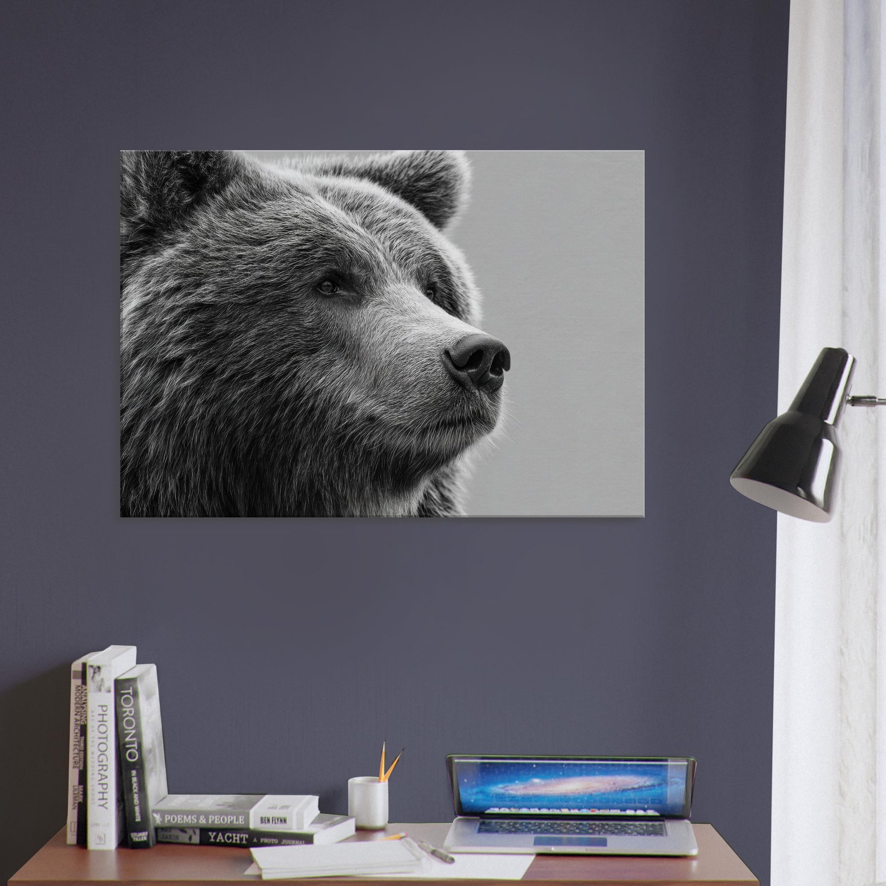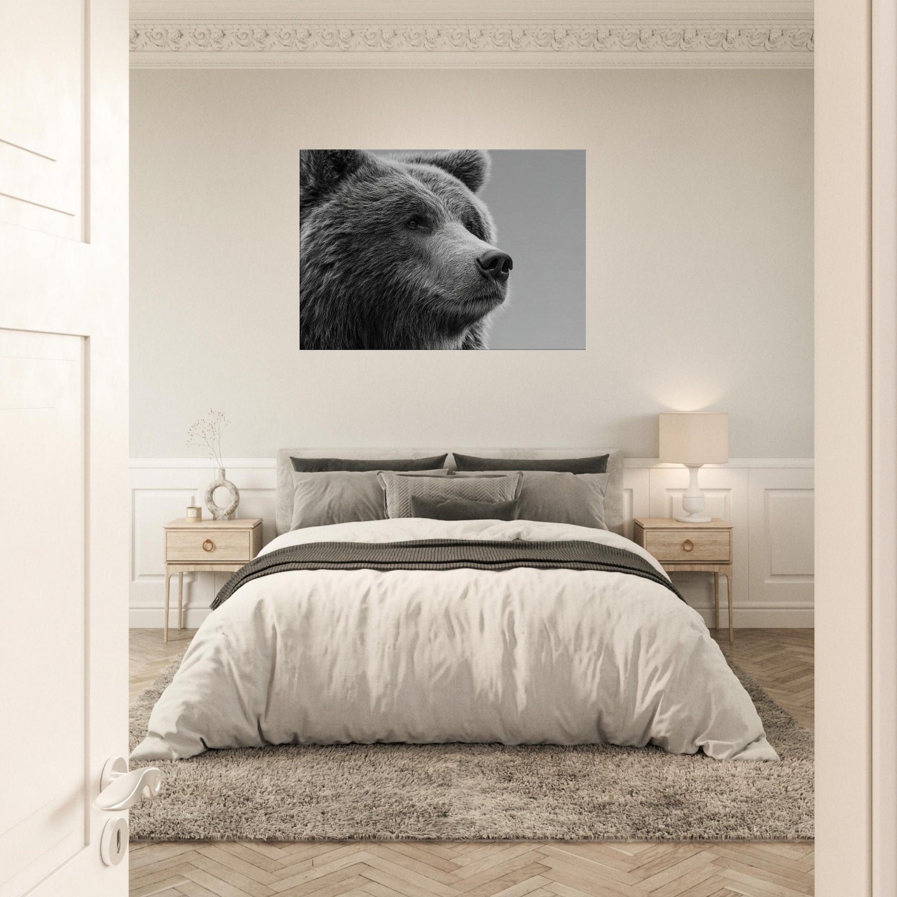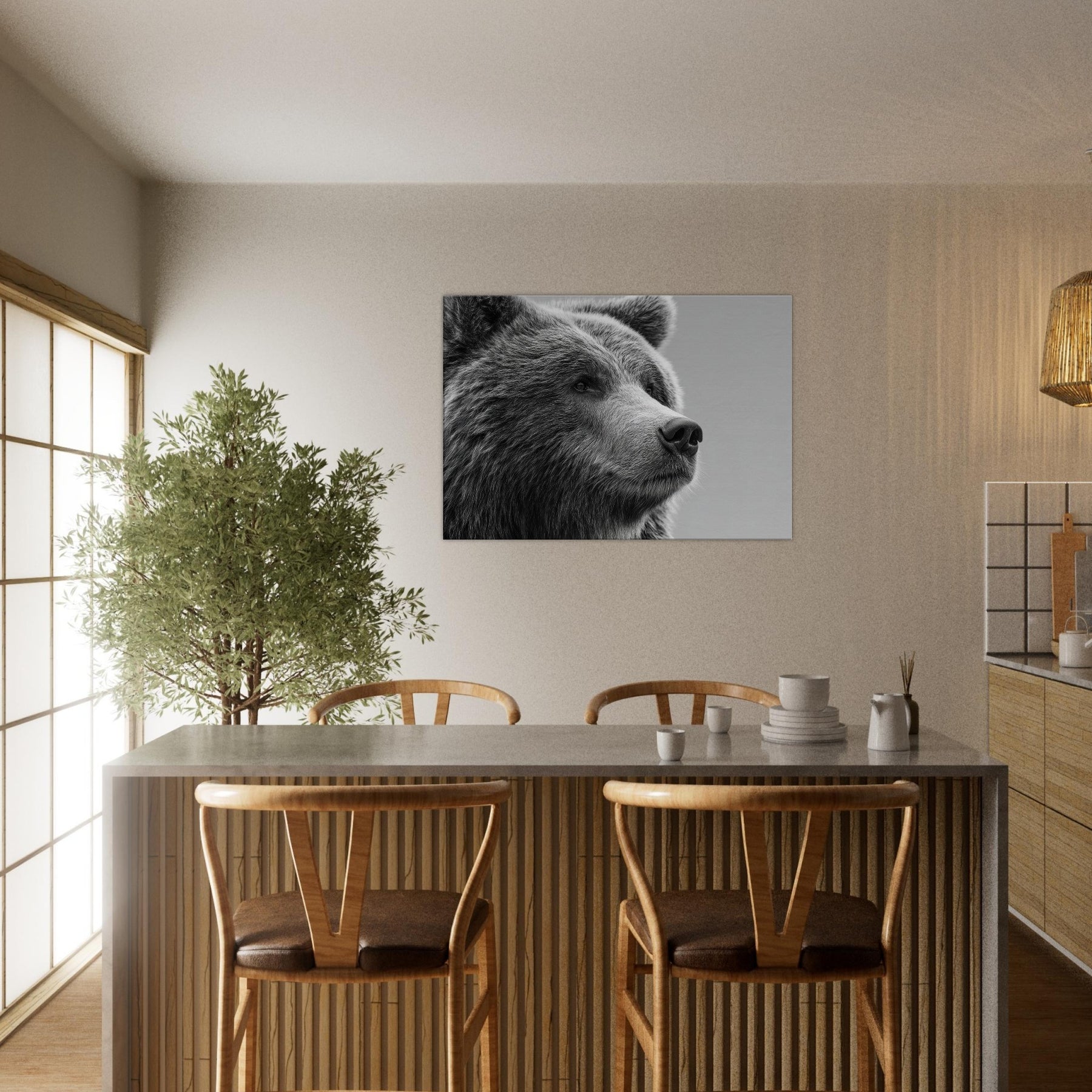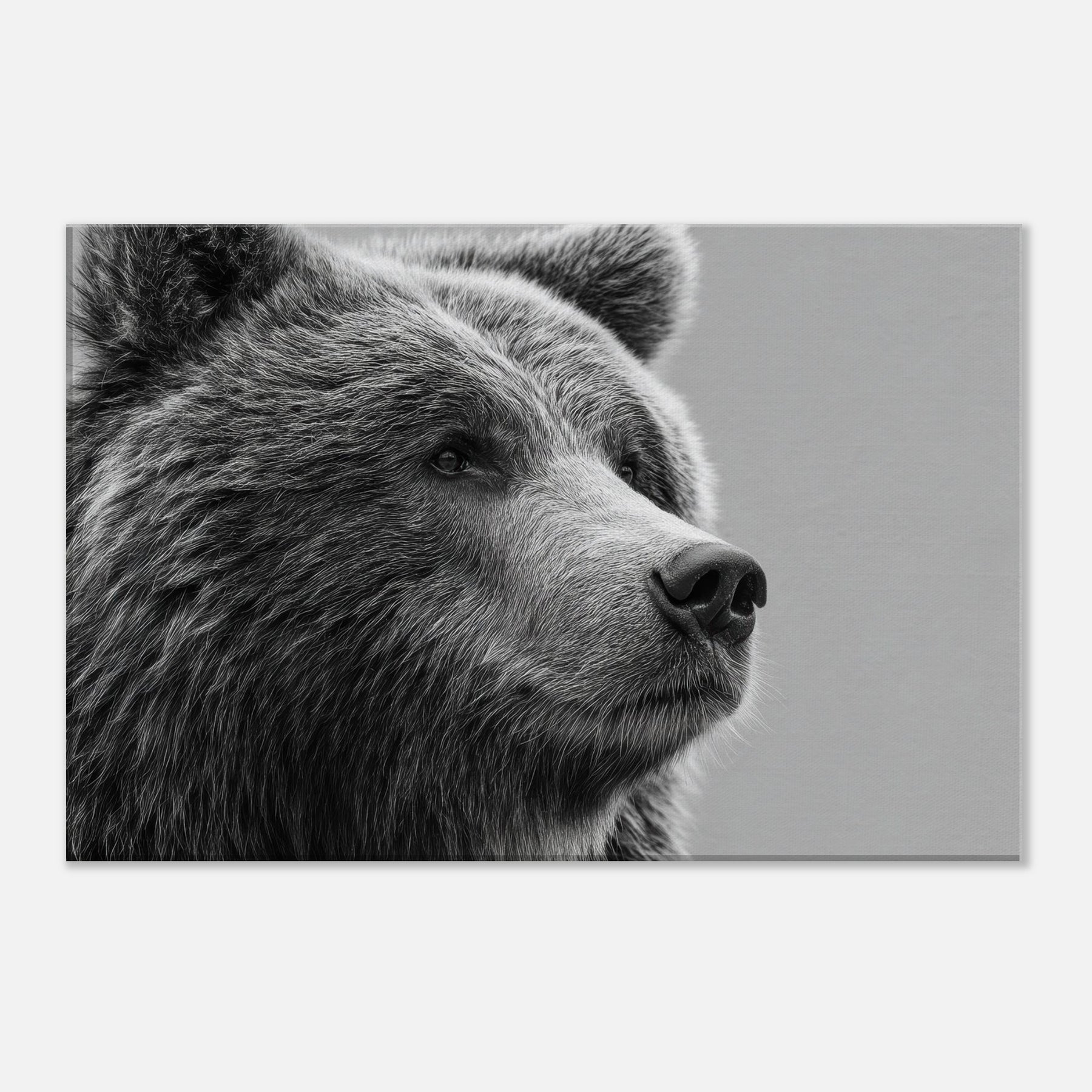 Rendered in stark black and white, this bear gathers stillness and presence in equal measure. The soft fur texture and the quiet, thoughtful gaze invite your room to slow down, while the high contrast lines carve a sculptural rhythm across the wall. Perfect for a living room or study, it pairs with warm wood or cool metals to create a refined, contemporary mood. Let the bear become a sentinel of calm, grounding conversations and adding timeless elegance to your space.