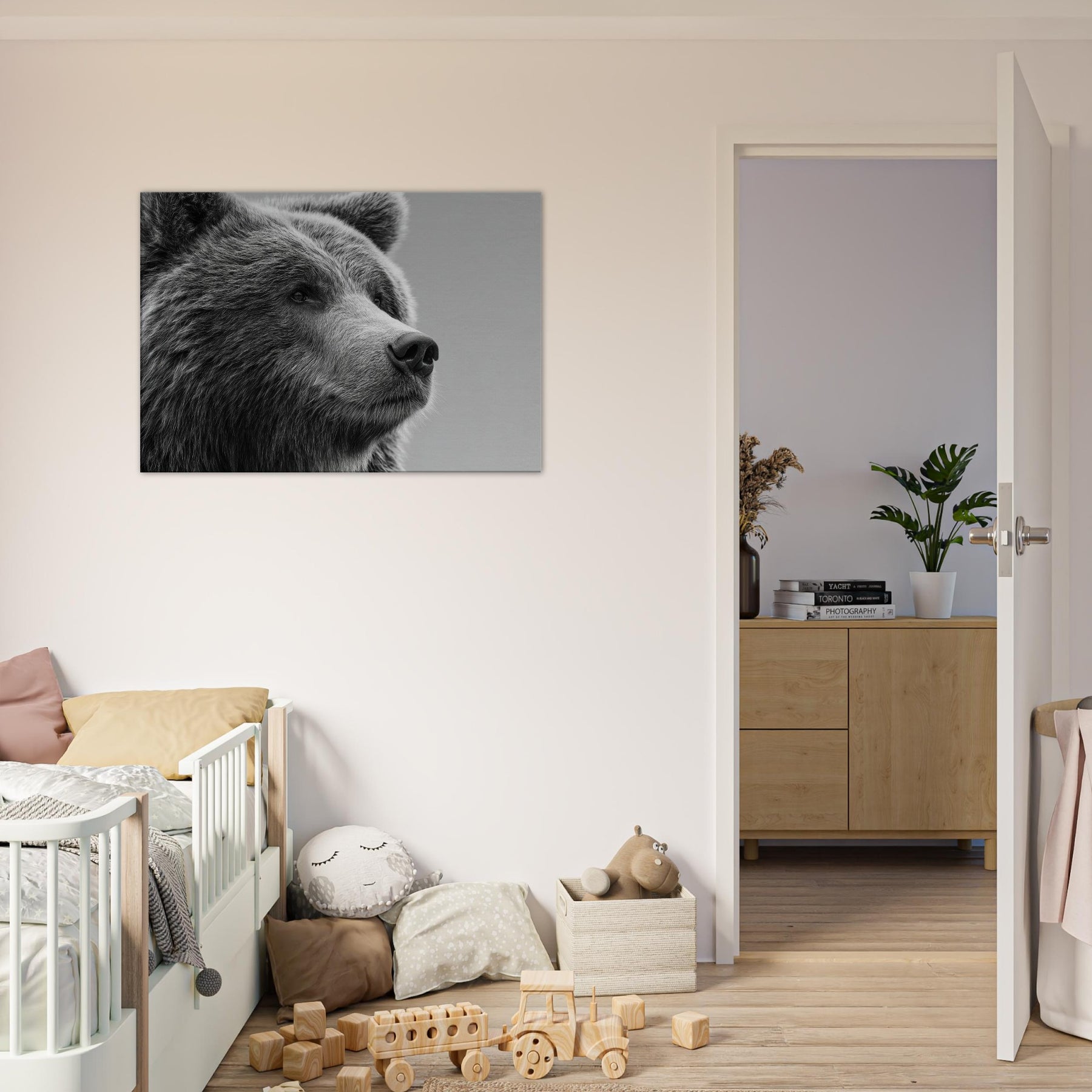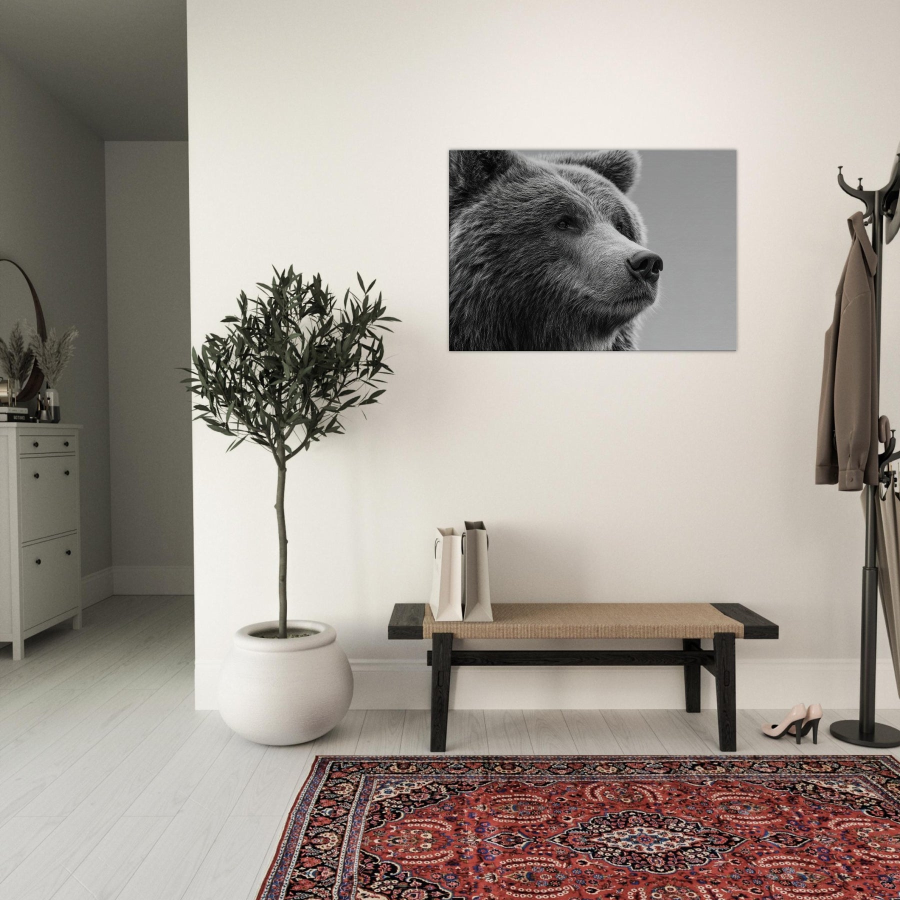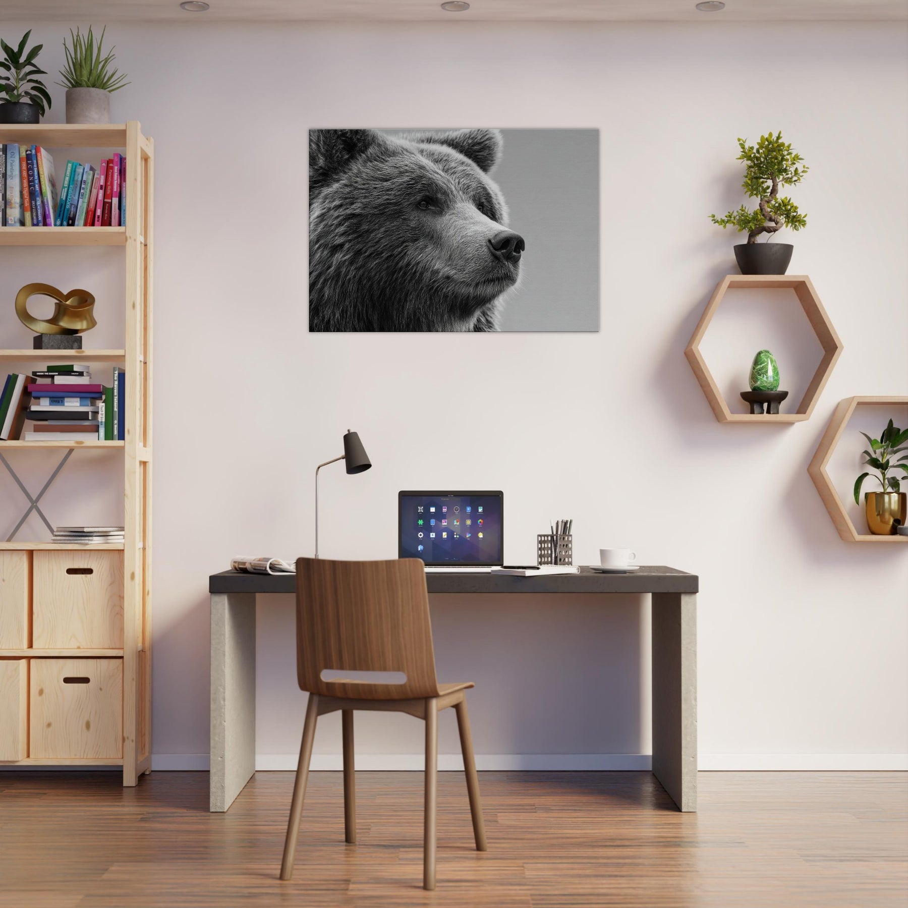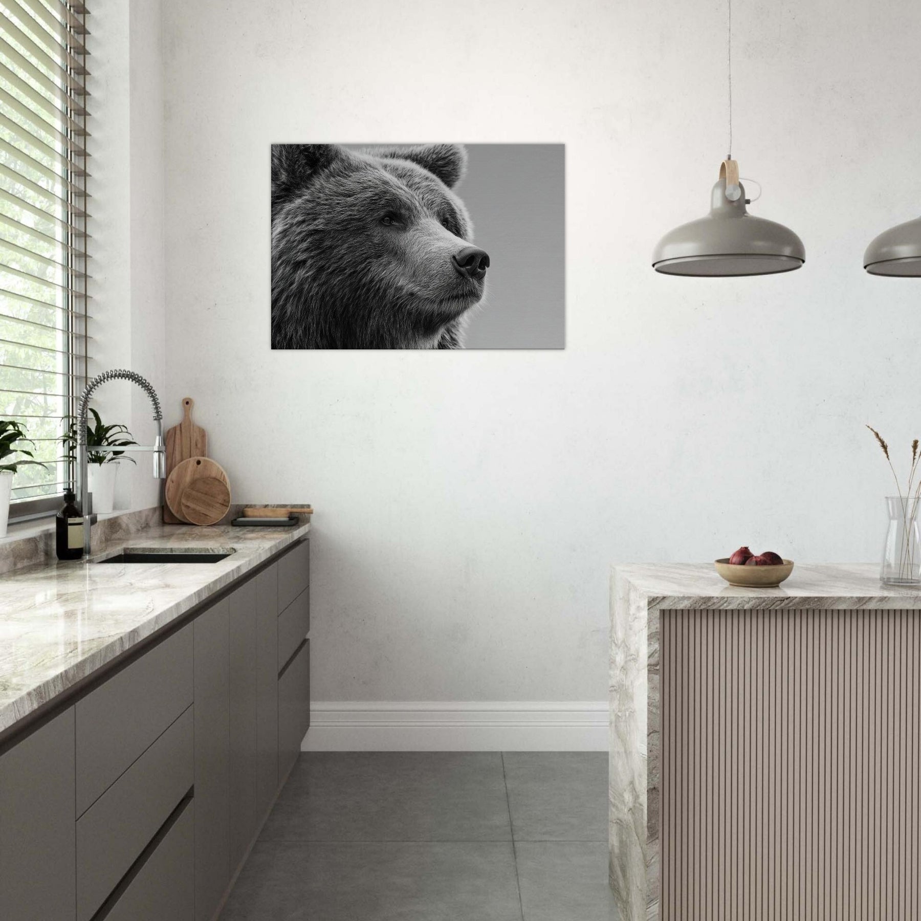 Rendered in stark black and white, this bear gathers stillness and presence in equal measure. The soft fur texture and the quiet, thoughtful gaze invite your room to slow down, while the high contrast lines carve a sculptural rhythm across the wall. Perfect for a living room or study, it pairs with warm wood or cool metals to create a refined, contemporary mood. Let the bear become a sentinel of calm, grounding conversations and adding timeless elegance to your space.