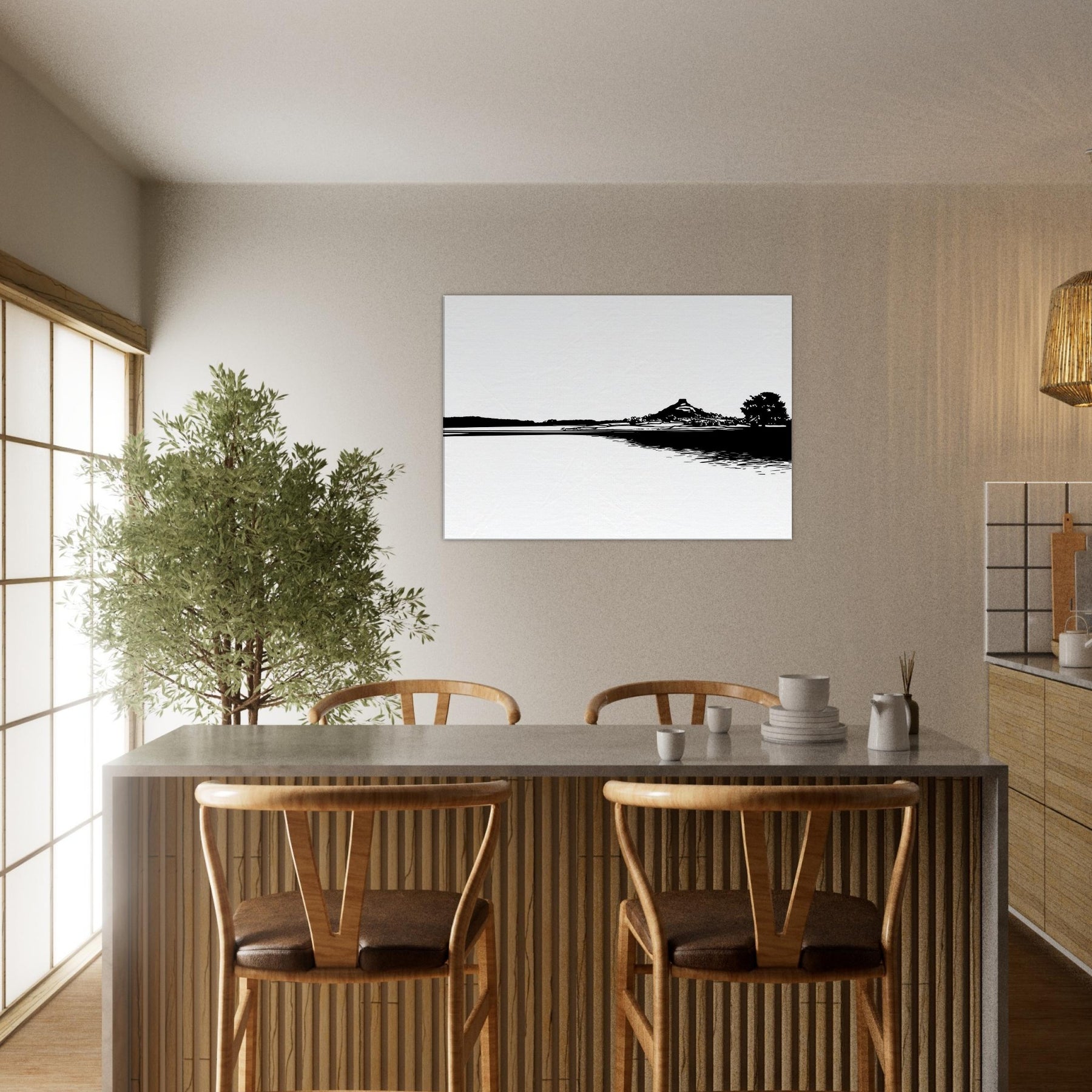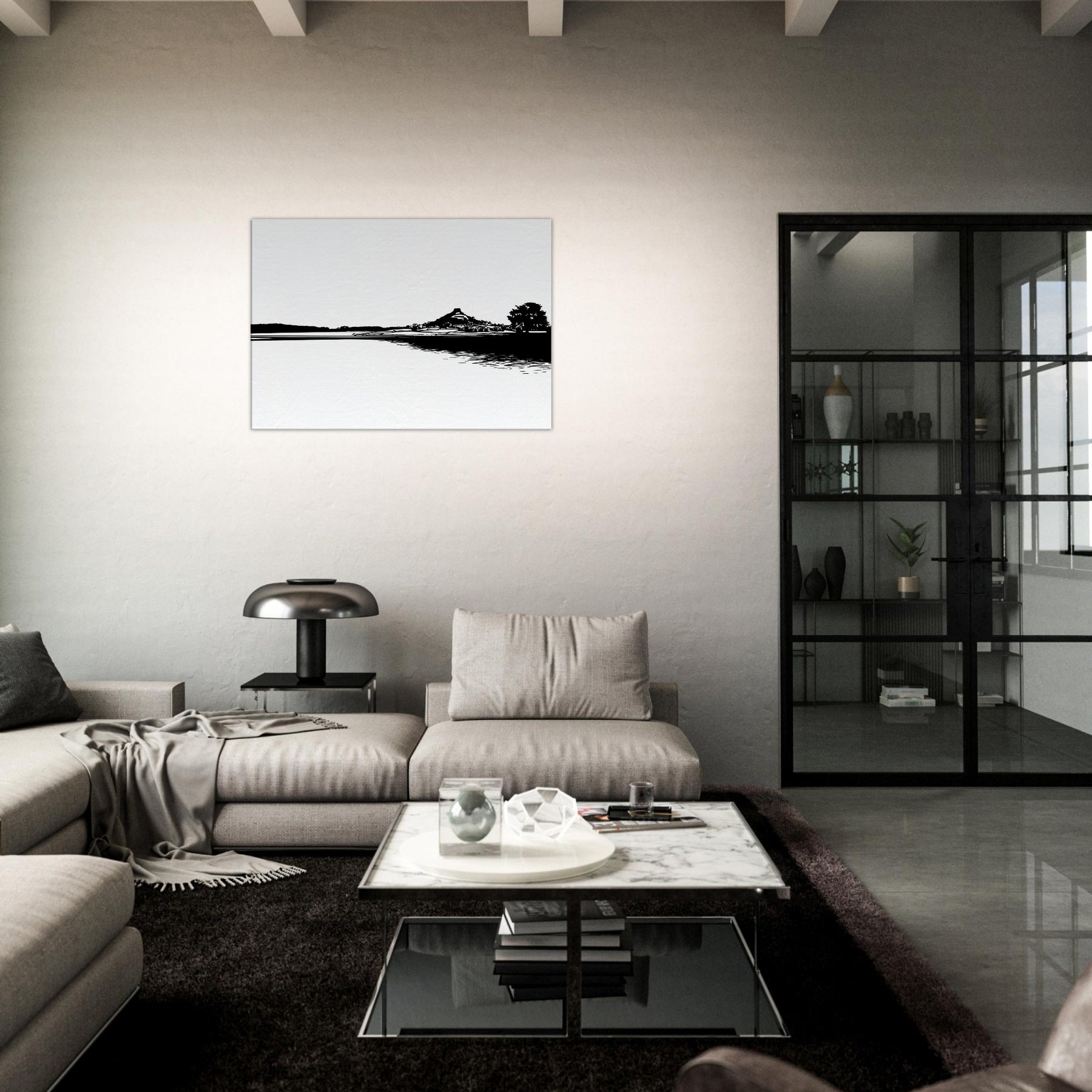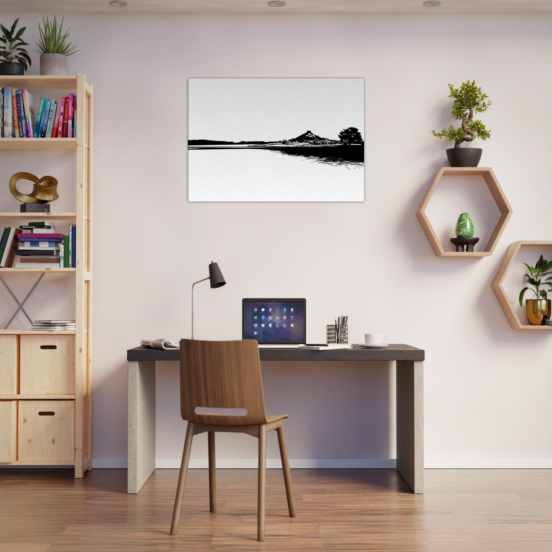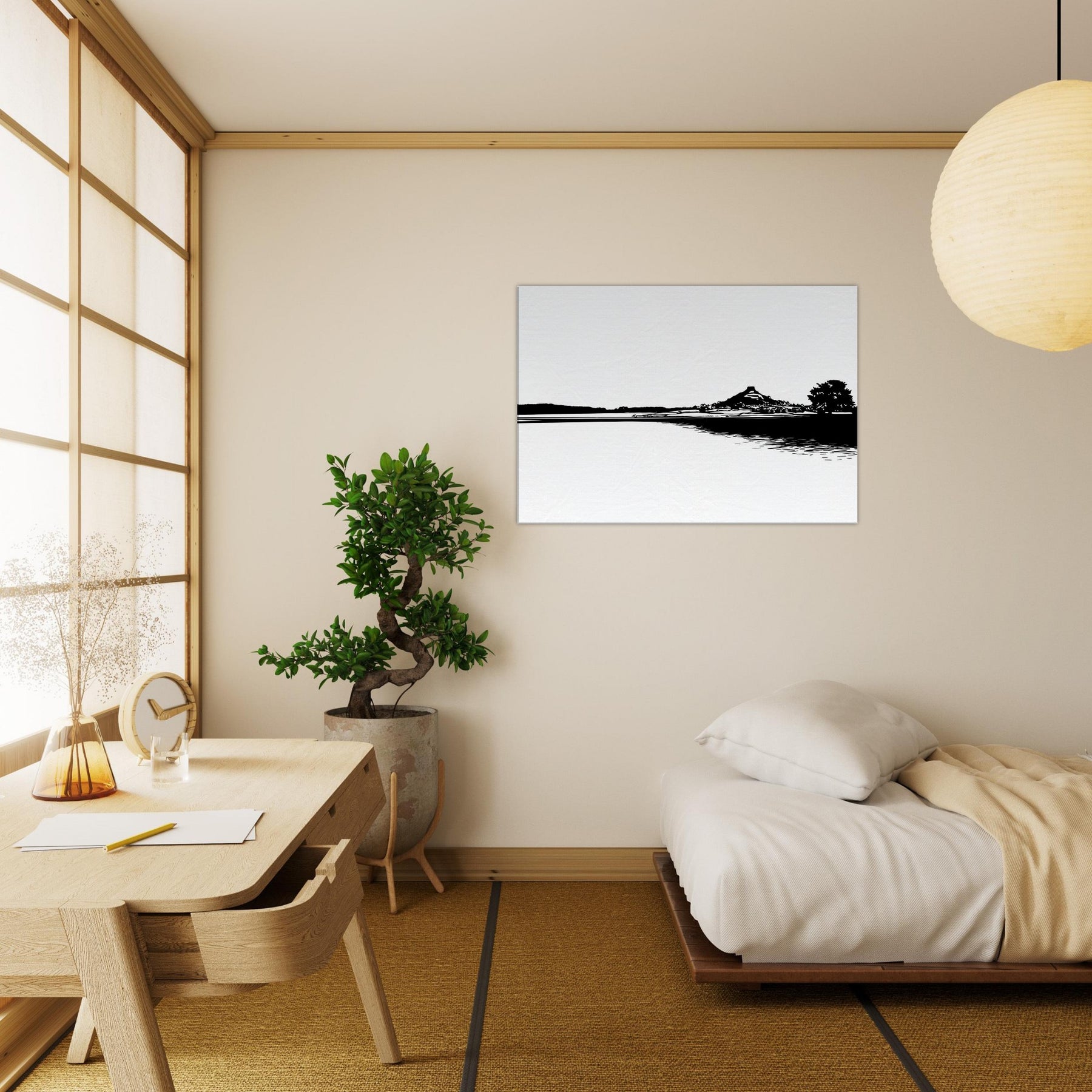 Immerse your space in the quiet geometry of a lakeside scene drawn in stark, elegant lines. This Lake line art captures the stillness of dawn, where the shore folds into water and horizon, inviting calm reflection. Perfect for modern living rooms and bedrooms, its black and white simplicity pairs with warm wood tones and soft textiles, turning everyday moments into a gentle ritual. Let the lake breathe at the center of your space, a graceful focal point that quiets the room and awakens imagination.