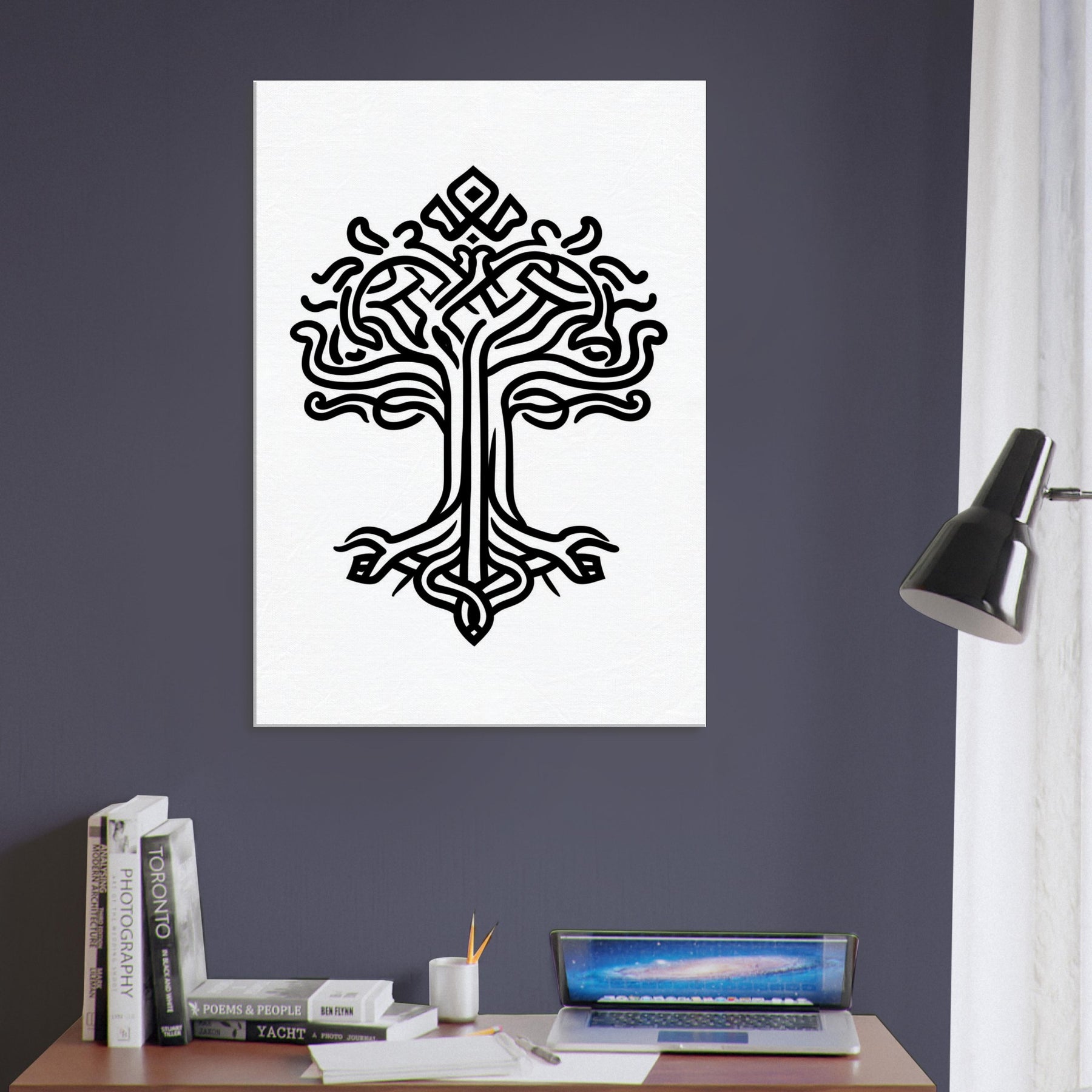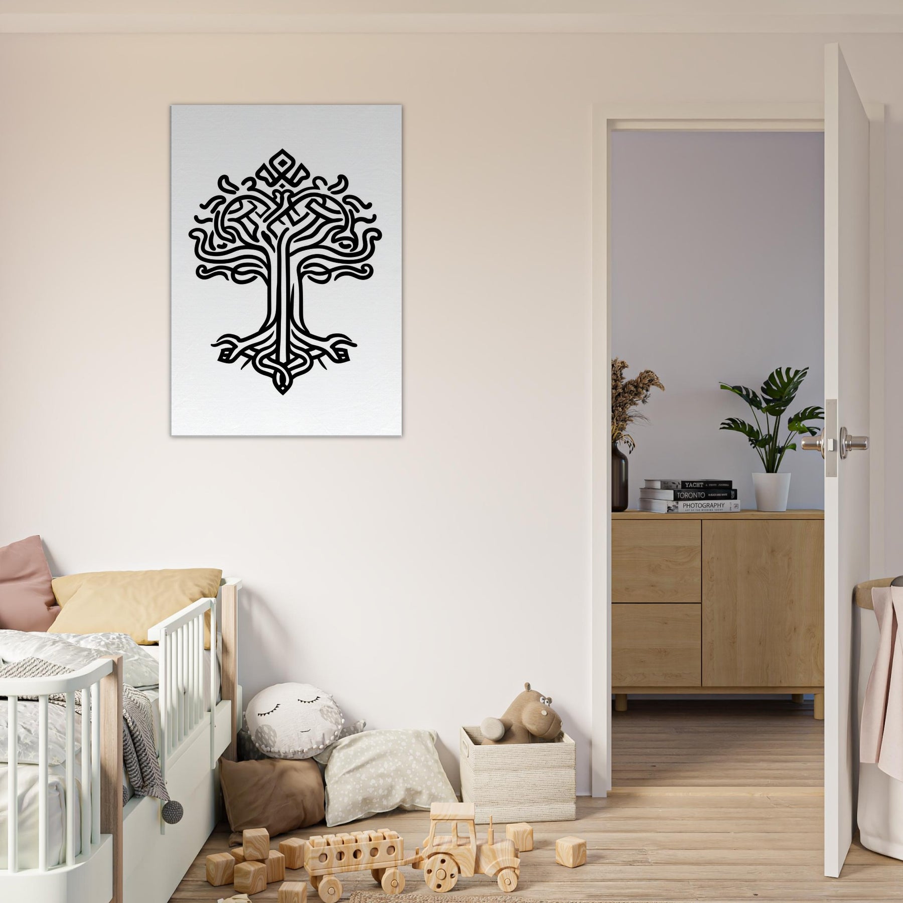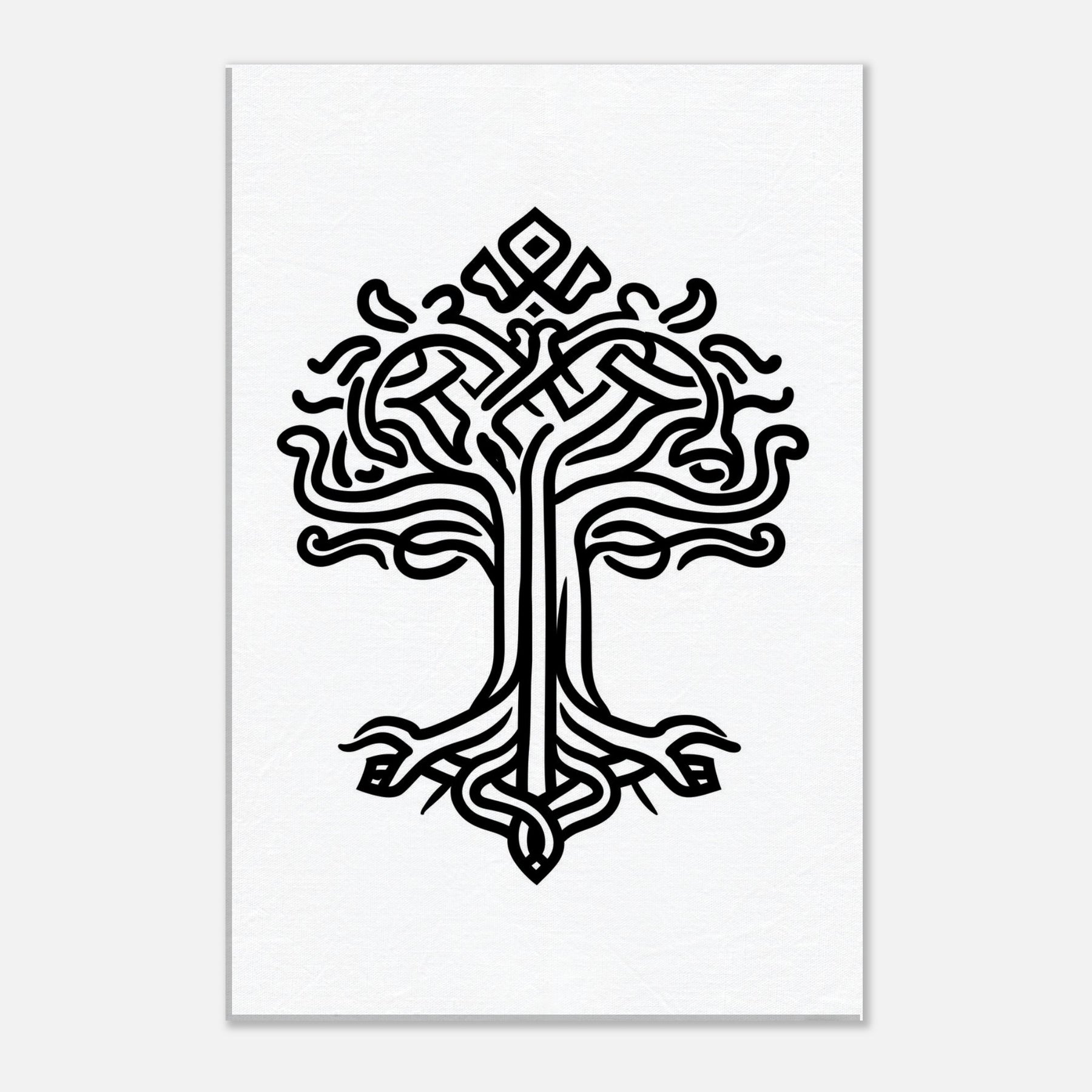 Yggdrasil unfurls in a single sinuous line, its branches weaving like wind worn runes above a rooted heart. This mystical World Tree, captured in clean line work, breathes quiet power into a room, guiding light to skim the walls and cast soft shadows. The contrast of black on white lends a timeless, sacred feel, making it a contemplative focal point in a living room, bedroom, or entryway. Gazing upon it, Yggdrasil becomes a gentle ritual memory, protection, and wonder threading through everyday life. The central subject is Yggdrasil (World Tree).