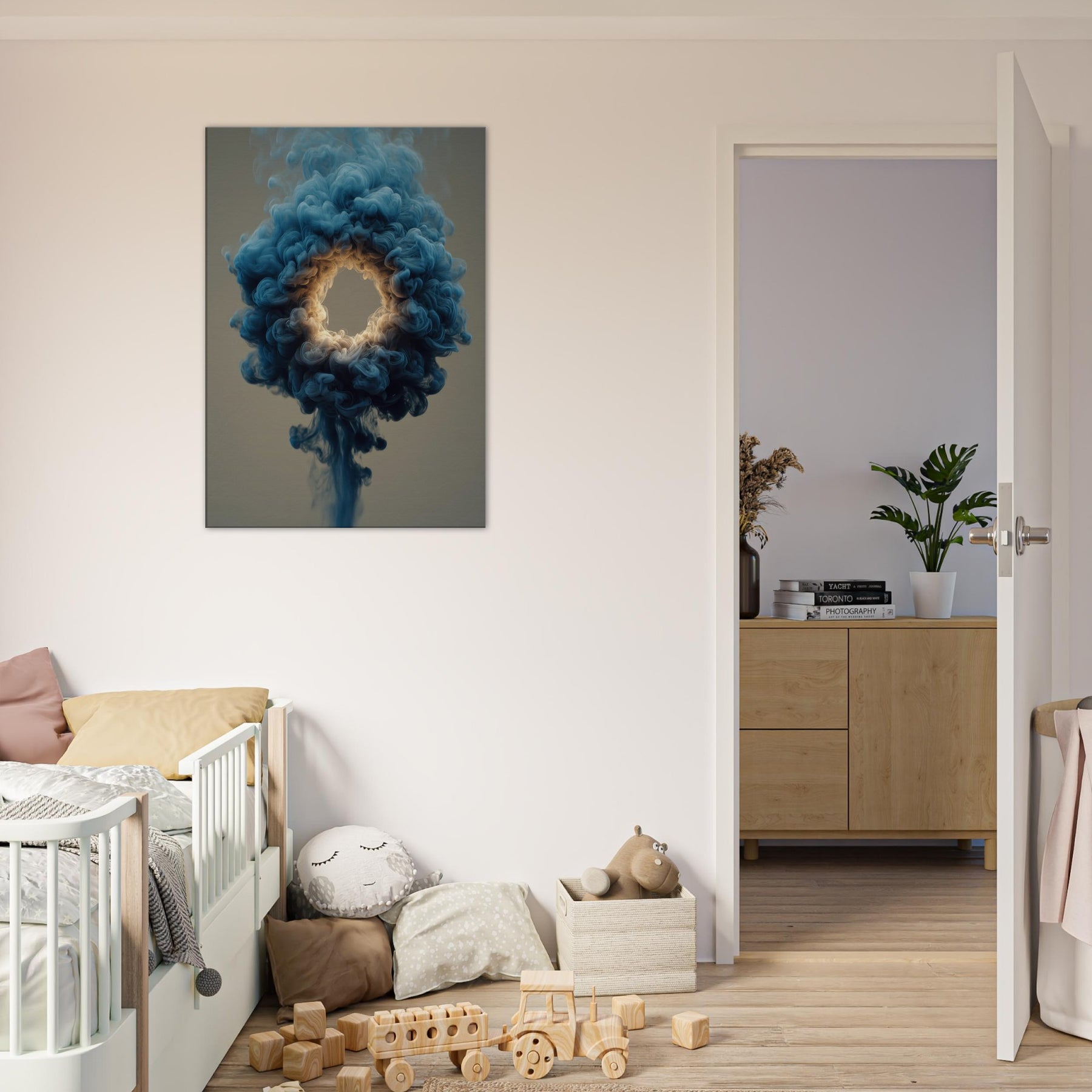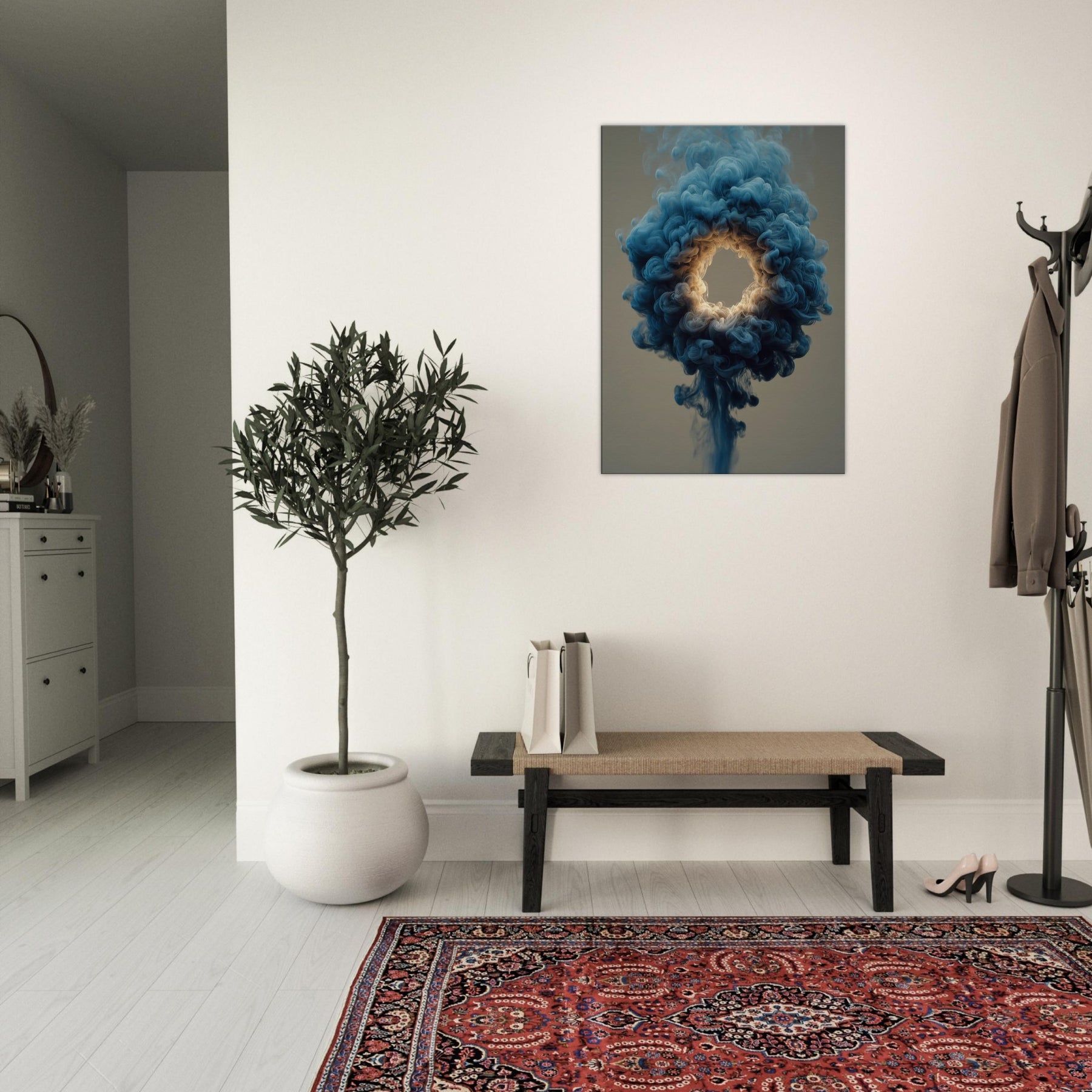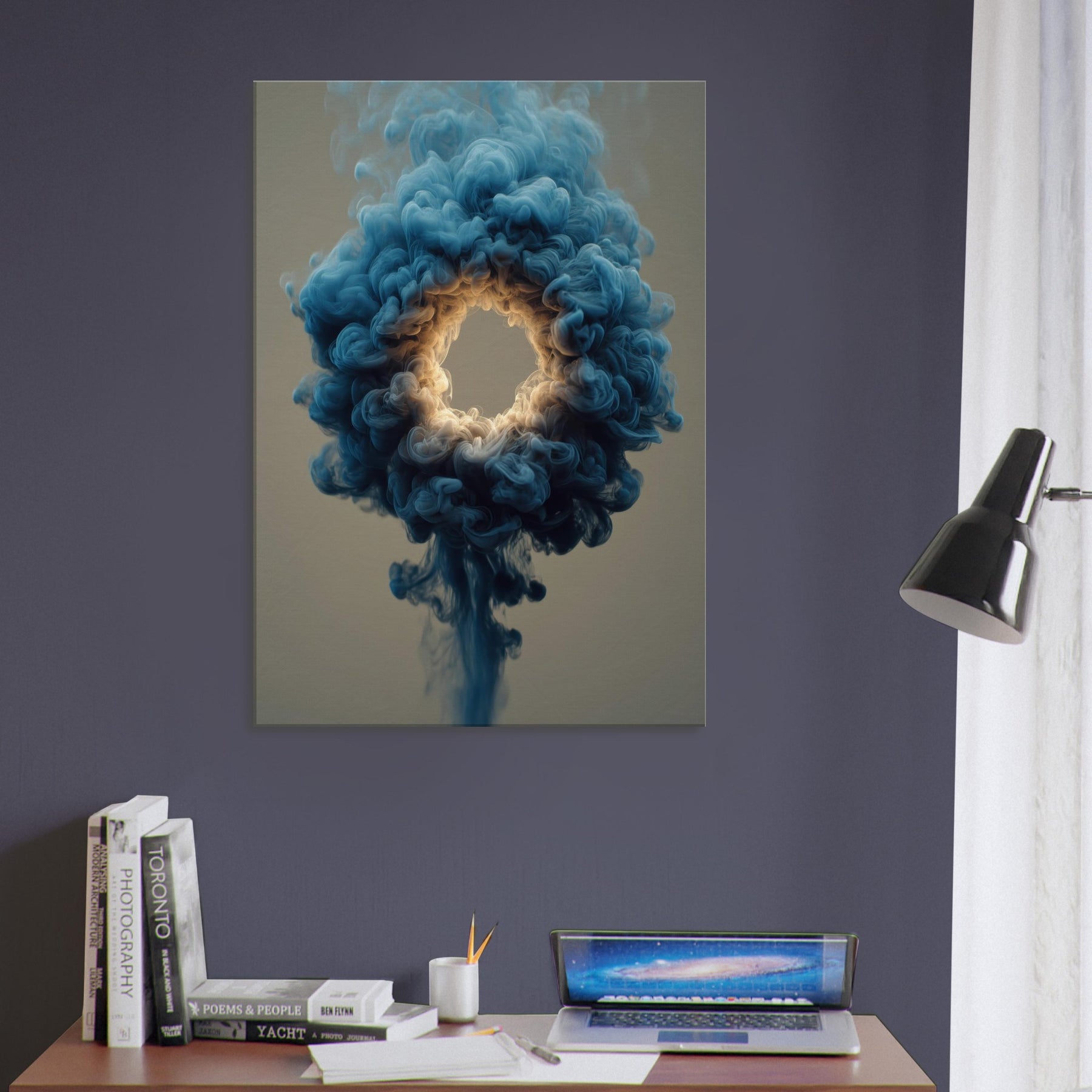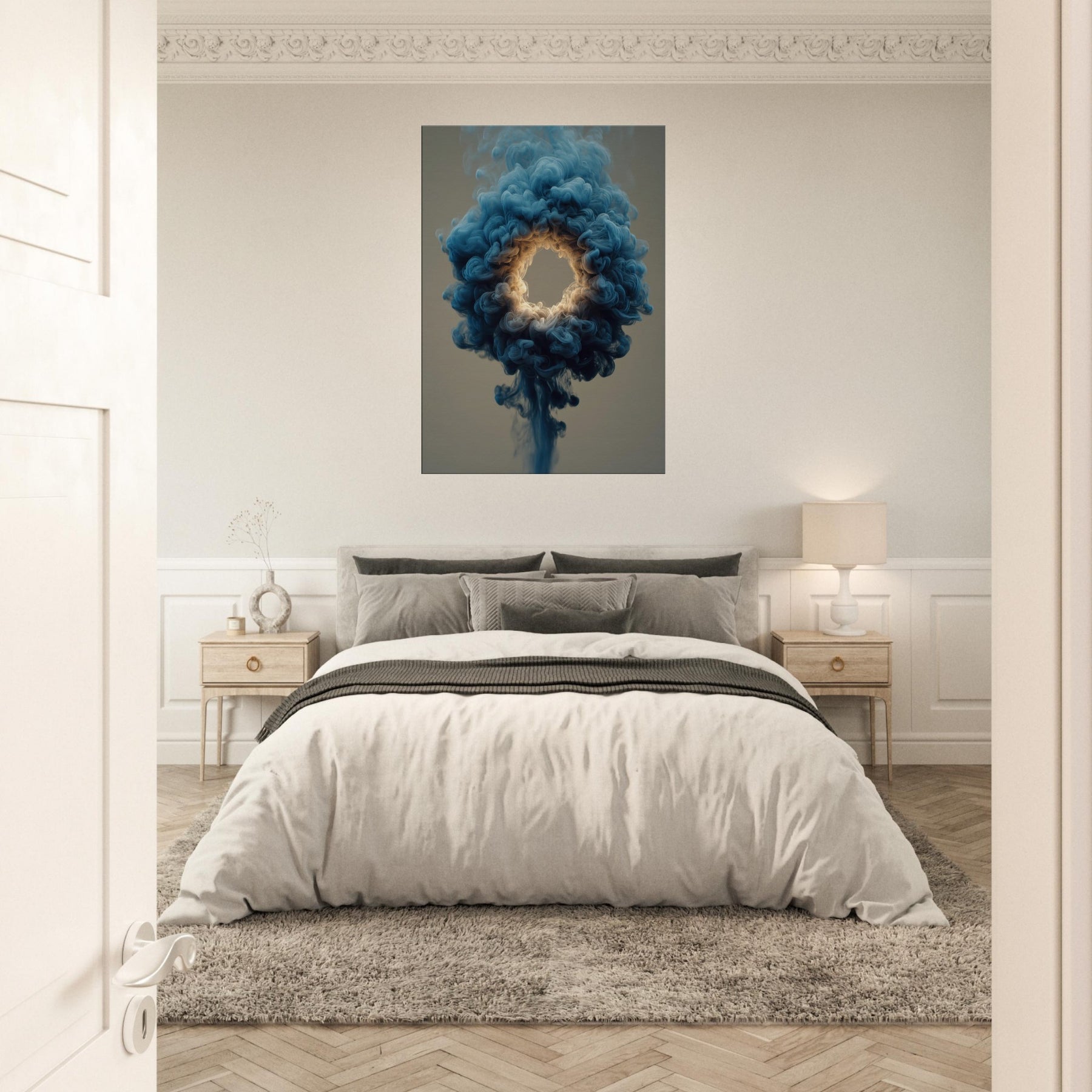 Smudge Smoke Swirl drifts through still air, a circular plume of blue and gold that dissolves into light. This Surrealist vision invites a quiet colonization of the senses: you feel the room exhale with it, as dawn and dusk braid together in soft luminosity. The piece slows time, turning walls into a doorway of reflection, perfect above a seating area or a bedside nook. In any living space, Smudge Smoke Swirl becomes a mystical pause, a breath you can live inside.